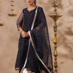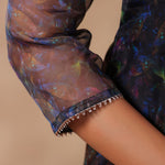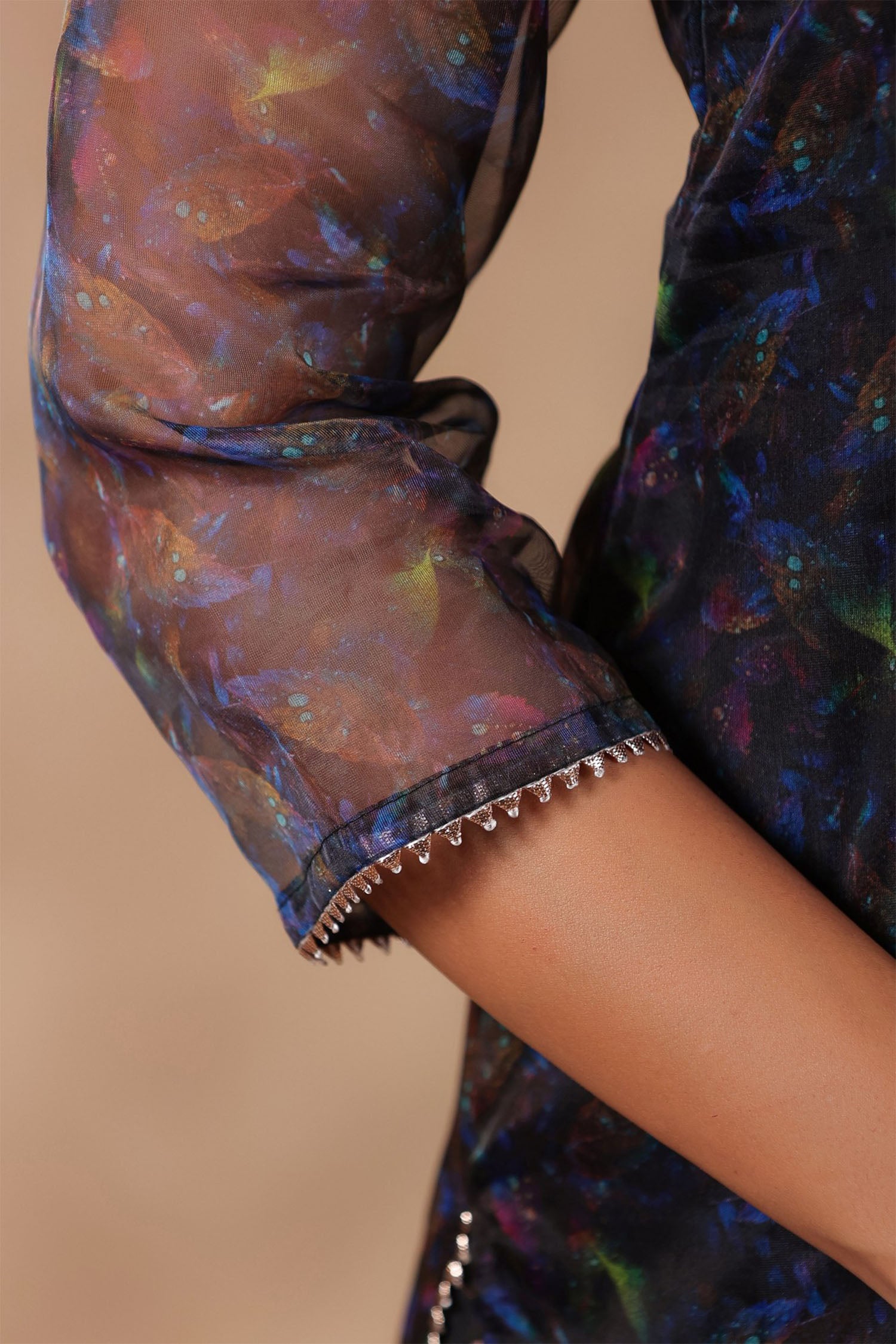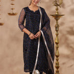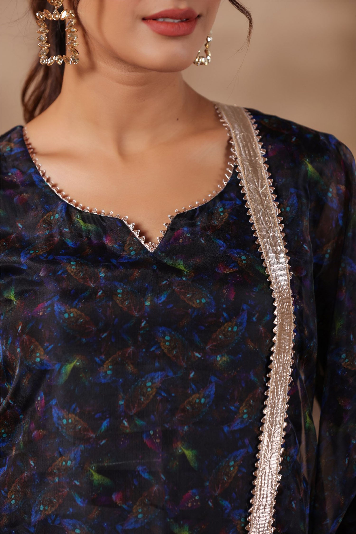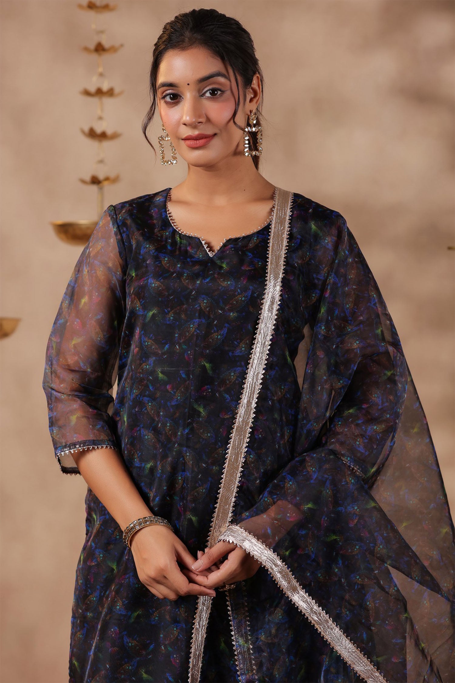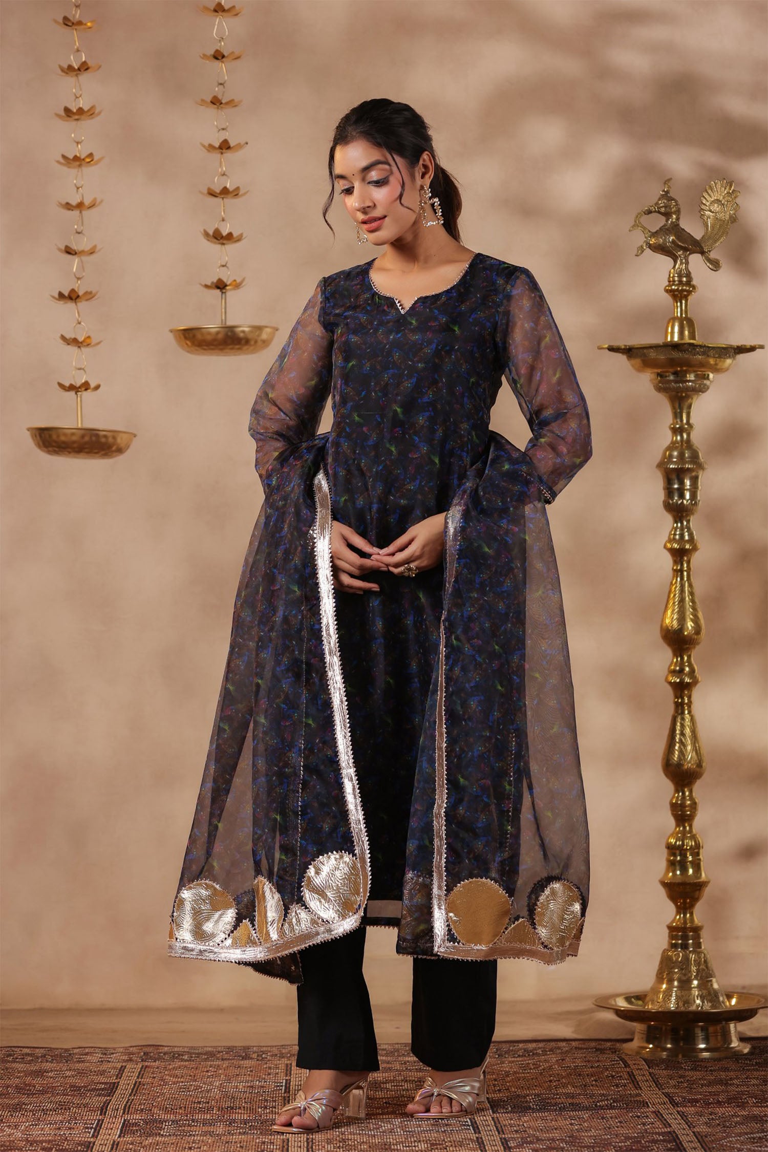 The black organza floral printed kurti set with matching pant and organza dupatta for a neat ethnic look.