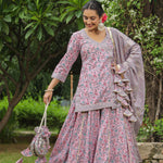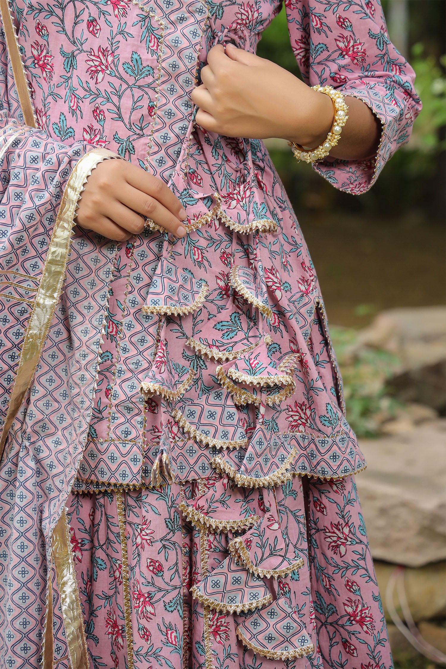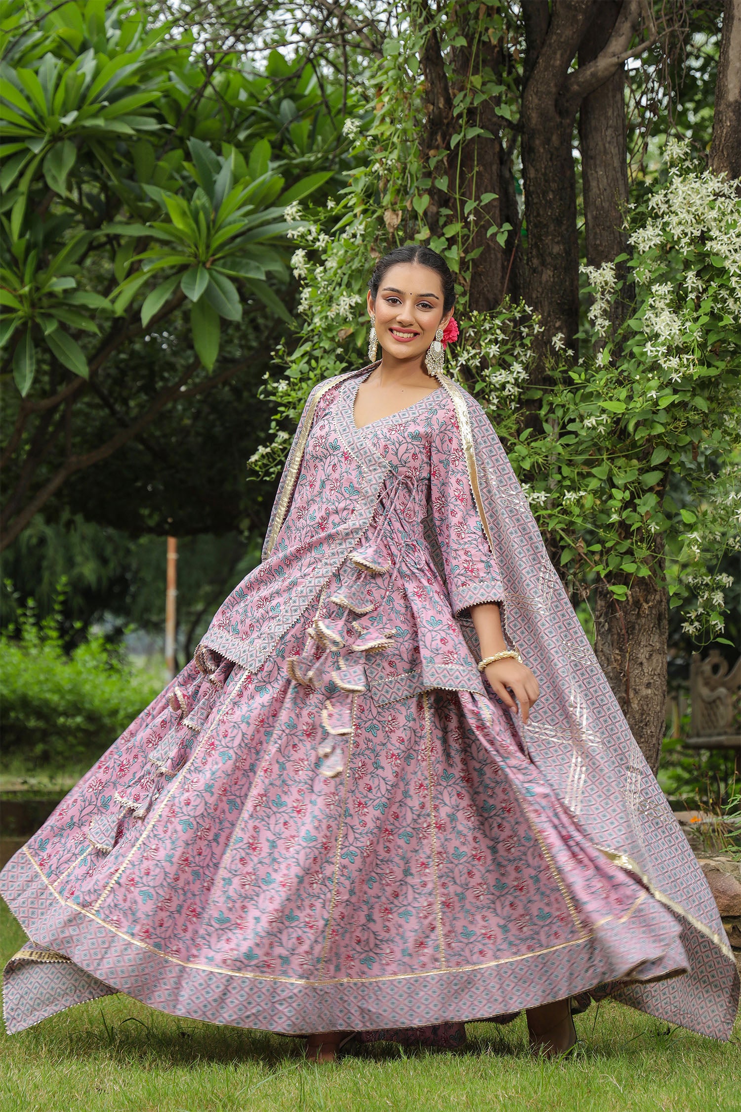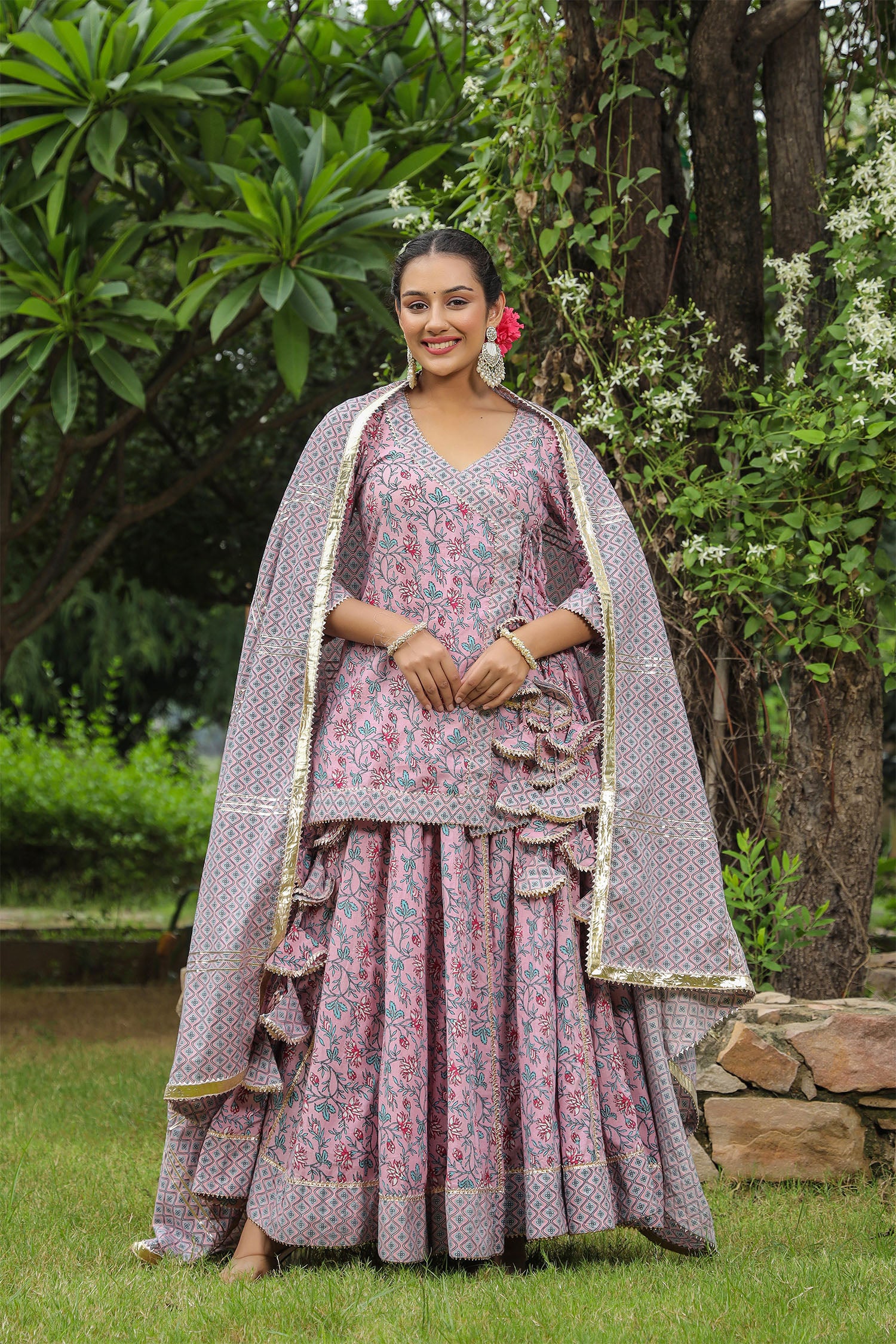 The blossom pink cotton floral printed lehenga set with matching dupatta for an elegant and gracious look.