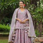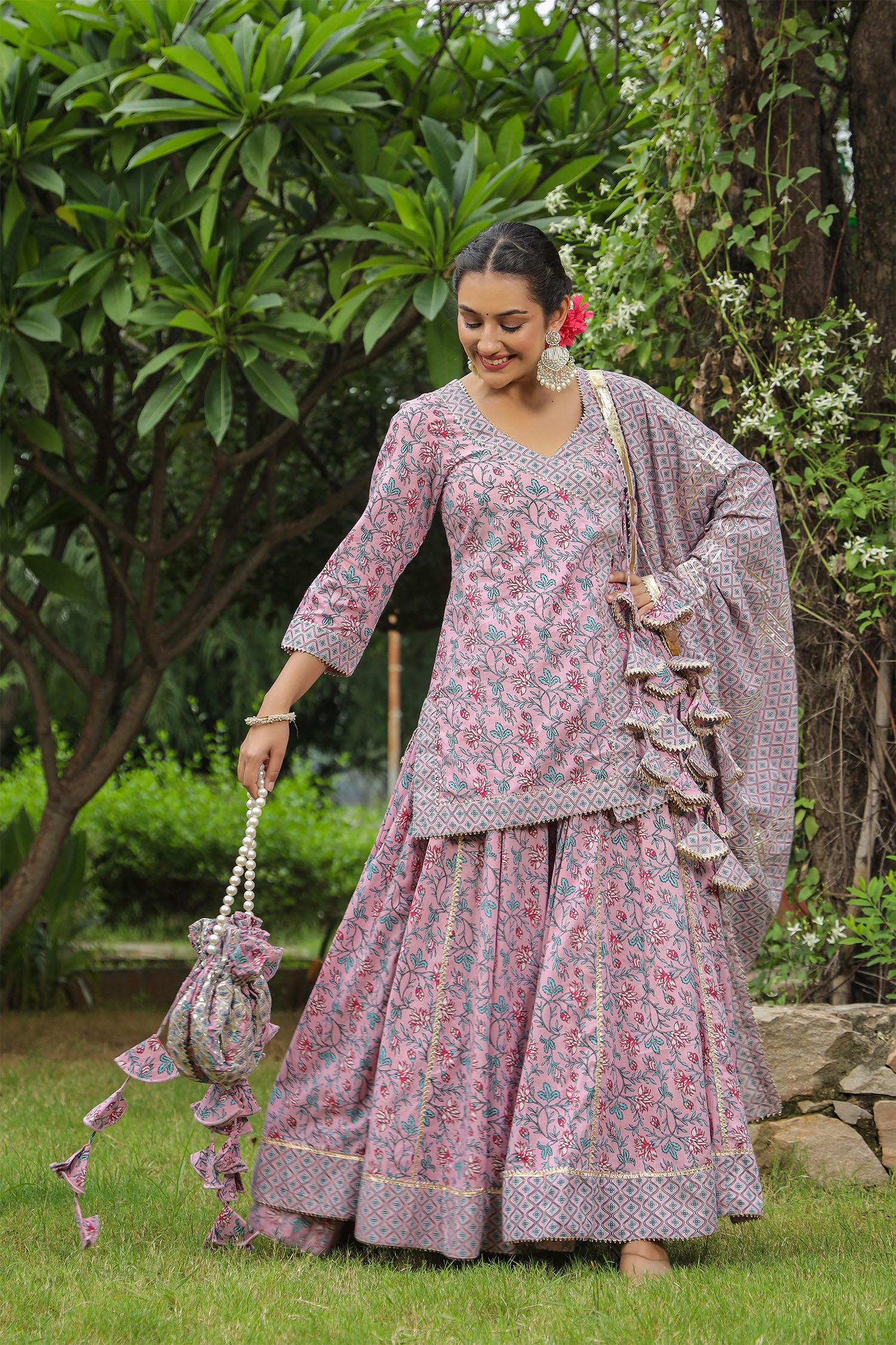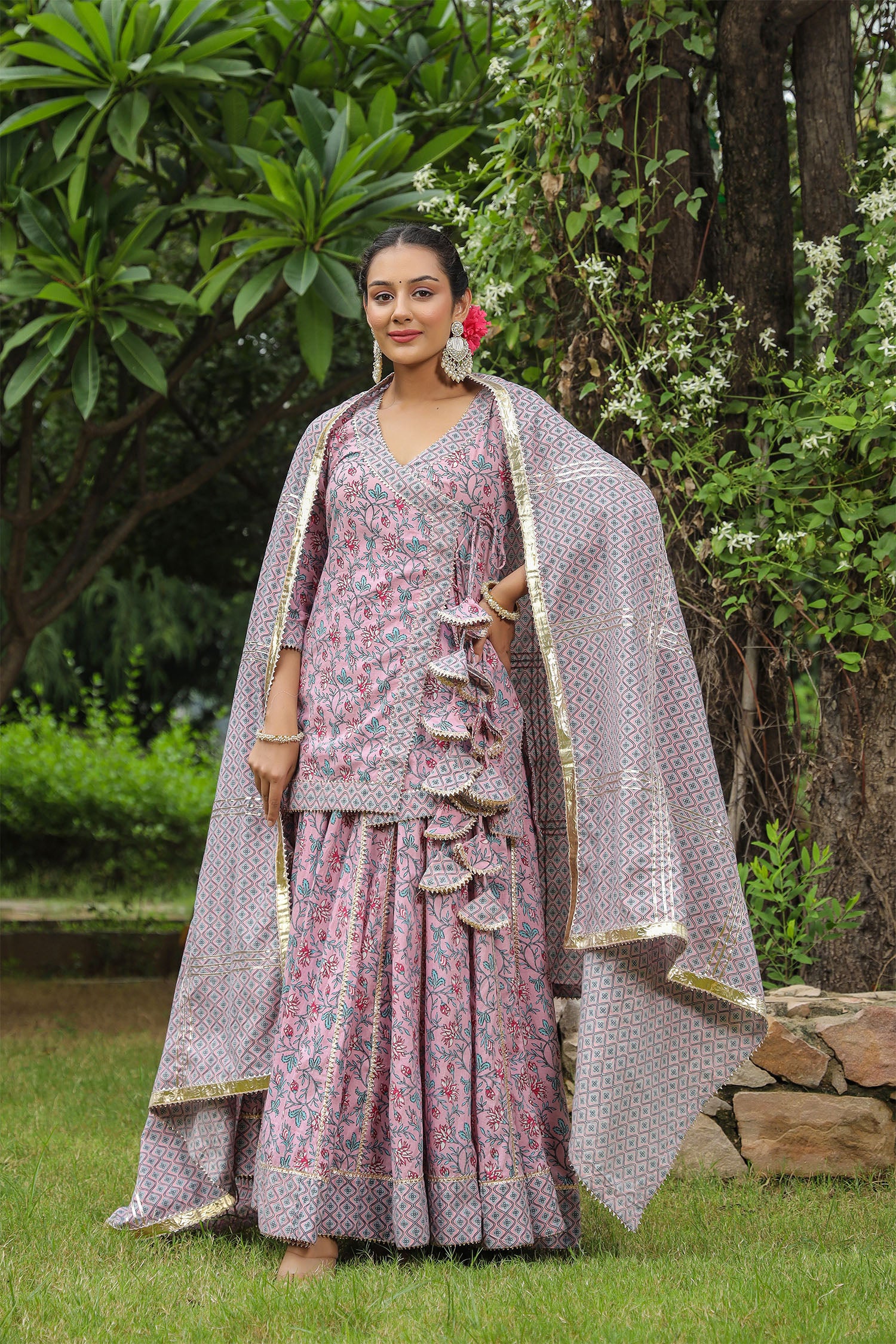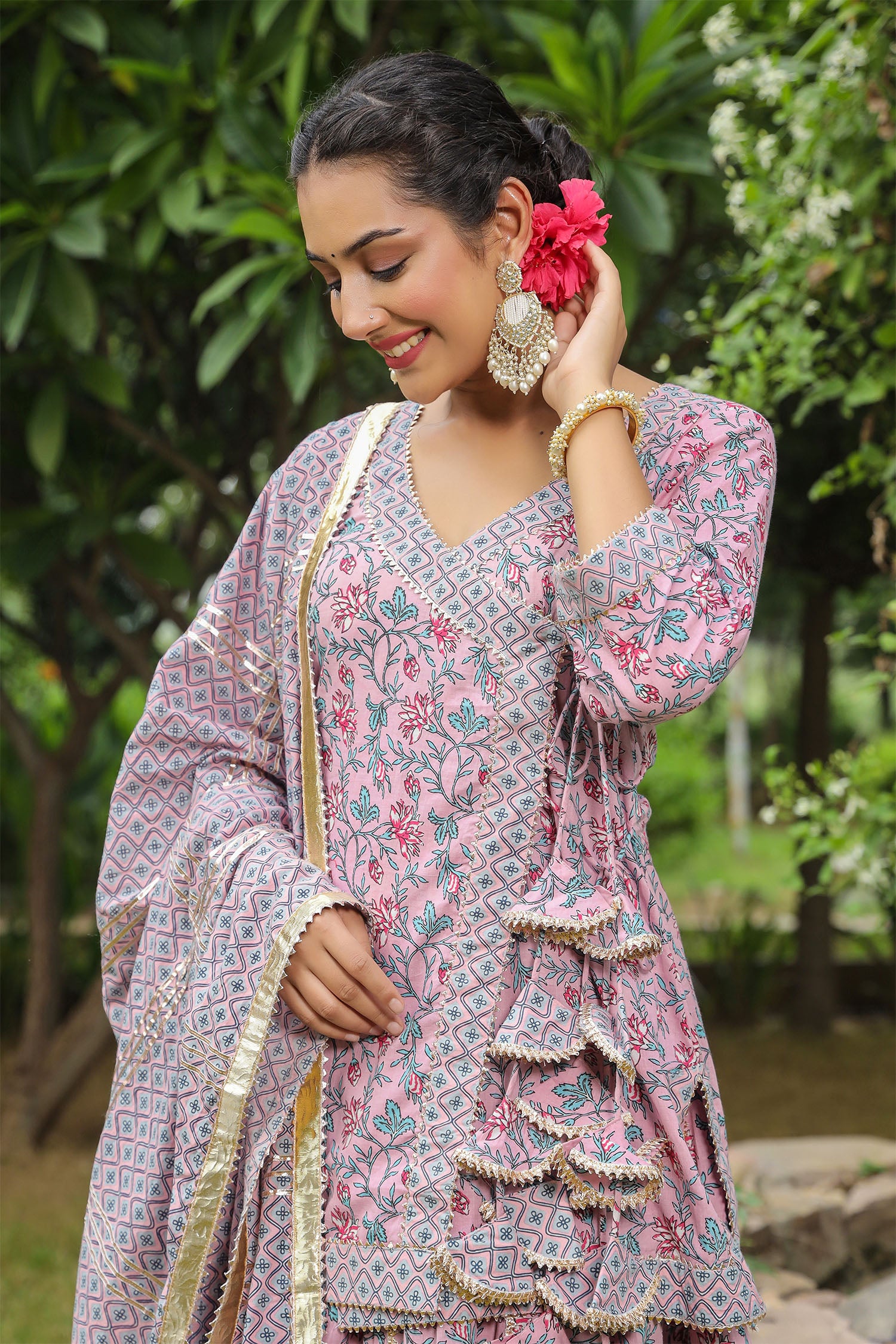 The blossom pink cotton floral printed lehenga set with matching dupatta for an elegant and gracious look.