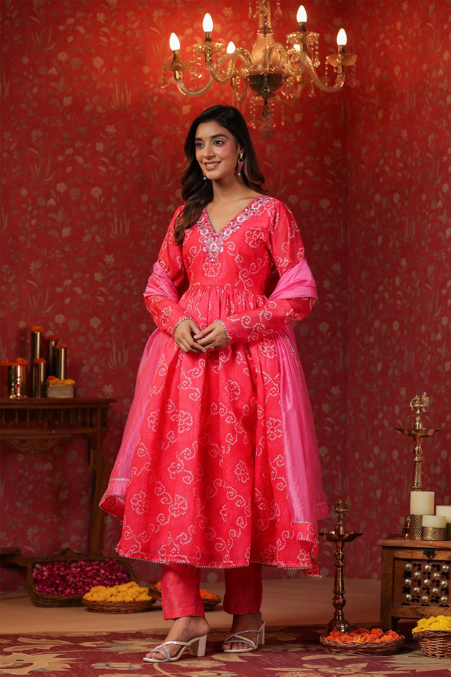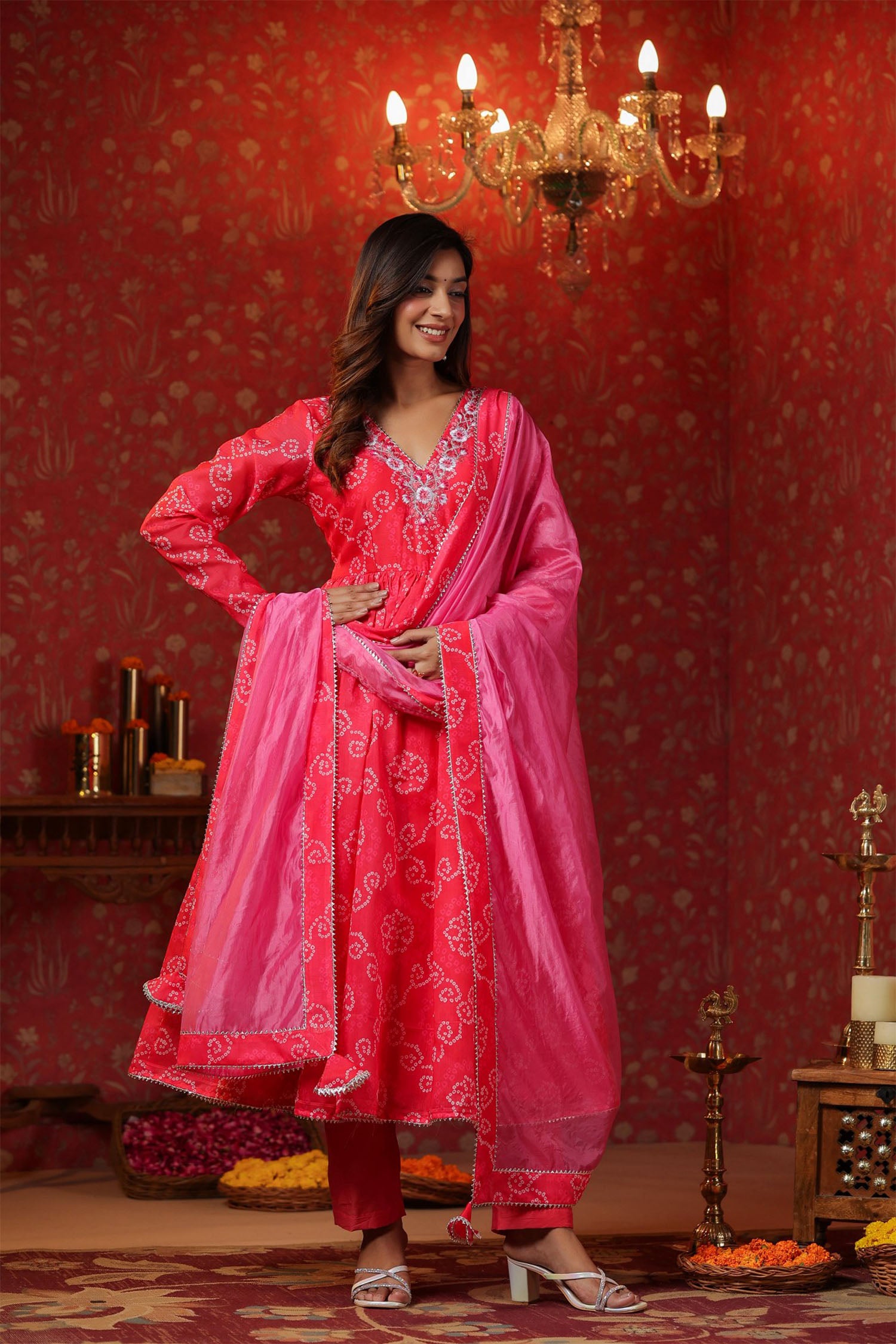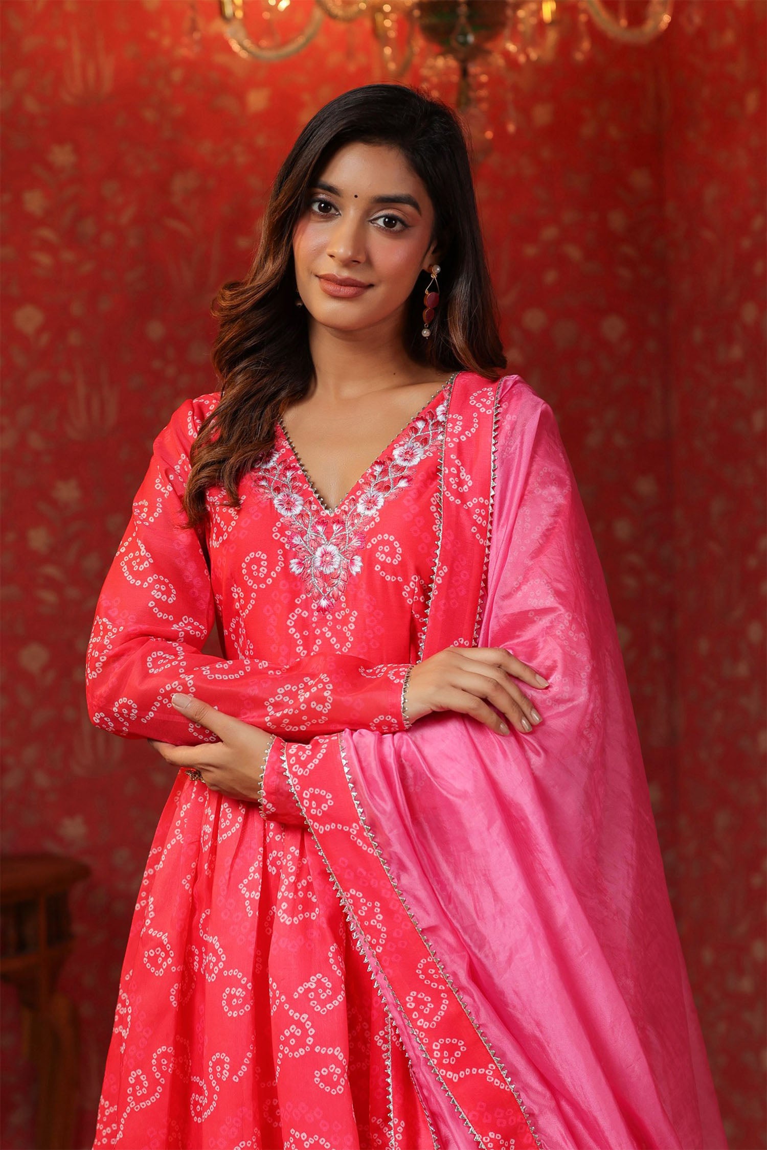 The bright pink chanderi bandhani printed anarkali set with matching pant and dupatta for a beautiful charming look.
