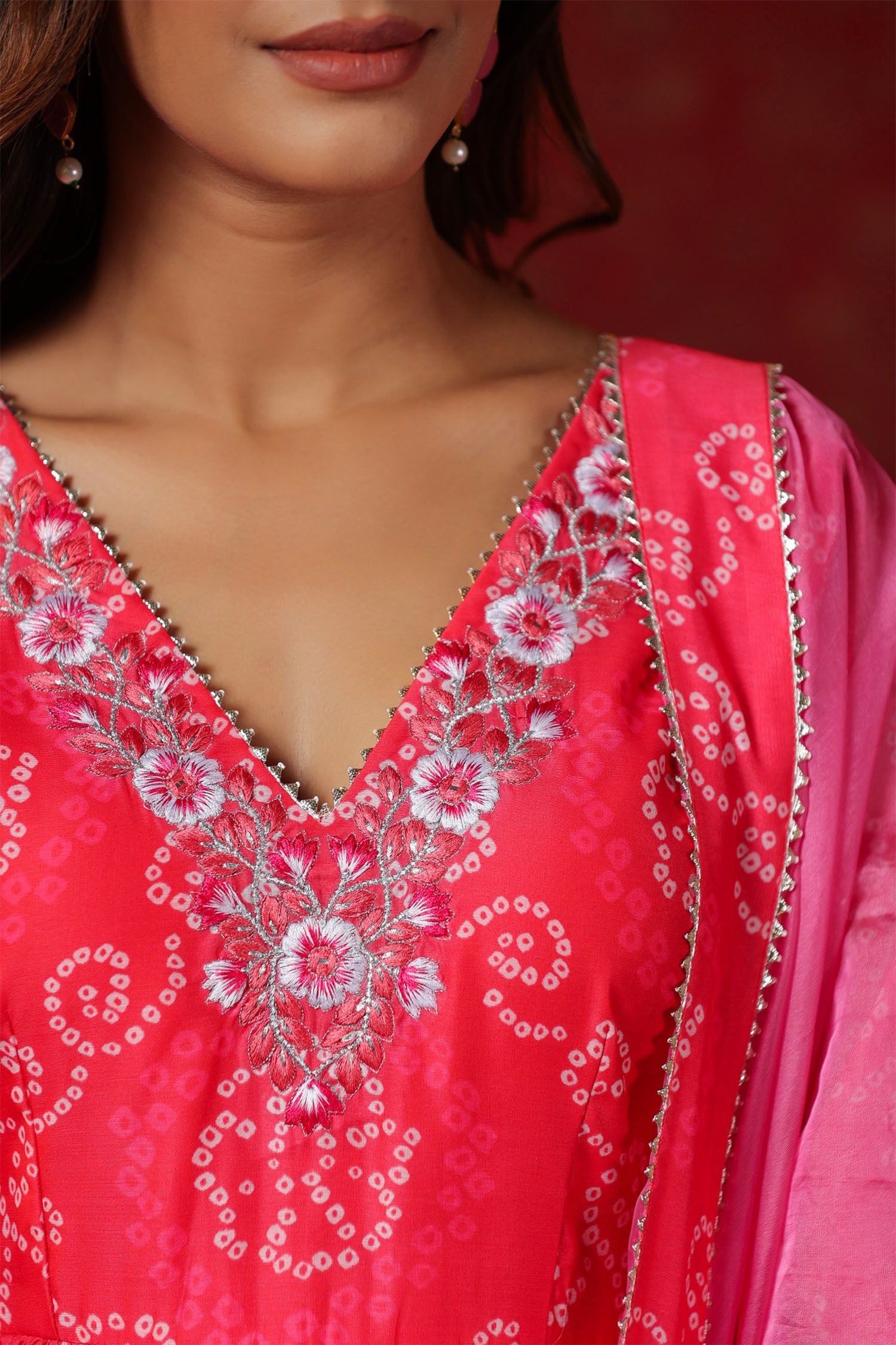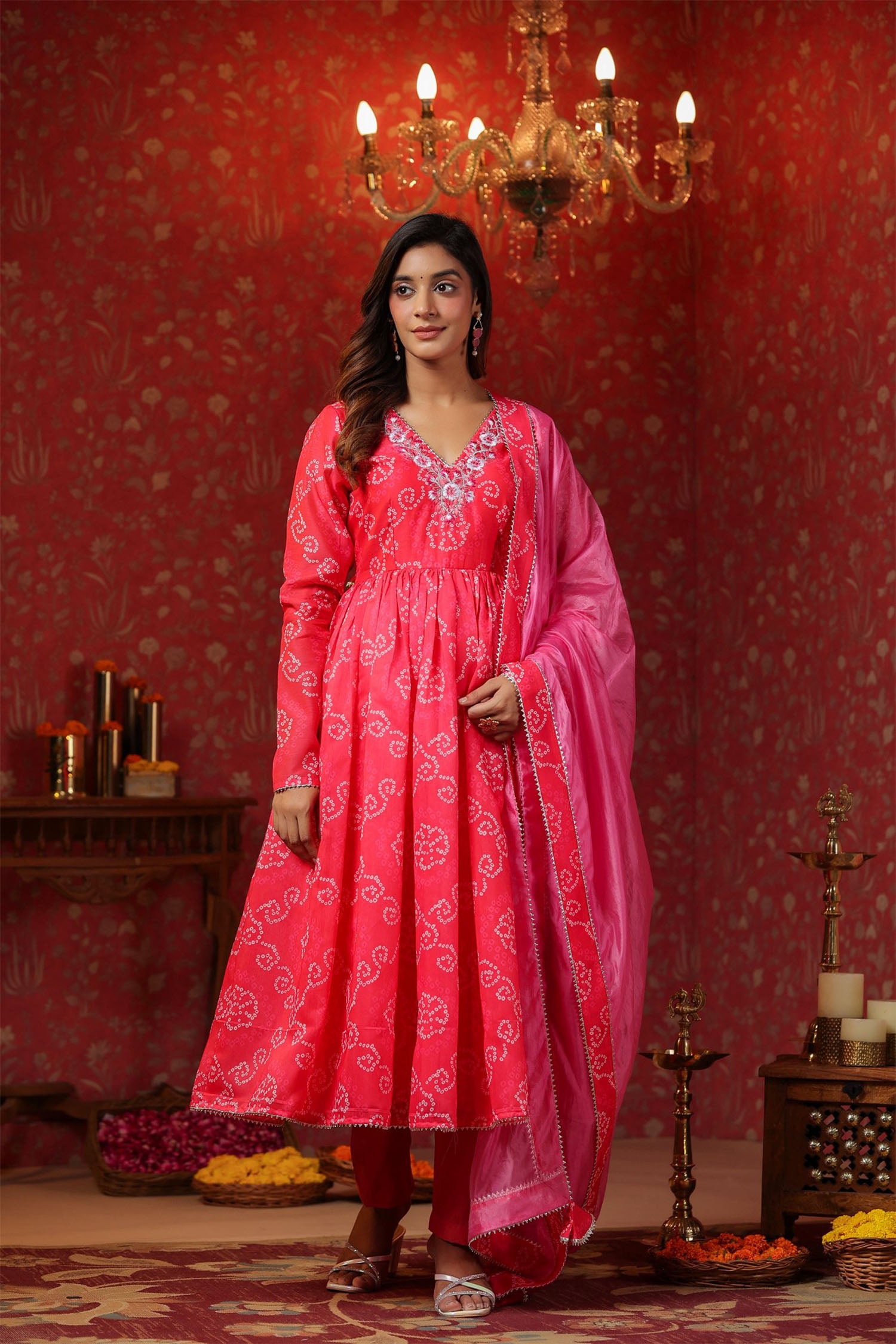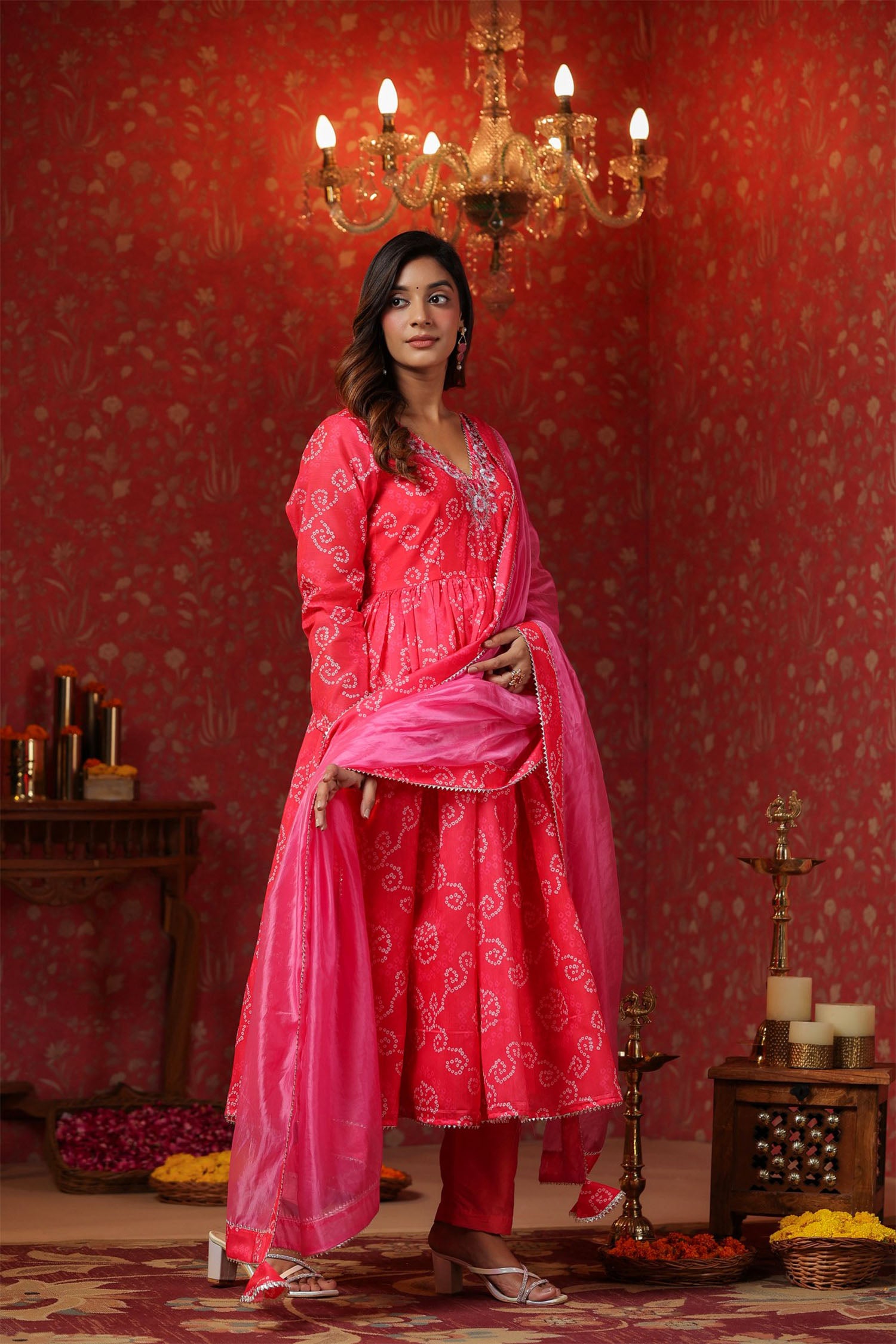 The bright pink chanderi bandhani printed anarkali set with matching pant and dupatta for a beautiful charming look.