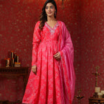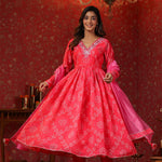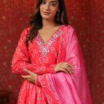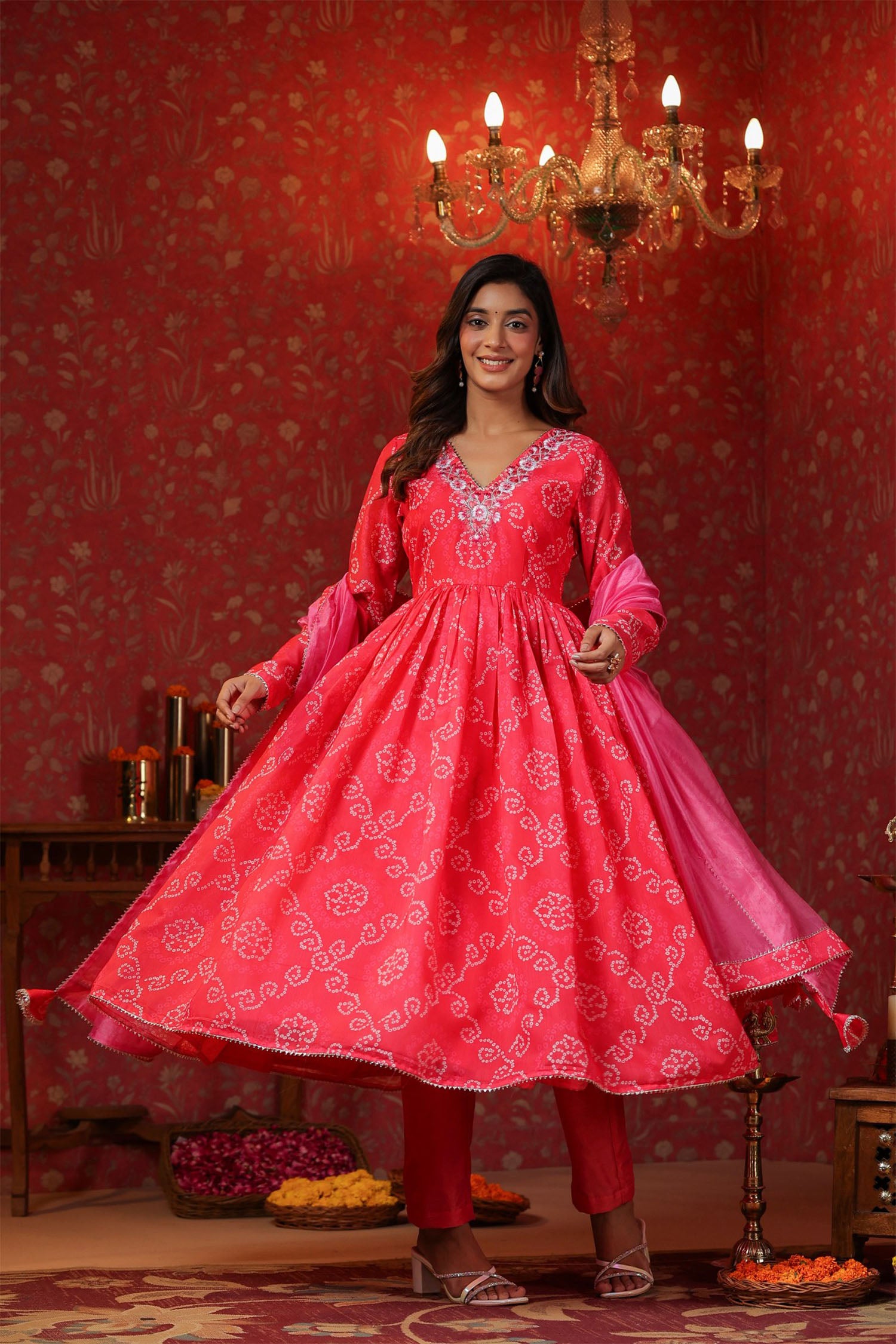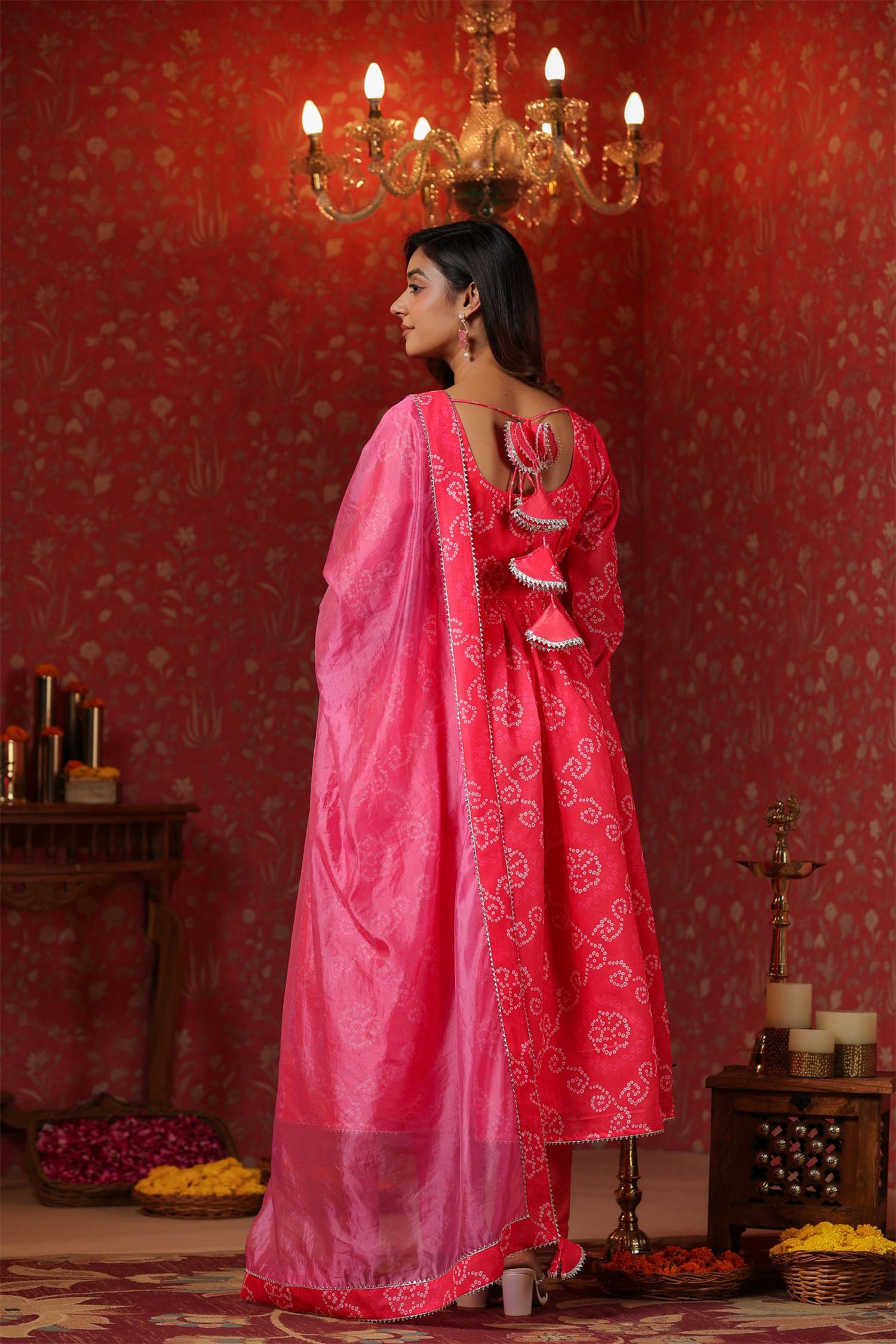 Bright Pink Chanderi Bandhani Printed Anarkali Set