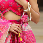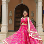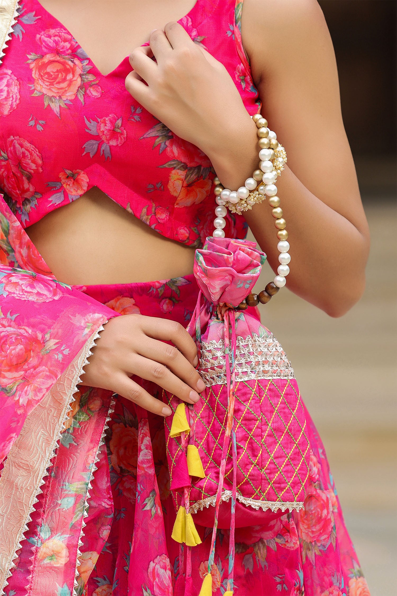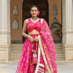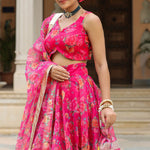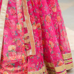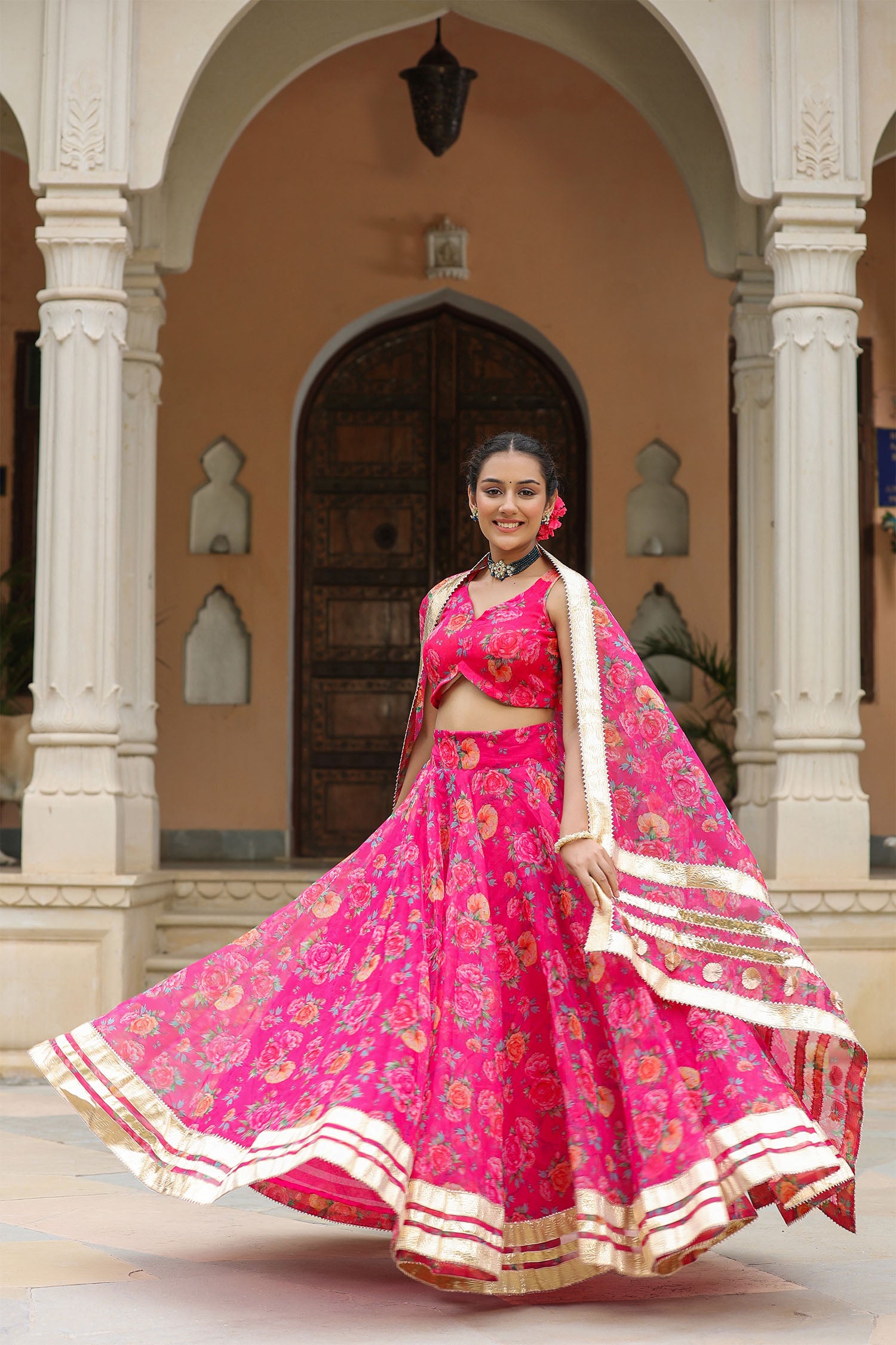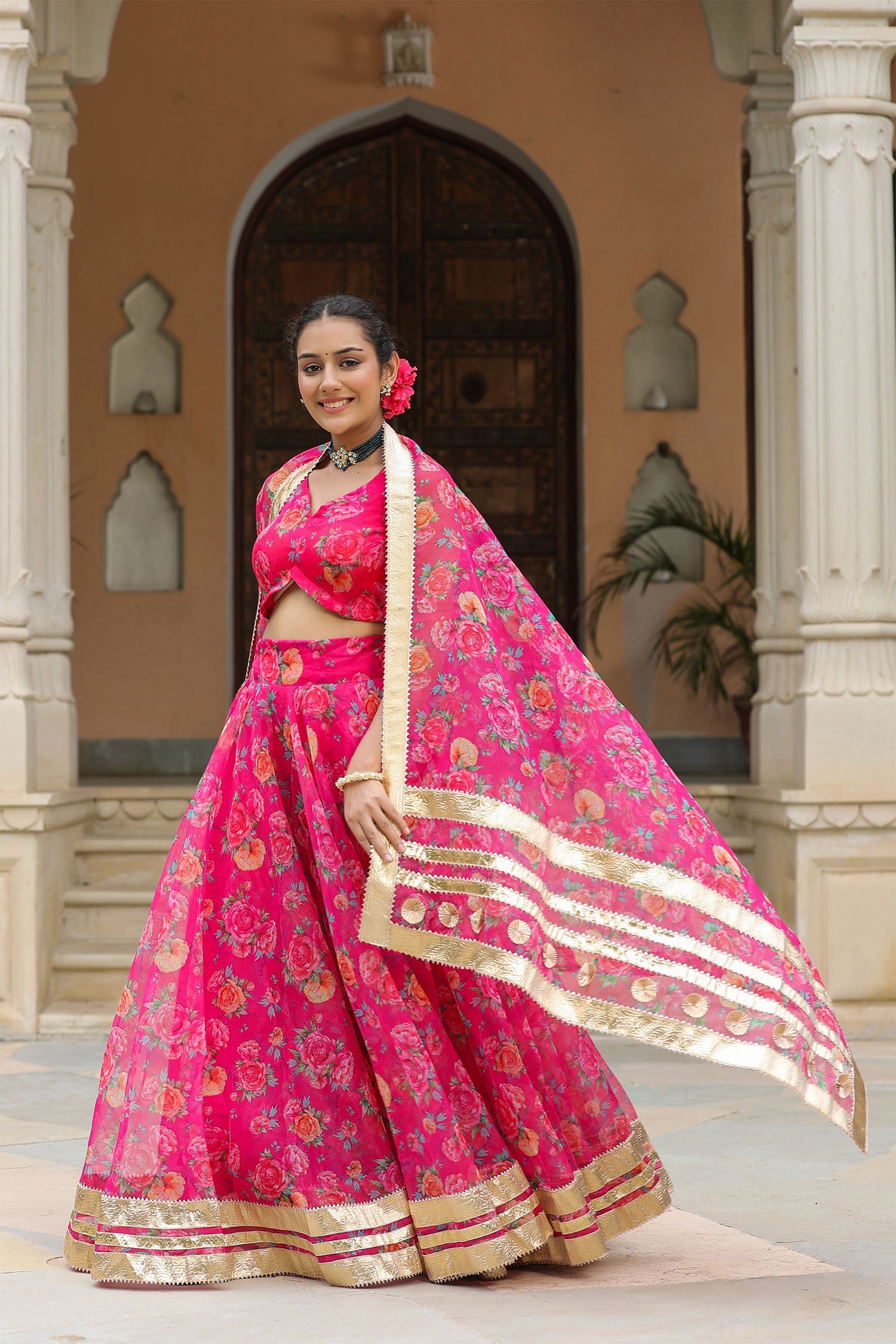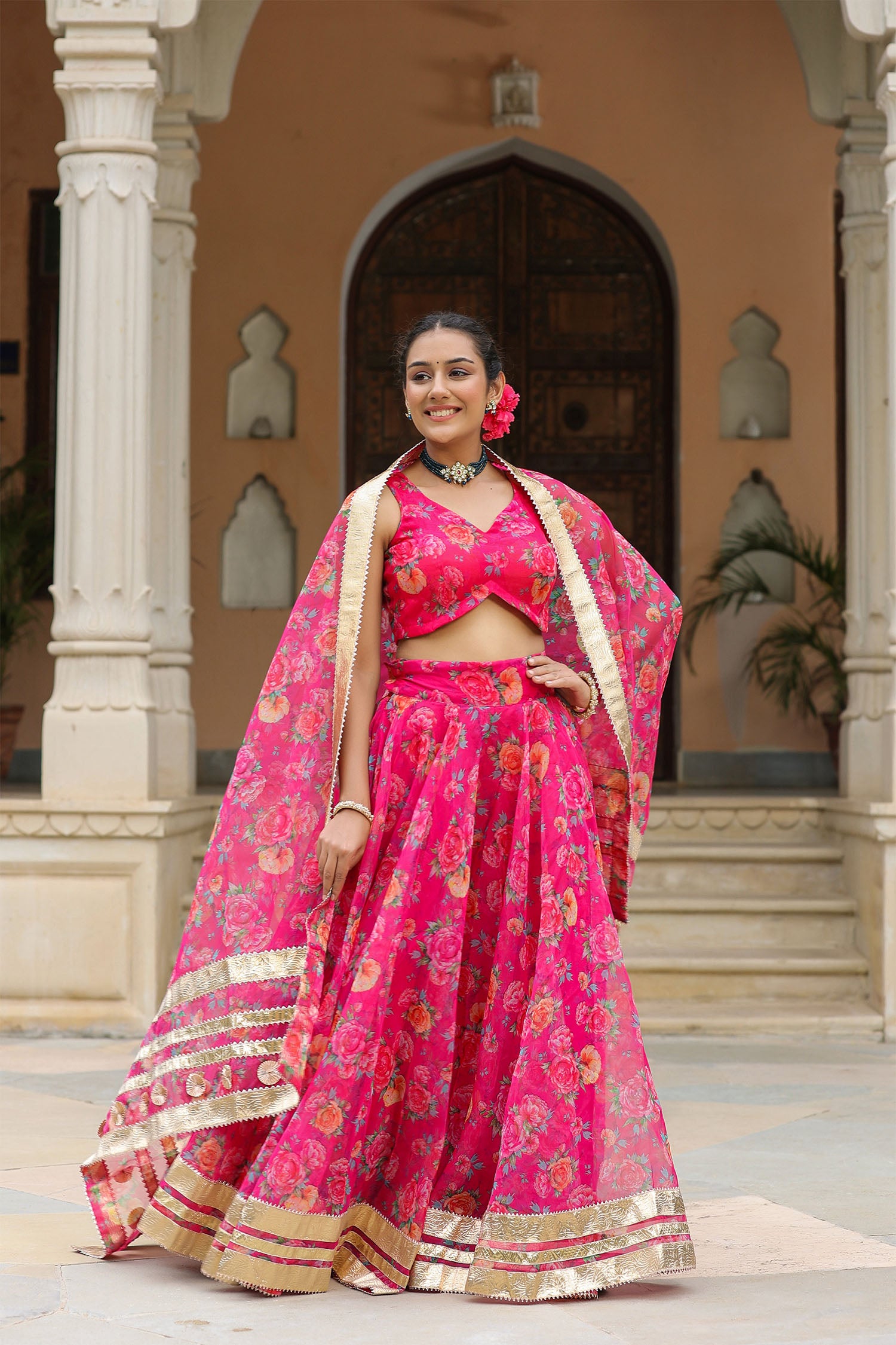The bright pink organza floral printed lehenga set with matching organza dupatta for an elegant and gracious look.