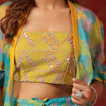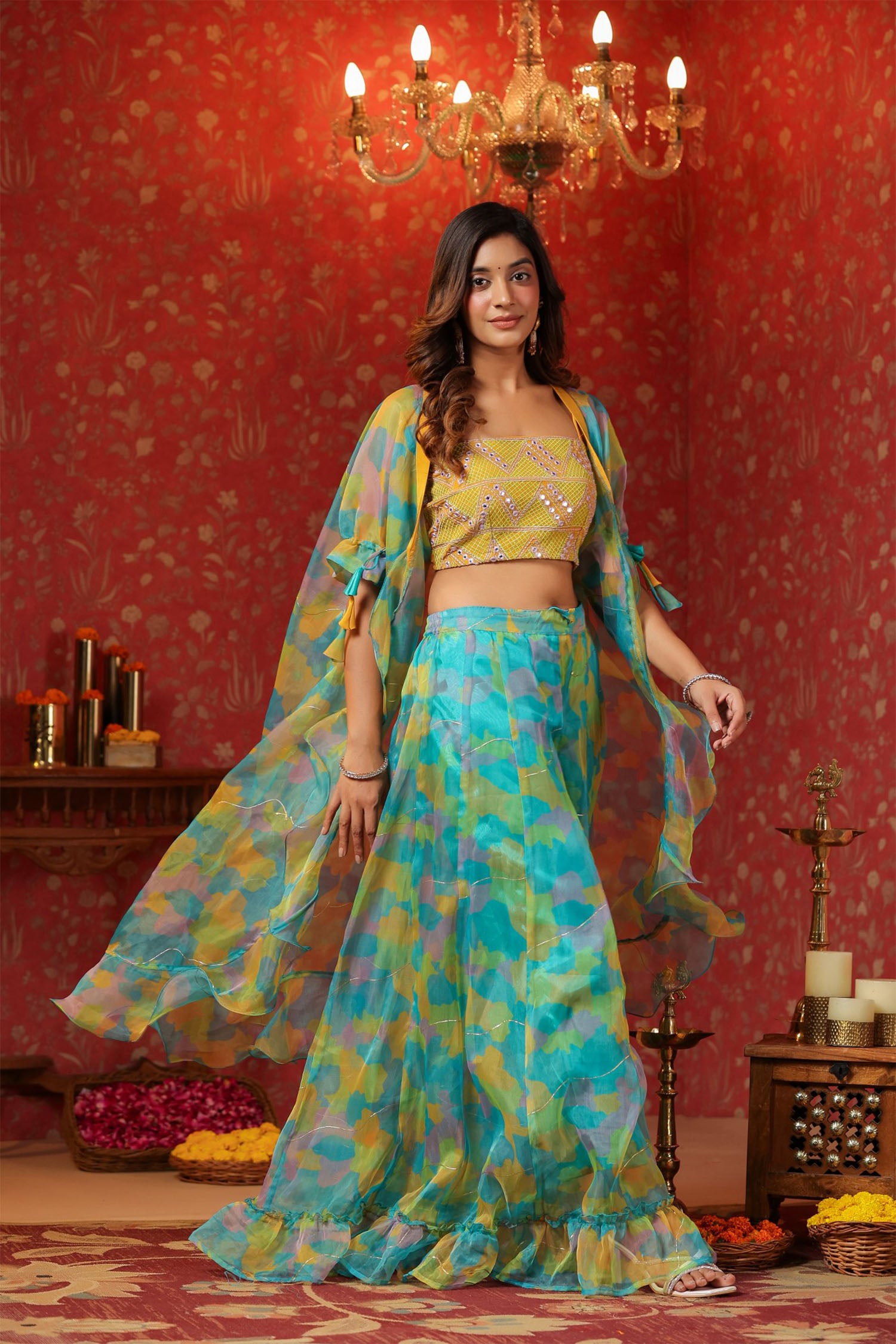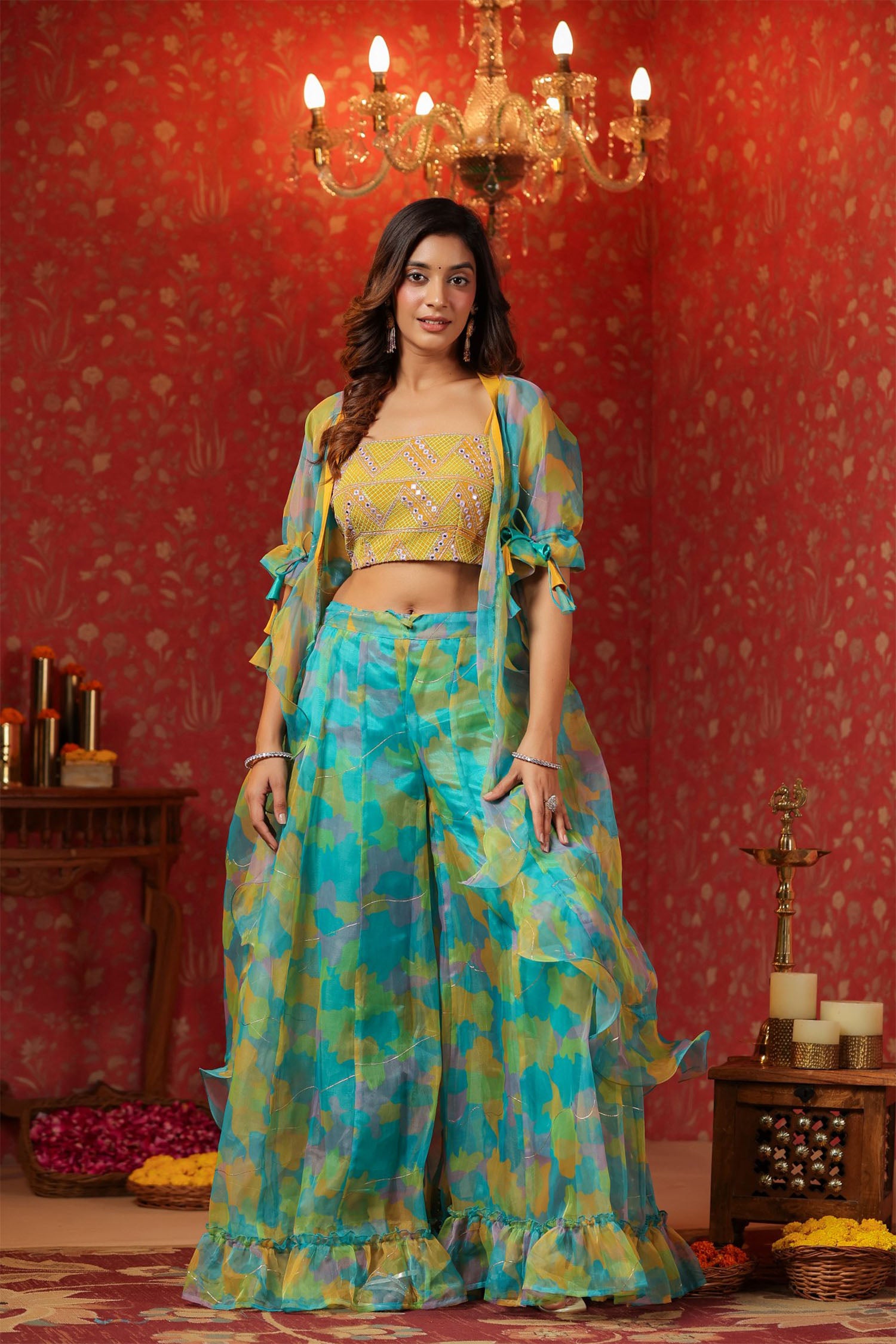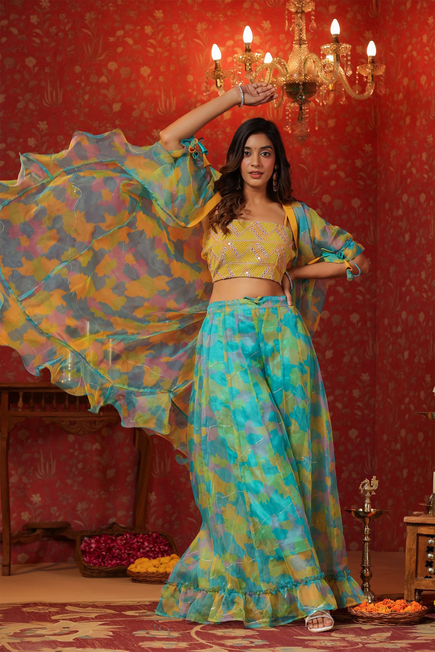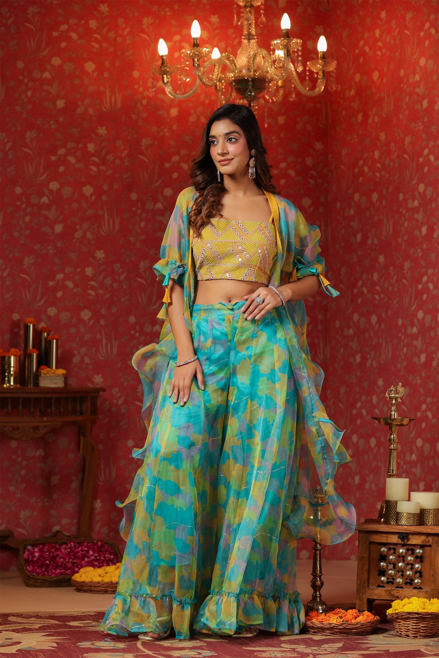 The cerulean blue organza printed co-ord set with embroidered top and frilled shrug for a stylish fit with charming look.