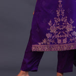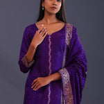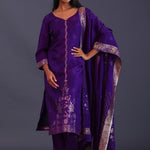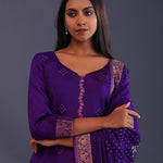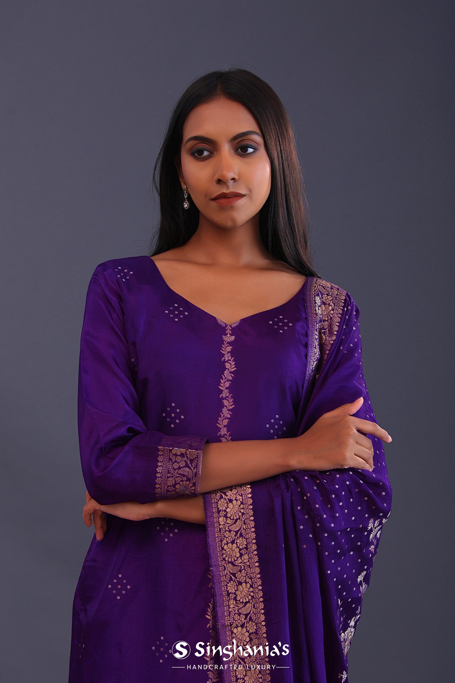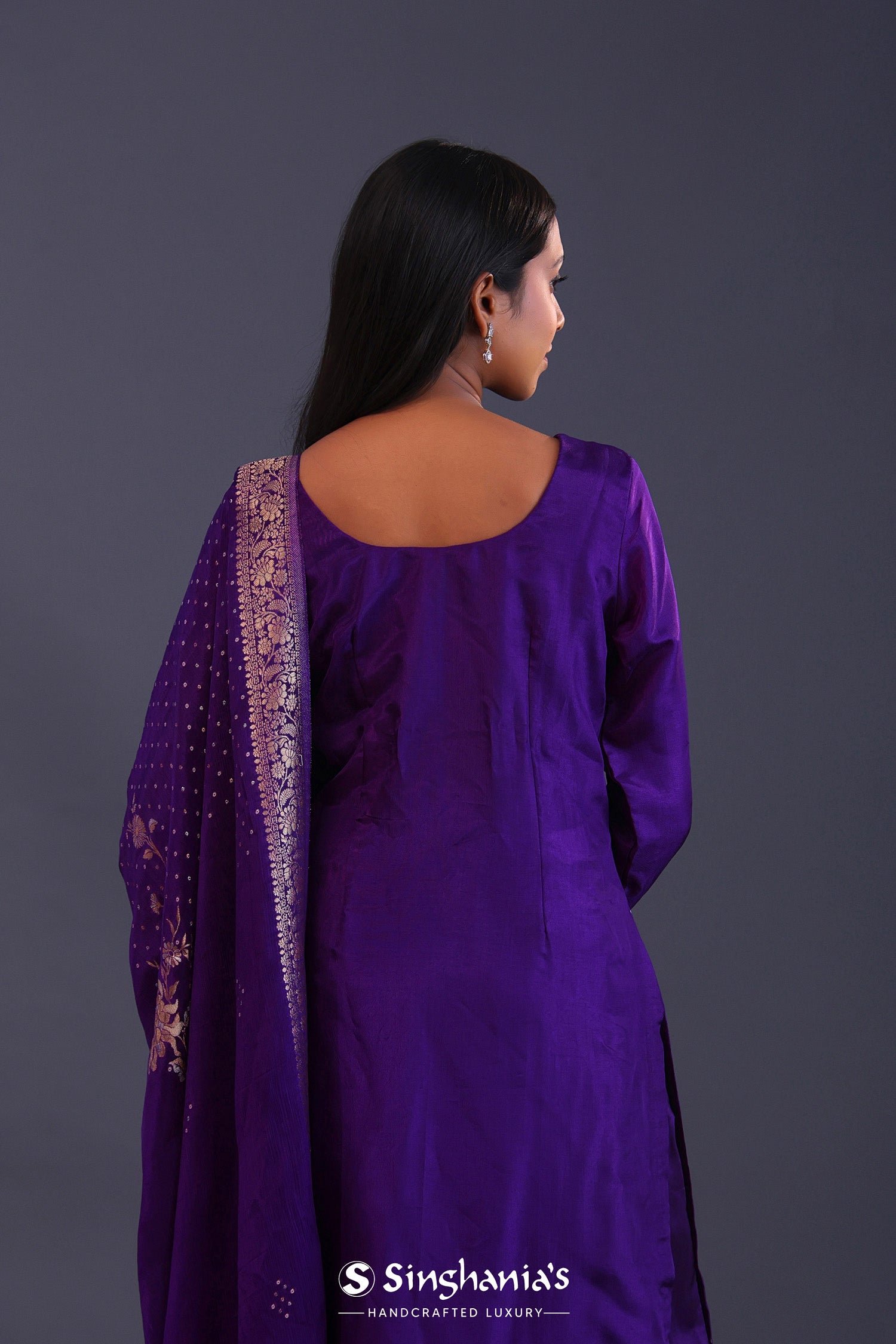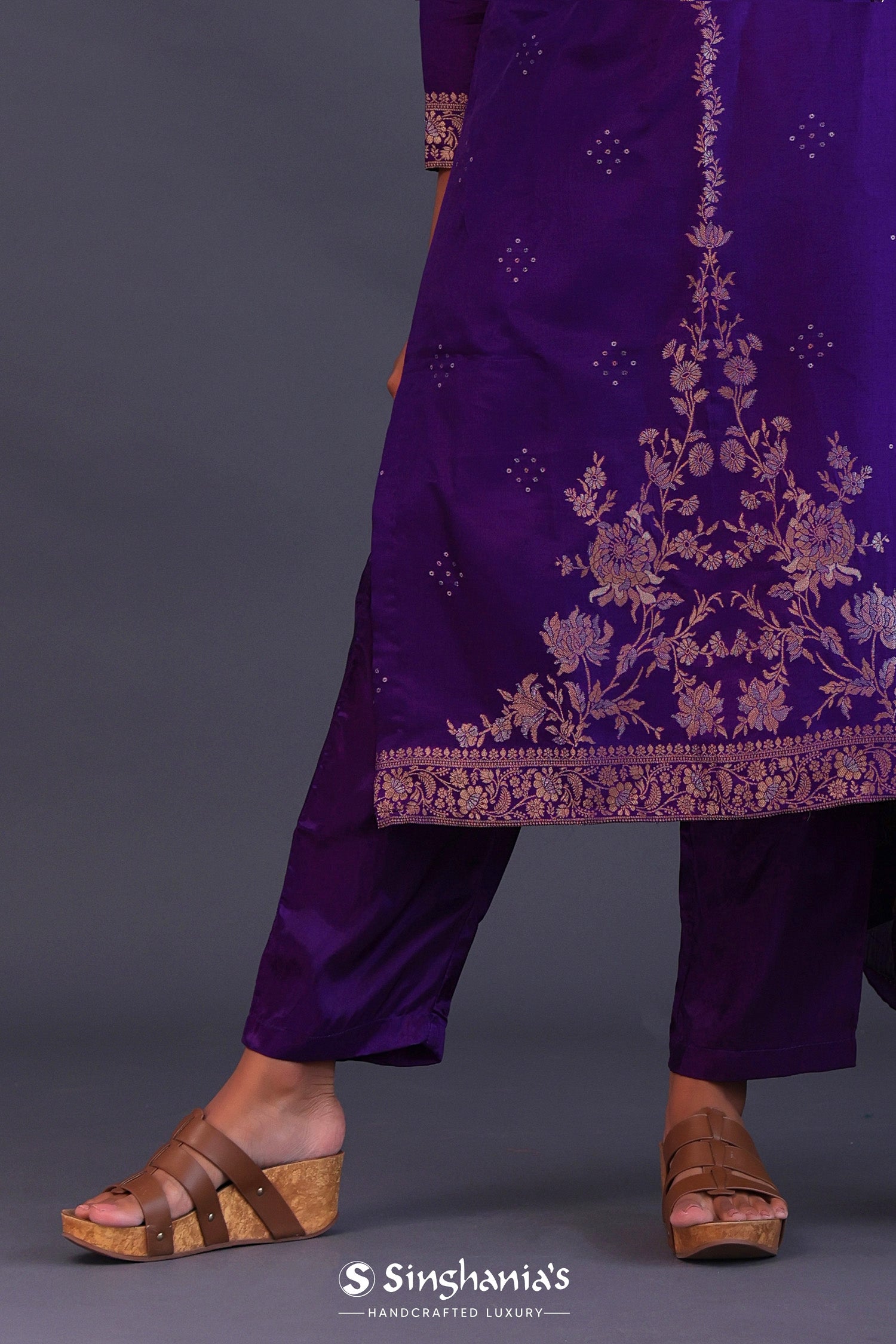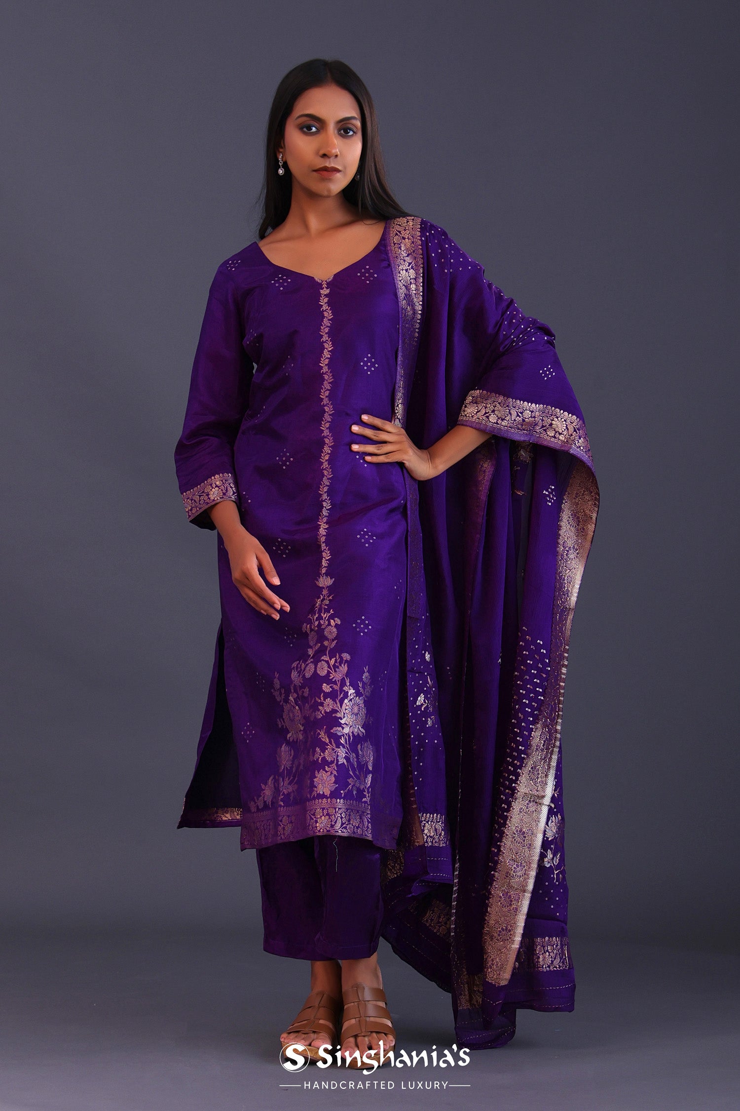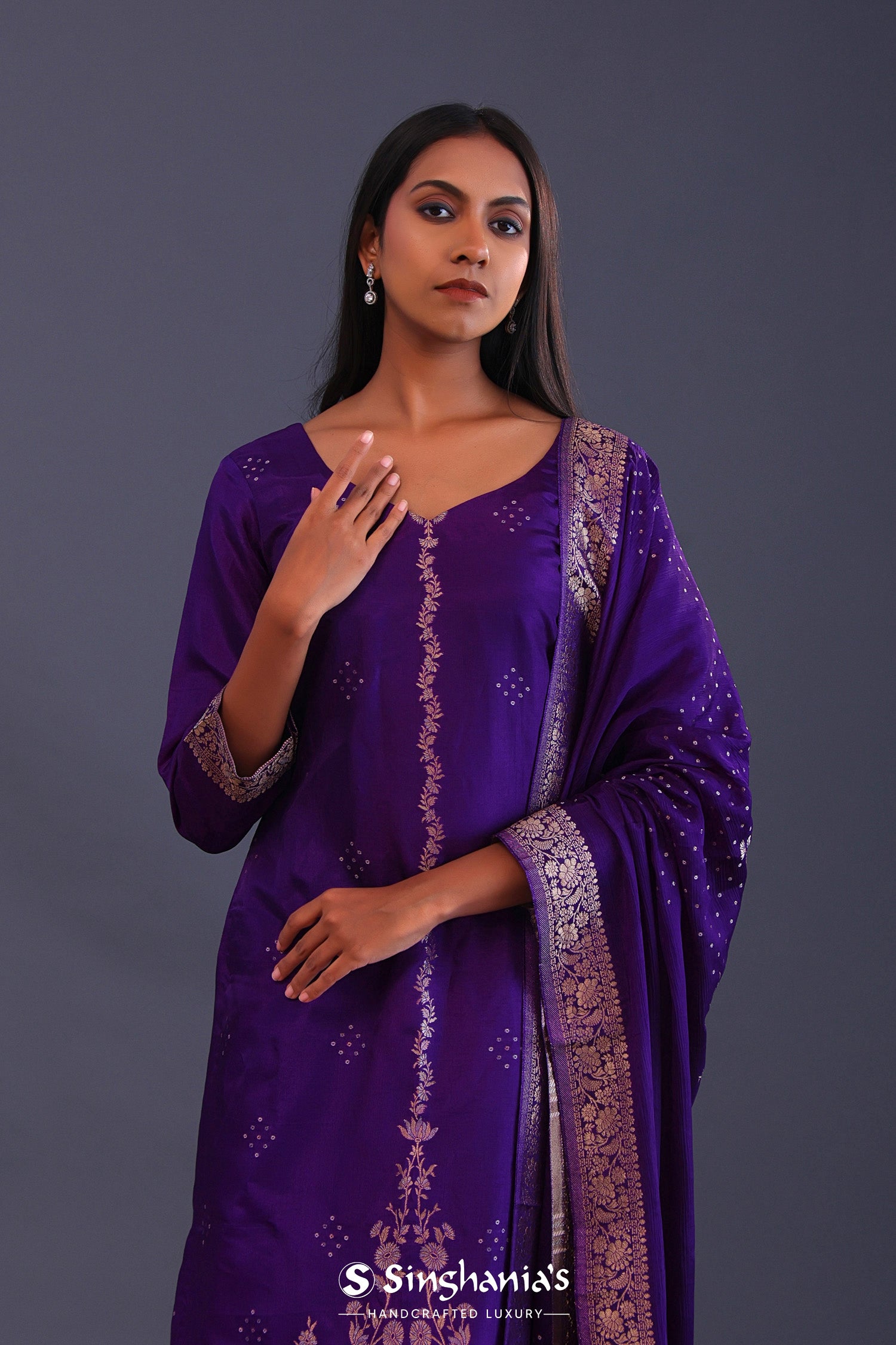 The deep violet banarsi silk butti kurti set for an ethnic and charming look with neat finish.