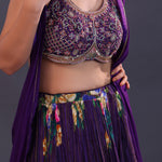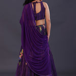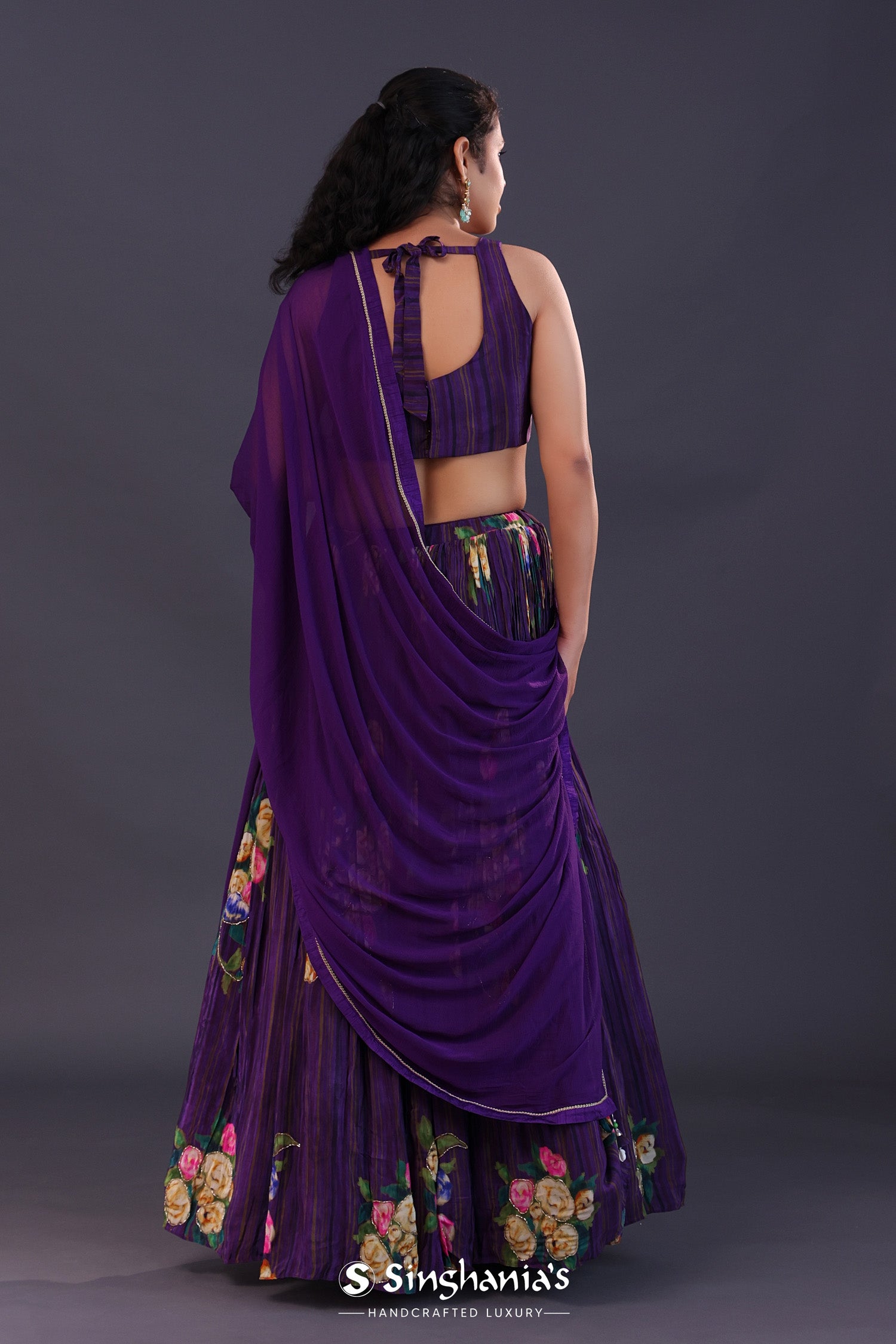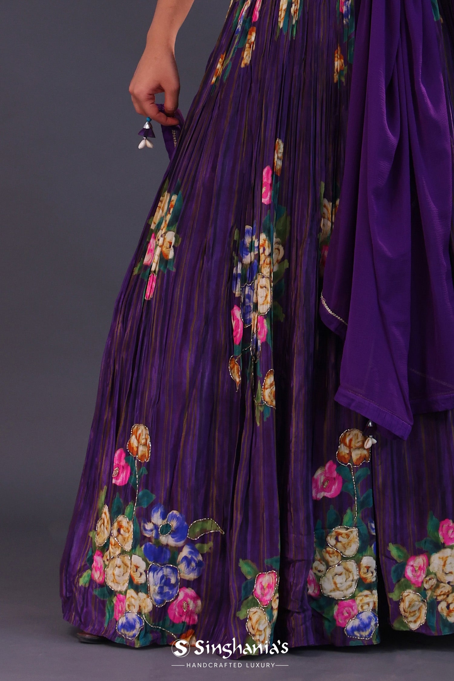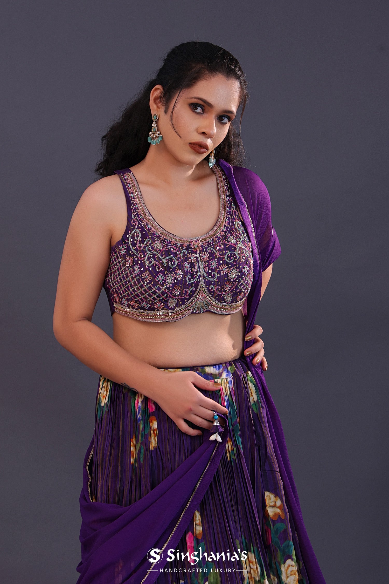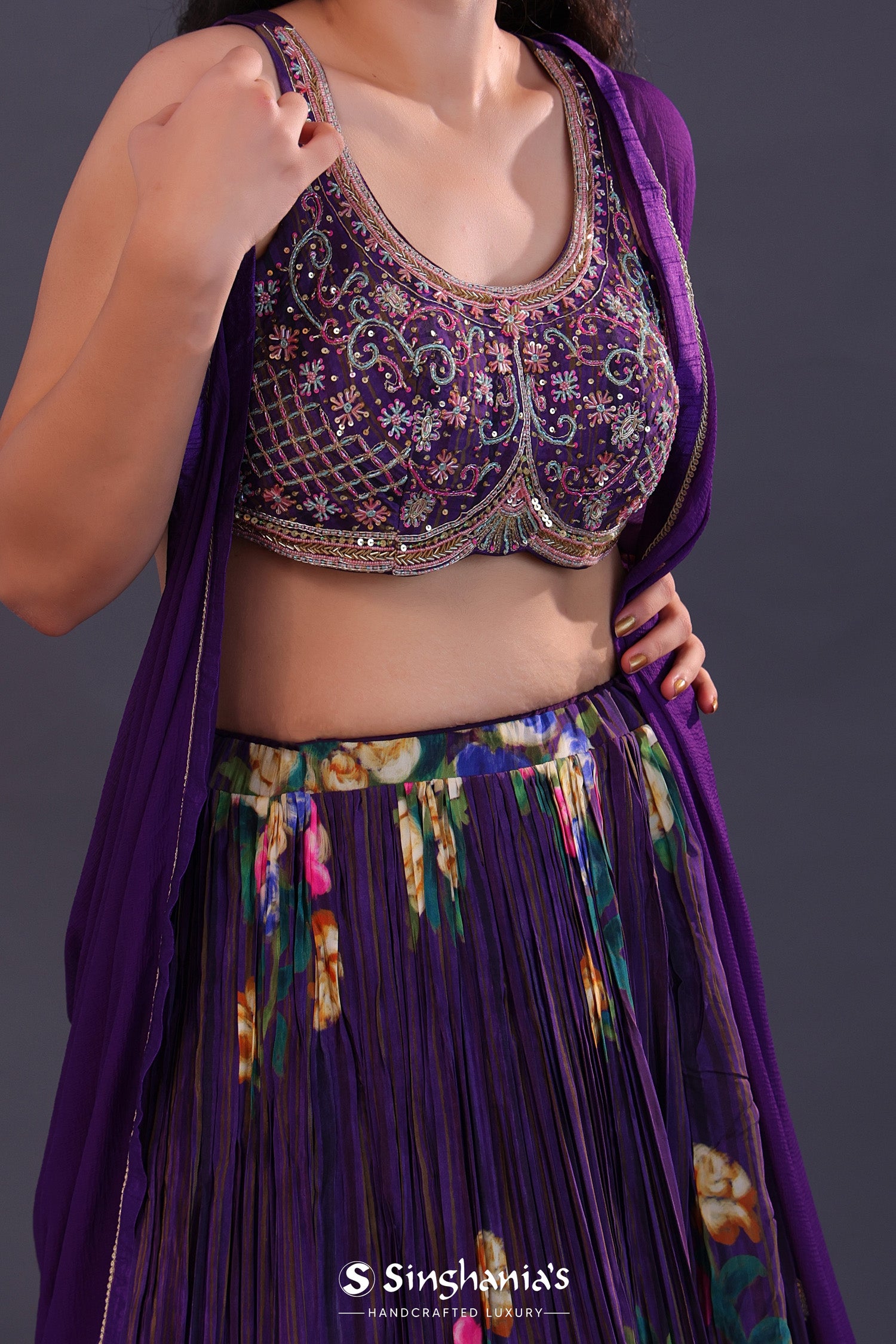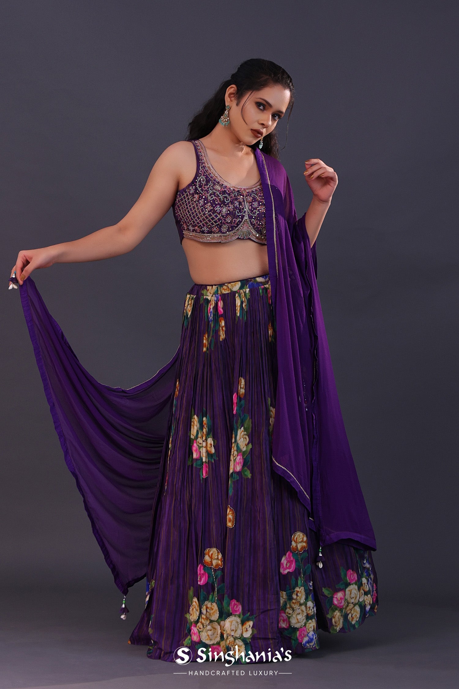 The deep violet chinon floral printed lehenga set with chiffon dupatta and raw silk blouse for a beautiful look combined with style and tradition.