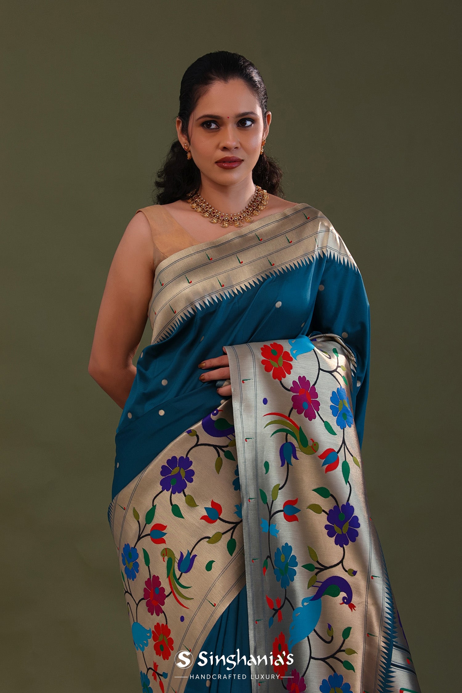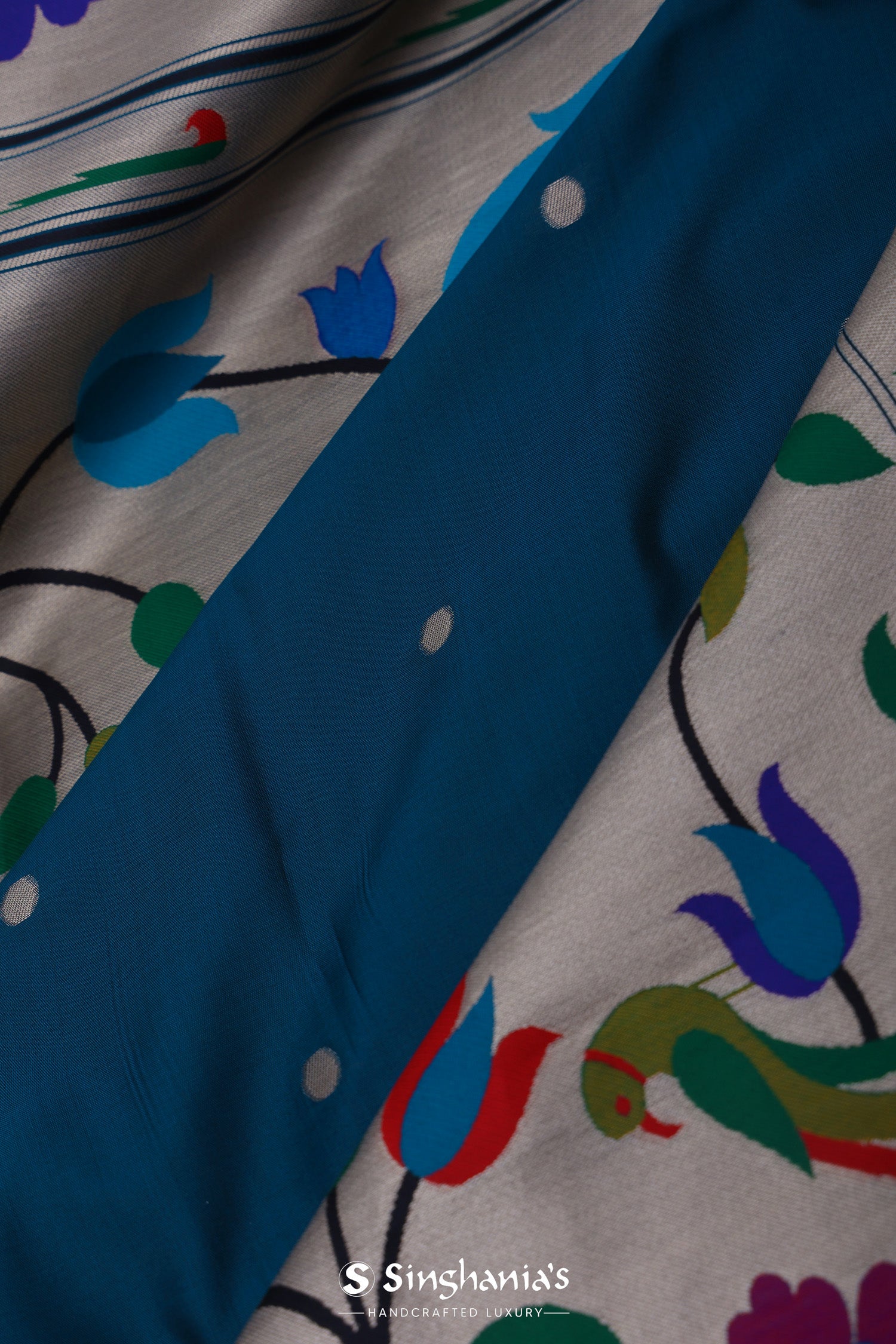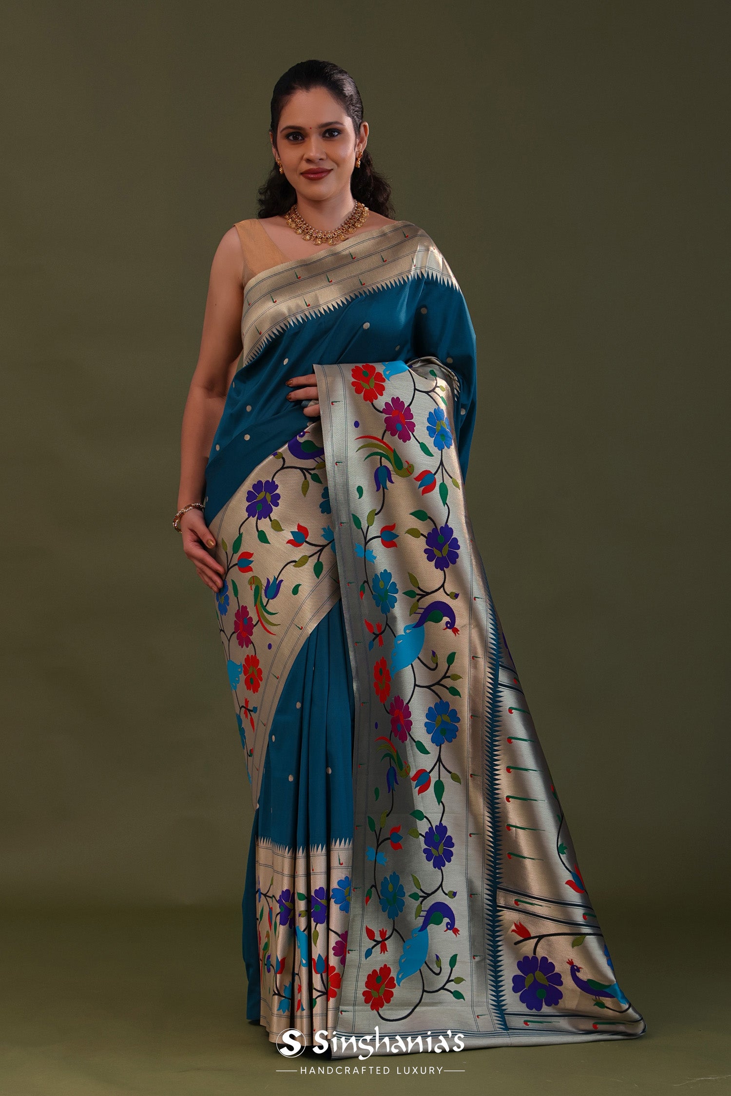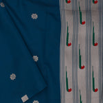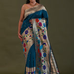 The elephant bluish cyan features butti's woven with gold zari complemented with paithani border and unstitched blouse