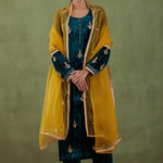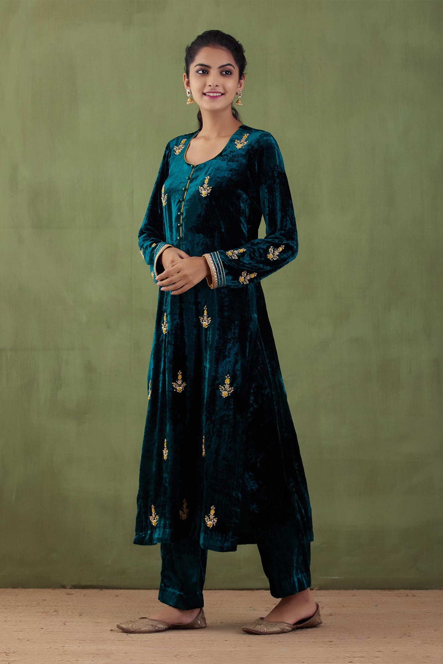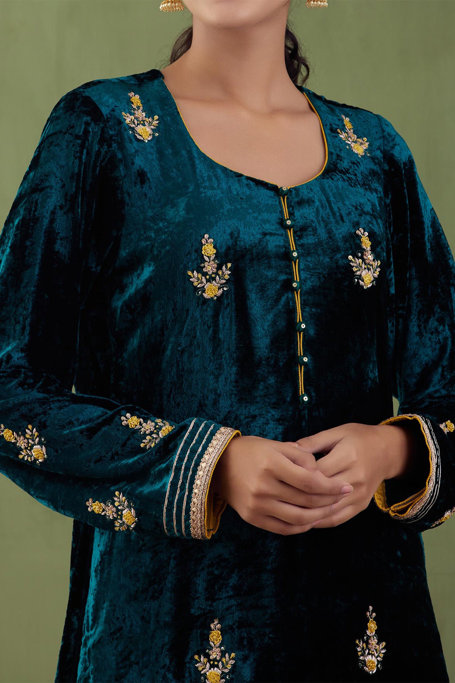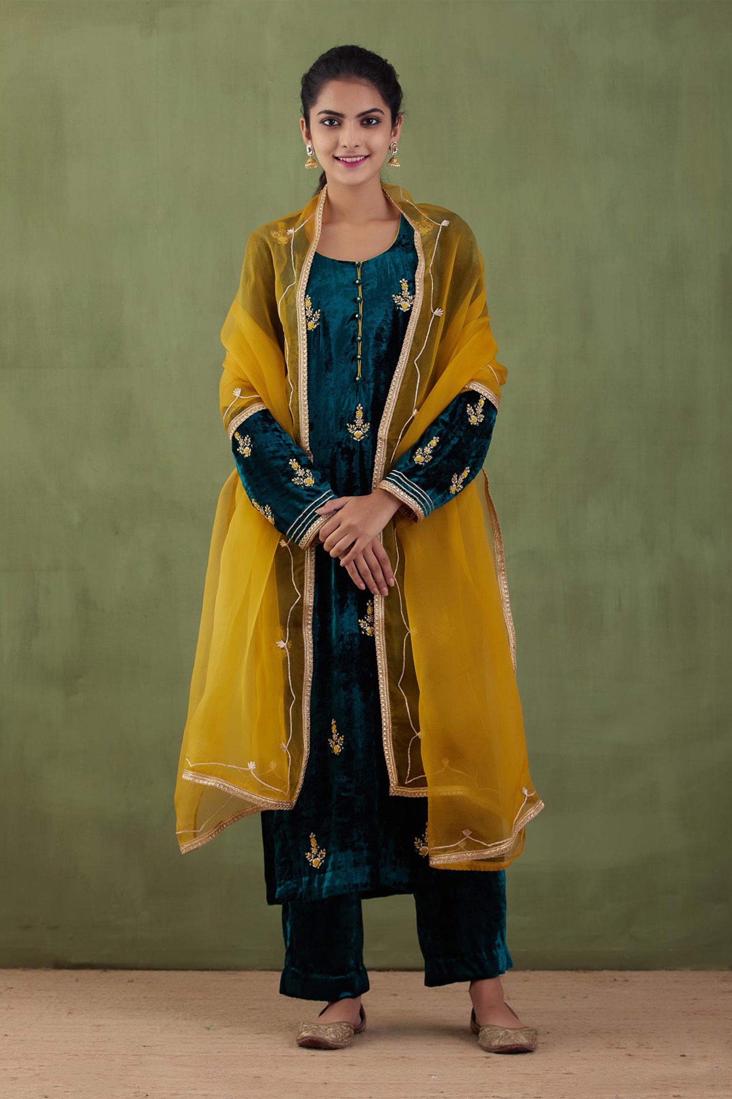 The emerald green velvet straight zardosi work kurta and plain pant with gota work and organza dupatta for a rich and elegant look.