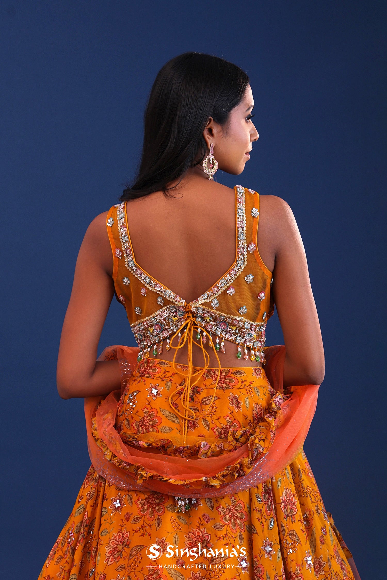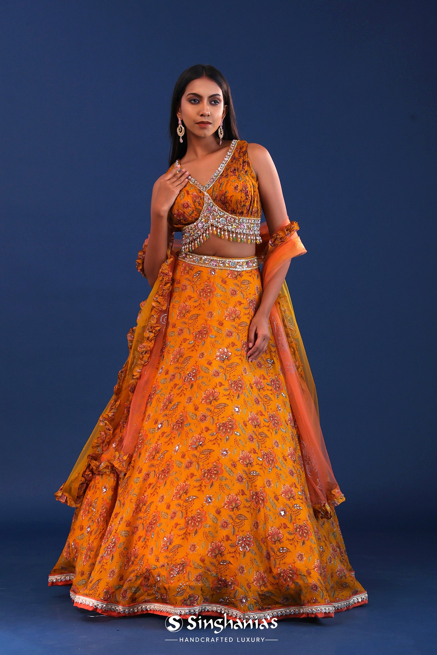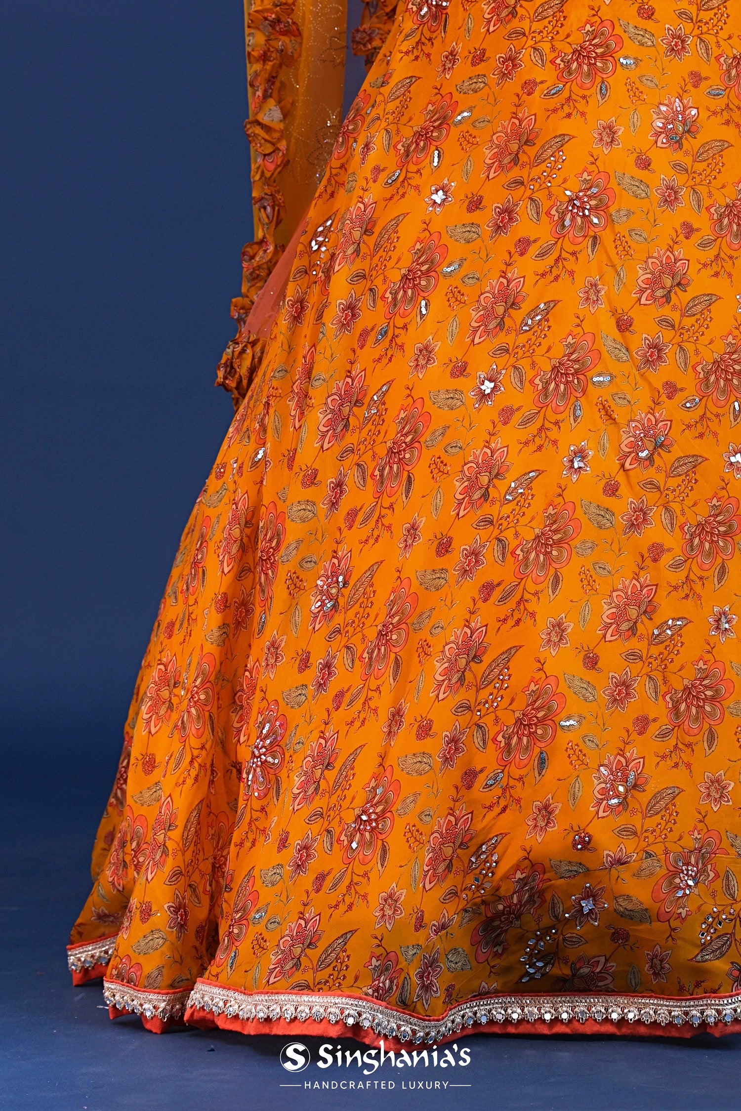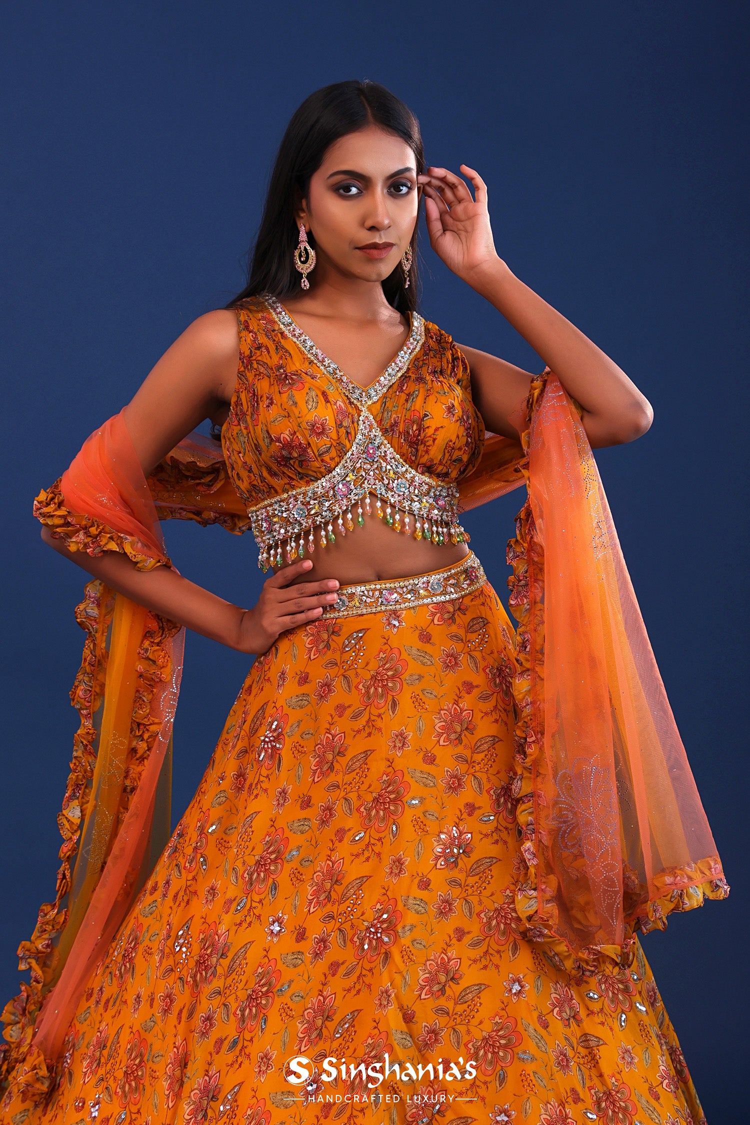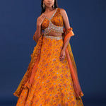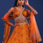 The bright orange organza floral lehenga set with matching netted dupatta for a classy traditional look.