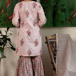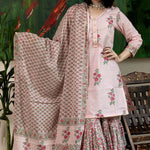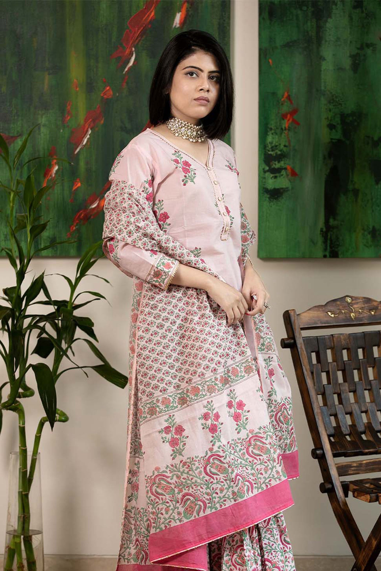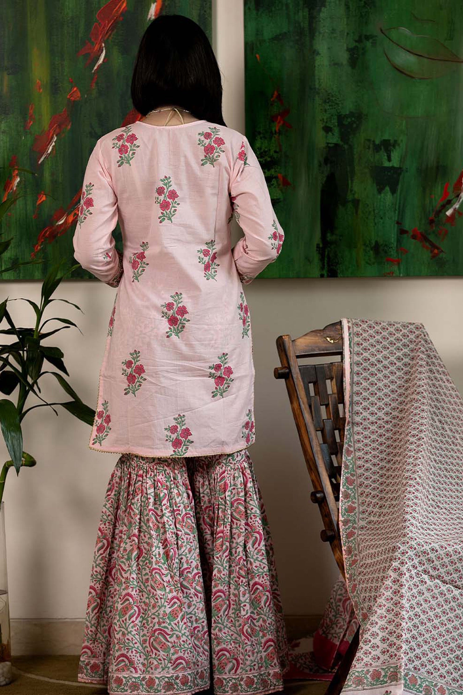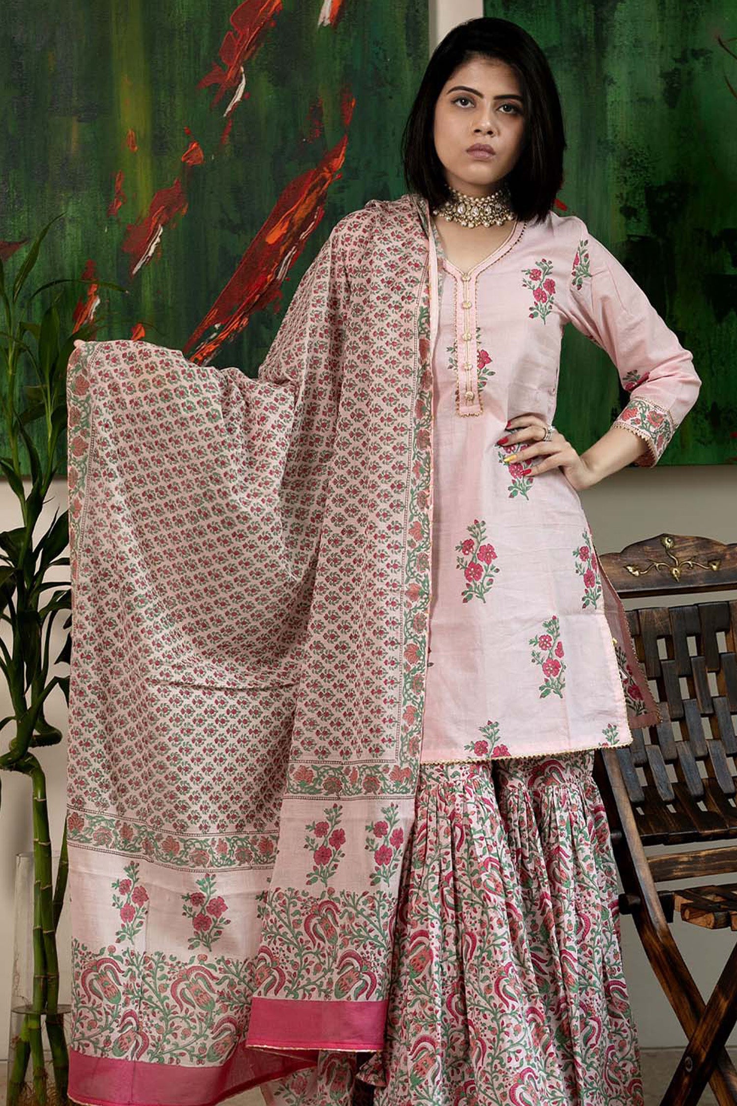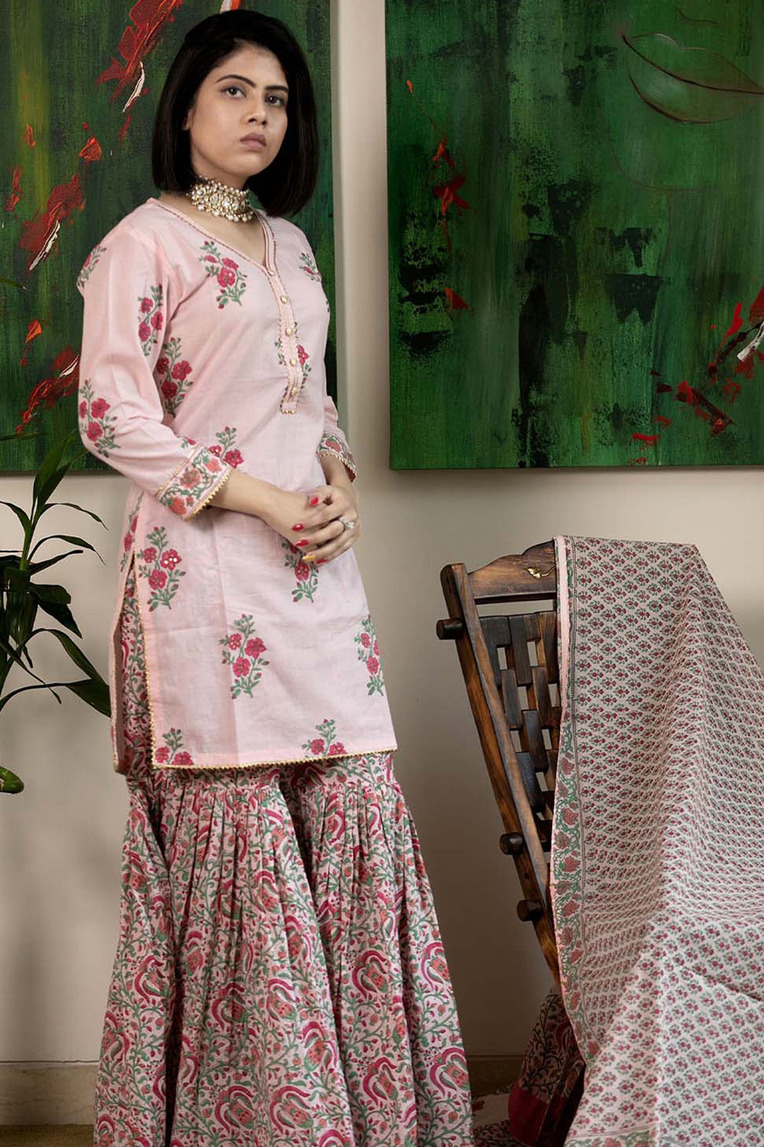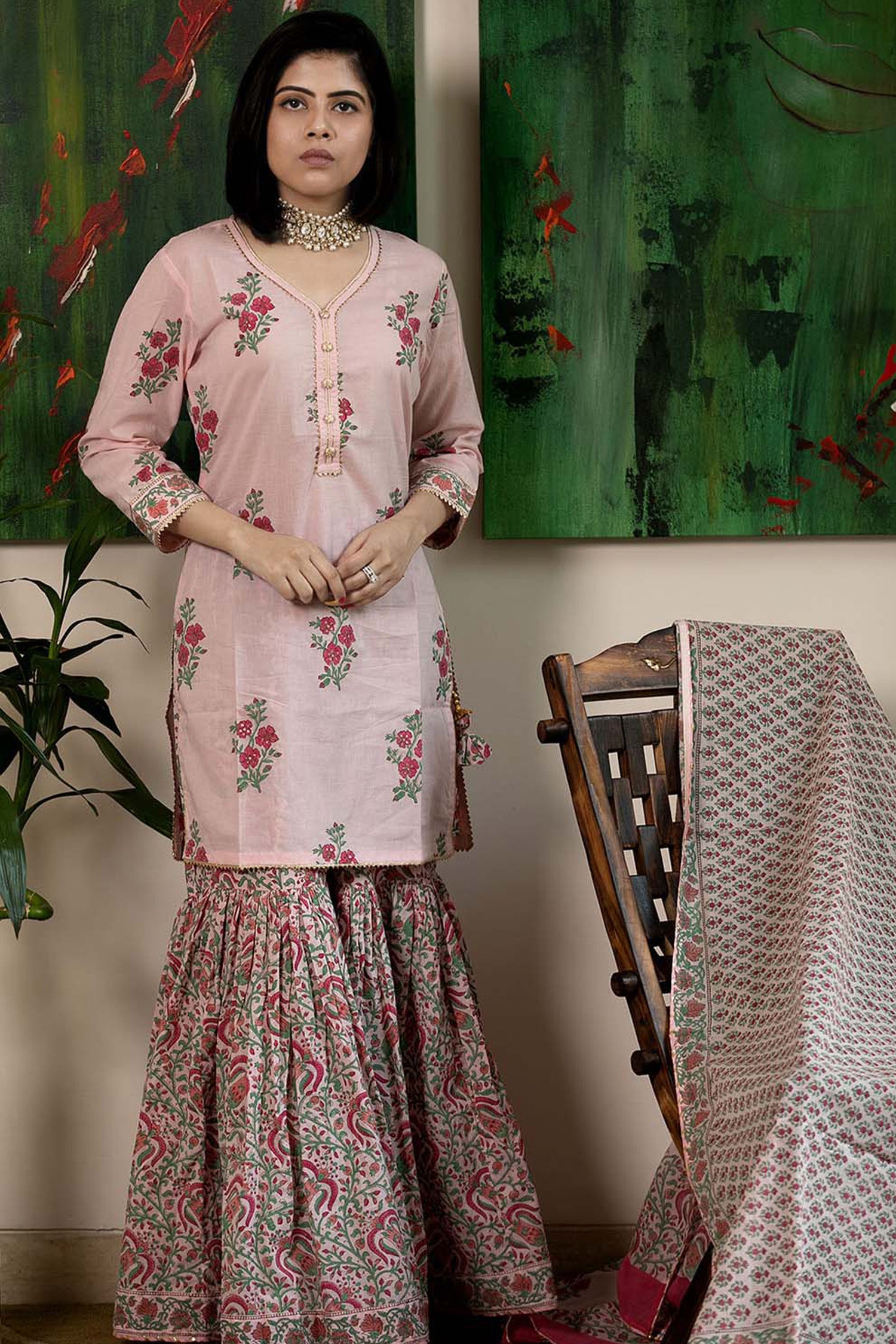 This Elegant pink sharara set adorned with beautiful red floral block prints along with the matching gharara and dupatta is ideal for the festive occasions, offering both comfort and the sophisticated look.
