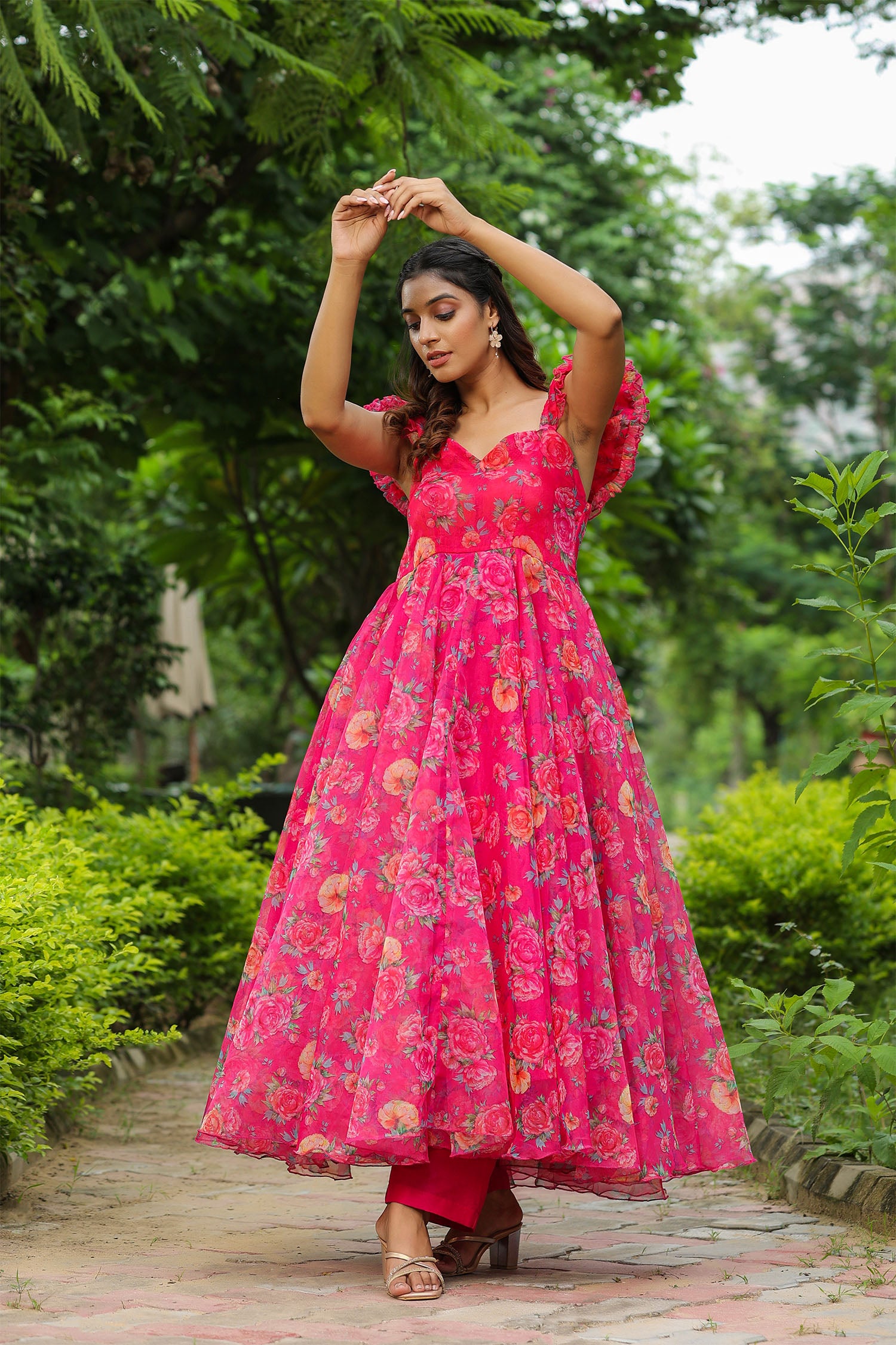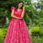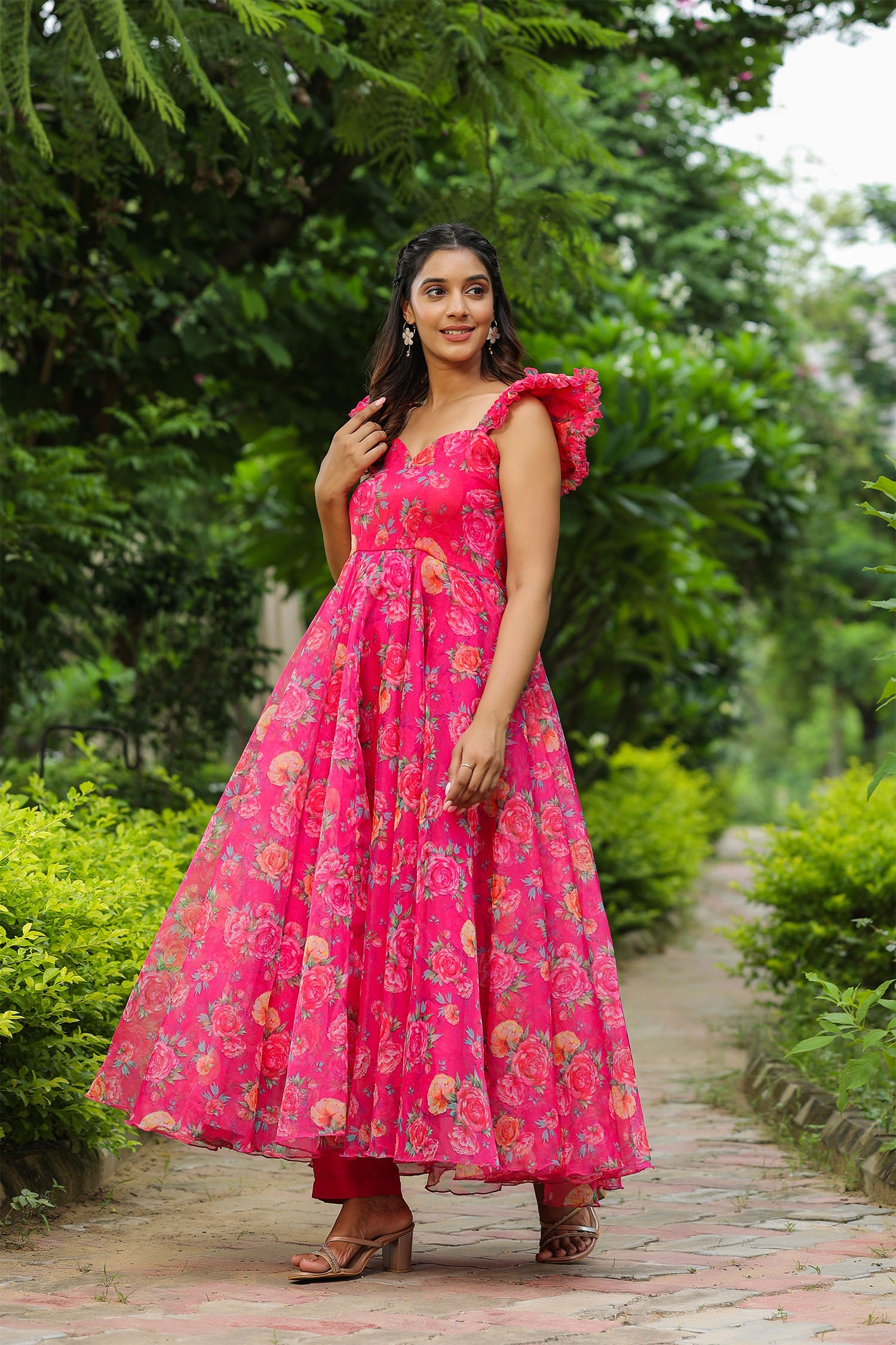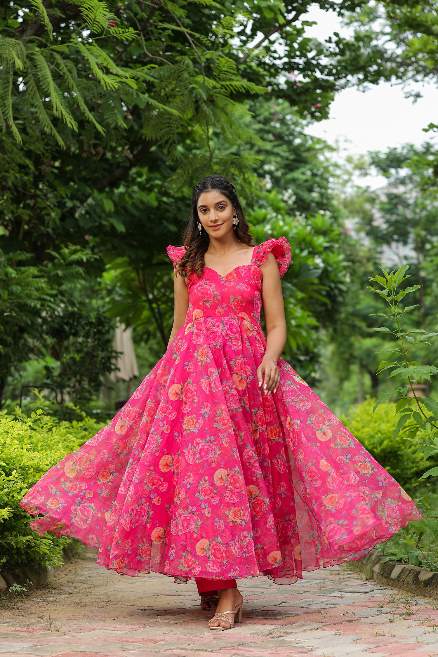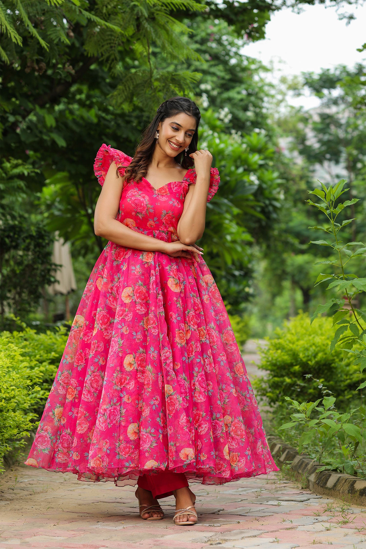 The french rose pink organza floral printed traditional gown for a graceful look in style.