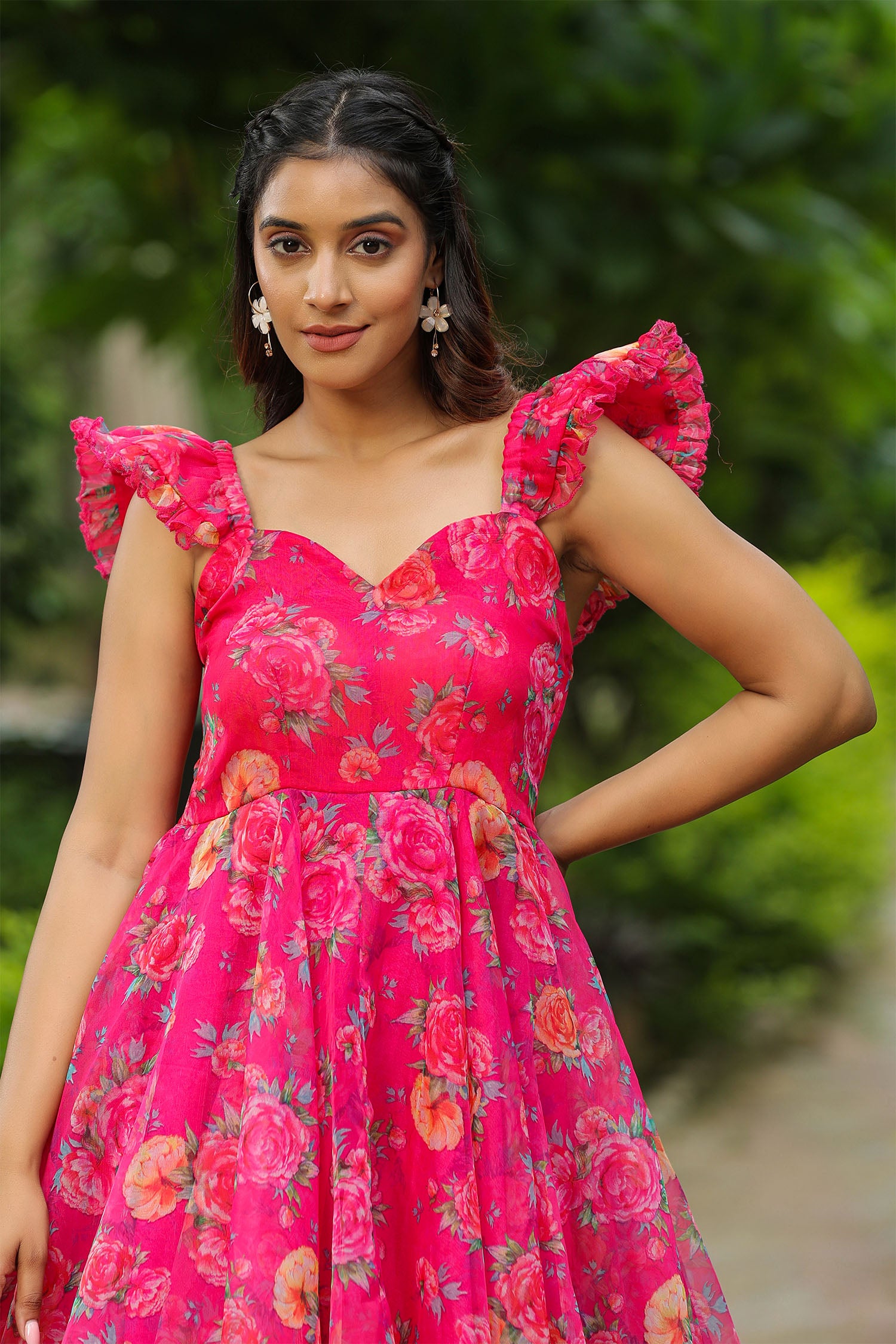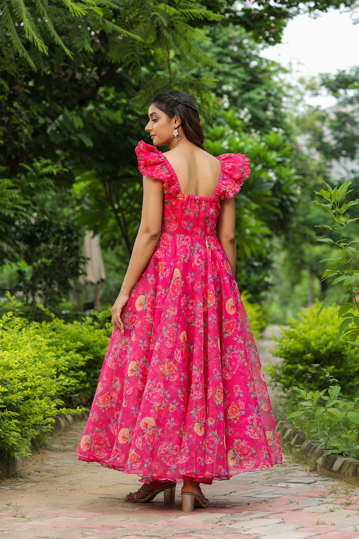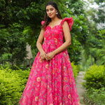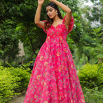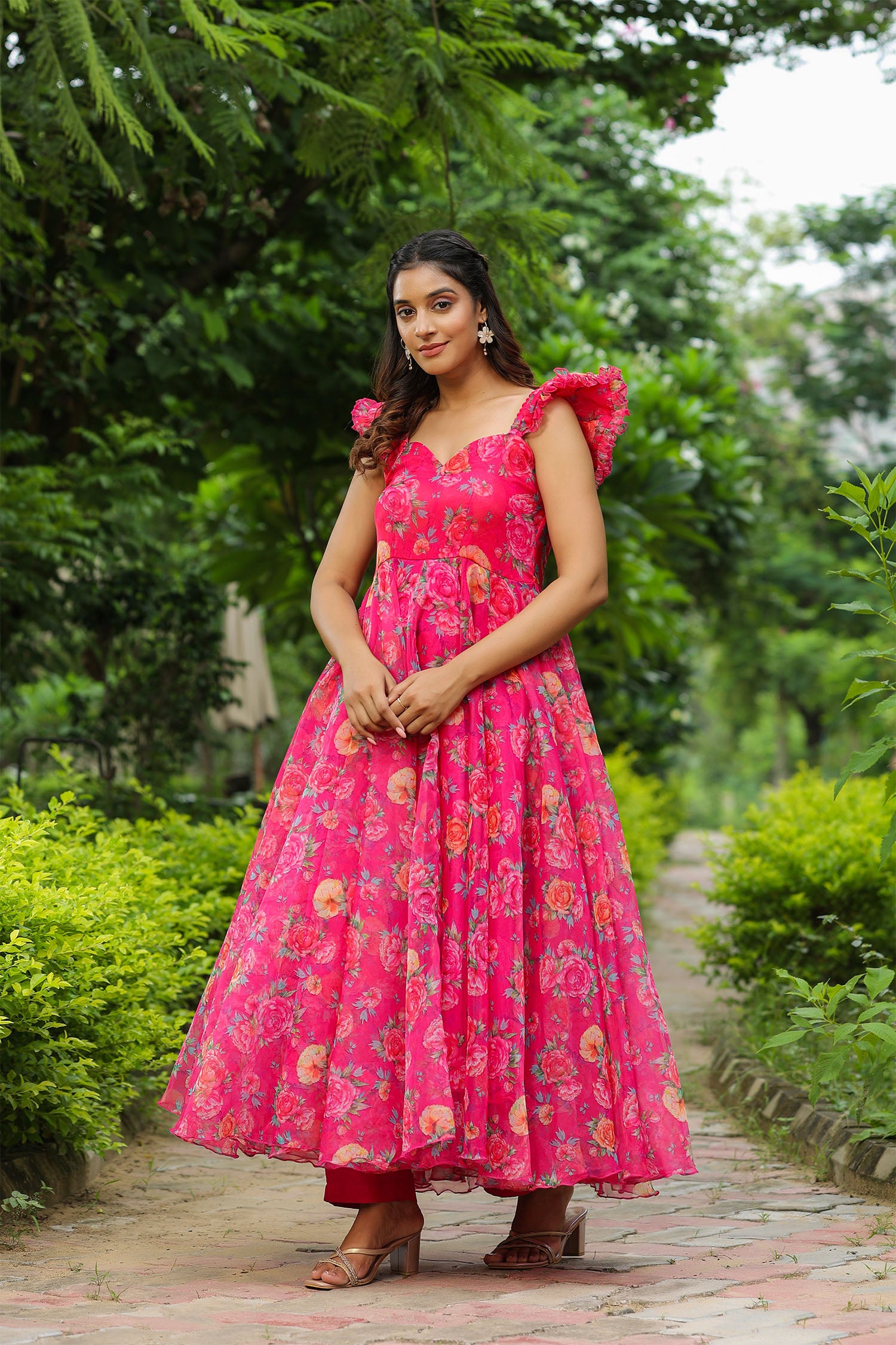 The french rose pink organza floral printed traditional gown for a graceful look in style.