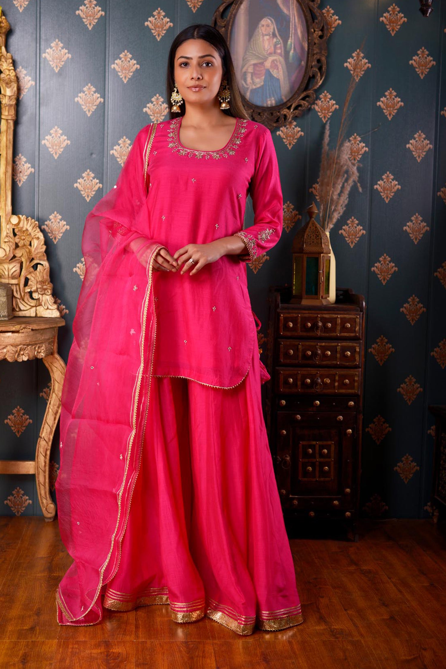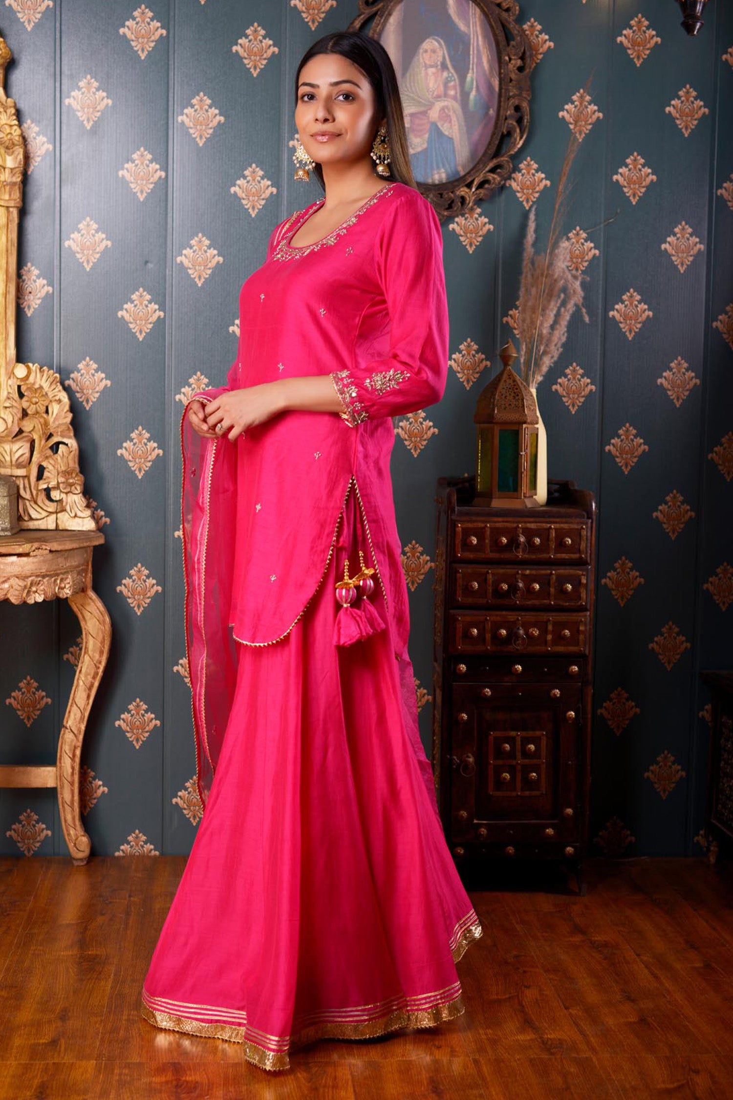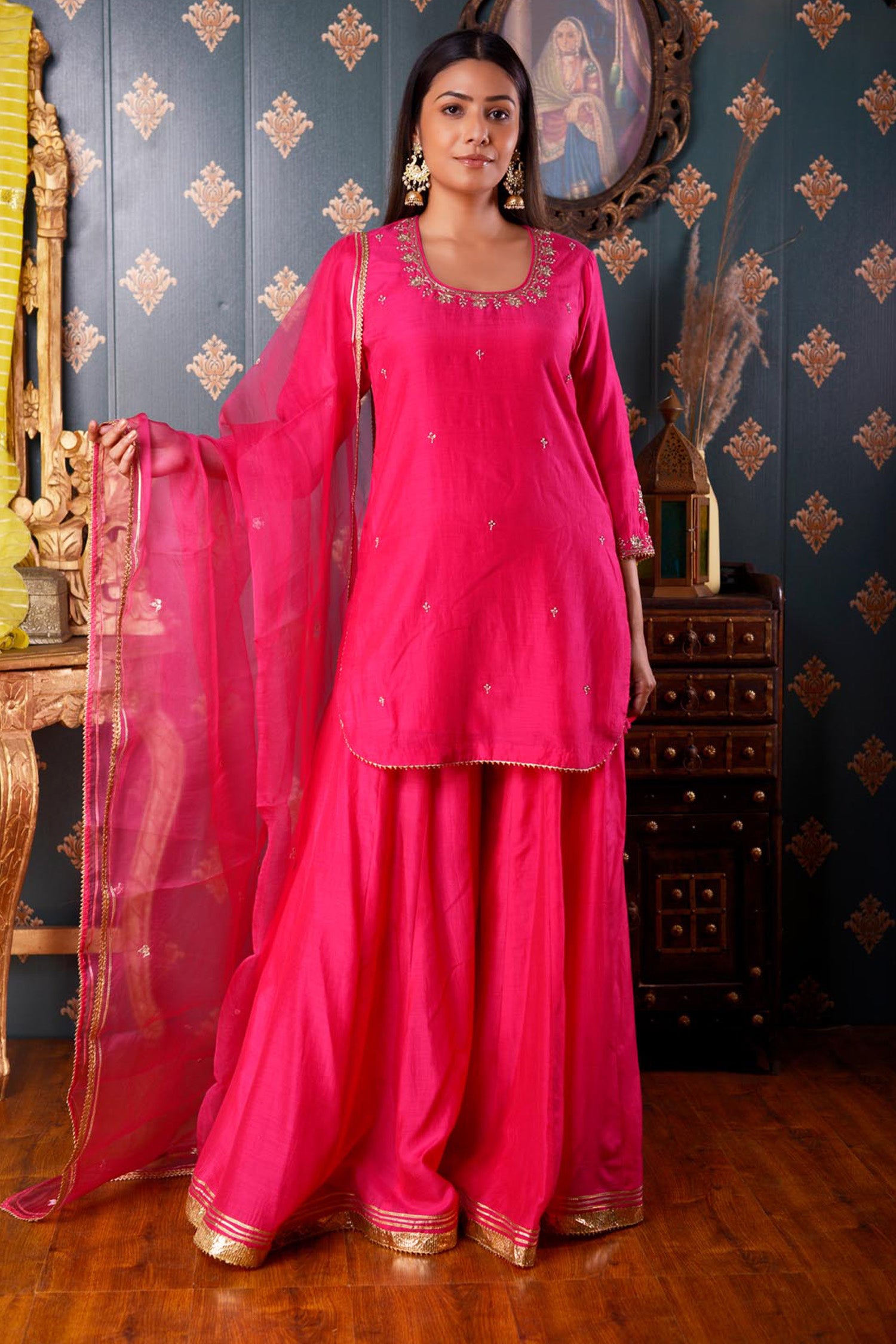 The Hand Embroidery Bright Pink Cotton Silk Sharara Set, this three piece Sharara set includes Bright Pink Cotton Silk Hand Embroidered Kurta ,Pant And Dupatta With Lace Finish .