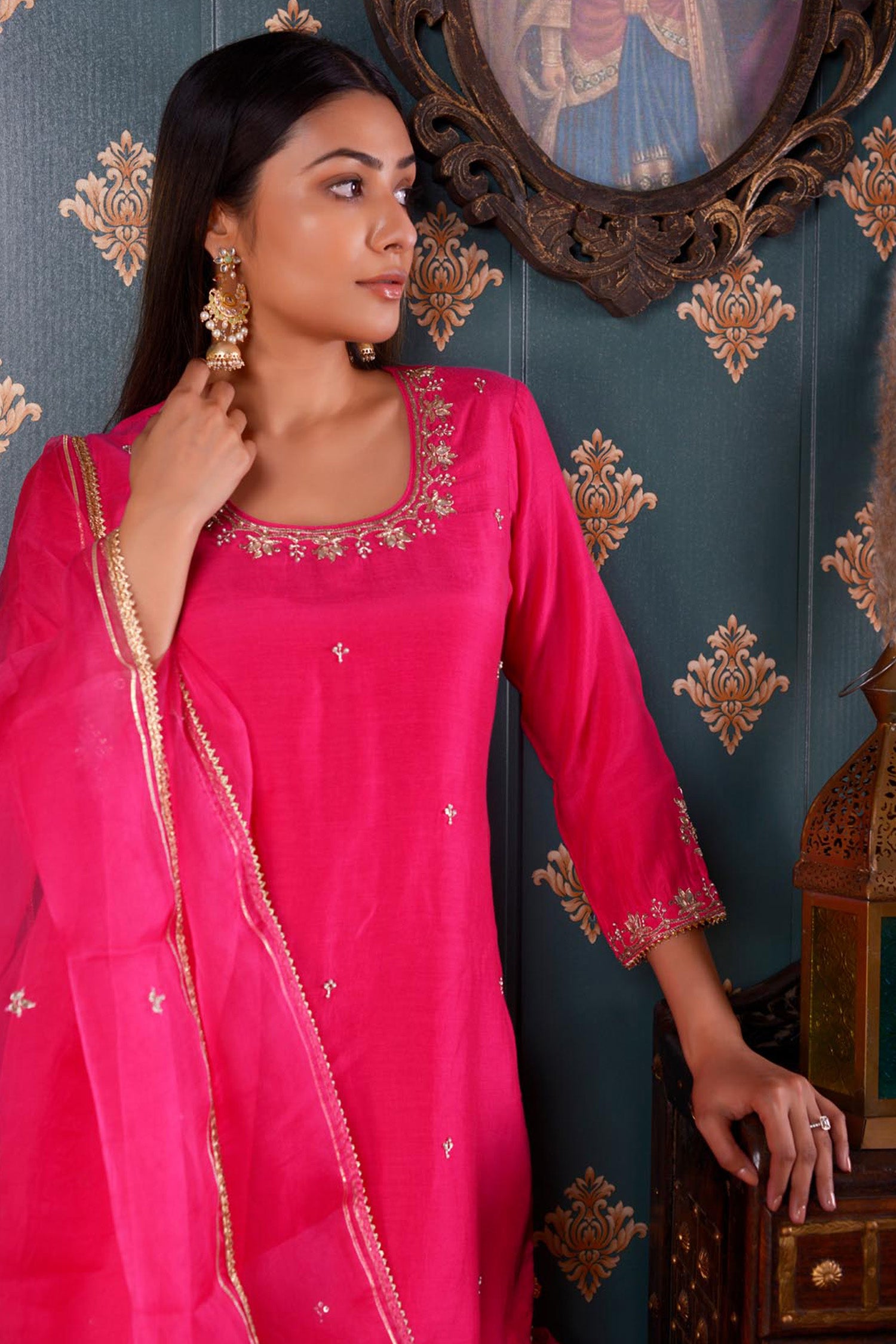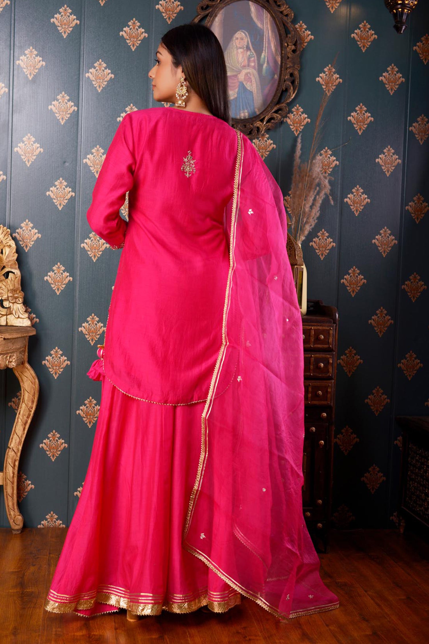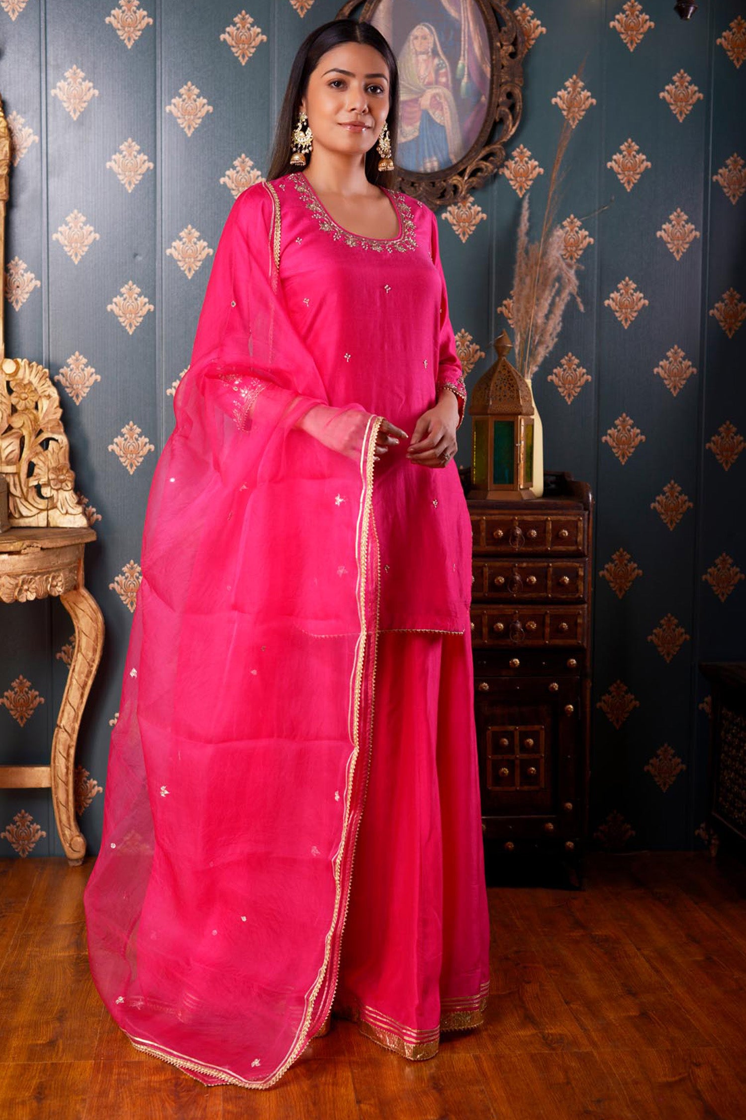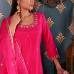 The Hand Embroidery Bright Pink Cotton Silk Sharara Set, this three piece Sharara set includes Bright Pink Cotton Silk Hand Embroidered Kurta ,Pant And Dupatta With Lace Finish .