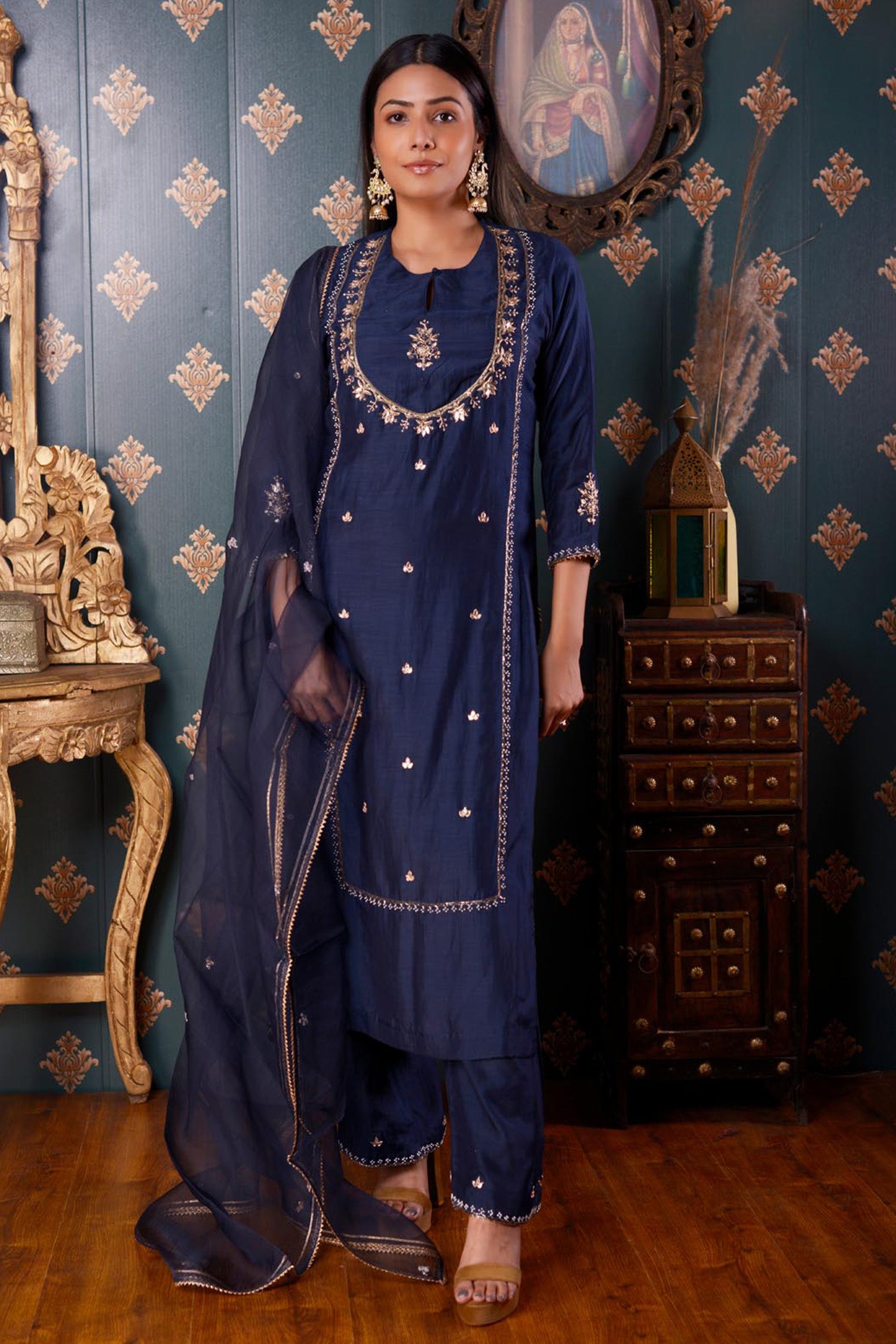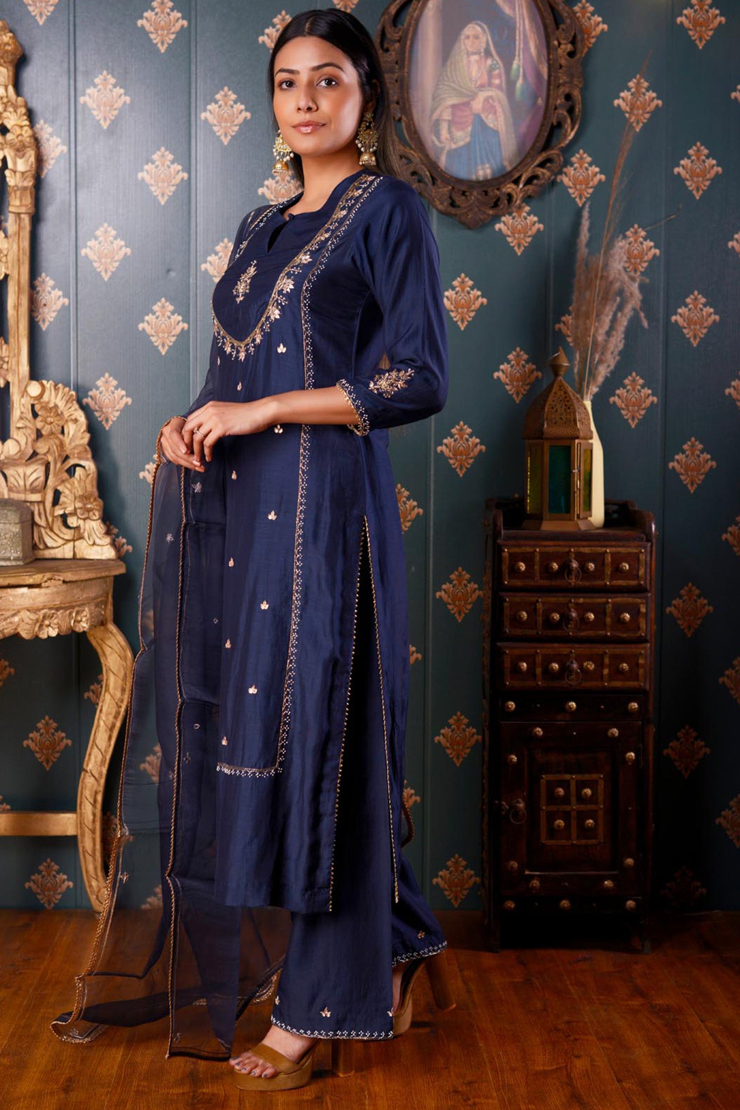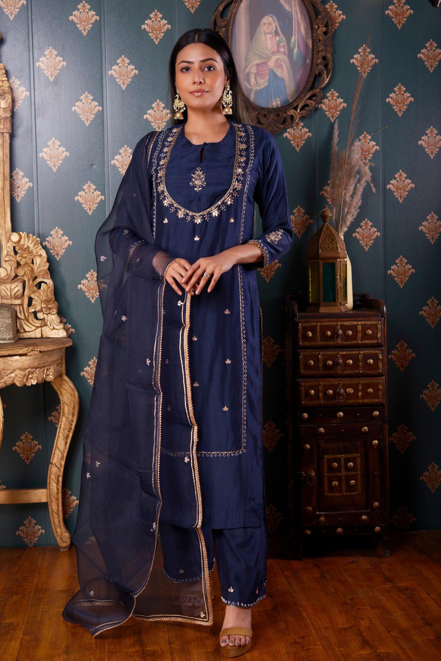 The Hand Embroidery Navy Blue Cotton Silk Kurta Set includes Navy Blue Cotton Silk Hand Embroidered Kurta ,Pant And Dupatta With Lace Finish for a beautiful look with elegance .