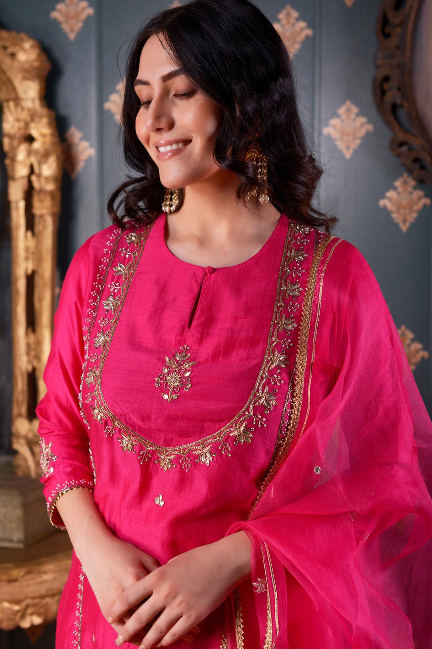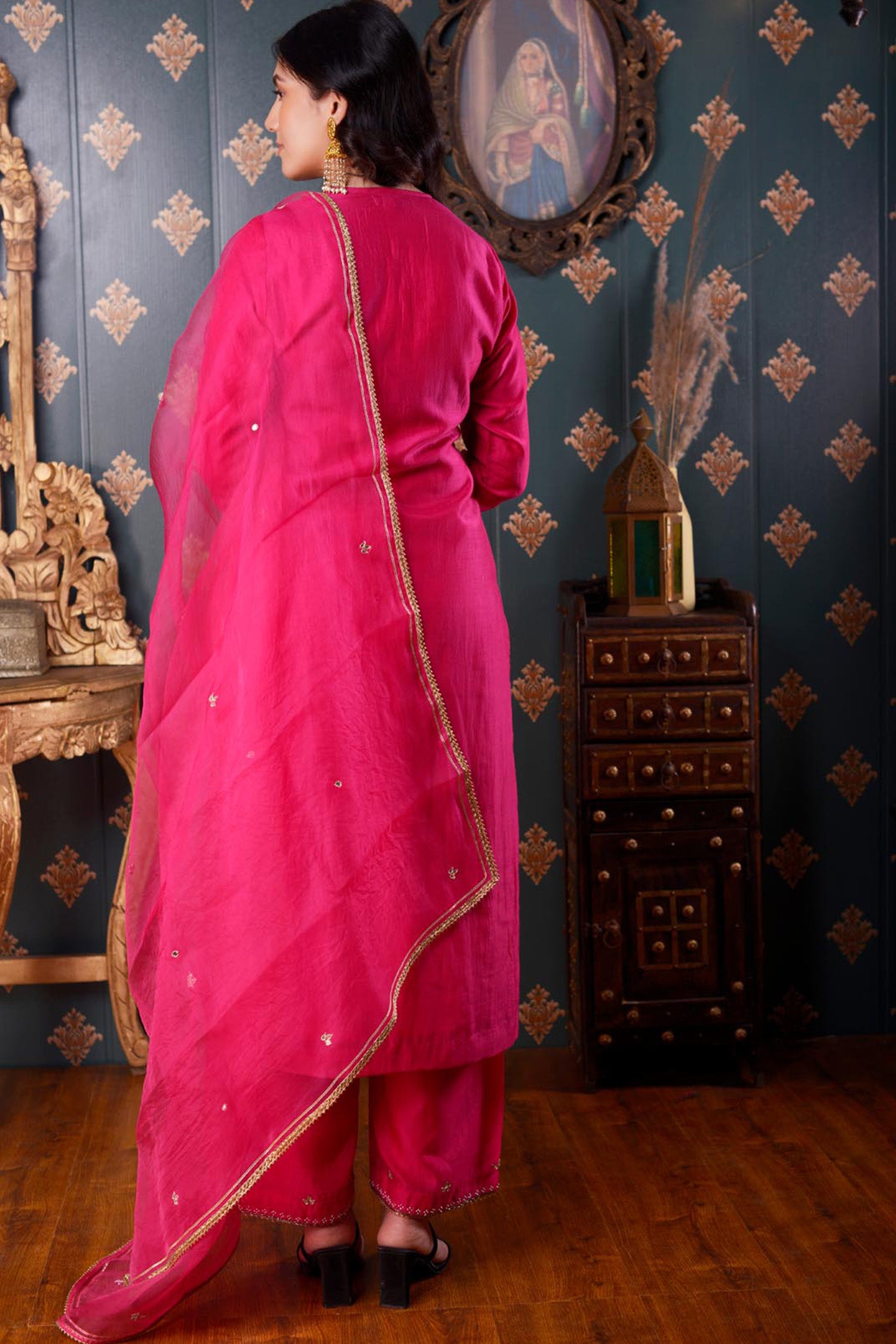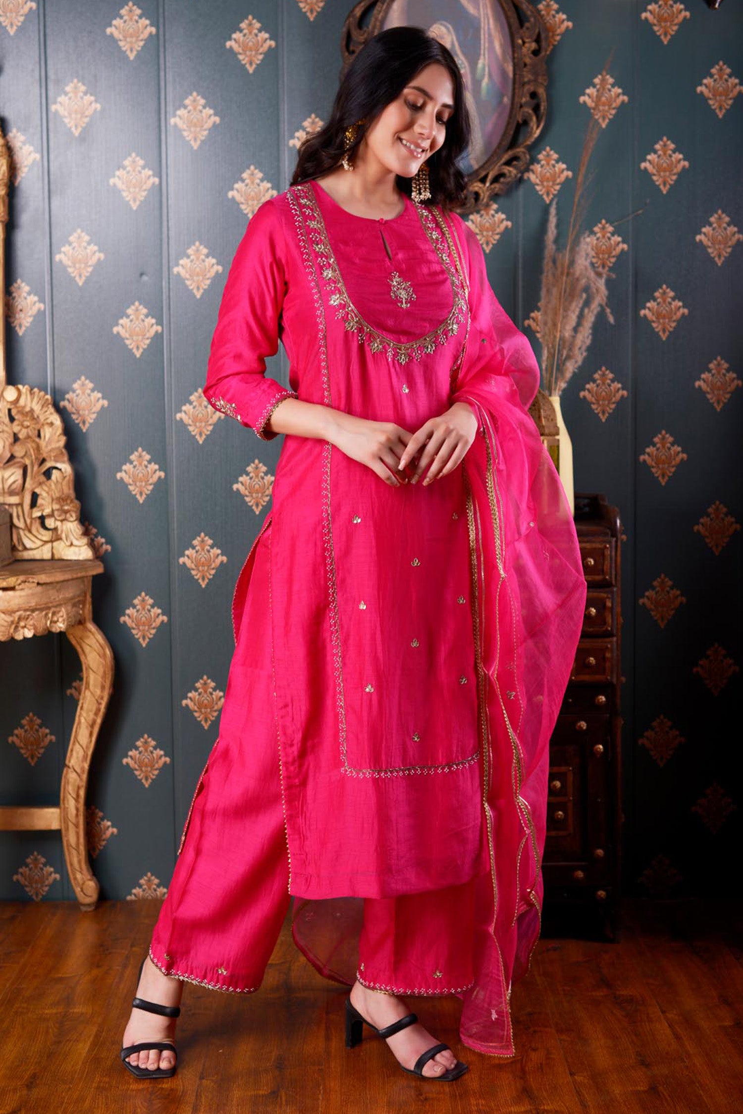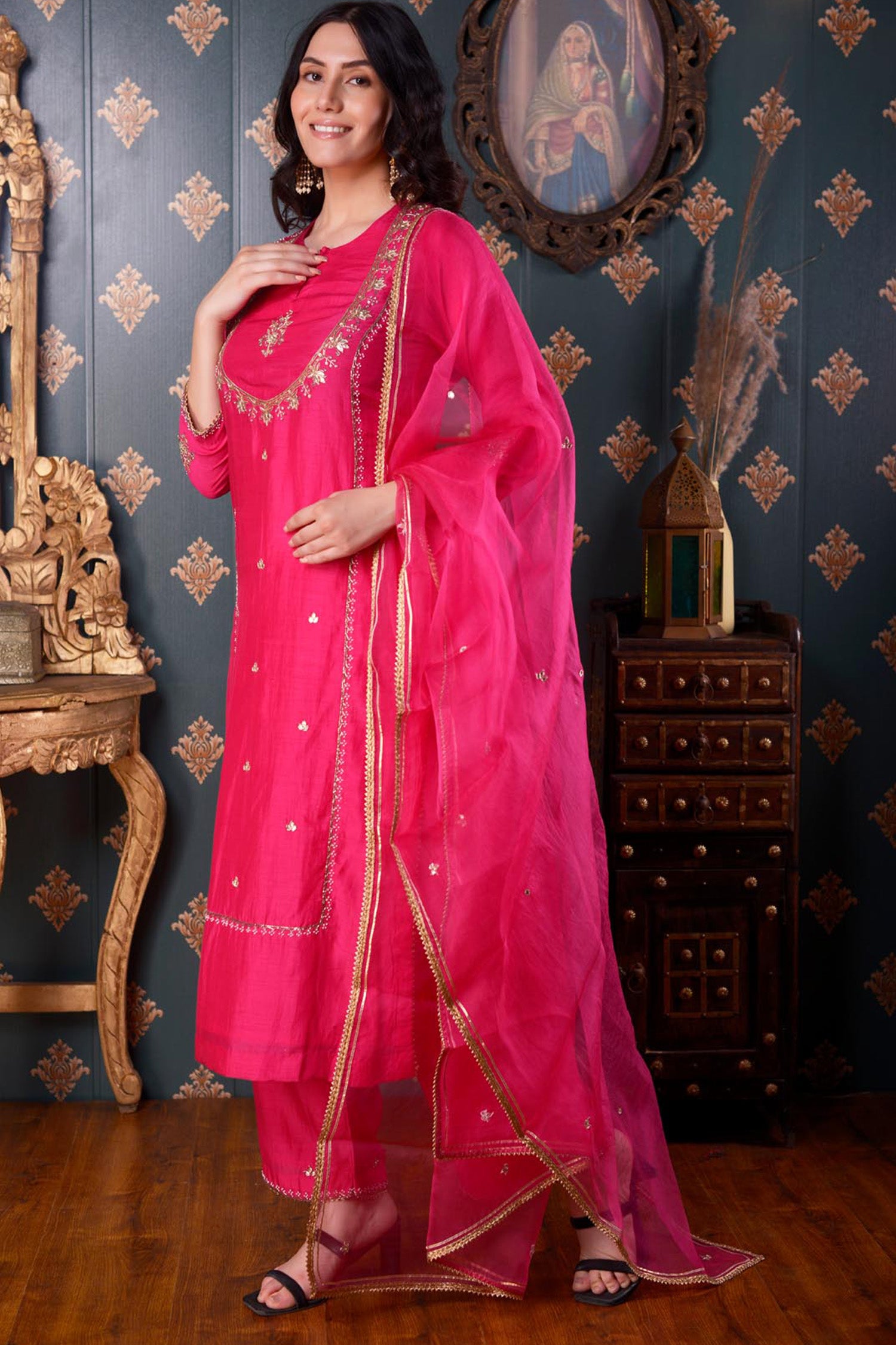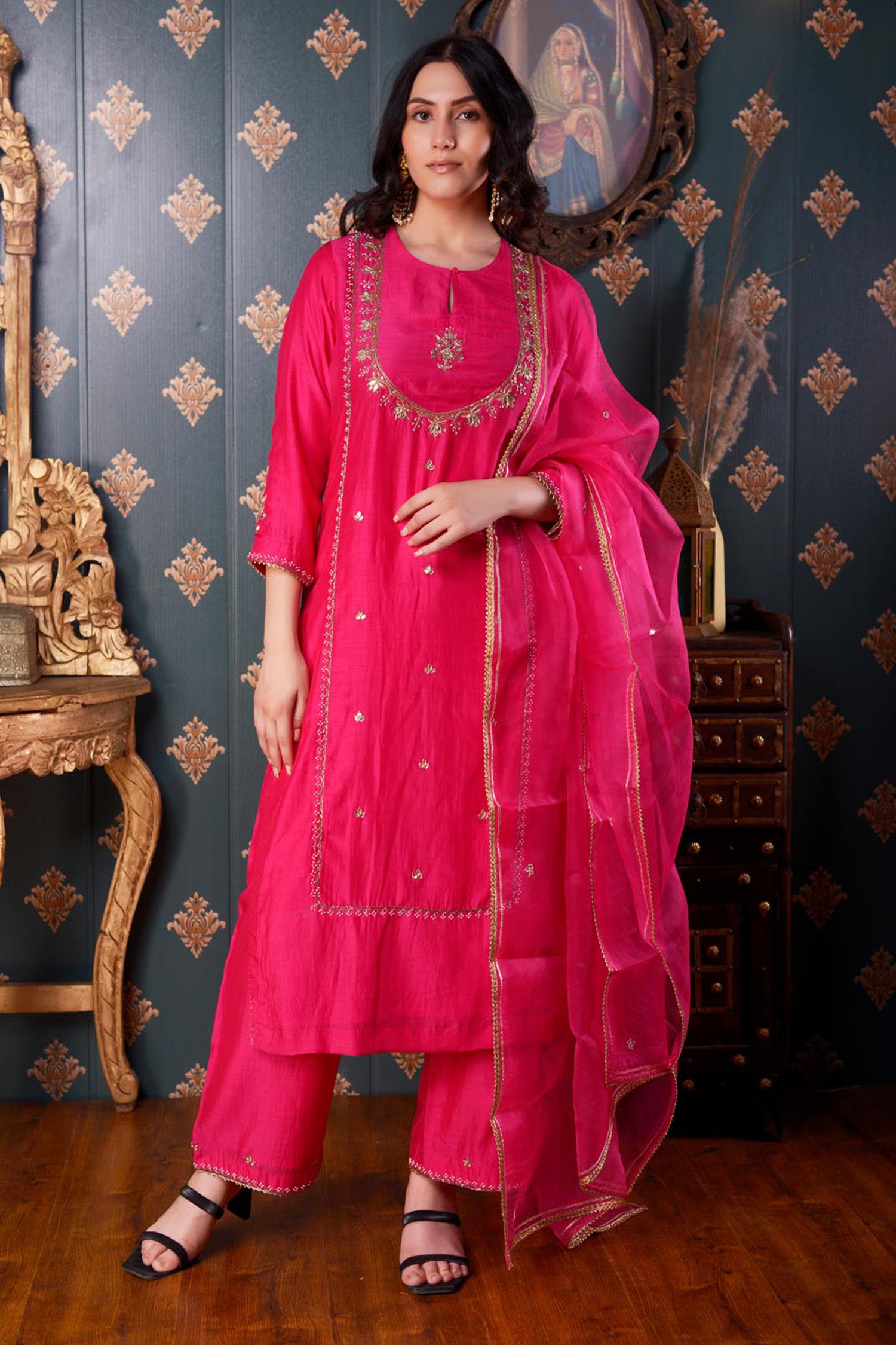 The Hand Embroidery Rani Pink Cotton Silk Kurta Set includes Rani Pink Cotton Silk Hand Embroidered Kurta ,Pant And Dupatta With Lace Finish for a beautiful look with elegance .
