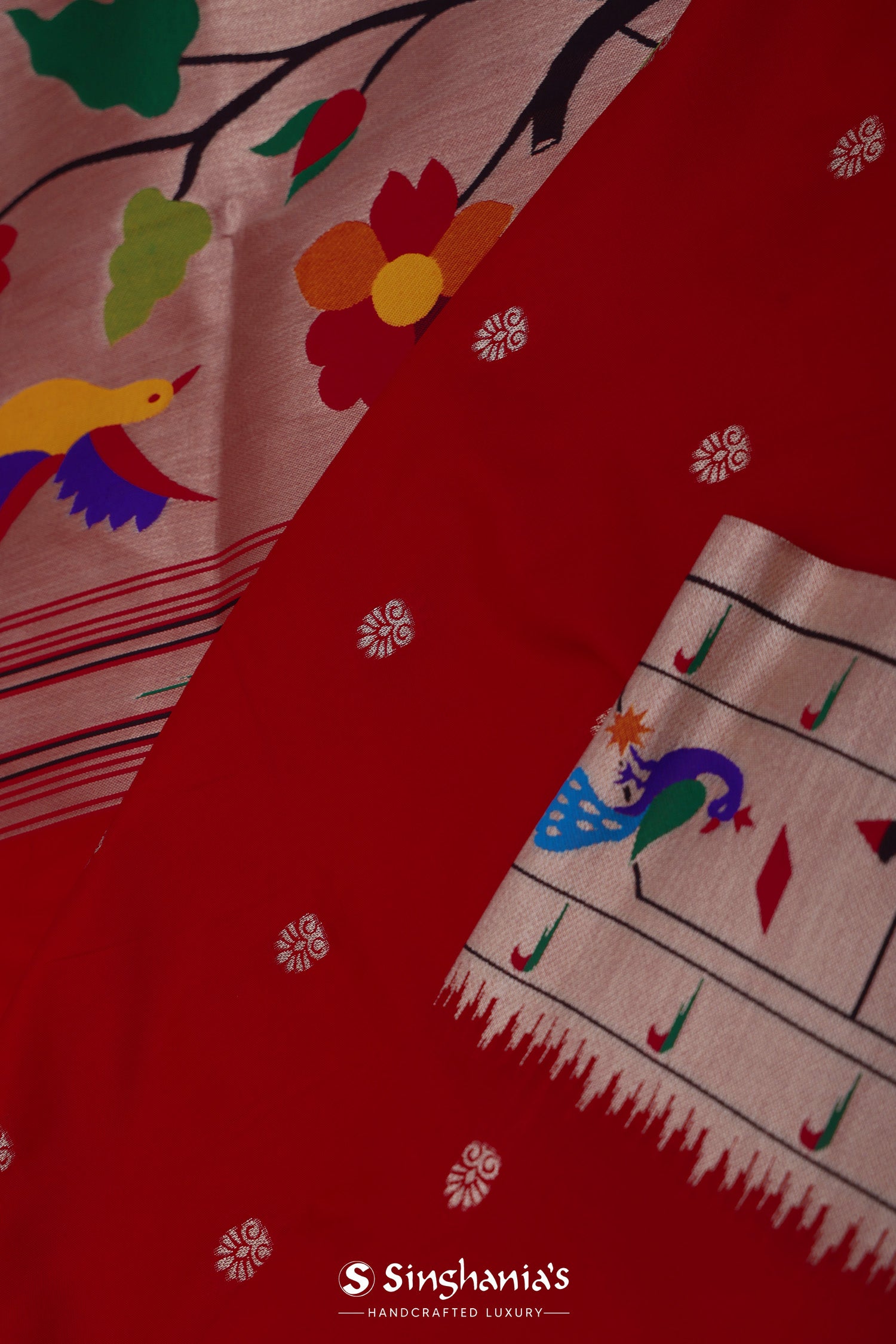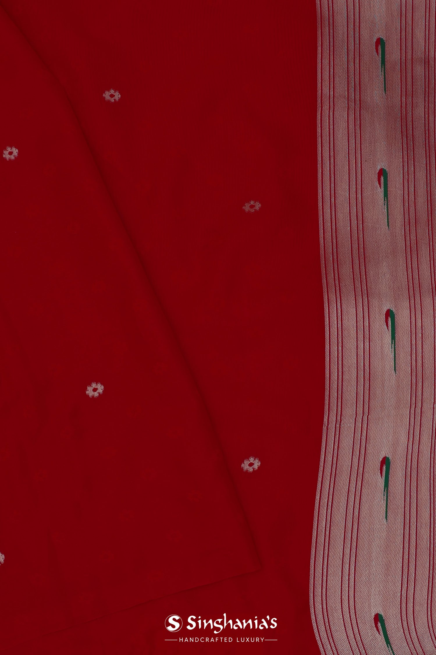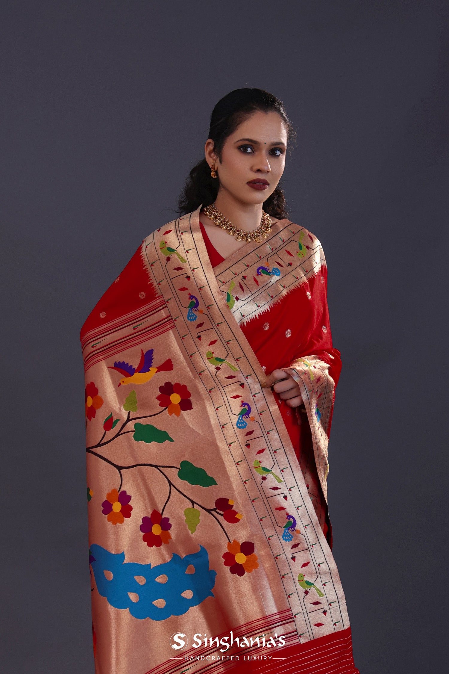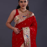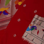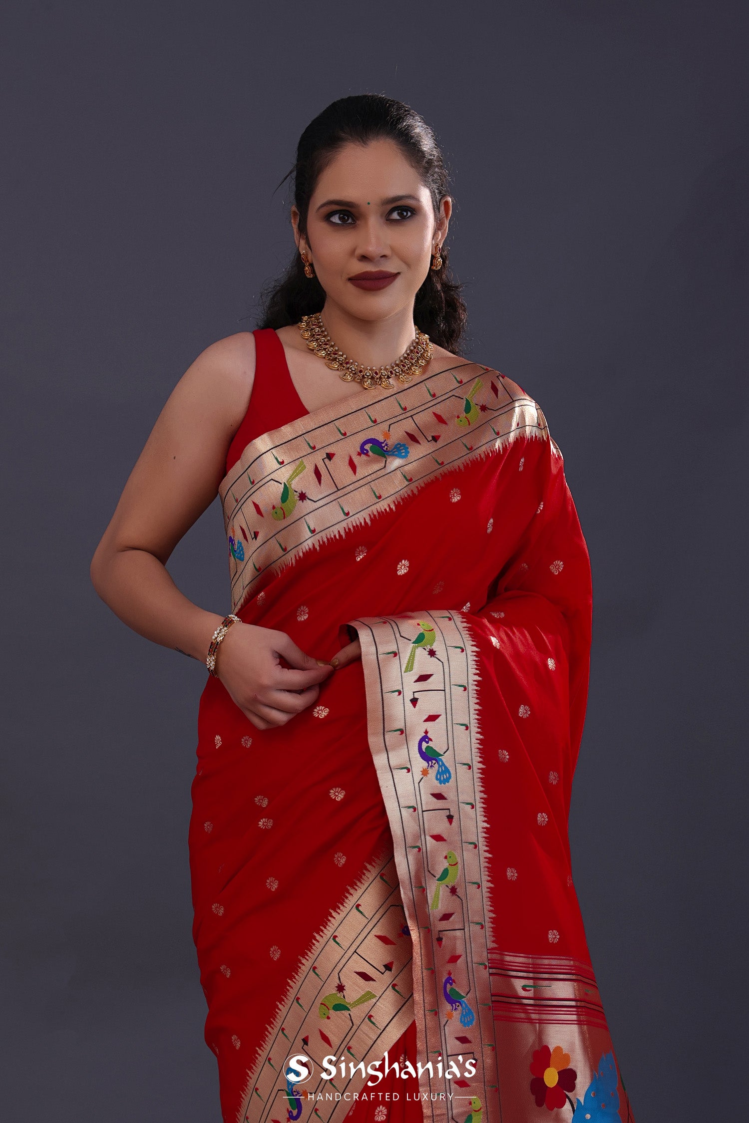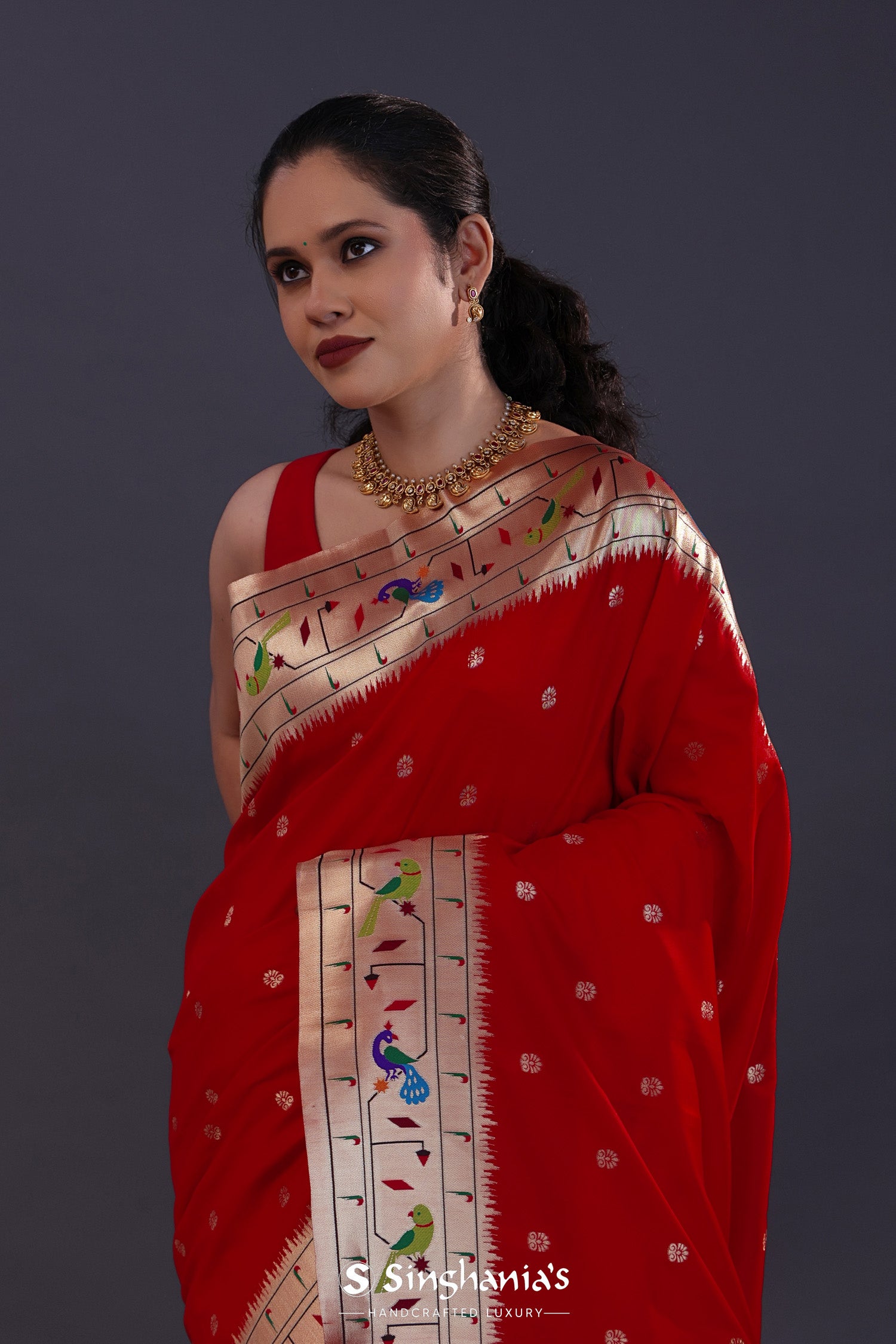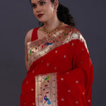 The Japanese maple paithani saree features butti's woven with gold zari complemented with paithani border and unstitched blouse