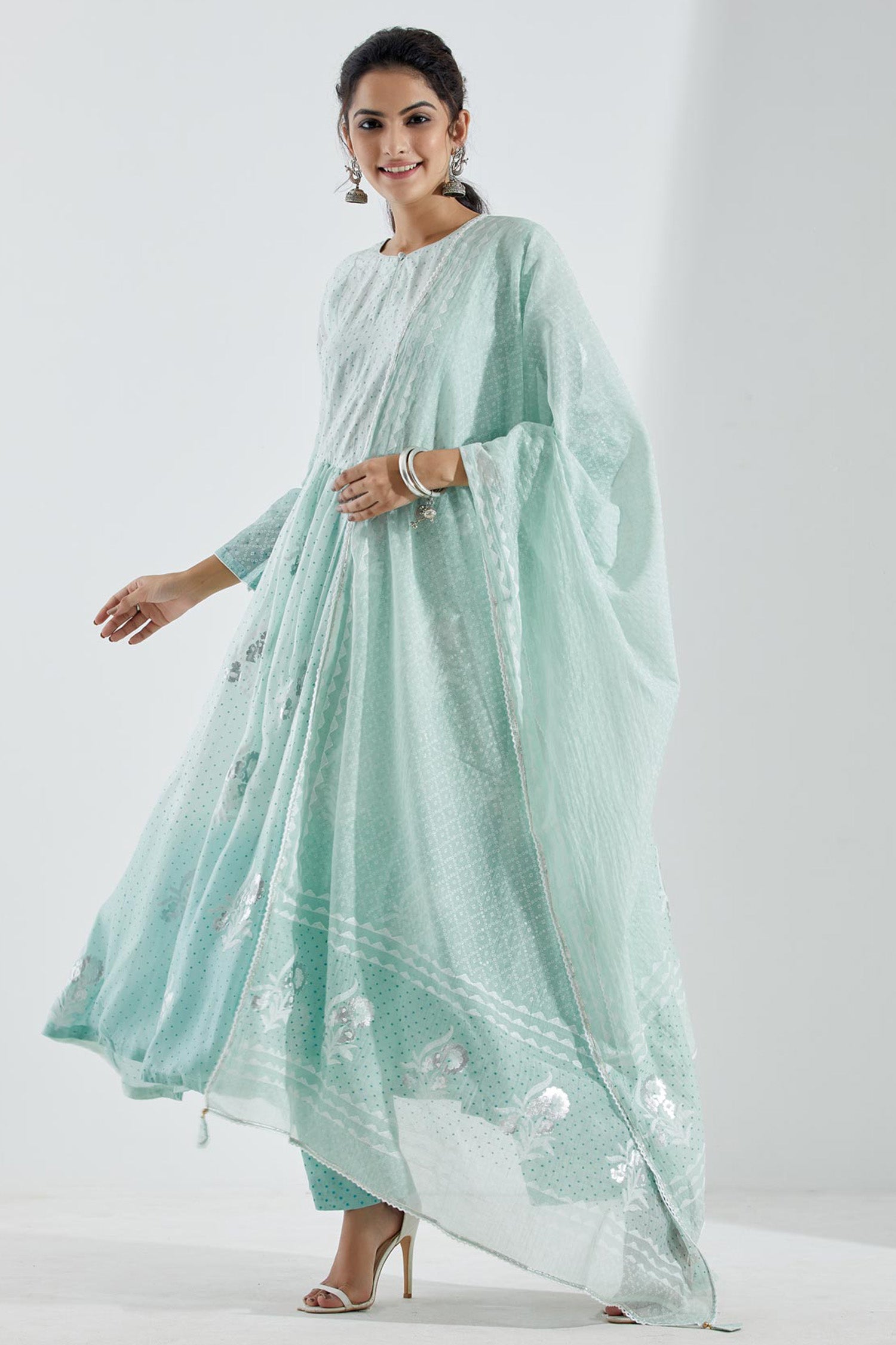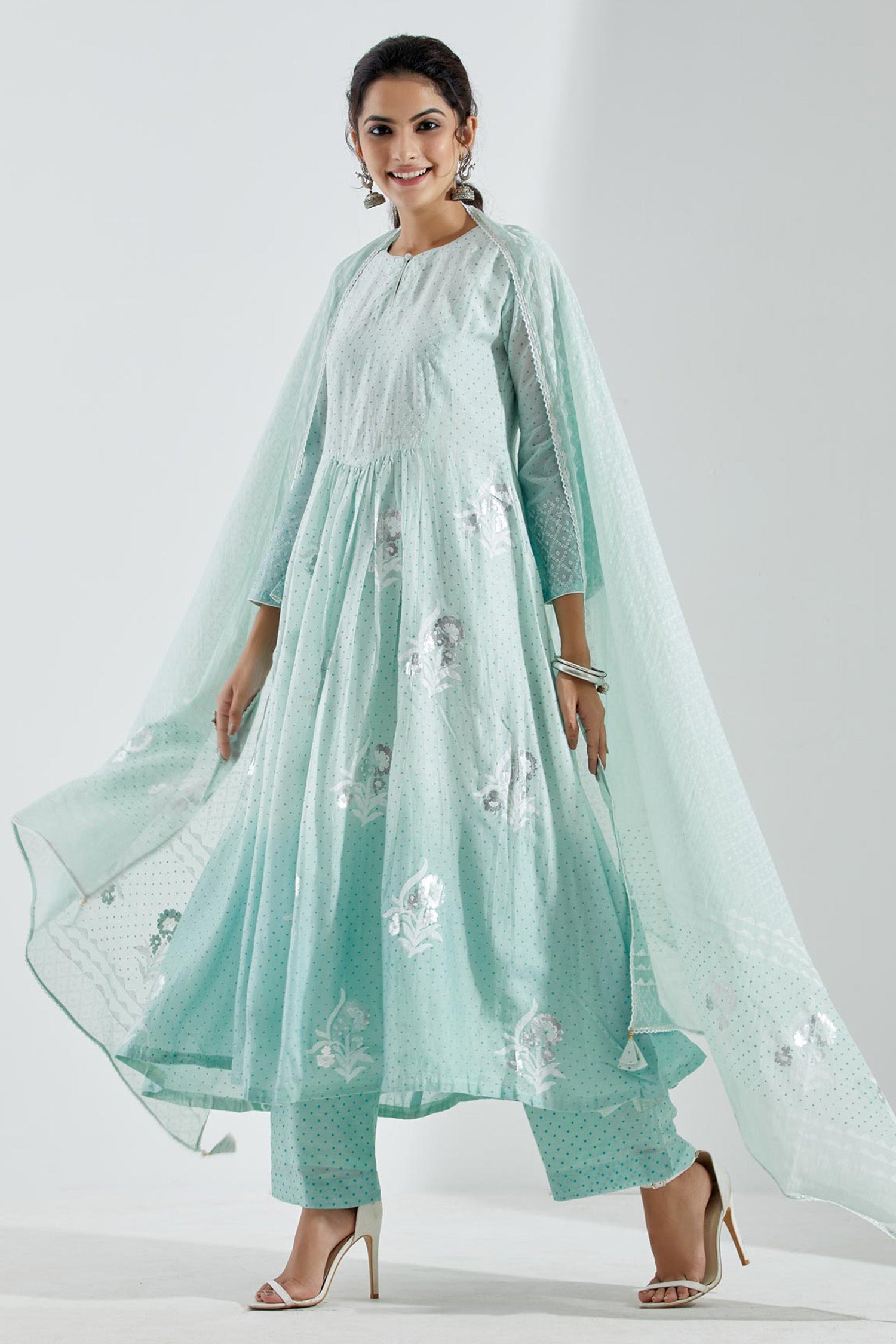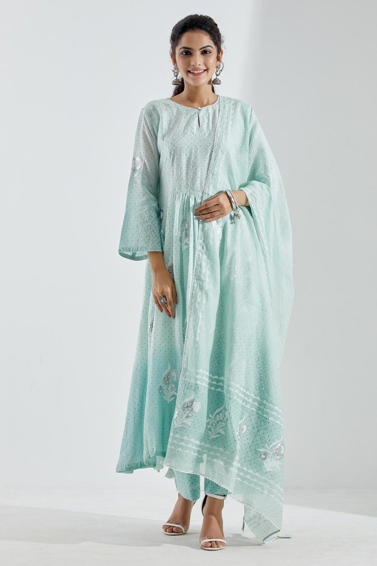 The cotton silk Kurti set with subtle foil printed floral patterns along with the matching dupatta with lace and subtle golden and silver printed design for an charismatic and stand out look.