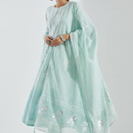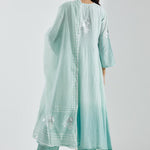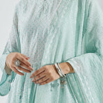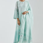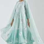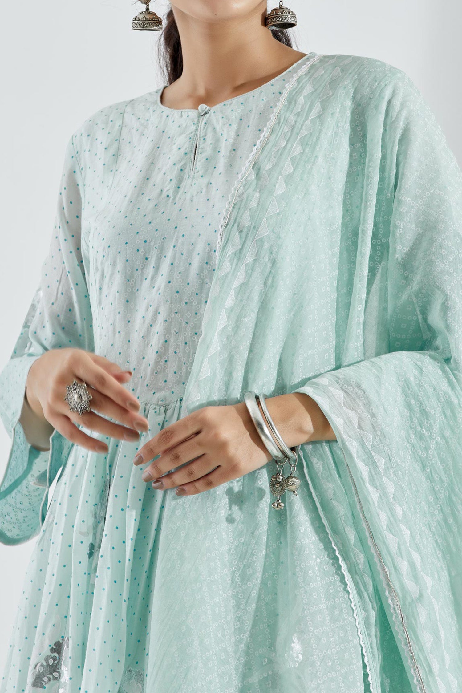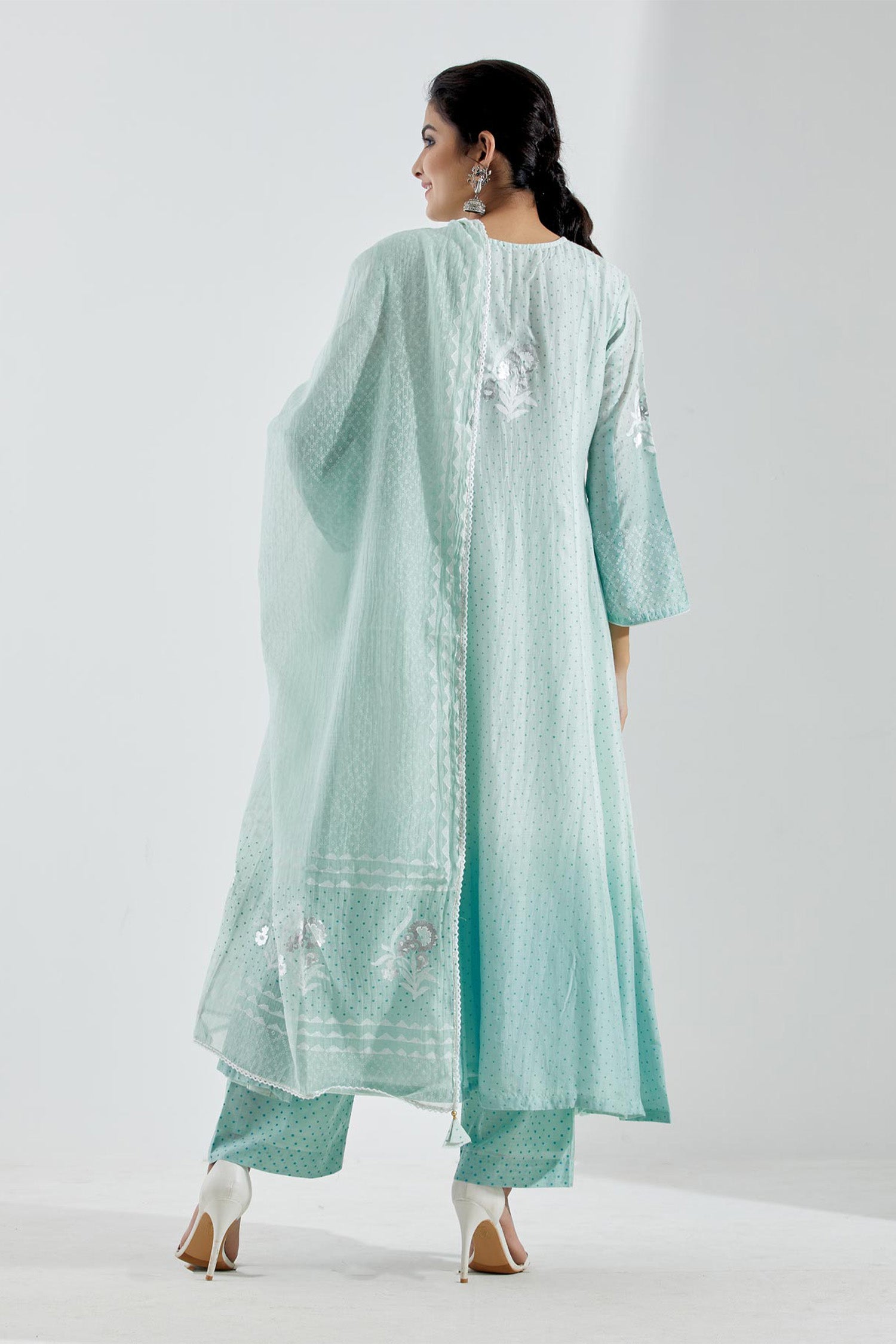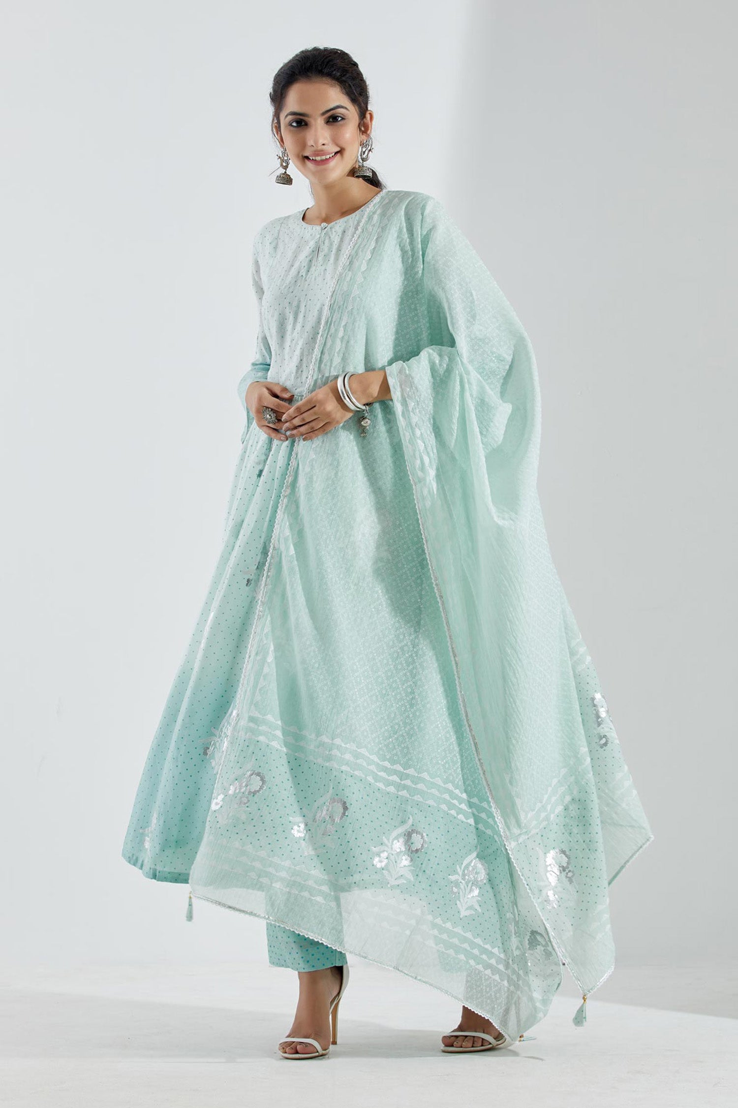 The cotton silk Kurti set with subtle foil printed floral patterns along with the matching dupatta with lace and subtle golden and silver printed design for an charismatic and stand out look.