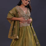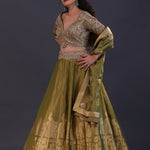 The mehendi green tissue banarasi embroidered lehenga set with dupatta and a raw silk blouse for a stunning and gracious look.