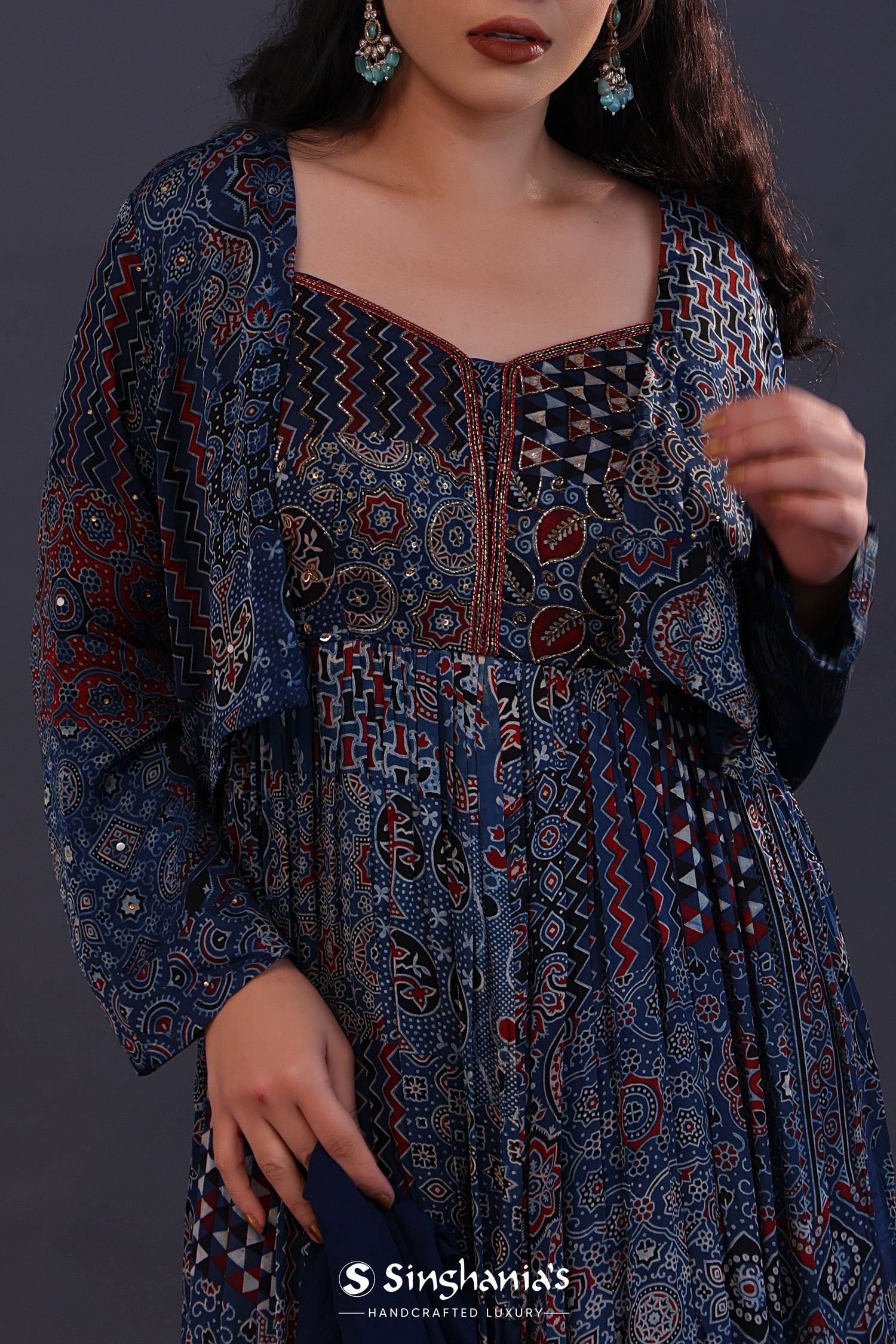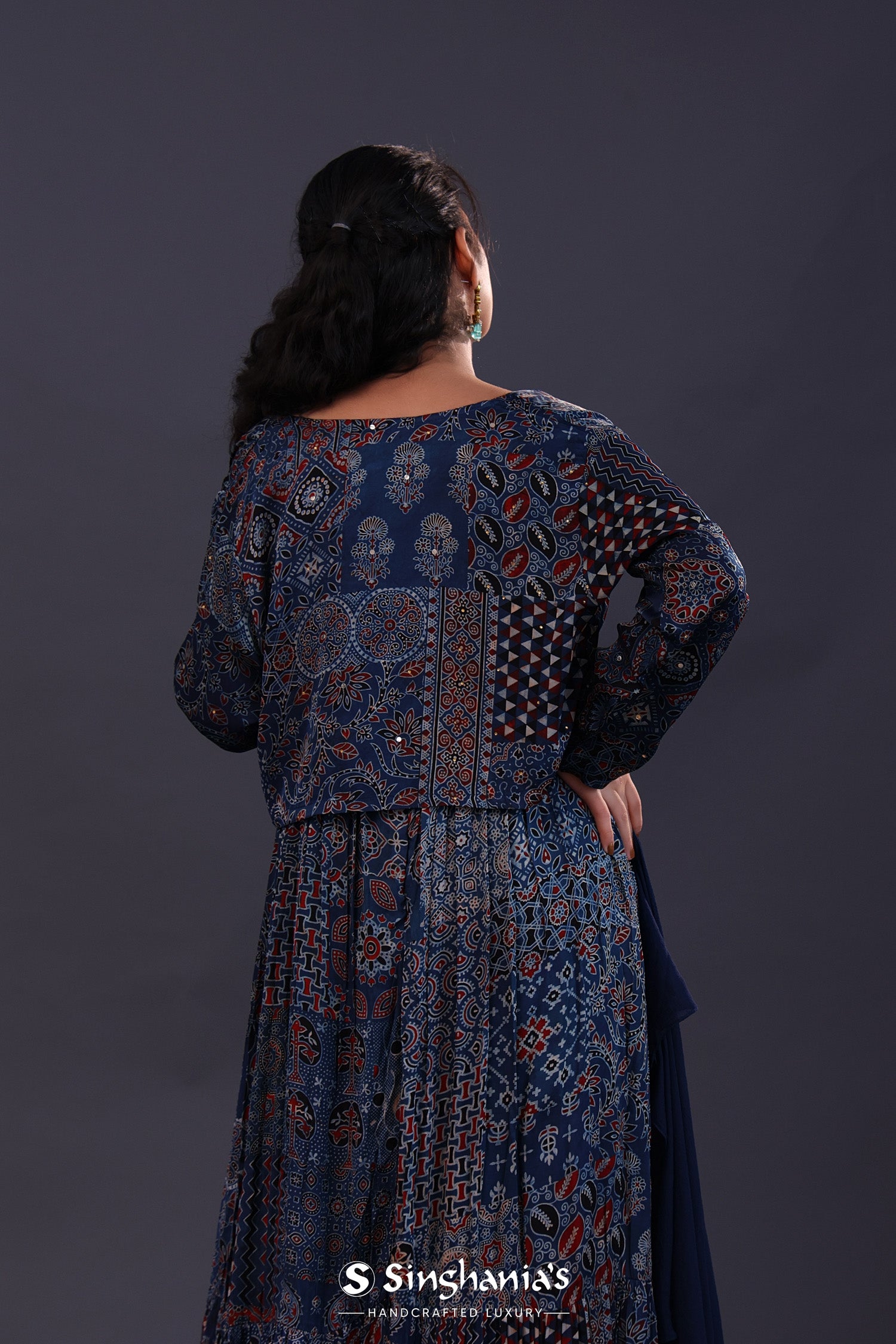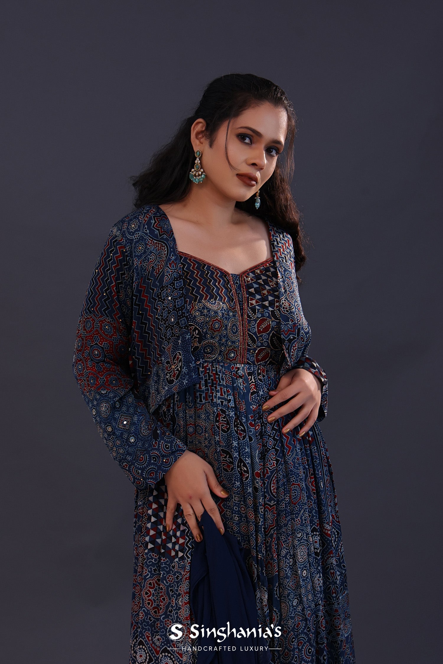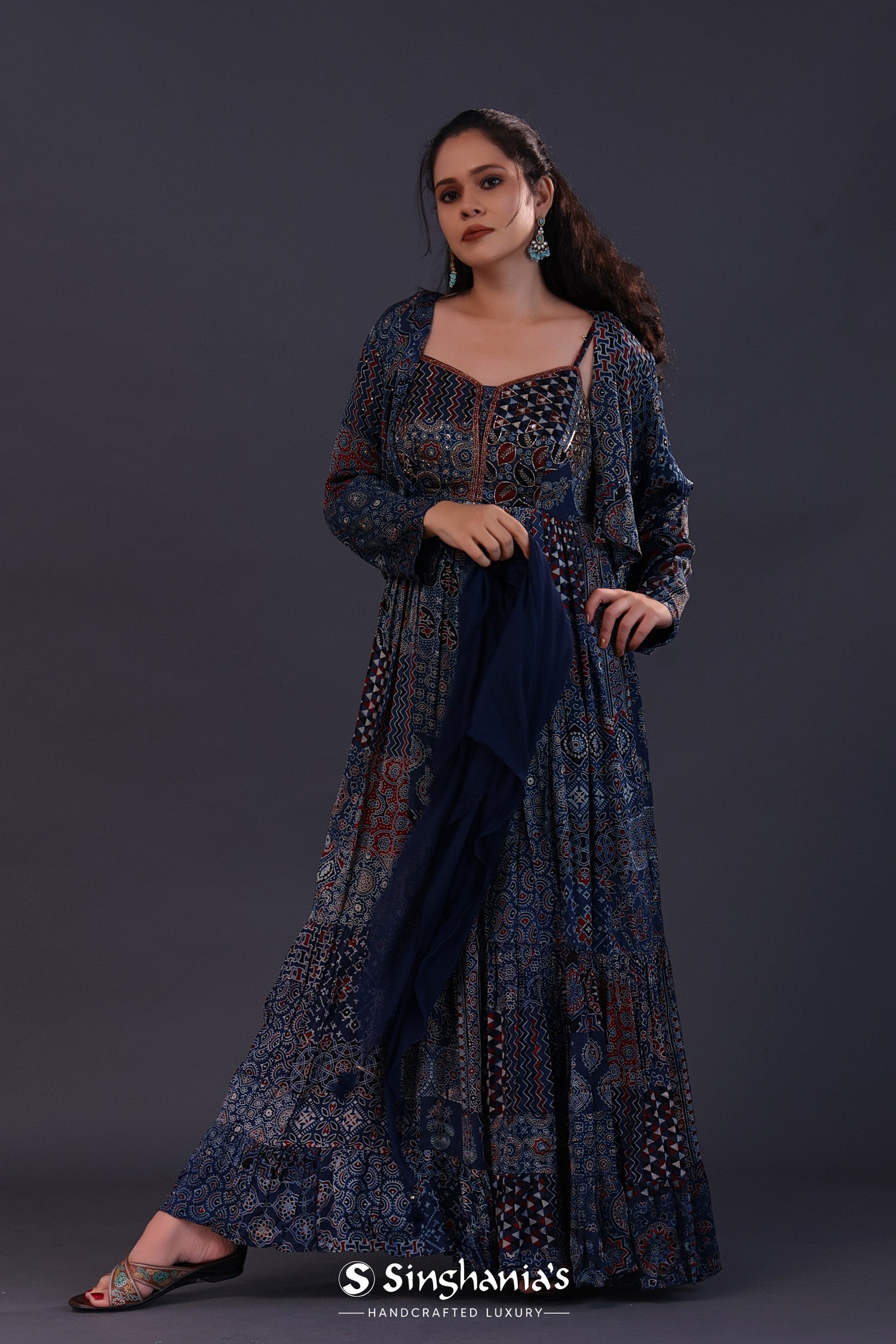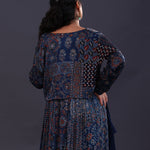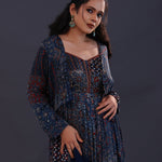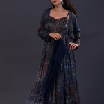 The midnight blue cotton crepe printed anarkali set with jacket and a soft tissue dupatta for a simple and charming look.