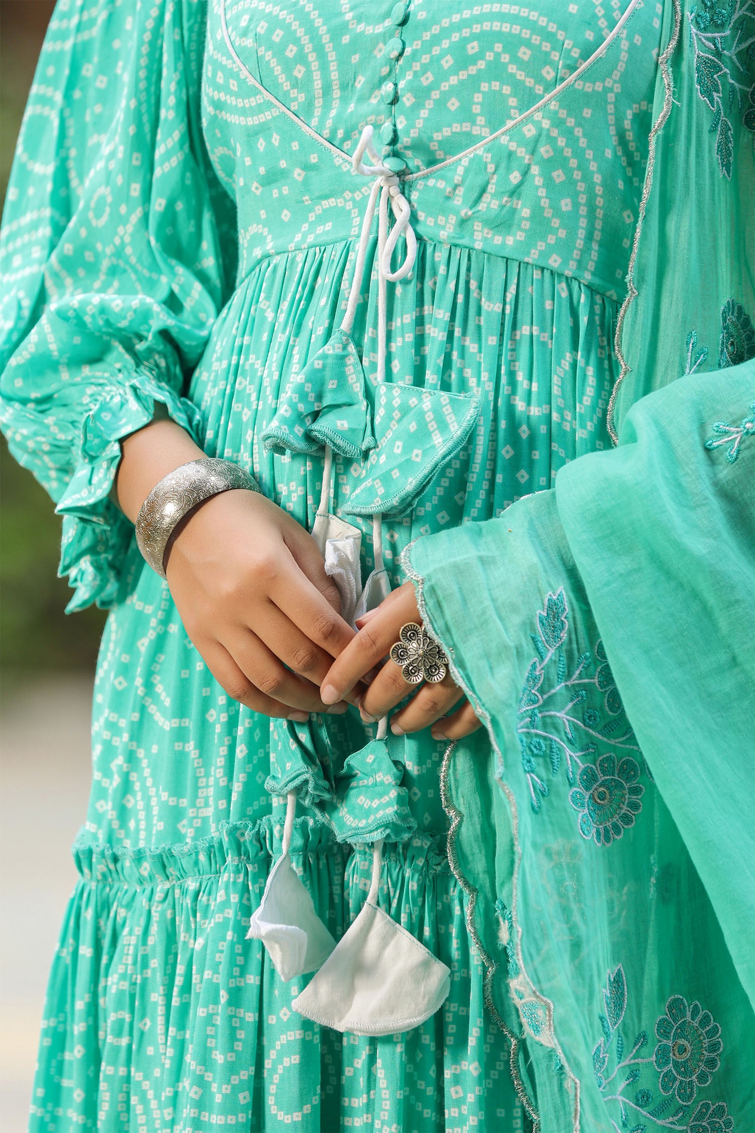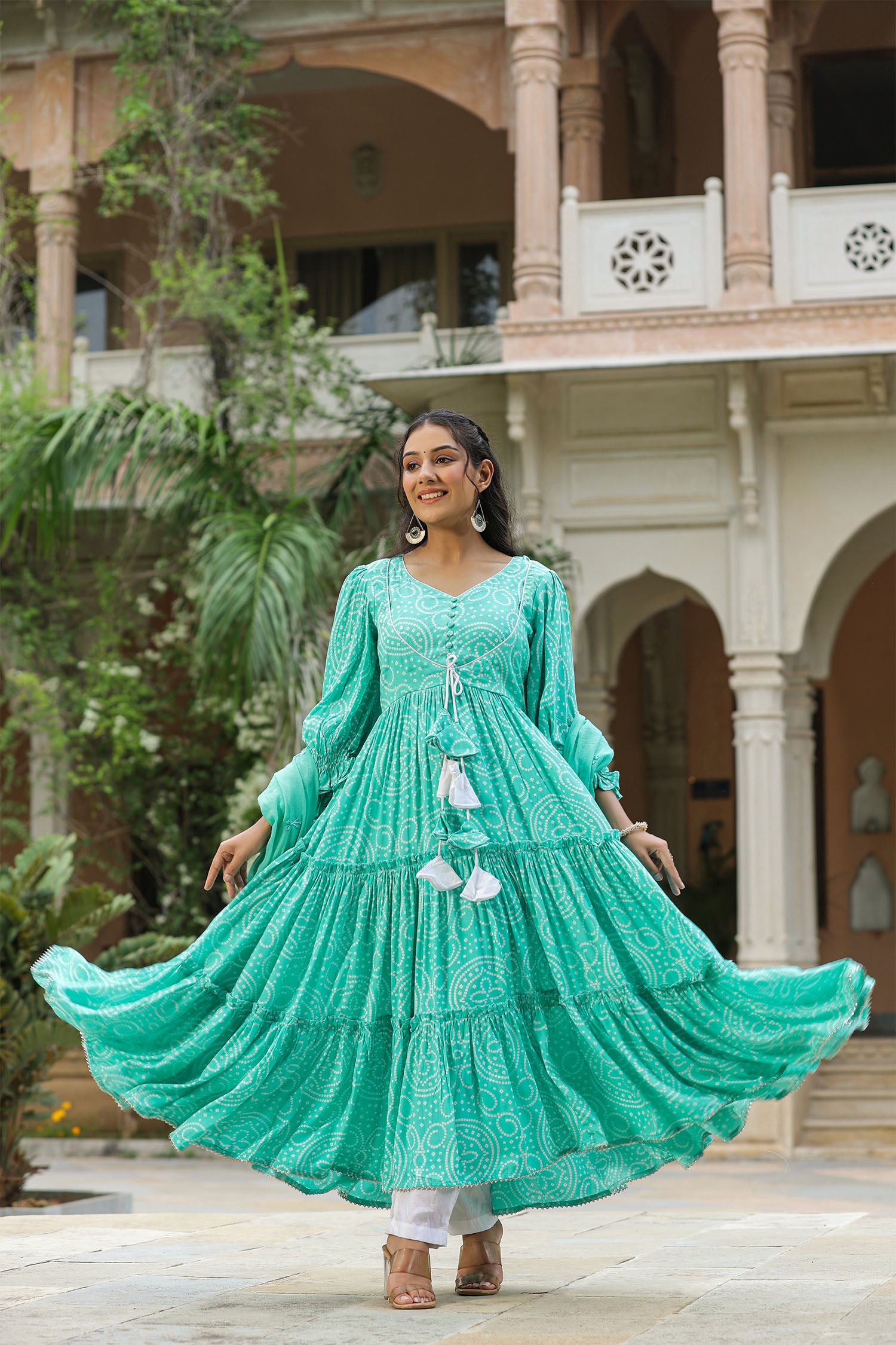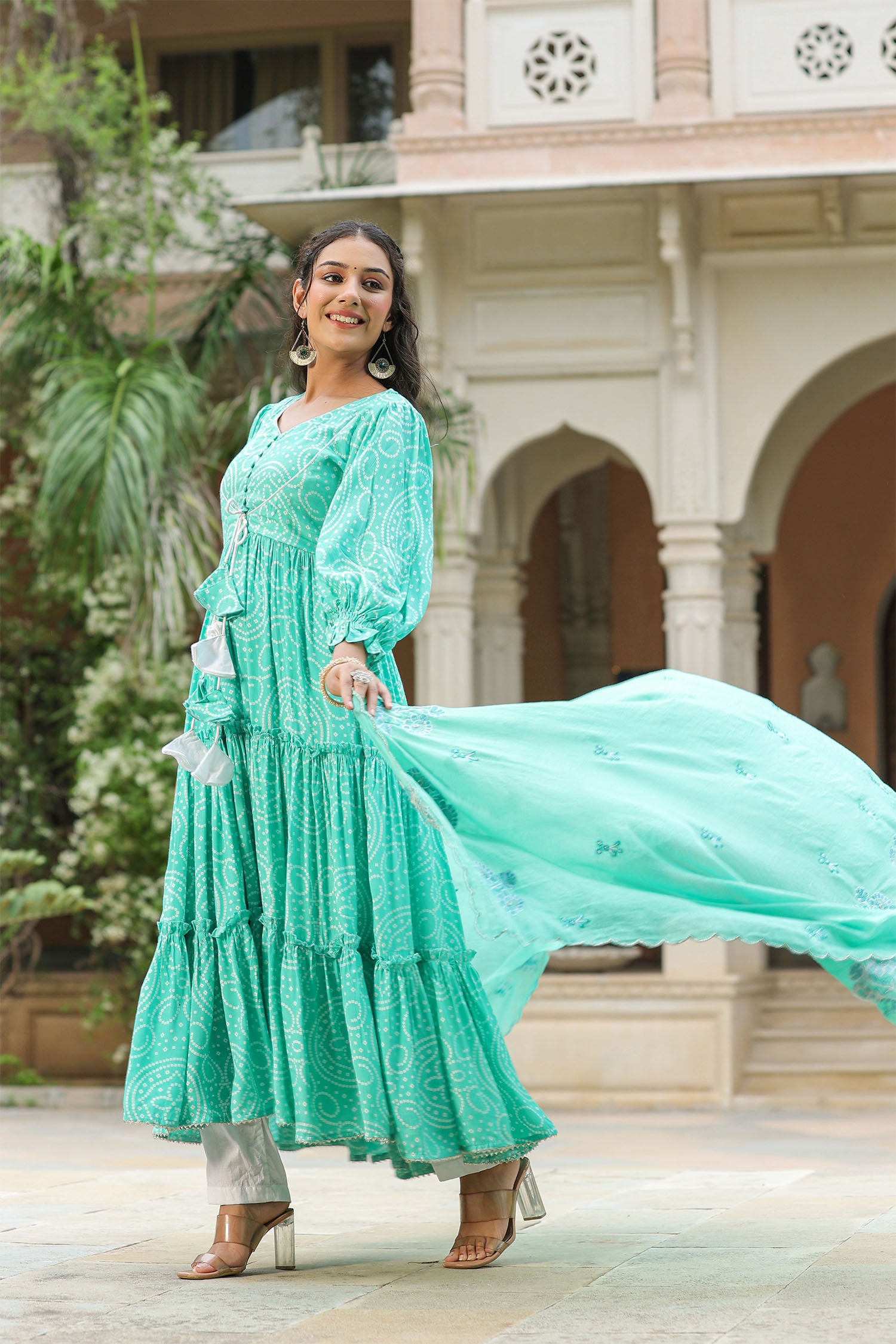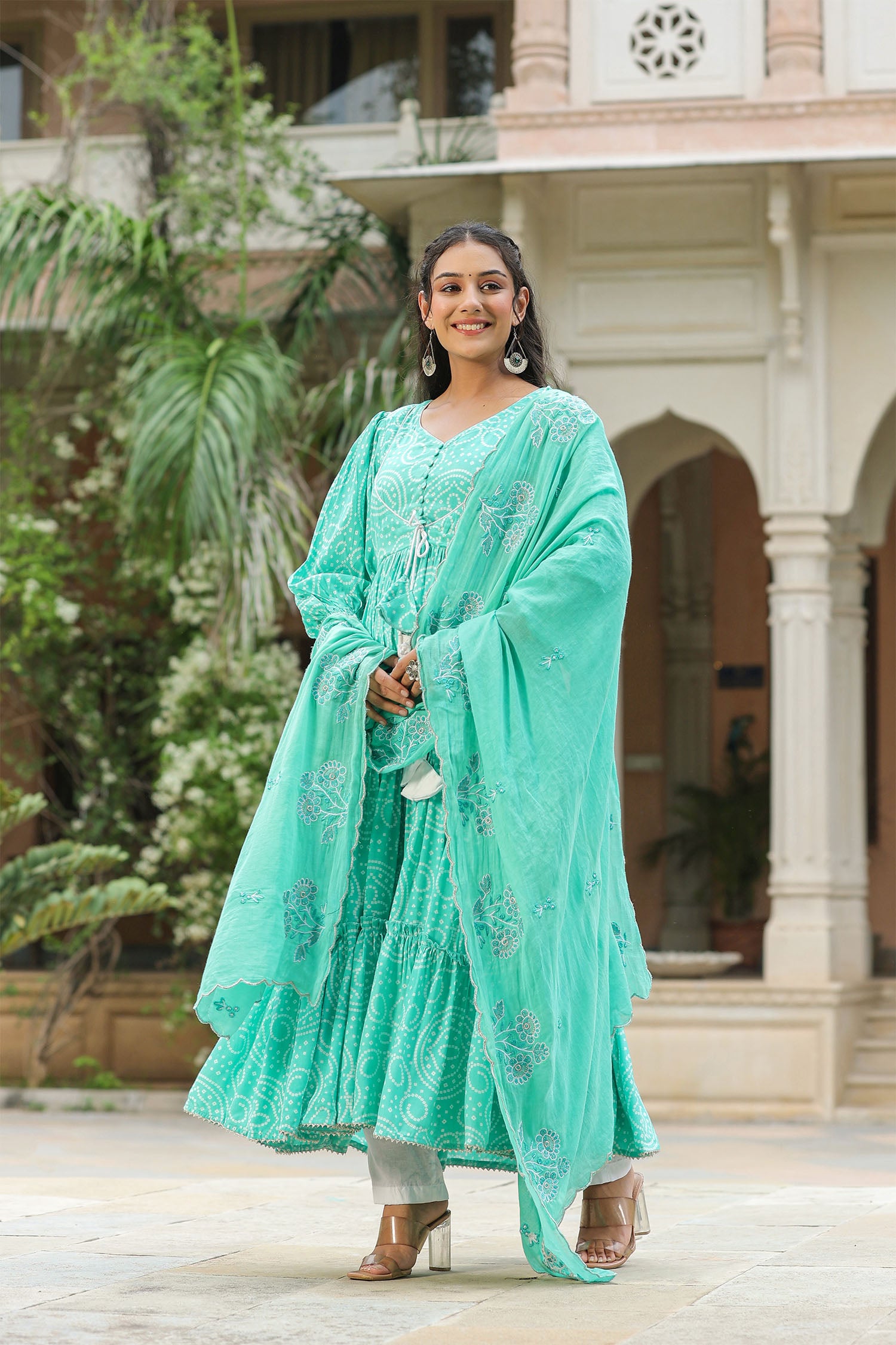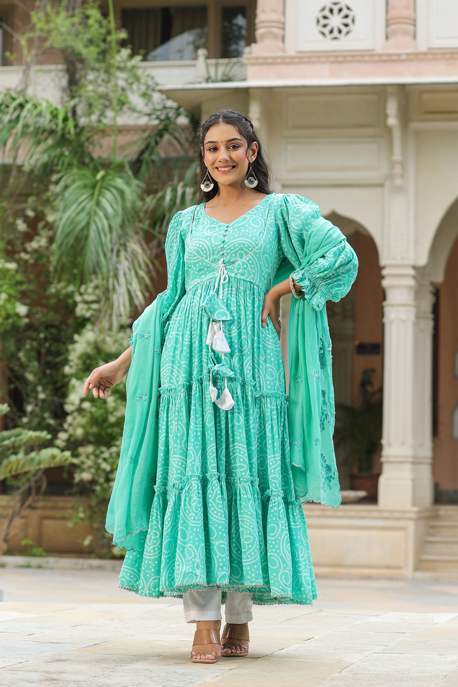 The mint blue silk bandhani printed anarkali set with matching mul cotton dupatta and white pants for a simple and classy look.