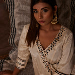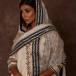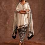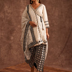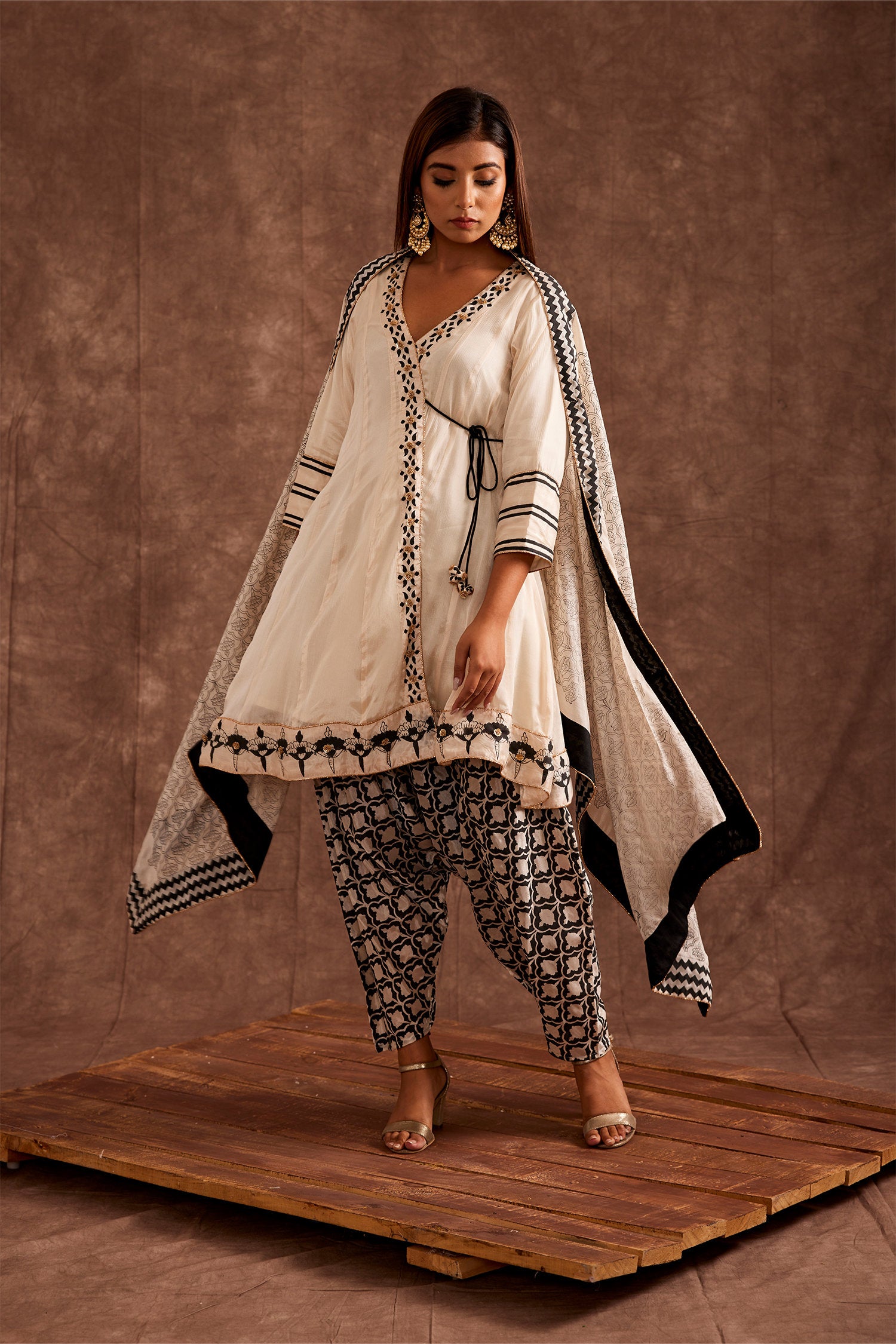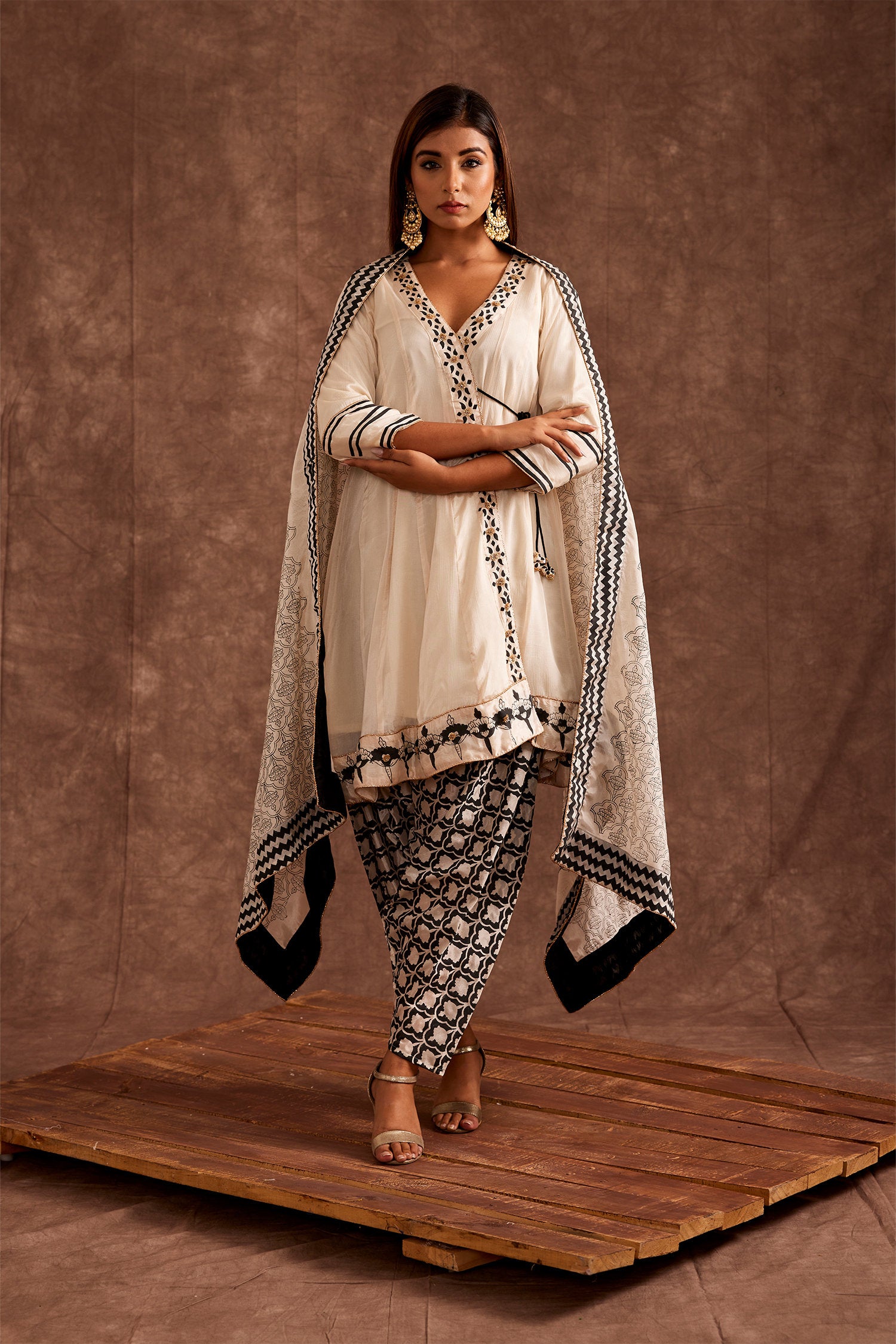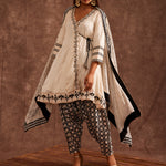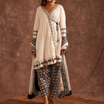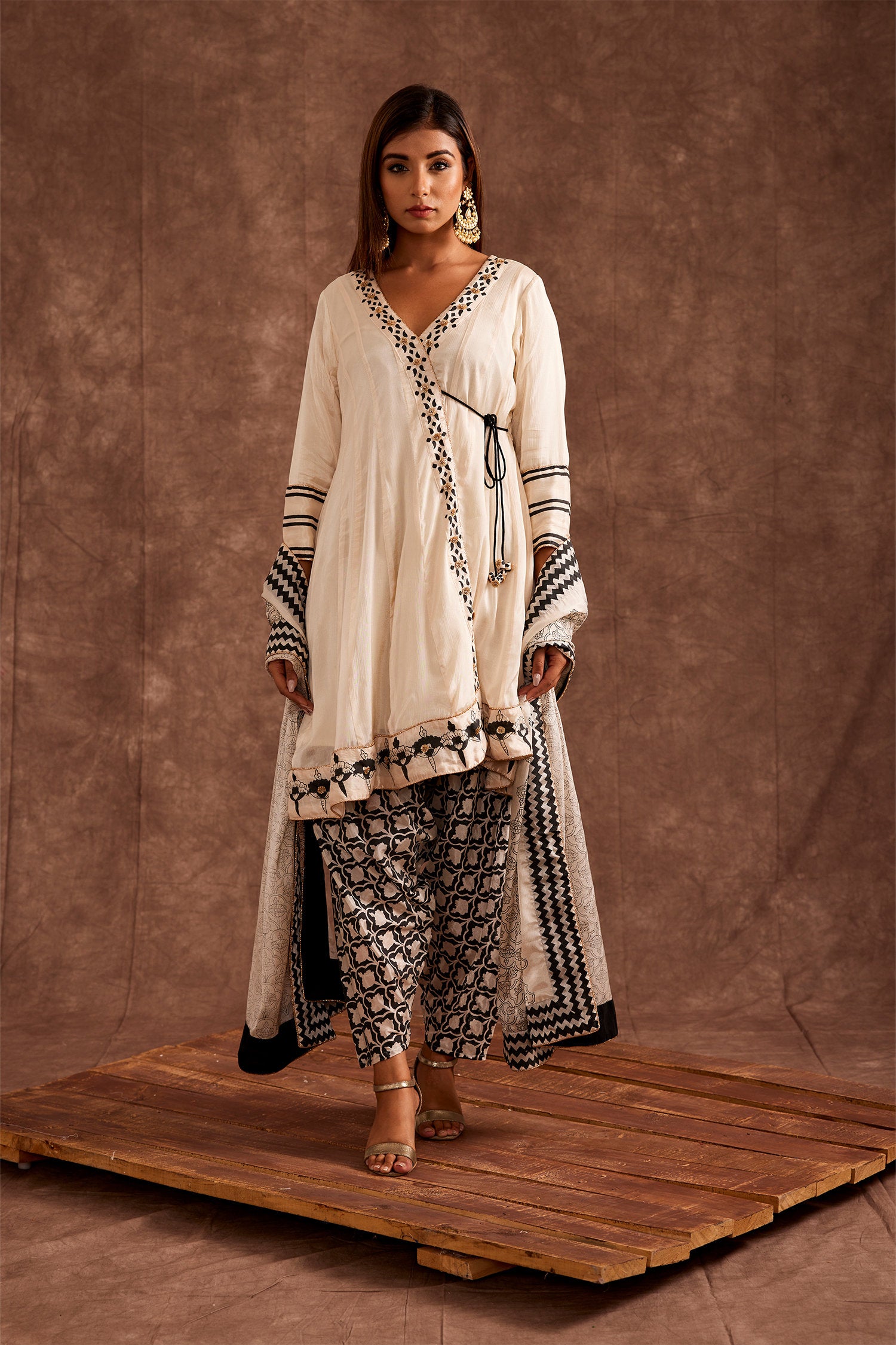 The monochrome chinon angarkha set with antique sequin work and mughal motifs for a neat and stylish look with classy appearance.