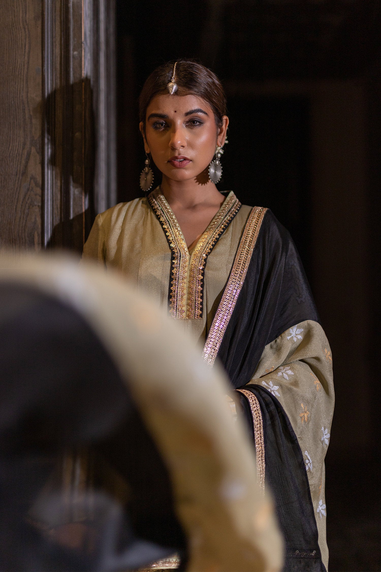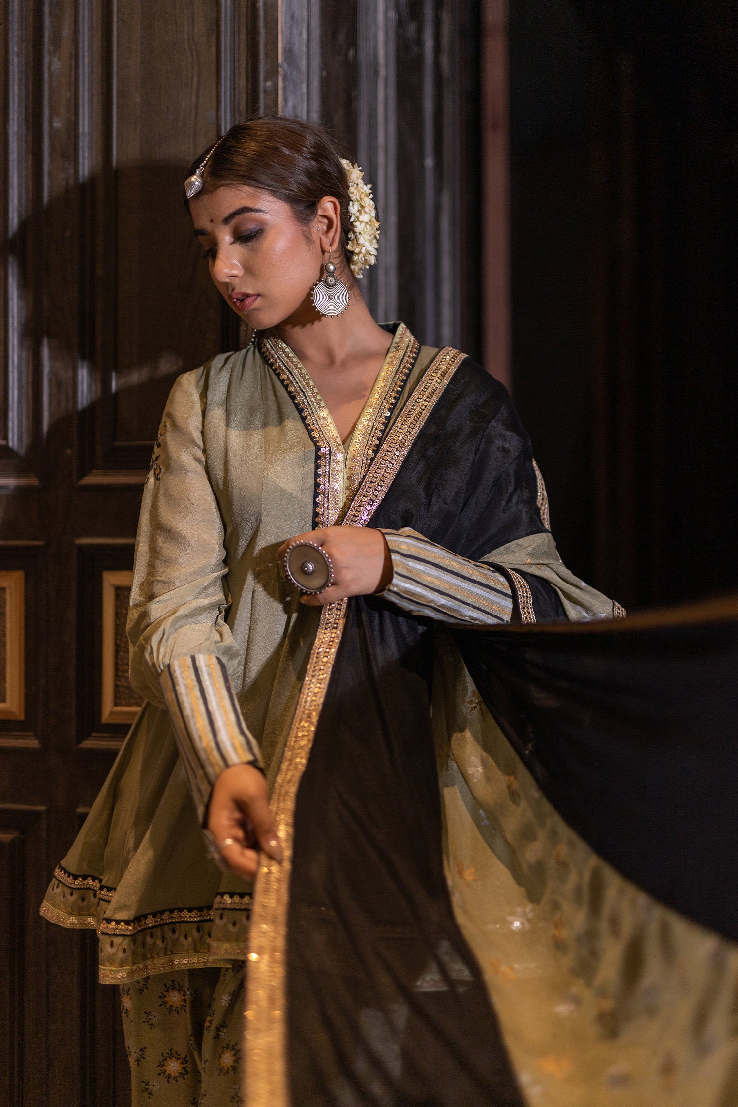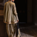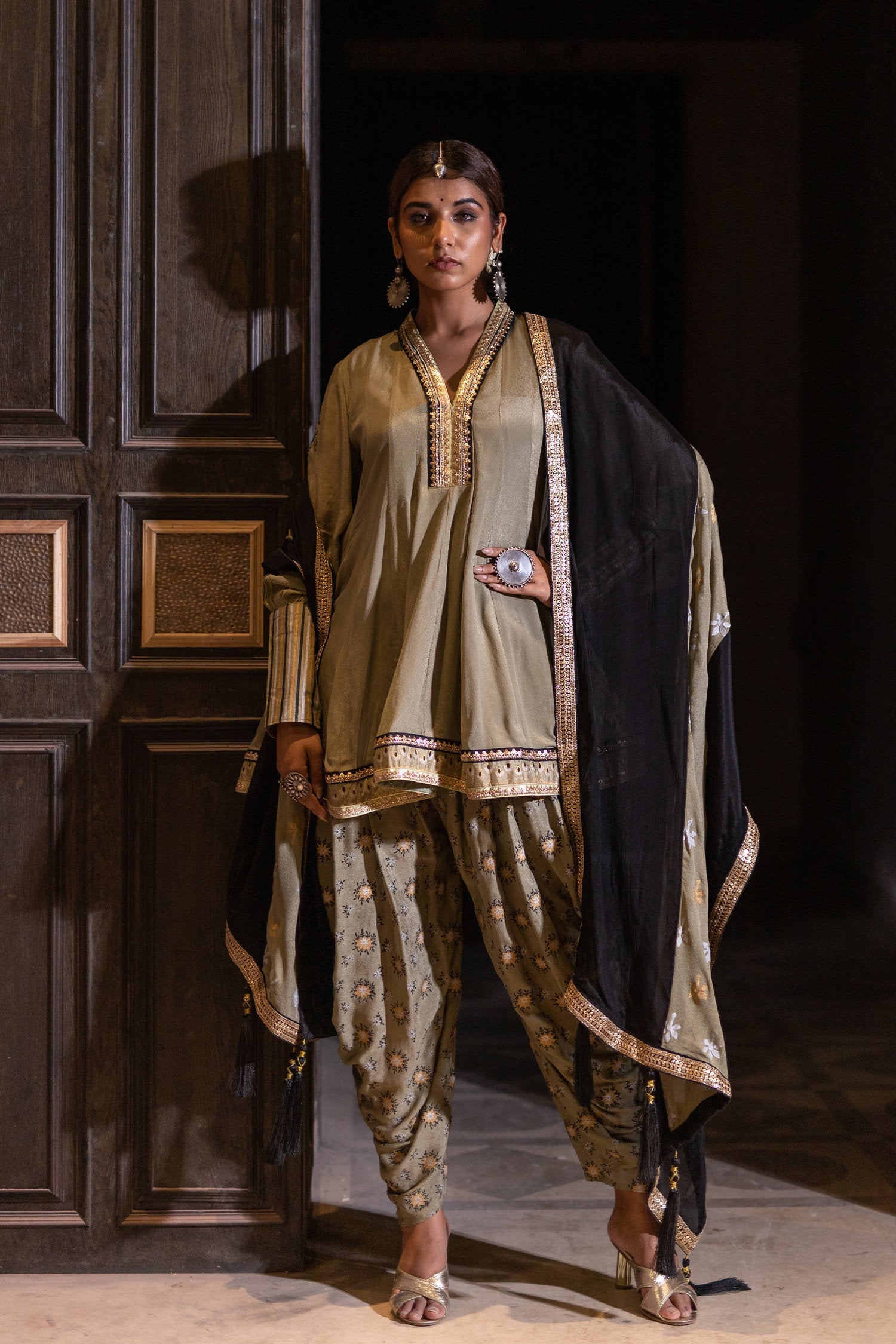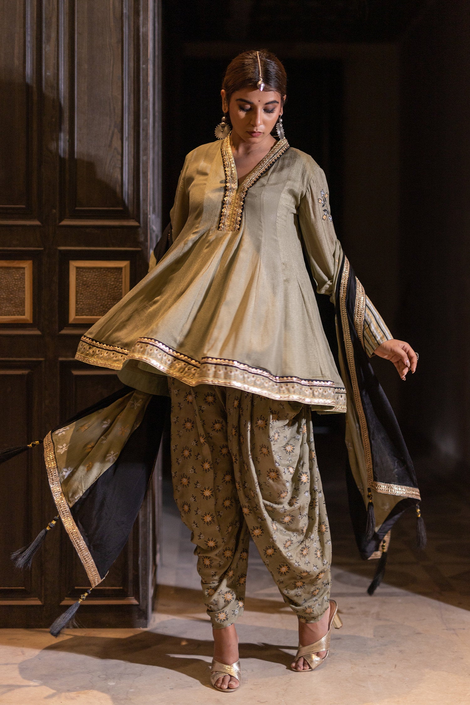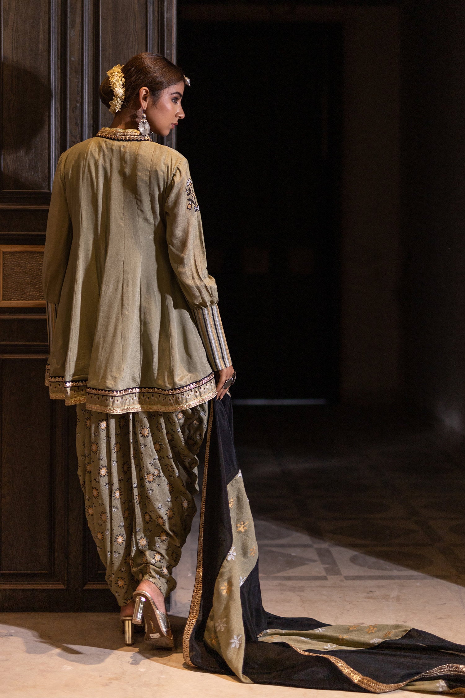 The olive chinon dhoti suit set with zari embroidery for a beautiful way of dressing with elegance and beauty with a stylish look.