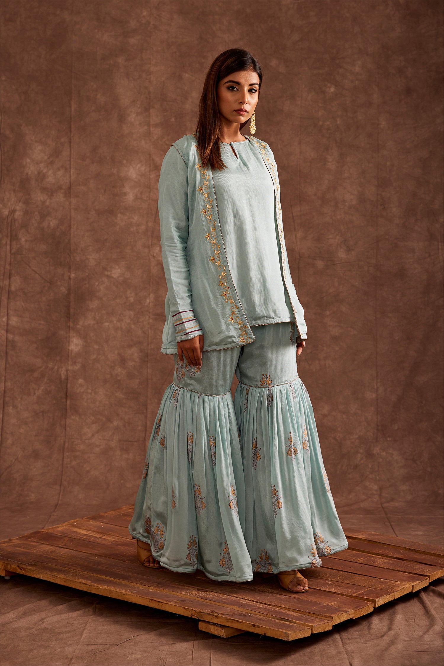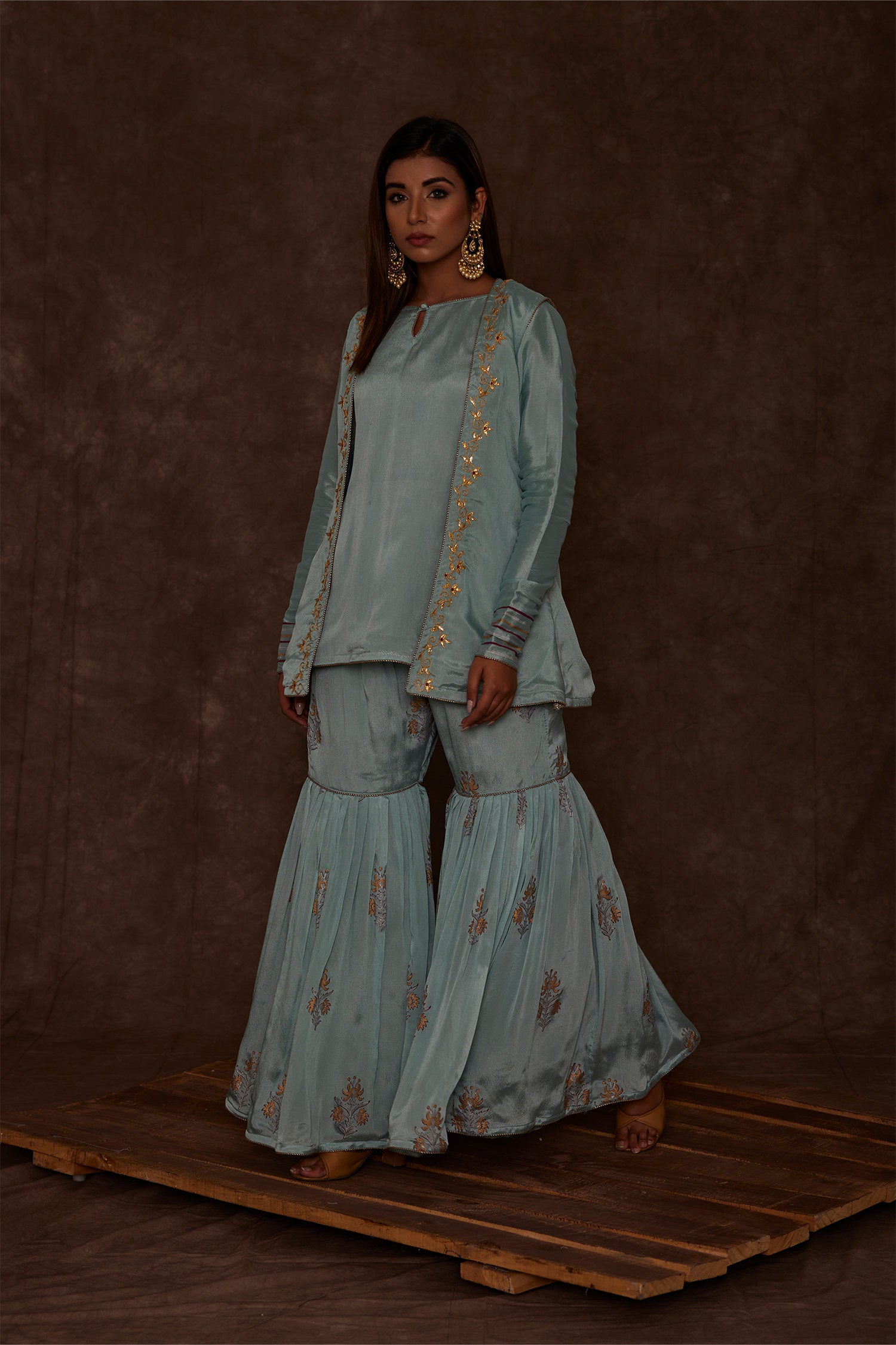 The pastel blue jacketed pure chinon gharara set highlighted with zari, dori and gota patti work for a neat and stylish look with classy appearance.