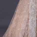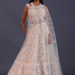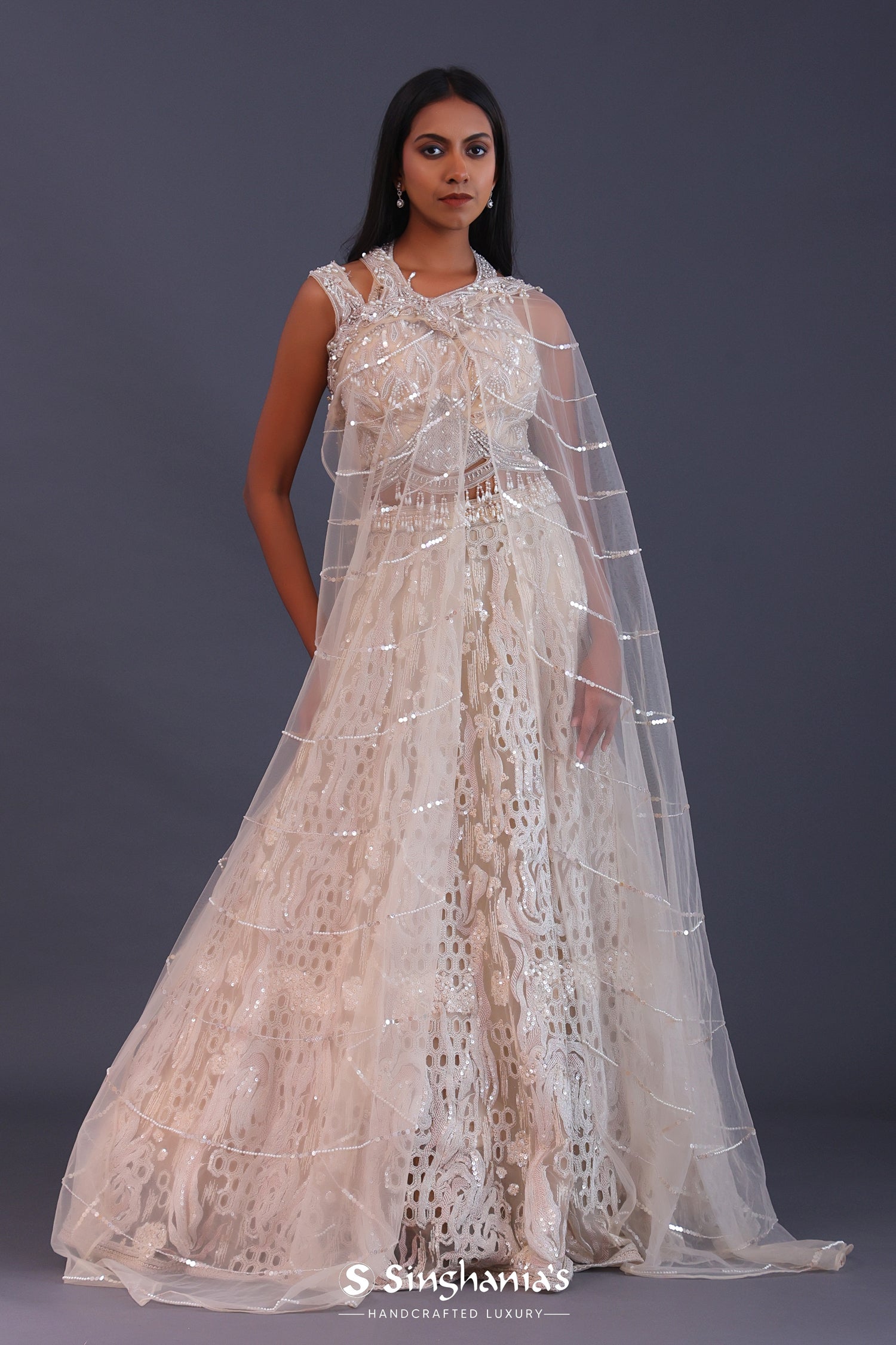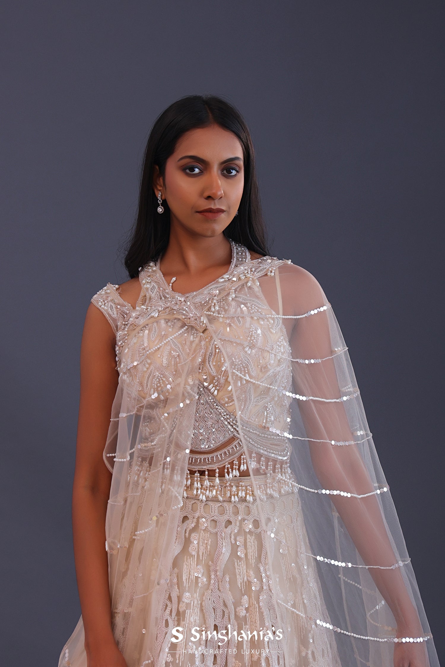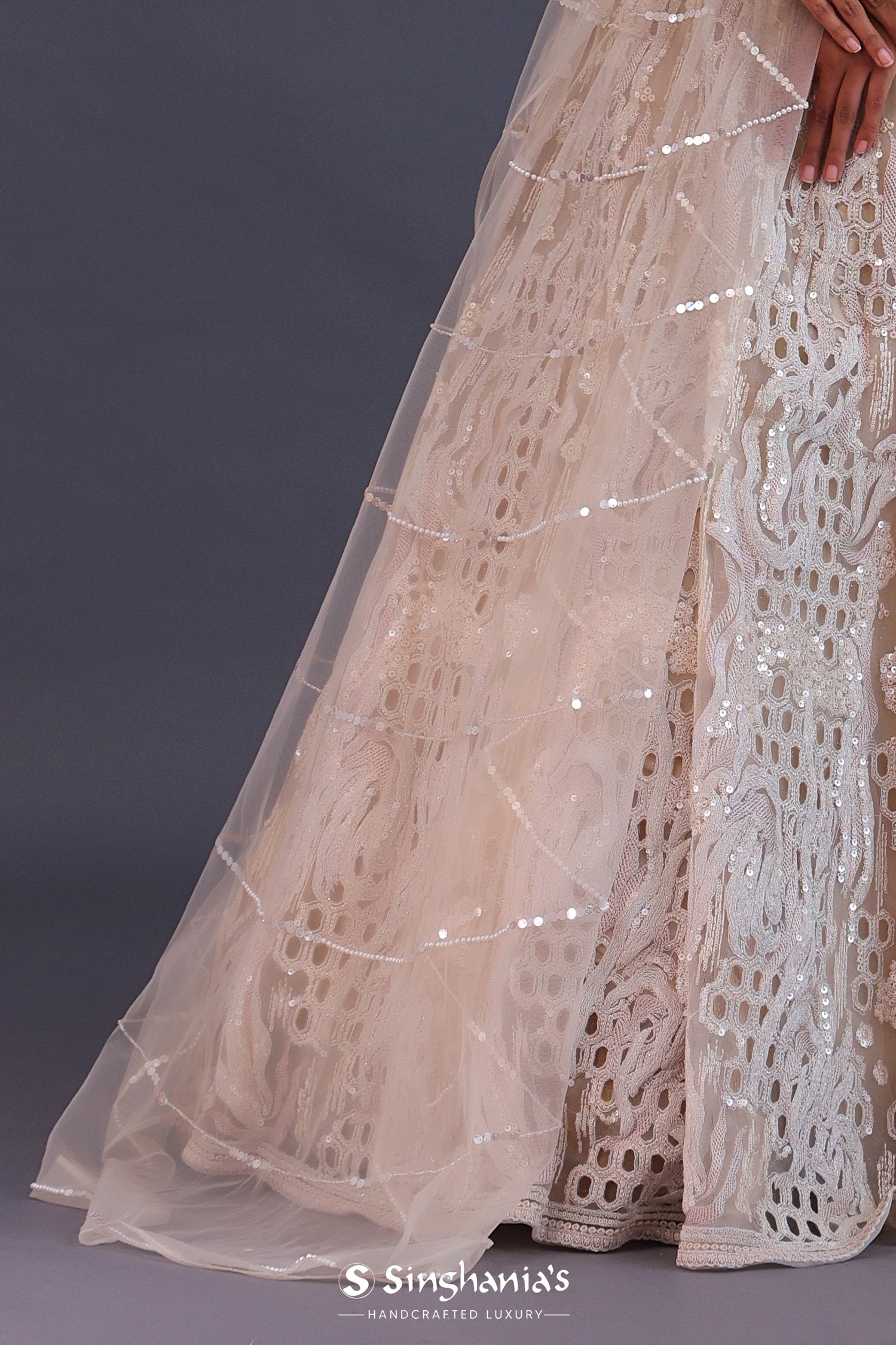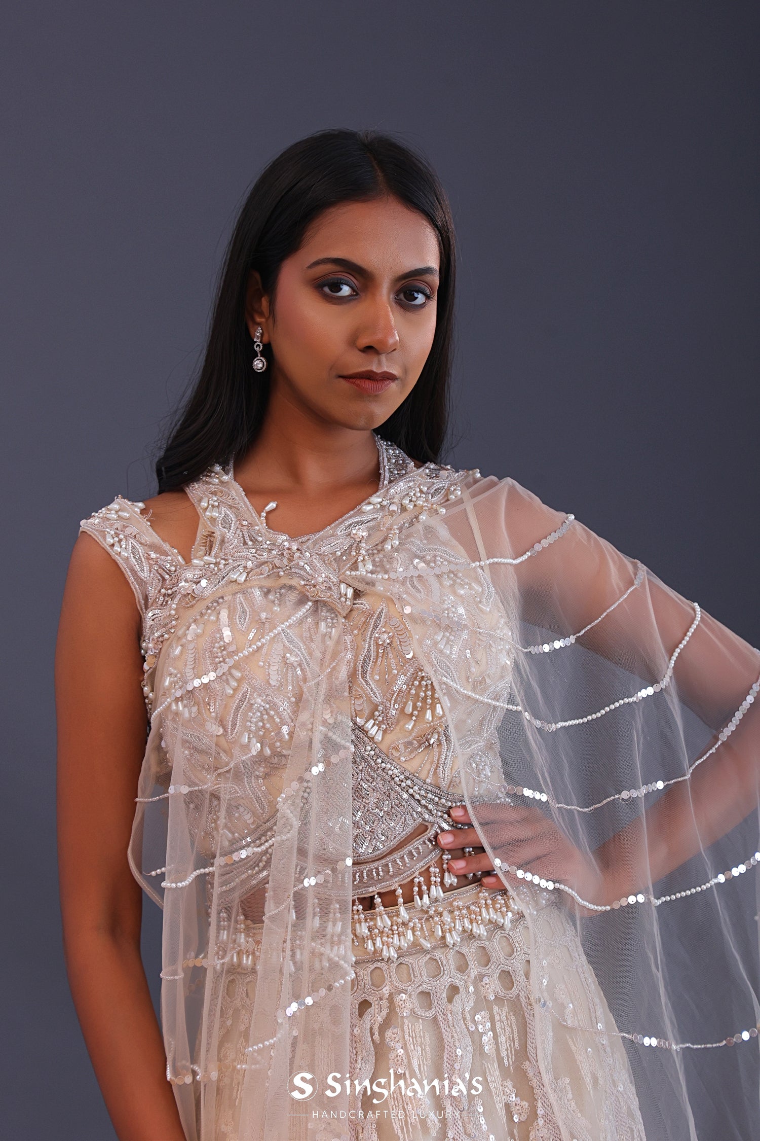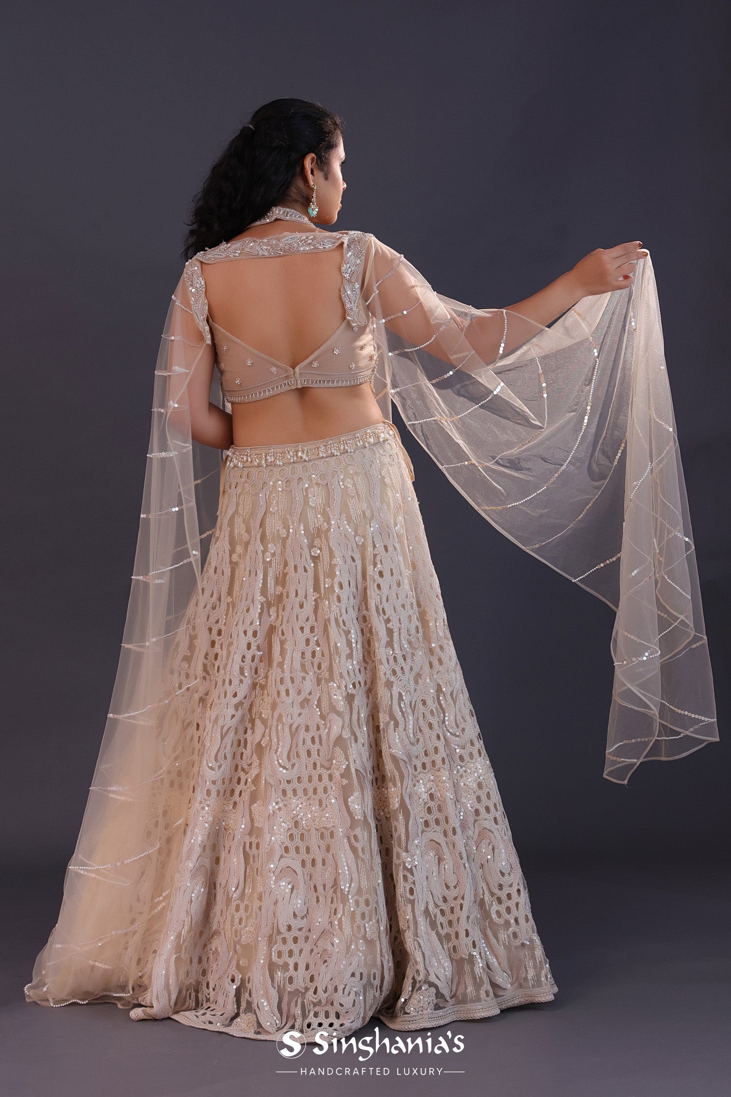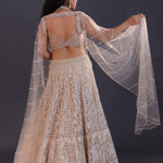 The pastel cream net embroidered lehenga set with a stunning dupatta for a rich beautiful look in elegance.