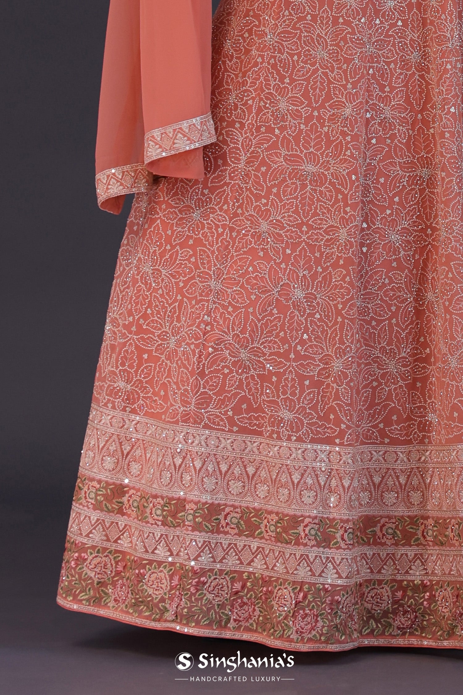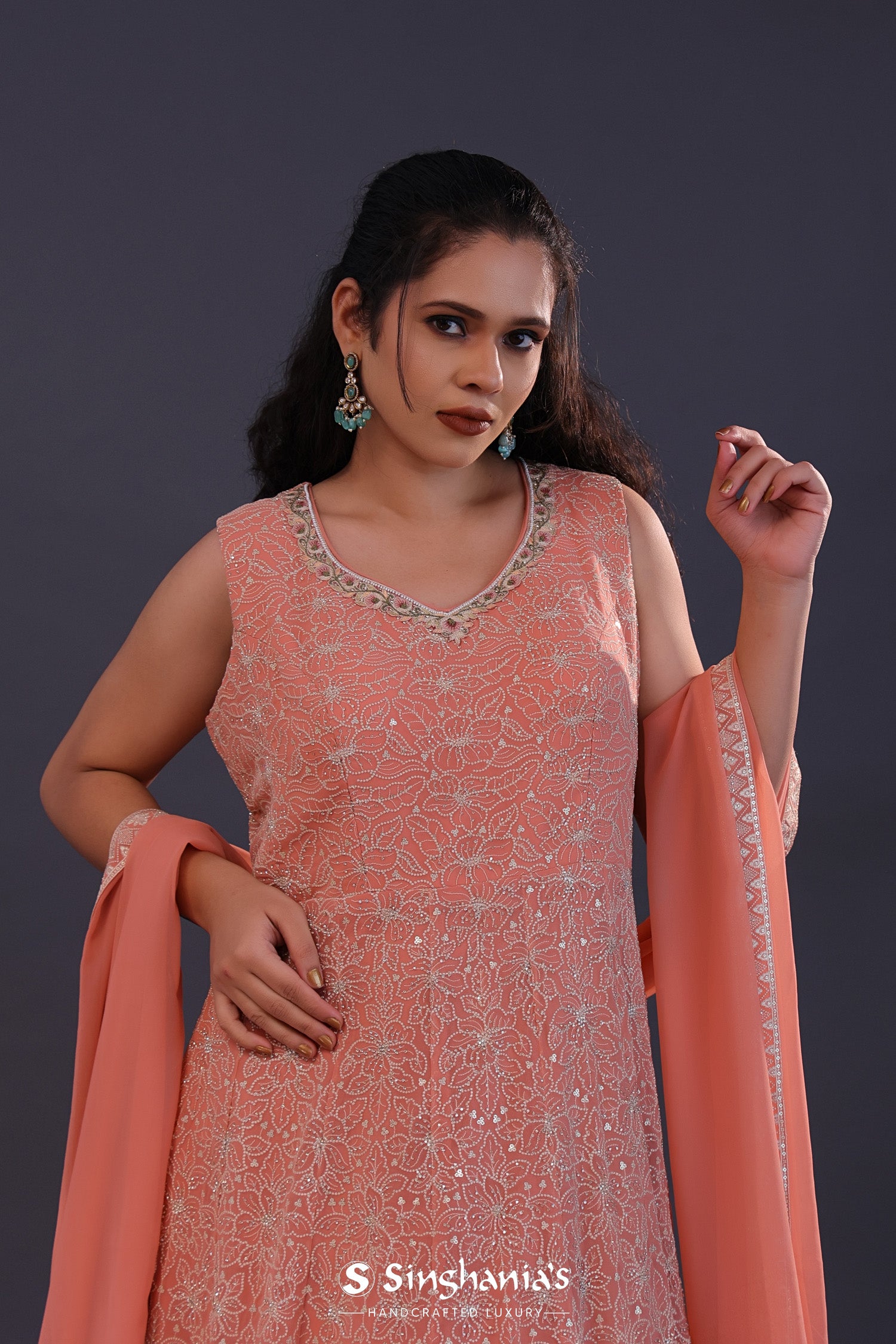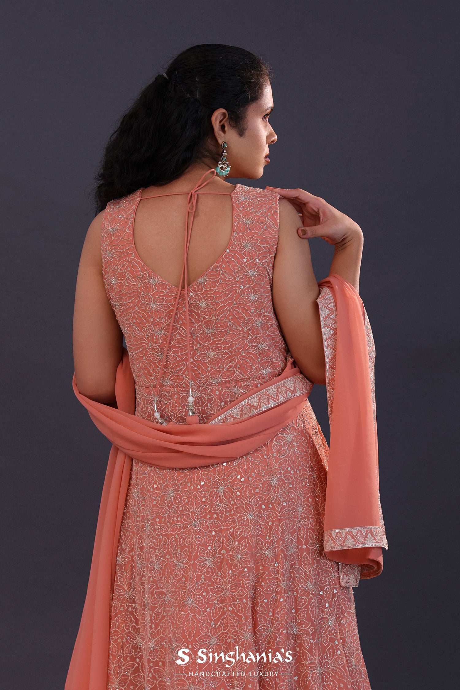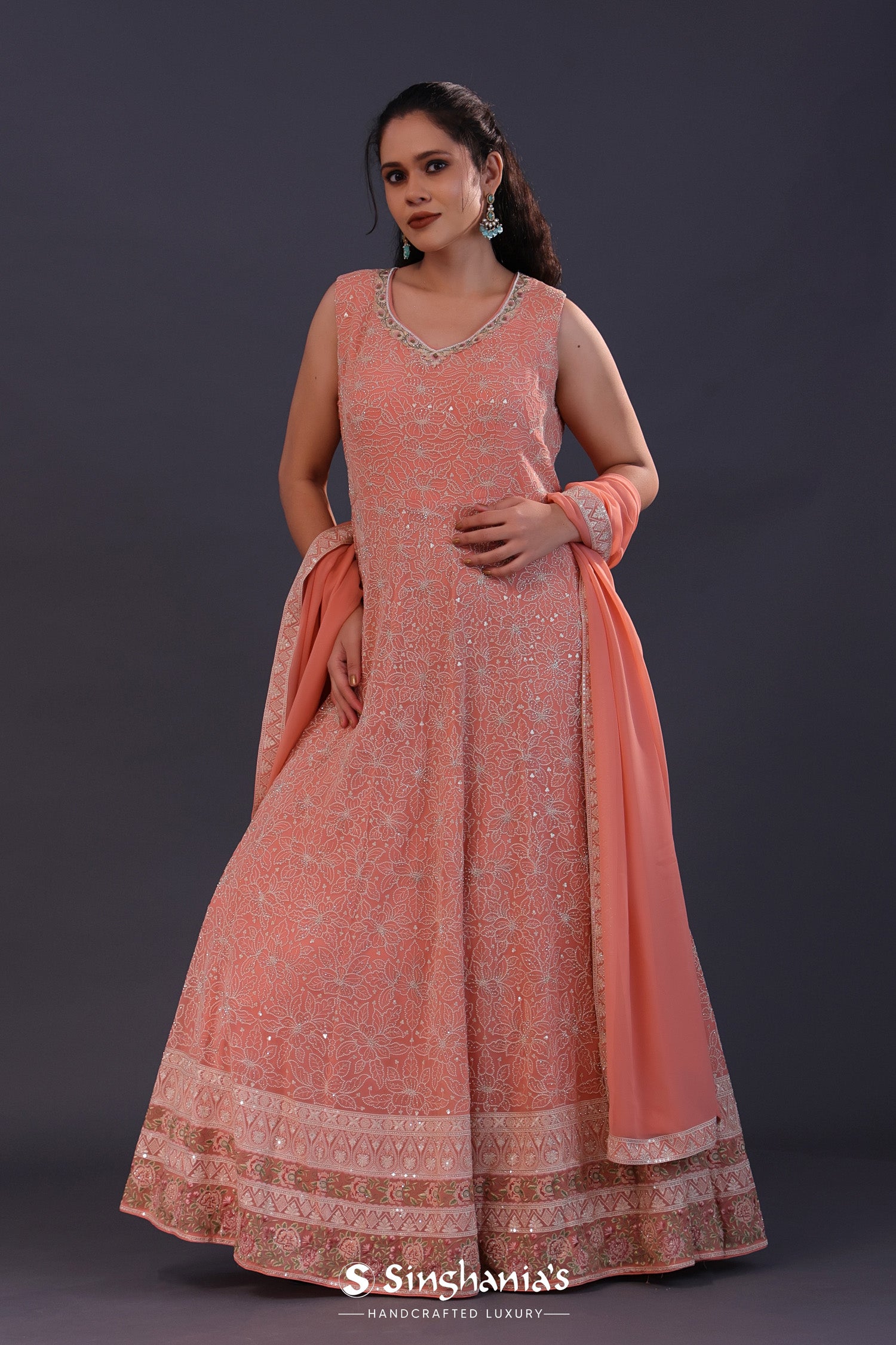 The peach pink chiffon georgette thread embroidered anarkali set with georgette dupatta for an elegant and stunning look.
