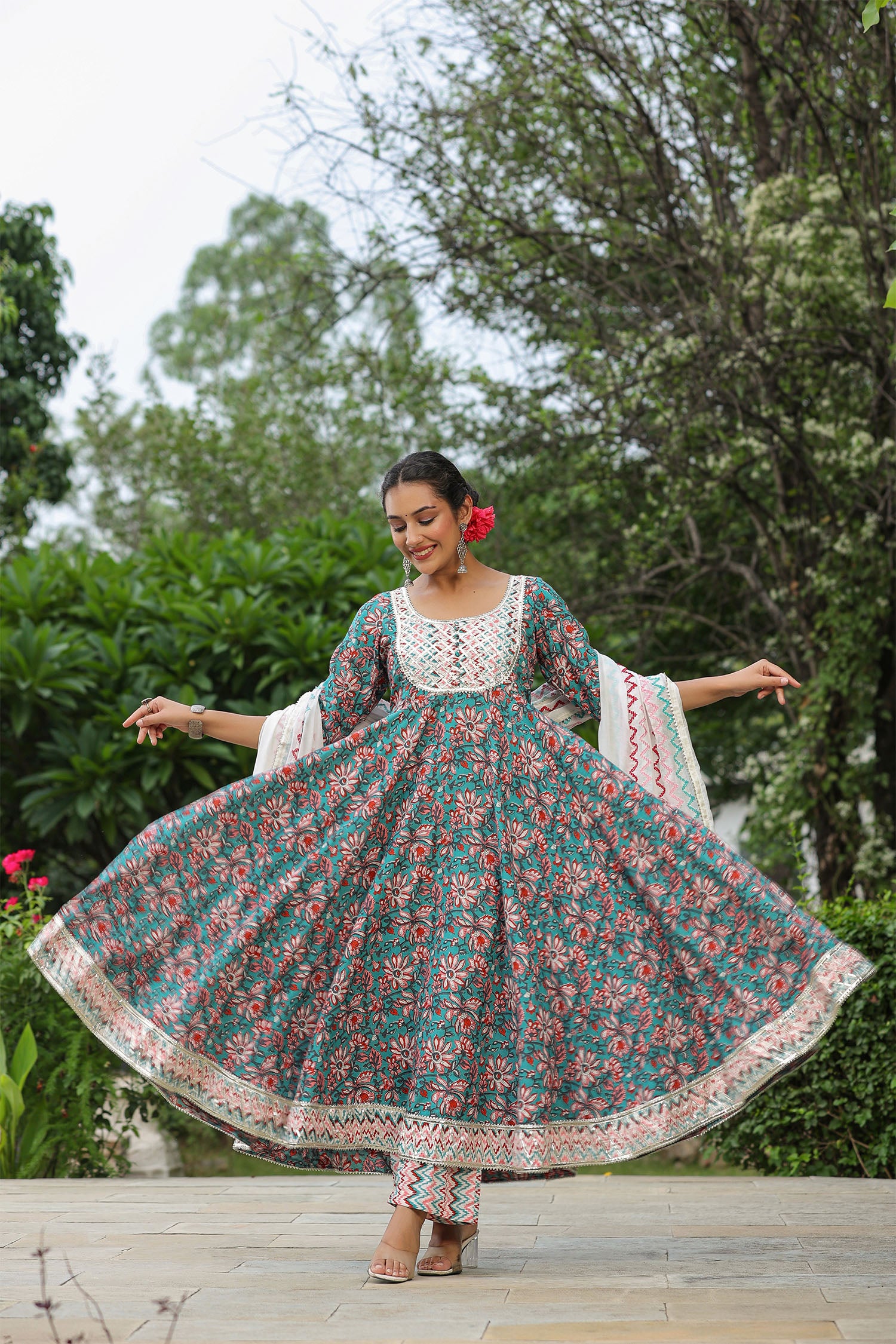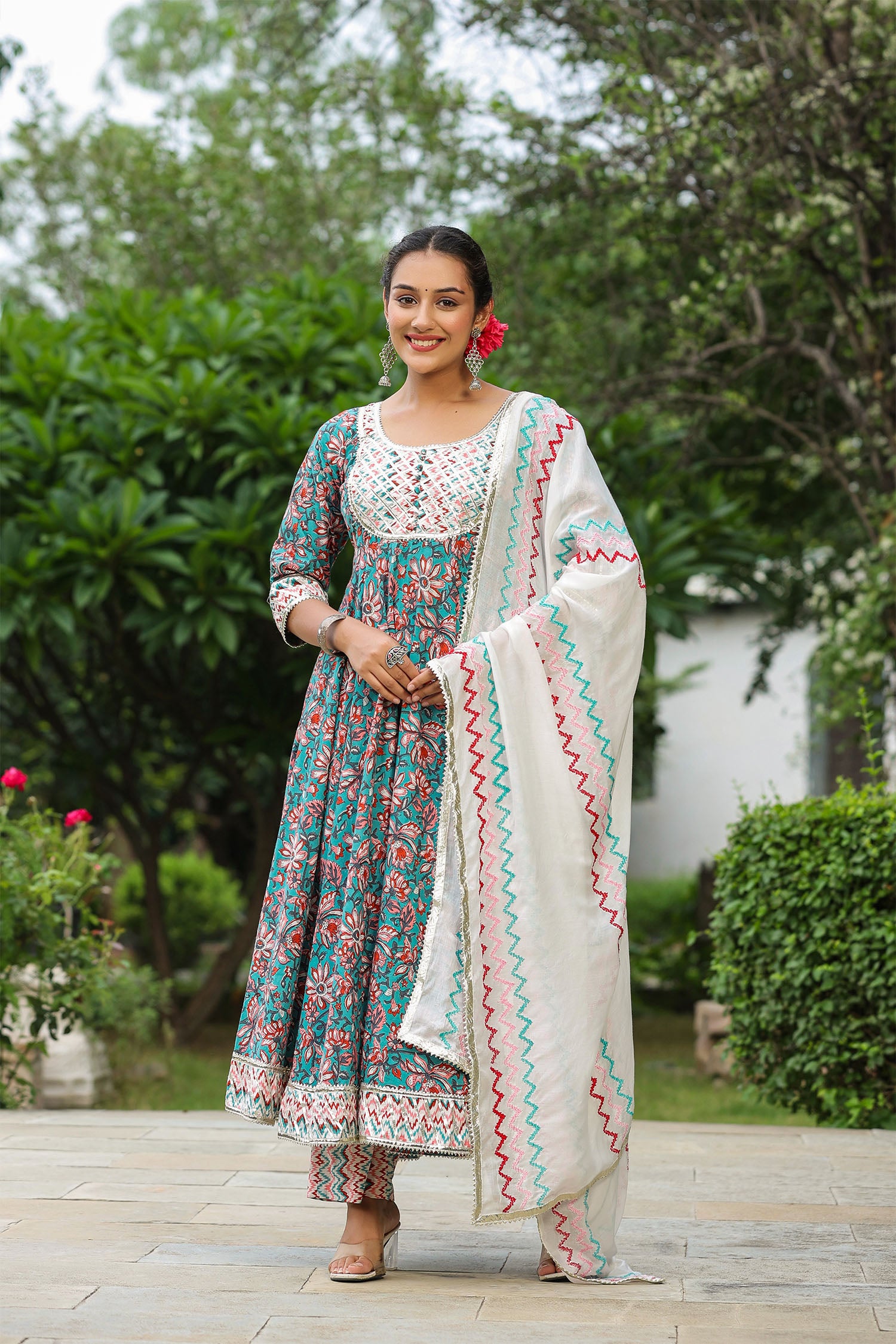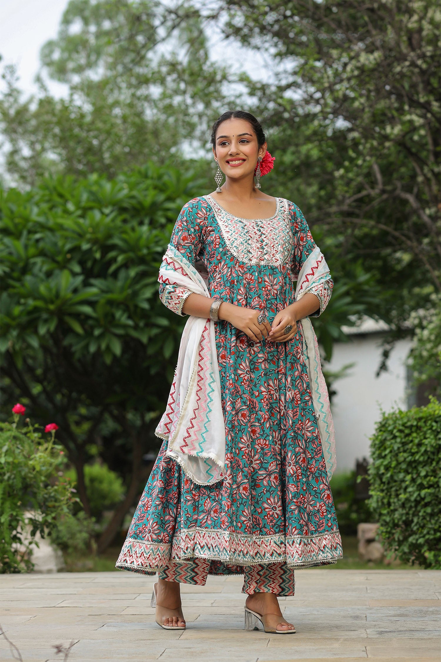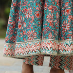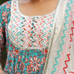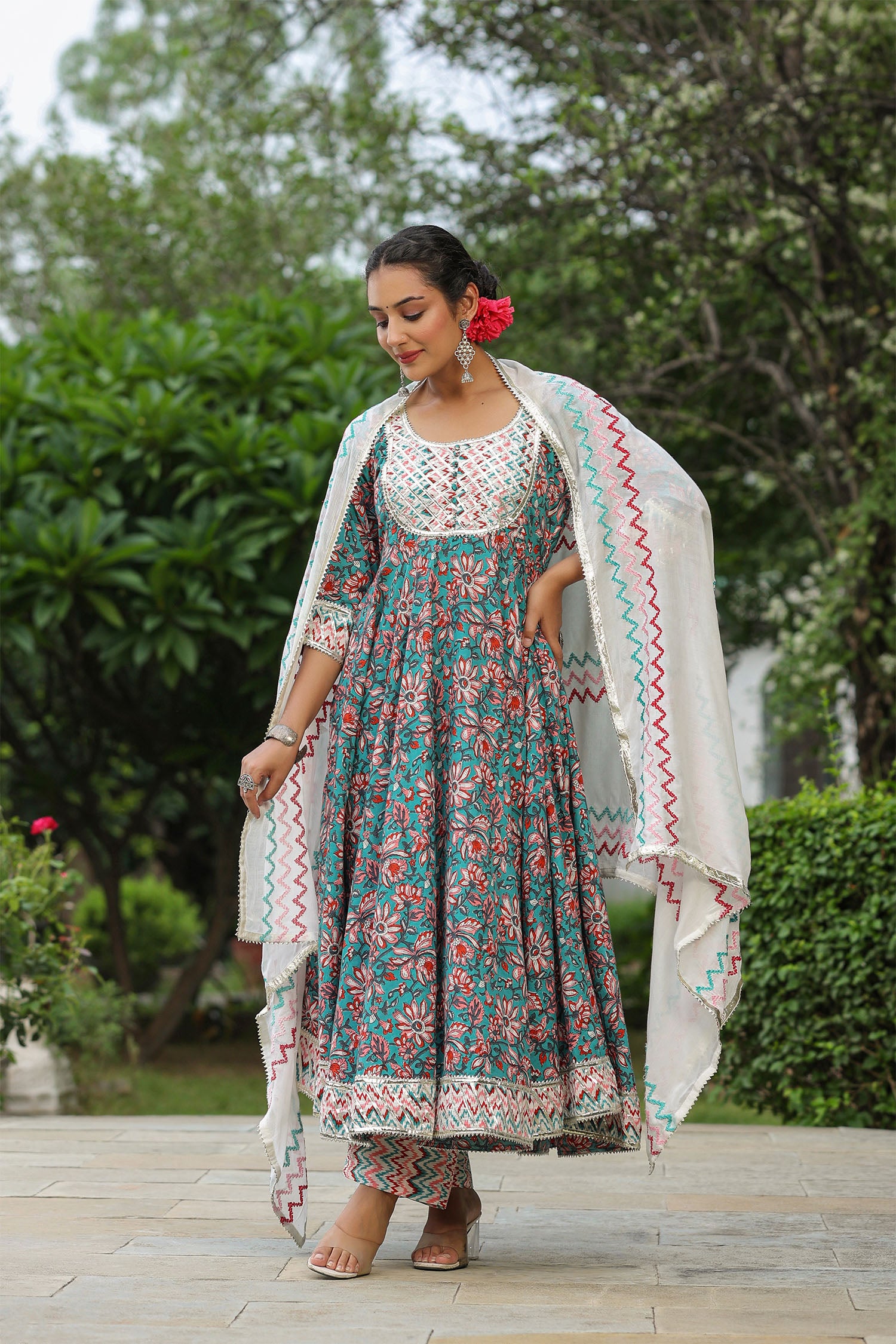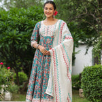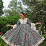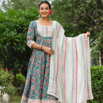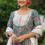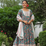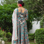 The persian green cotton floral printed anarkali set with matching pant and dupatta for a simple charming look.