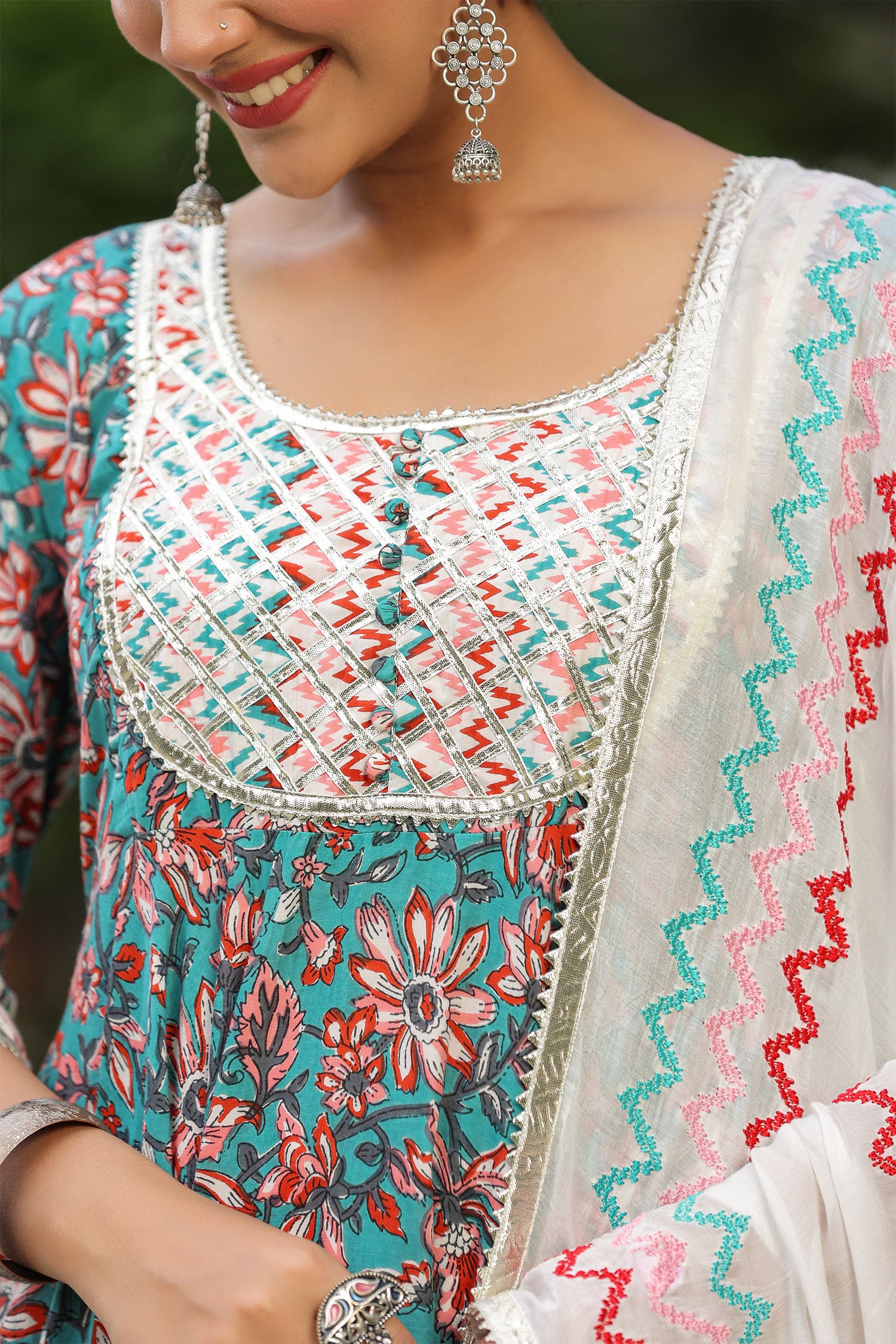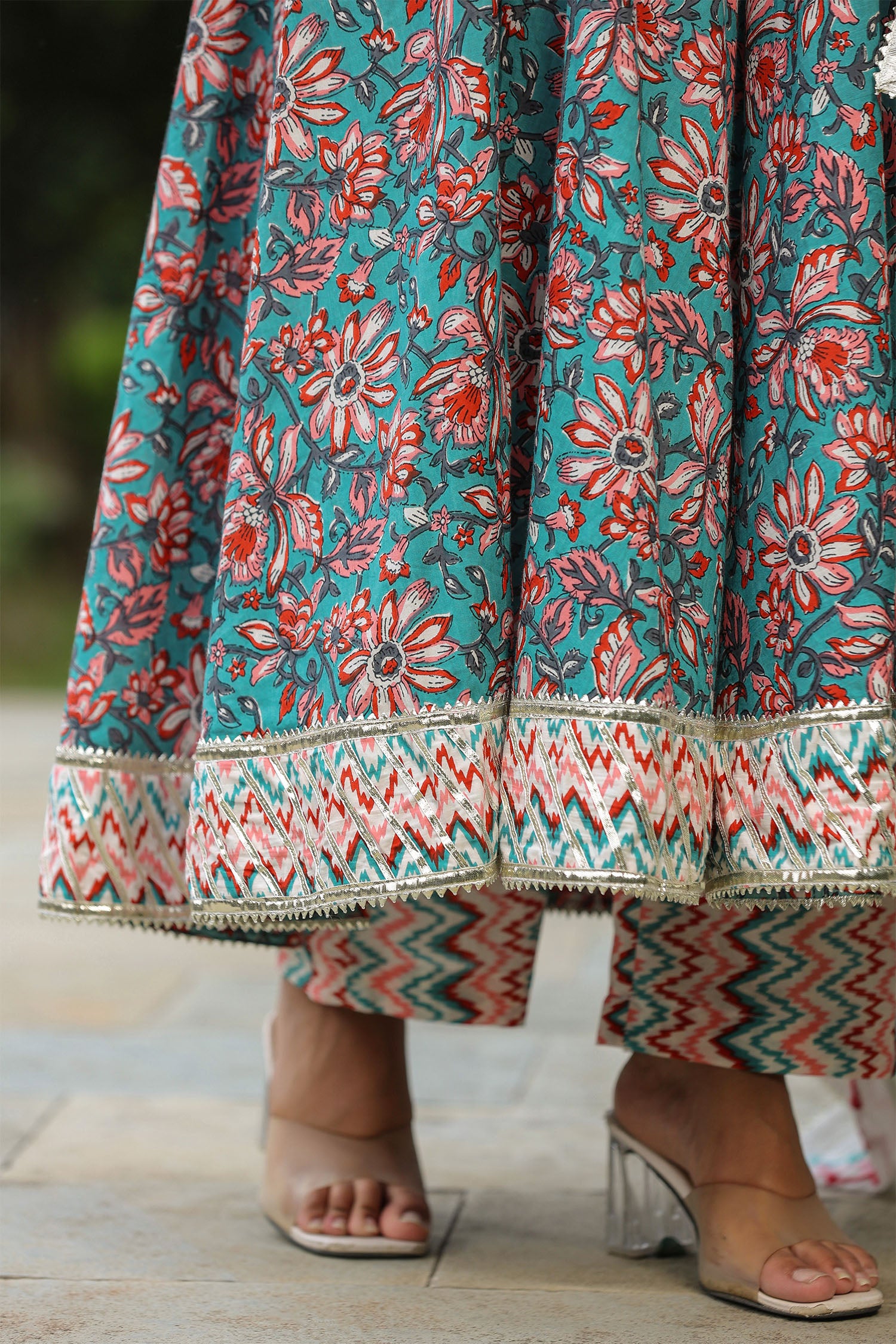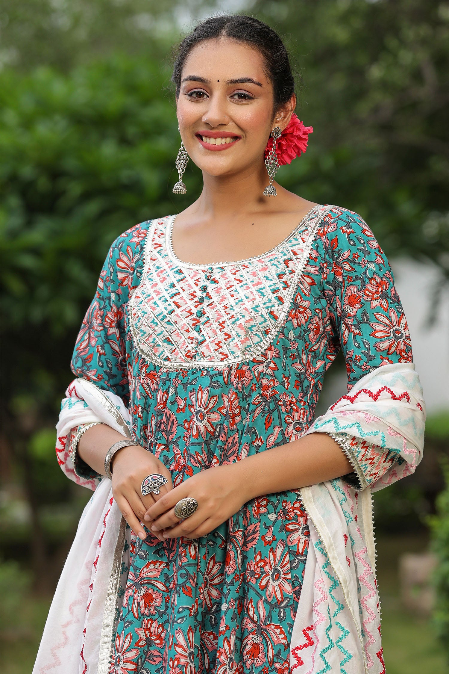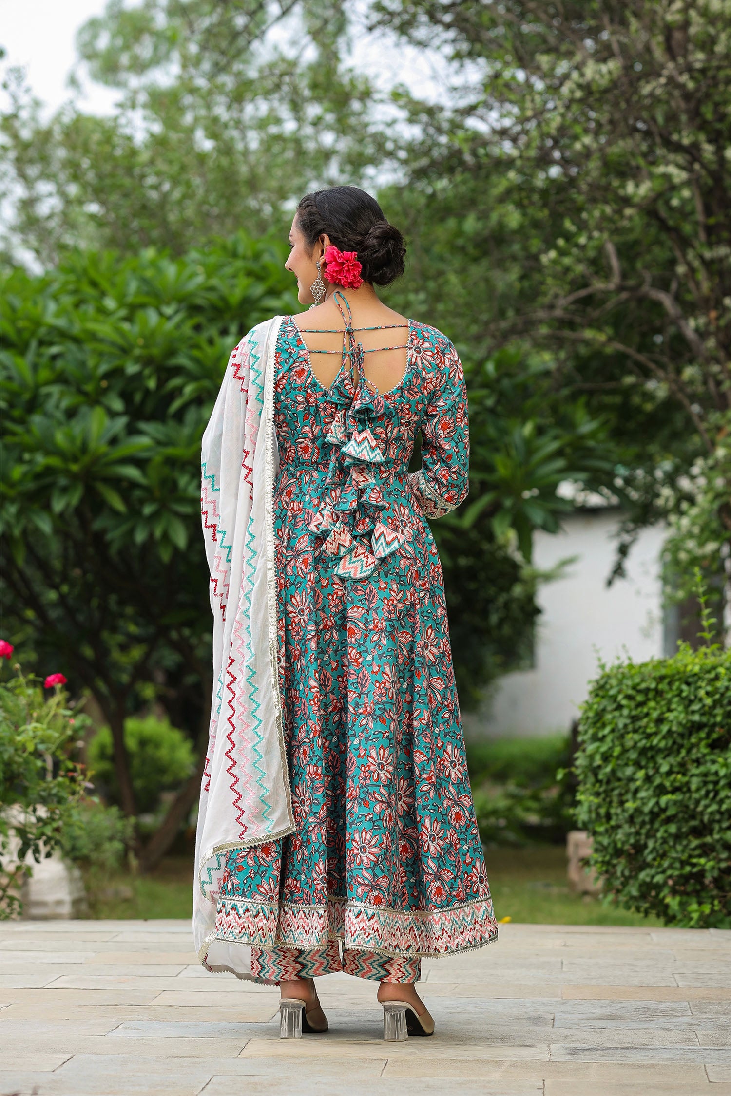 The persian green cotton floral printed anarkali set with matching pant and dupatta for a simple charming look.