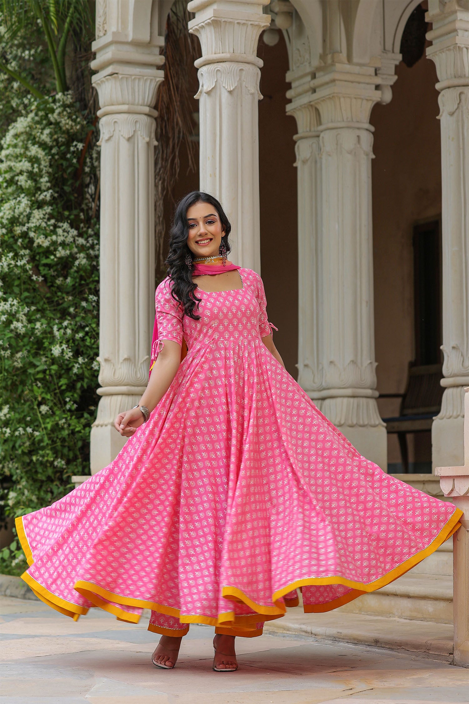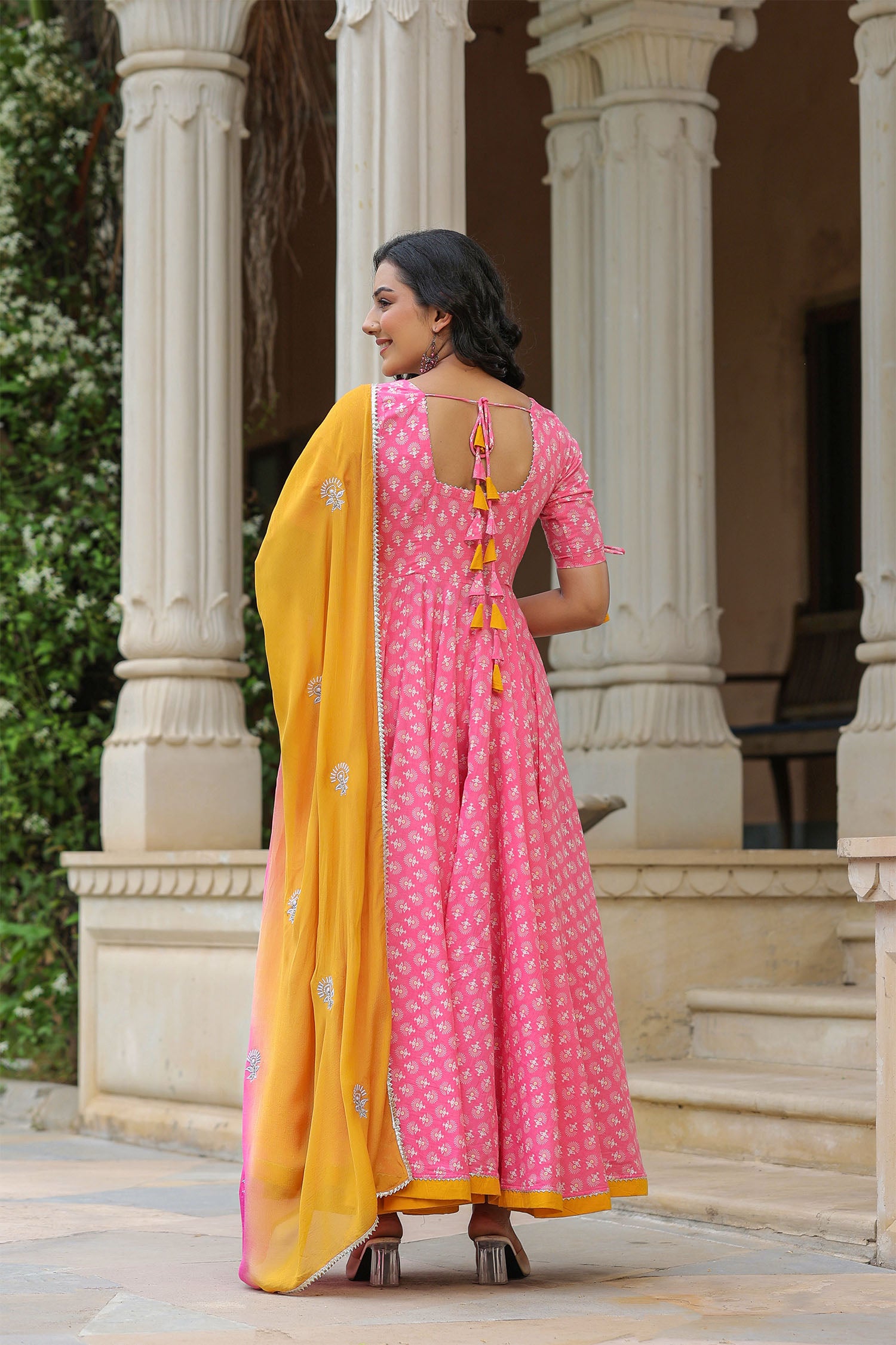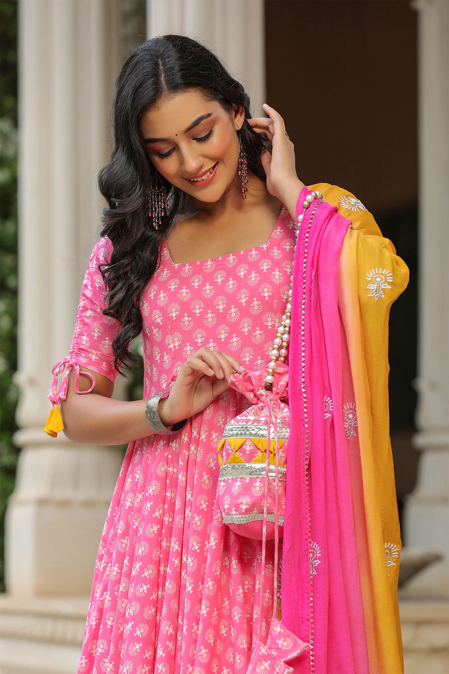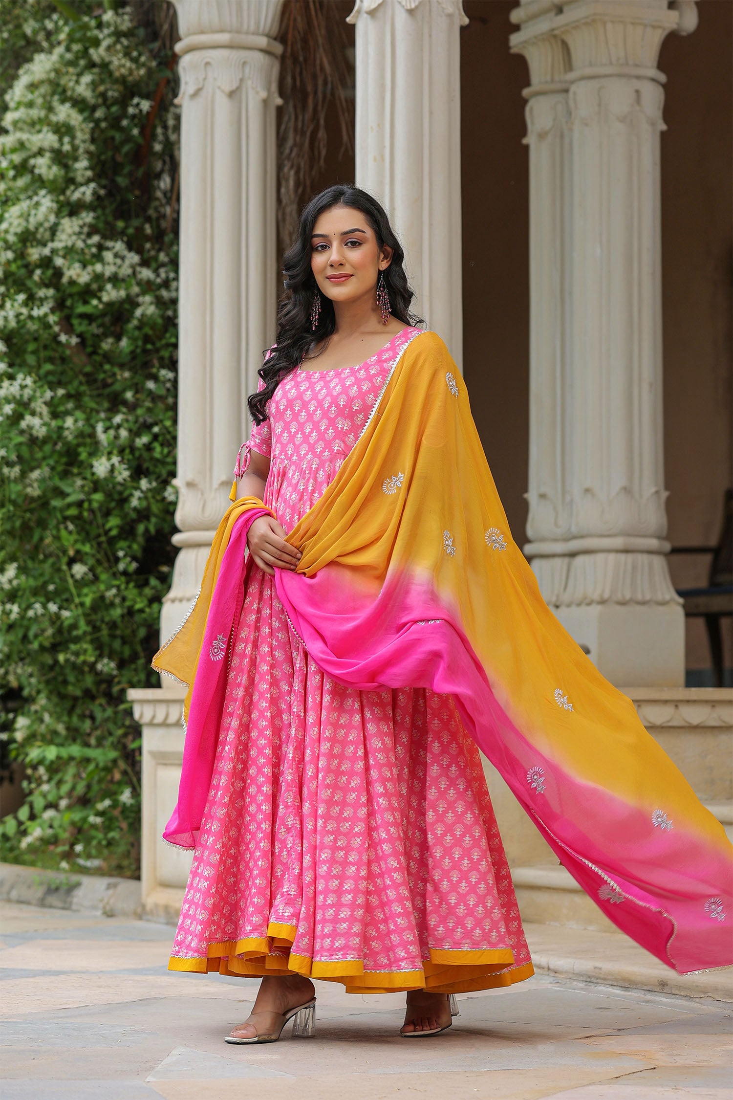 The persian pink cotton printed floral anarkali paired with matching pant and chinon dupatta for a simple look with subtle charm.