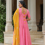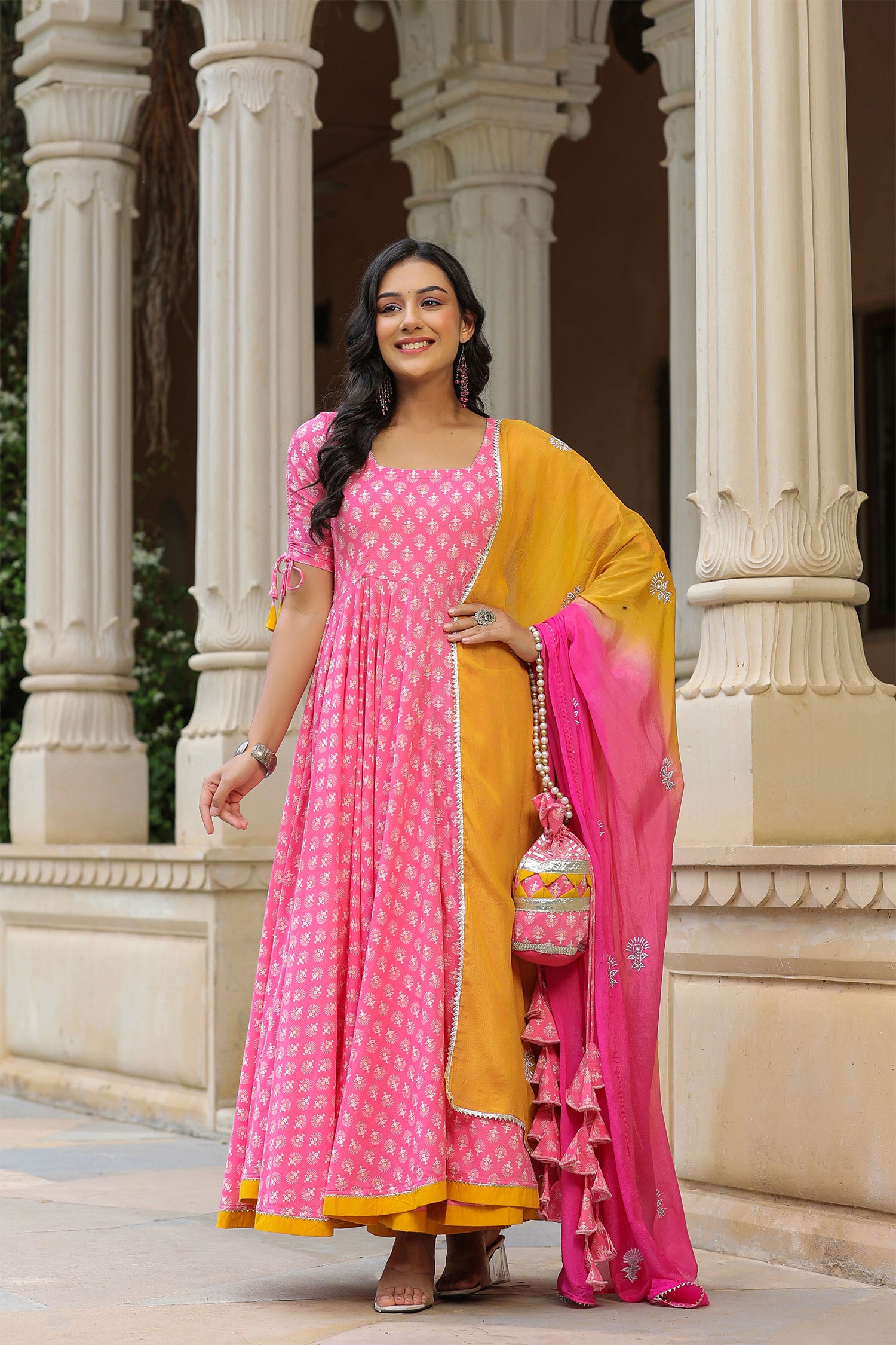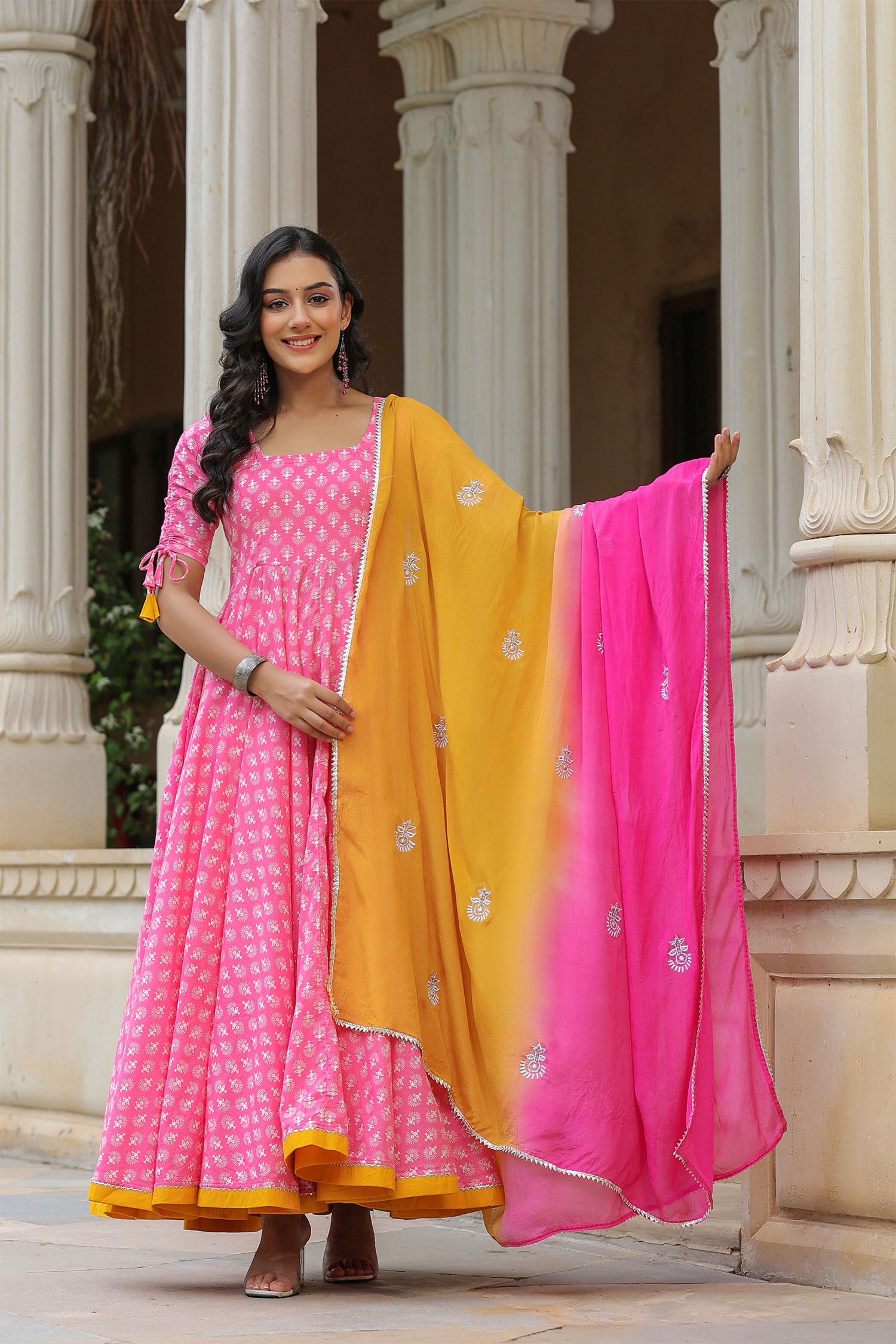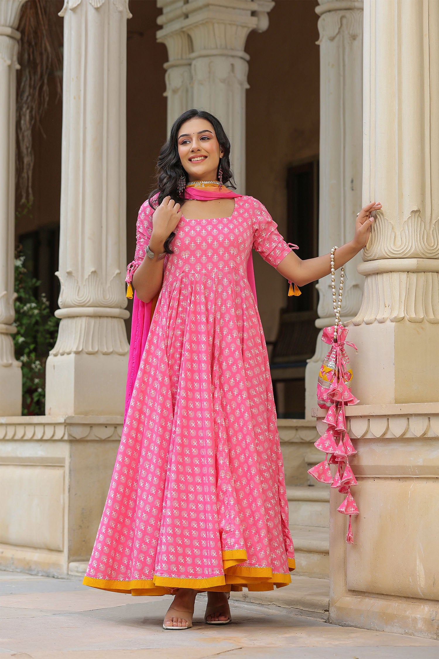 The persian pink cotton printed floral anarkali paired with matching pant and chinon dupatta for a simple look with subtle charm.