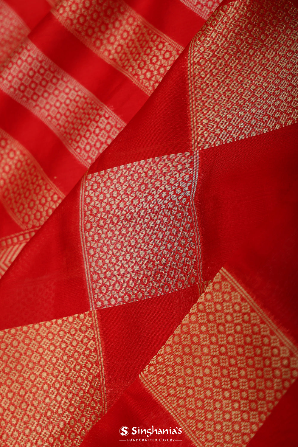 This is a persian red banarasi silk saree for festive, wedding occasions and party wear. Adorned with dual shade gold zari alternate checks weaving all over the body and a small, diagonal stripes pallu, completing the whole look.