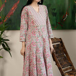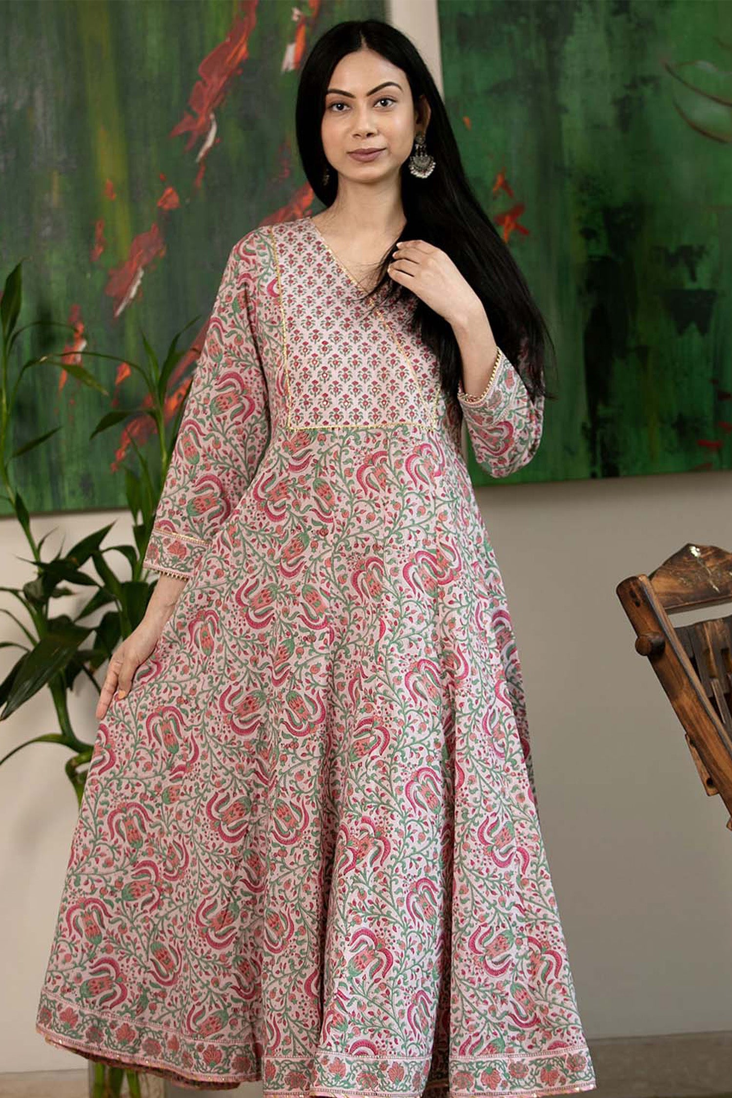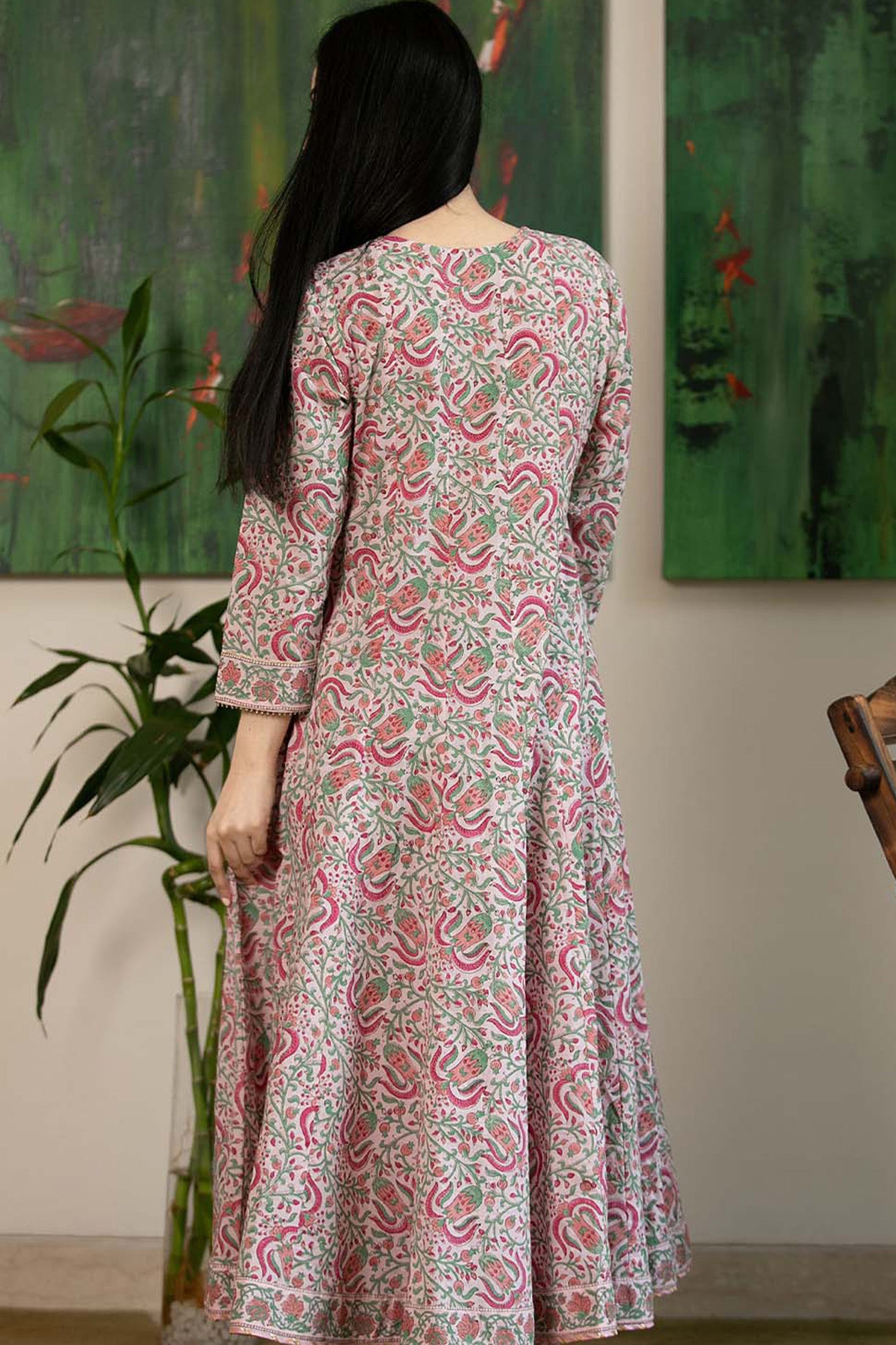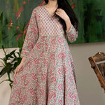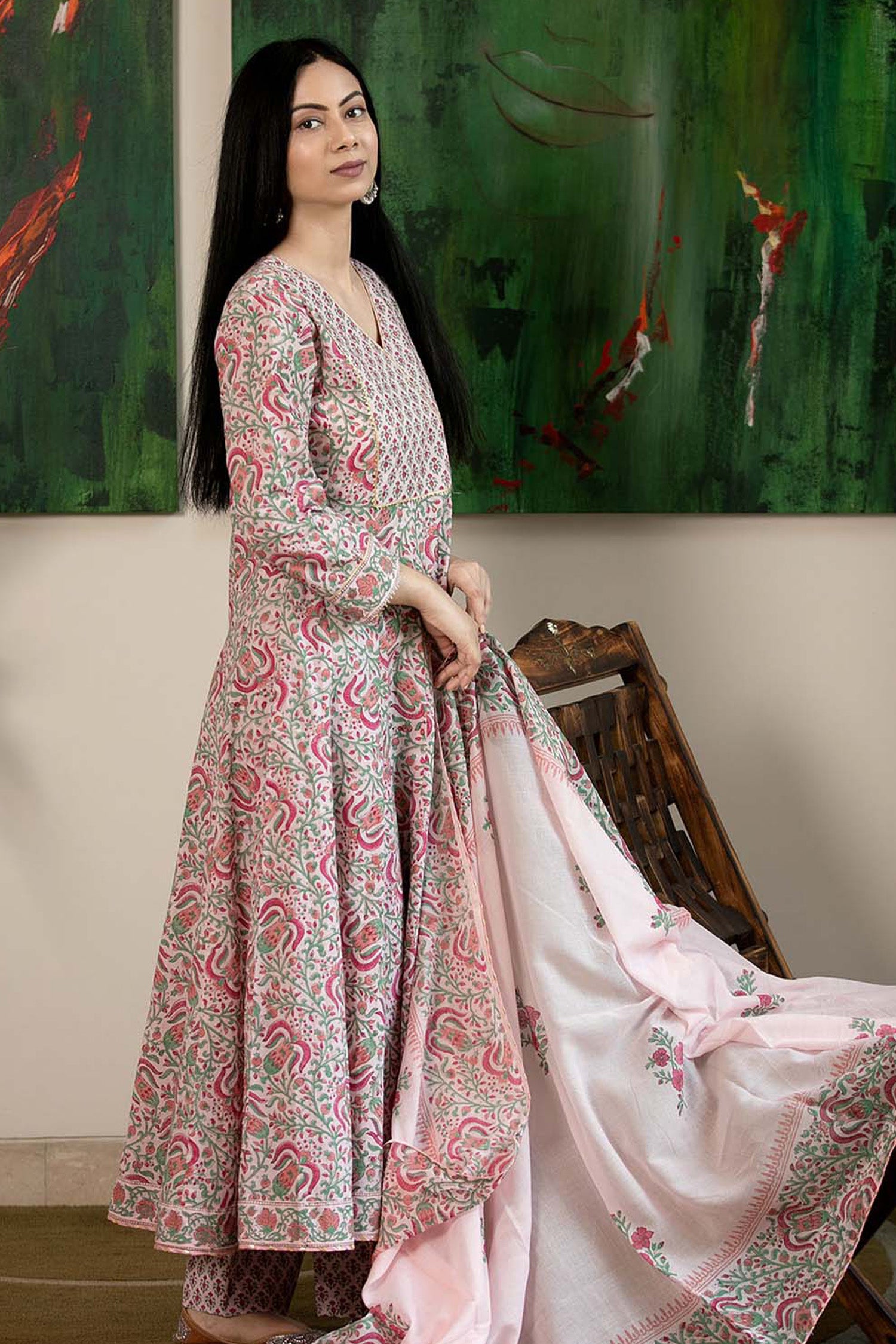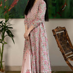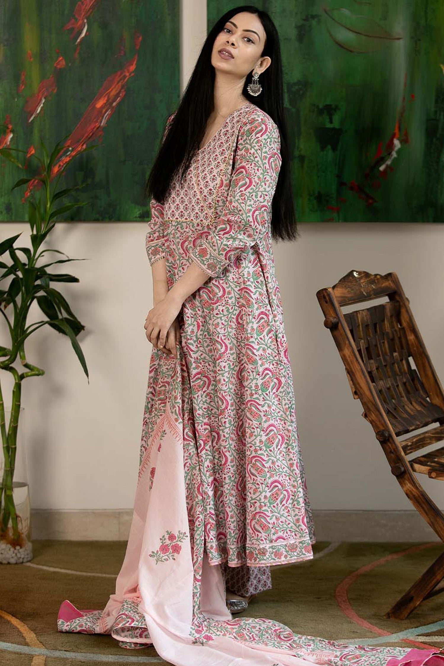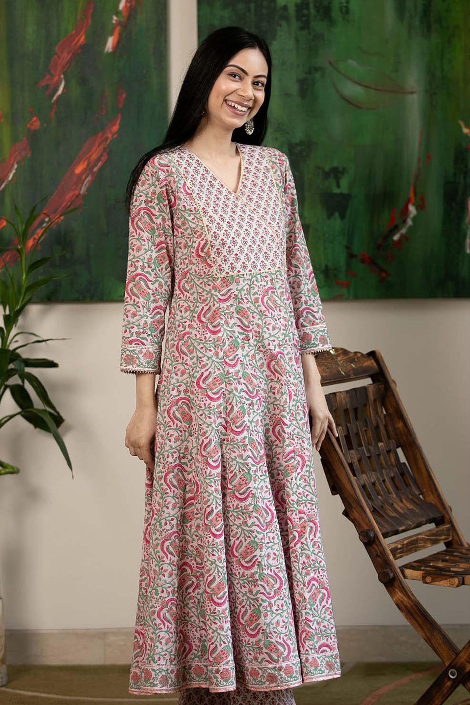 The Suit set features a beautiful hand block print in a soft pink and white colour palette. It is adorned with floral and paisley pattern which is paired with the comfortable and matching pants. The breathable cotton maintains its style and comfort also suitable for casual and festive occasions.
