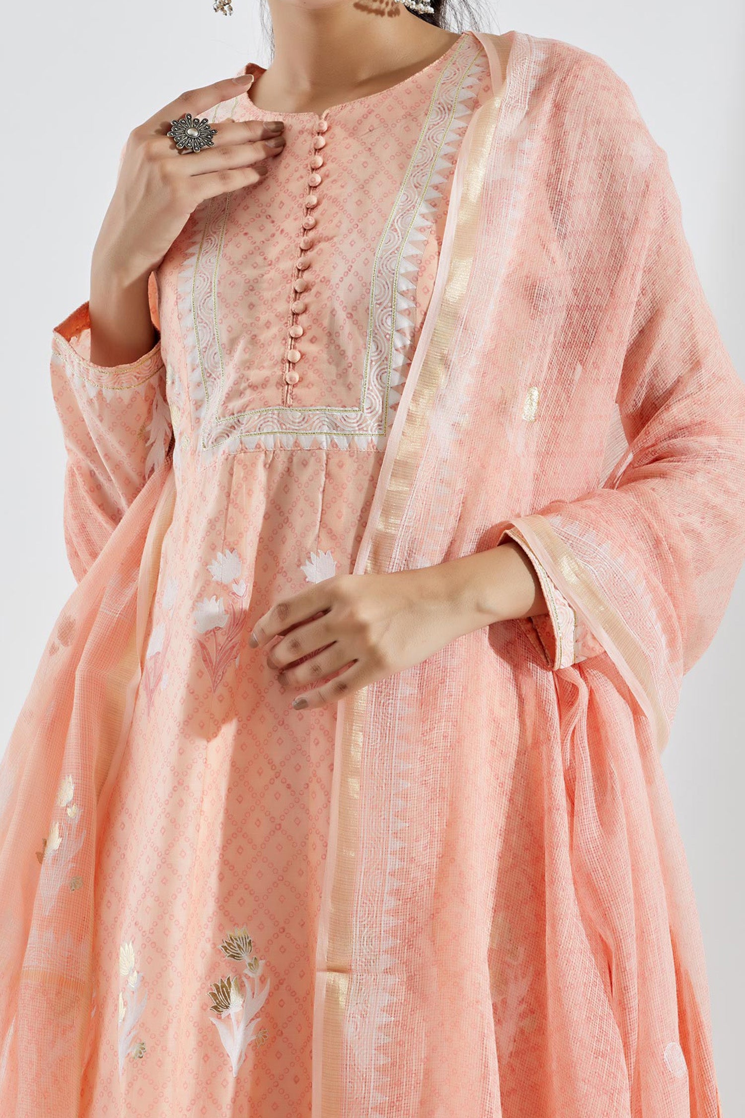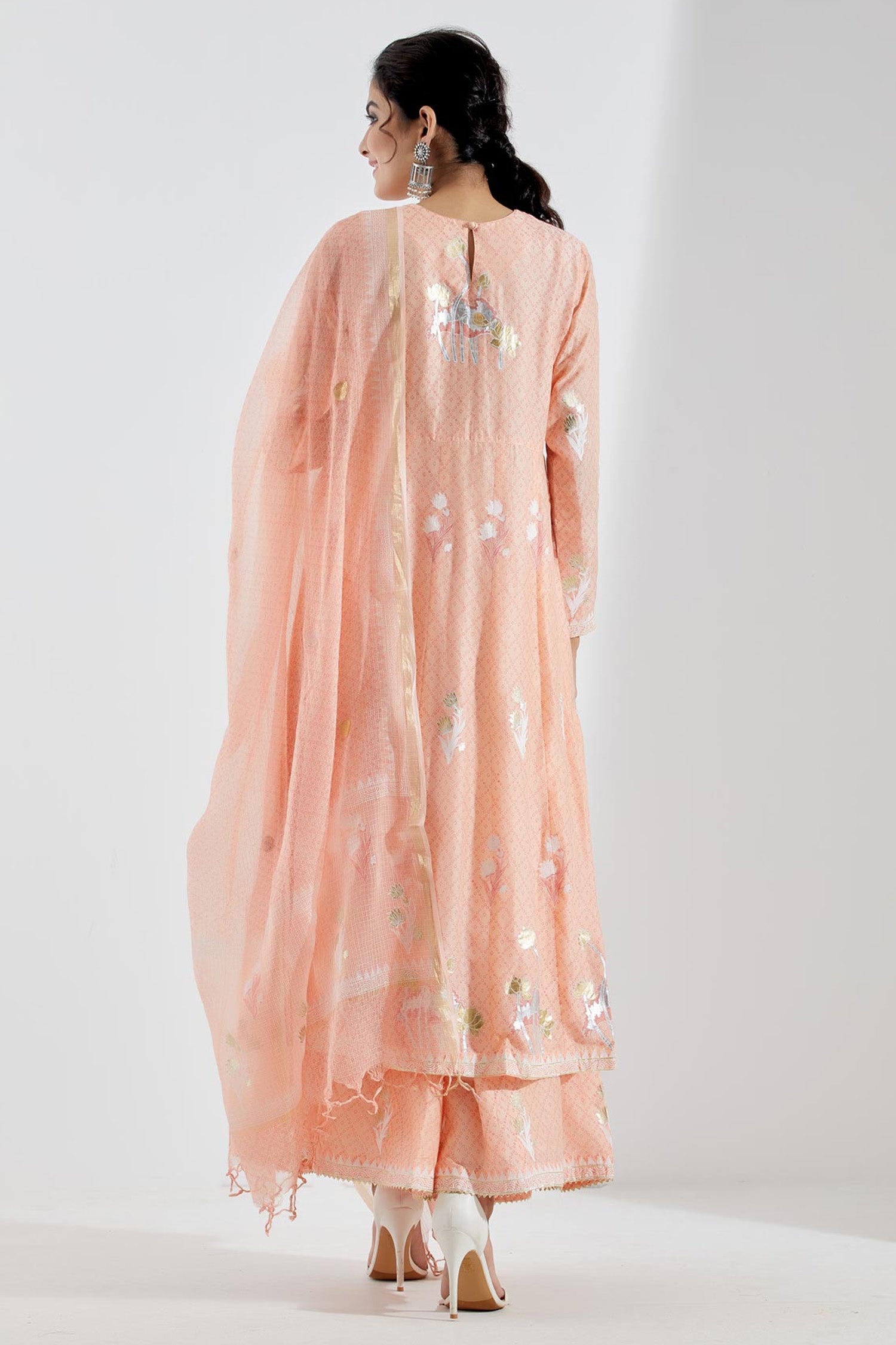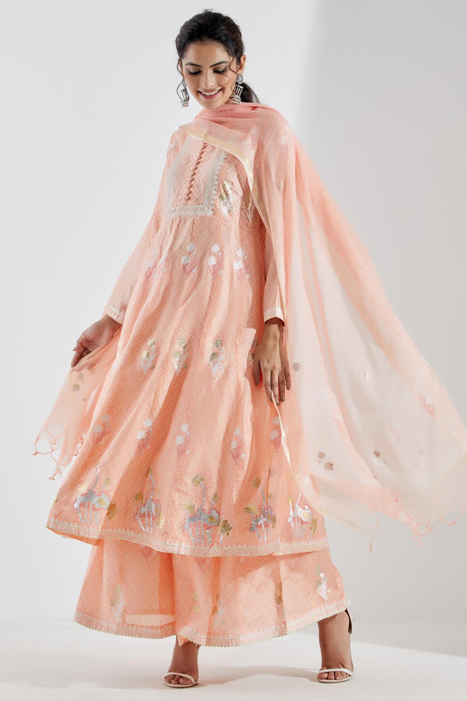 Printed Light Peach Floral Cotton Silk Anarkali Set
