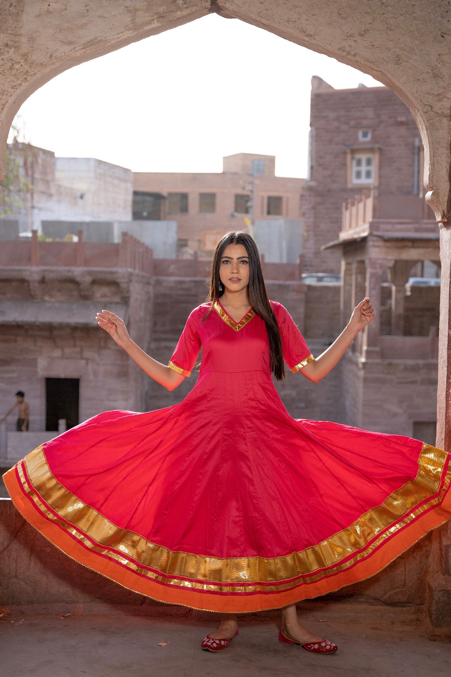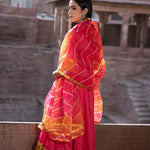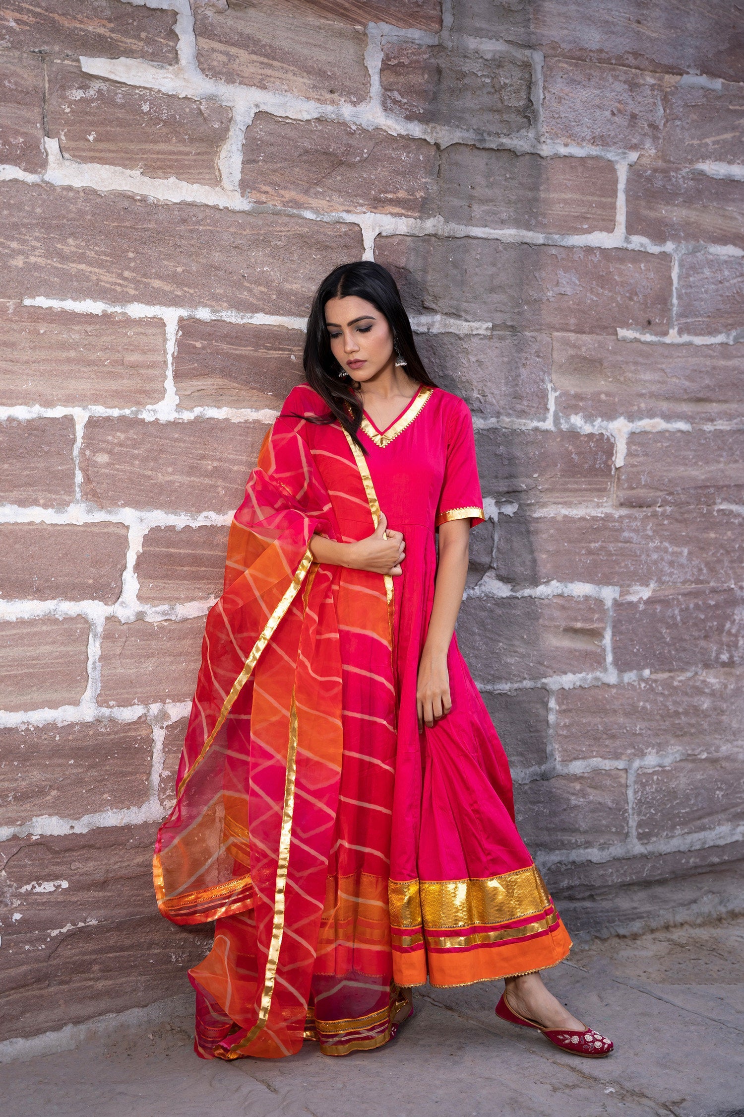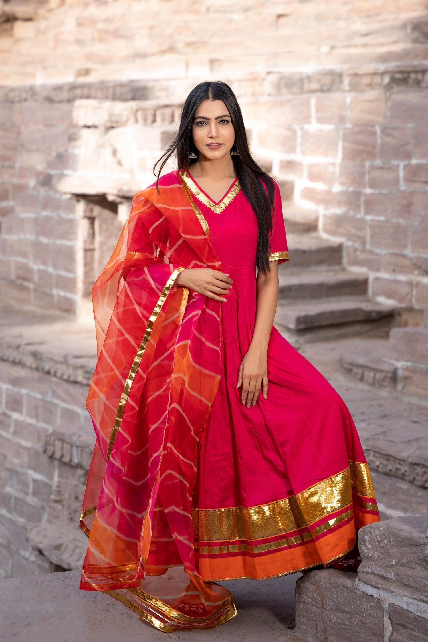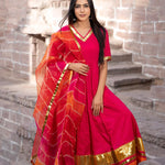 Rani pink cotton silk anarkali set features V neckline and sleeves upto elbow length complemented with muslin dupatta making it ideal choice for any event.