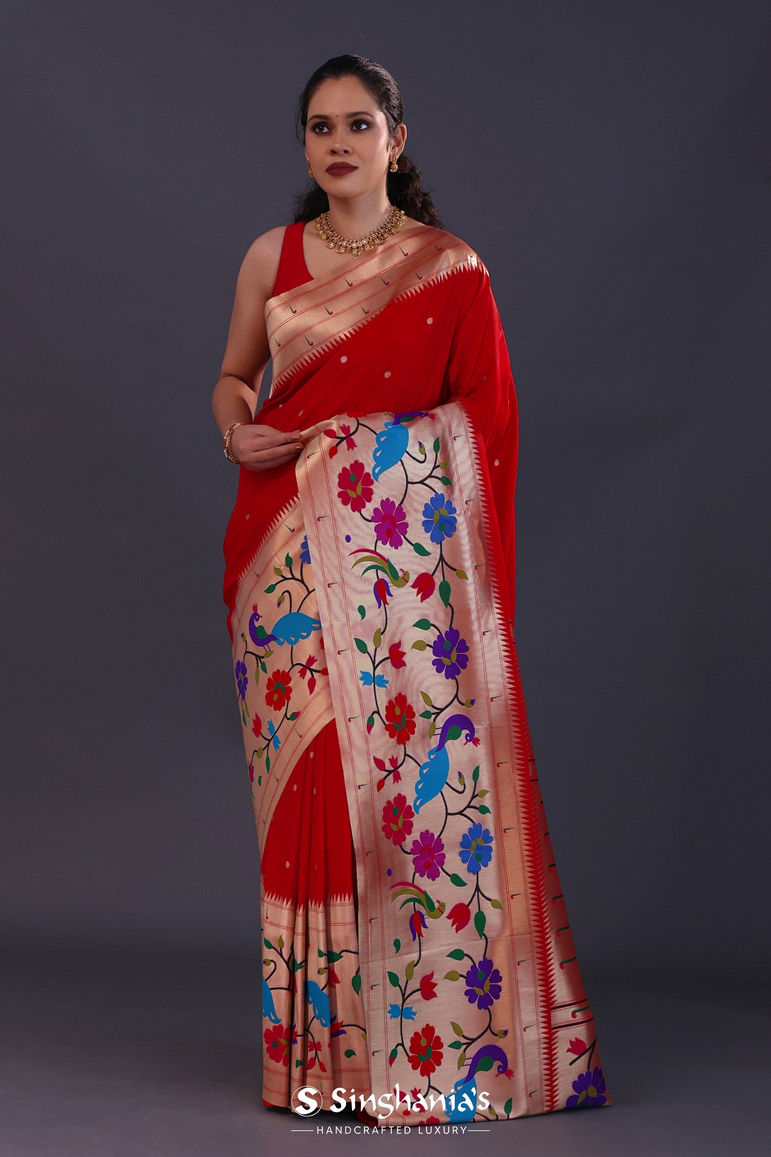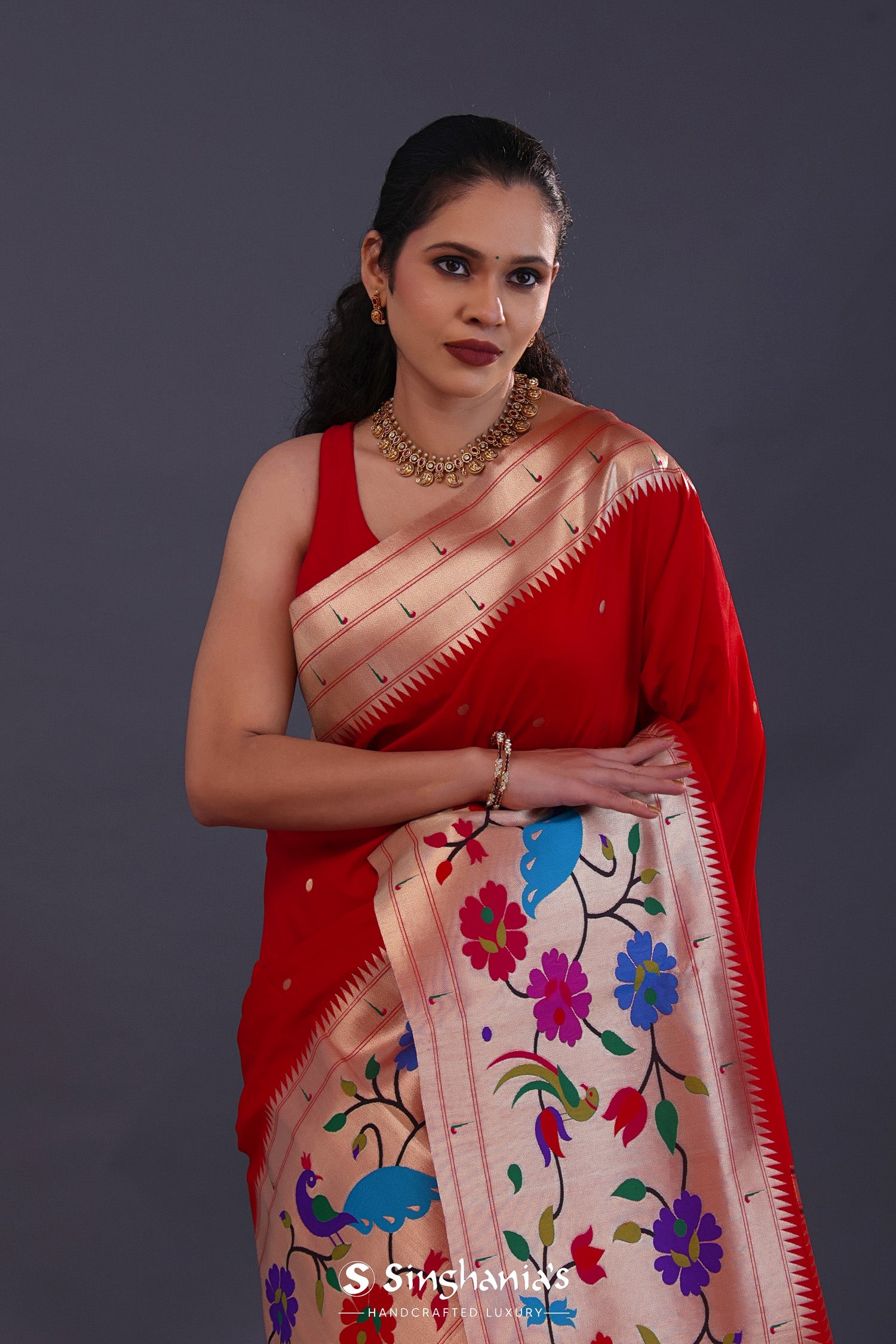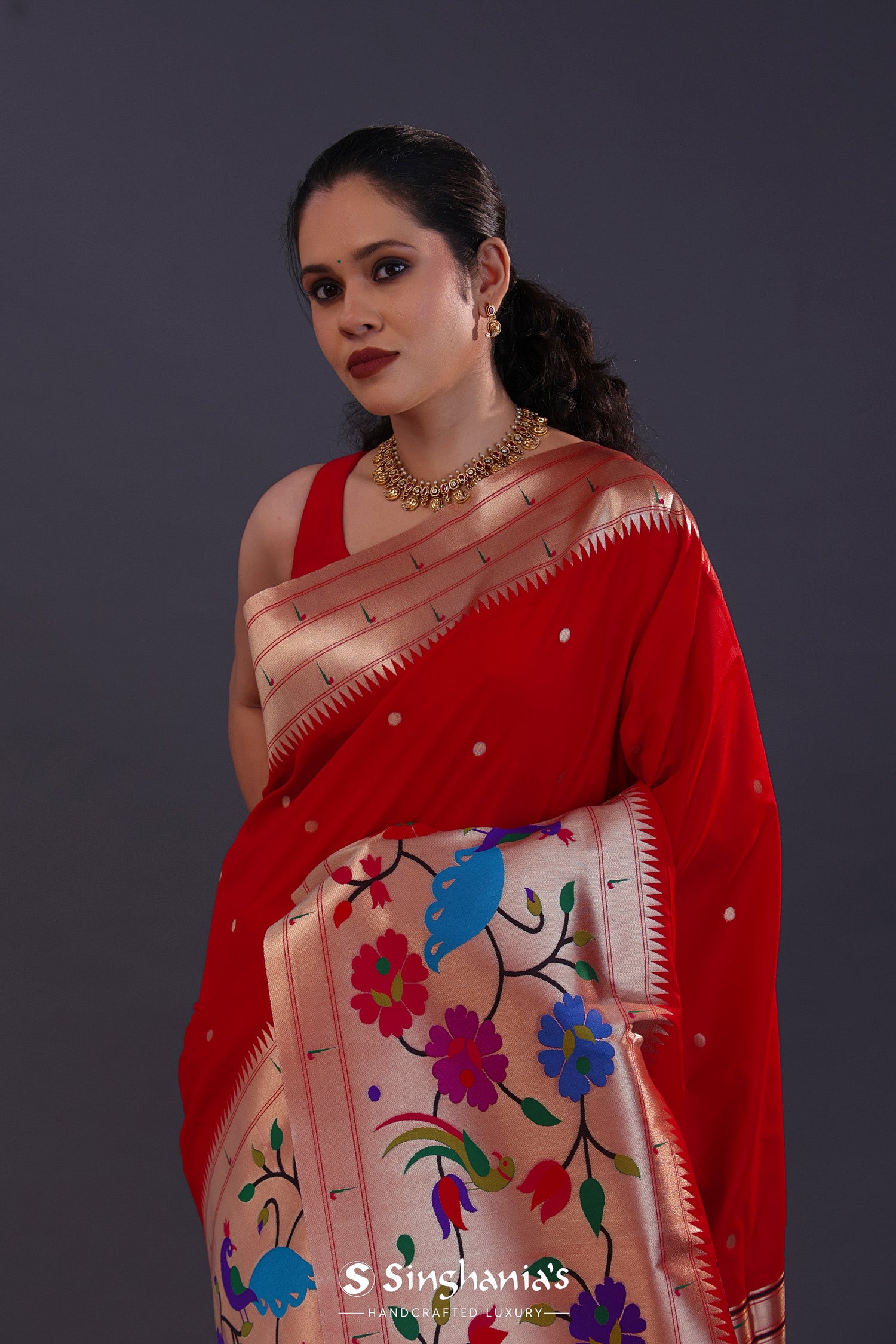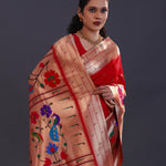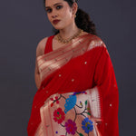 The Red berry paithani saree features butti's woven with gold zari complemented with paithani border and unstitched blouse