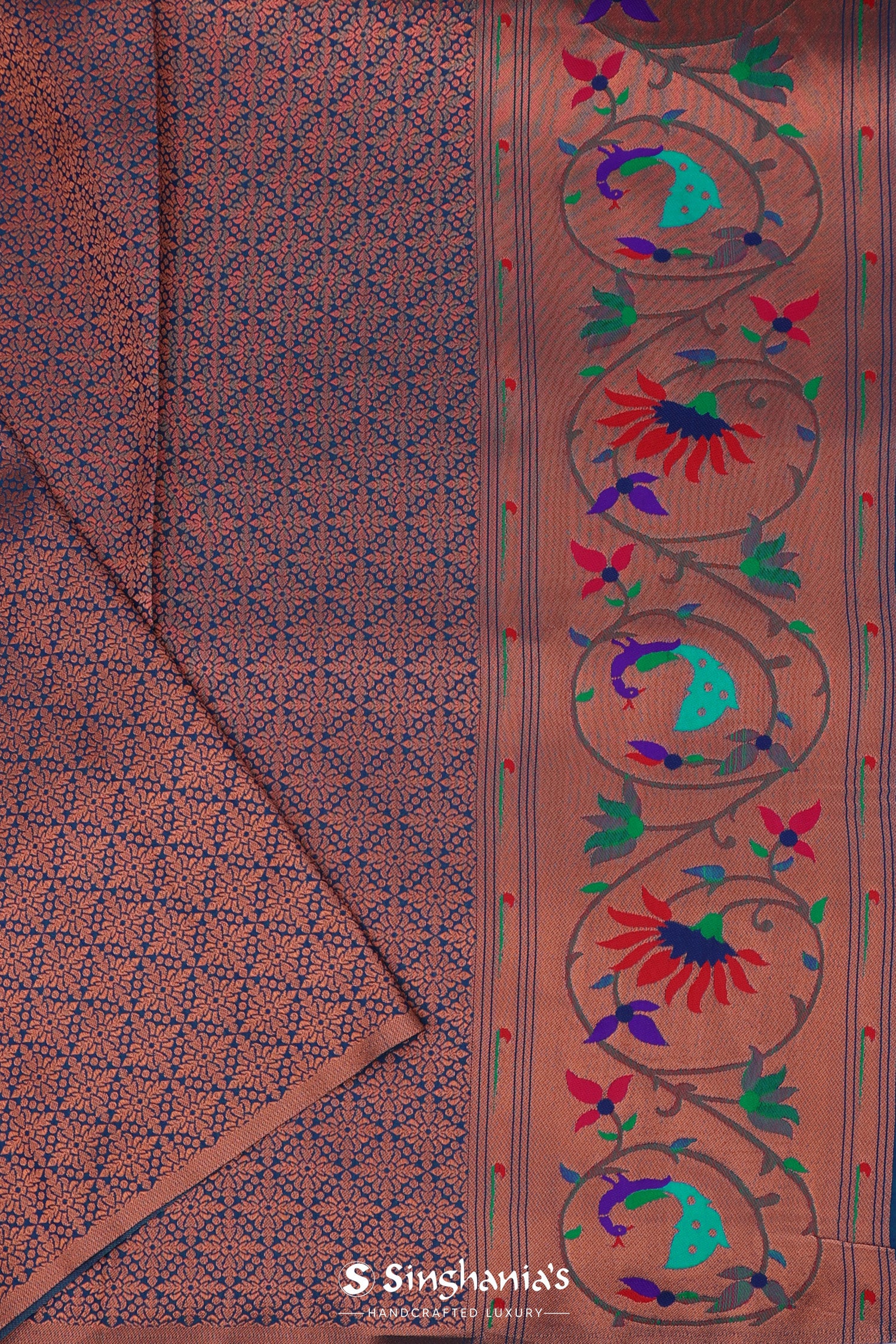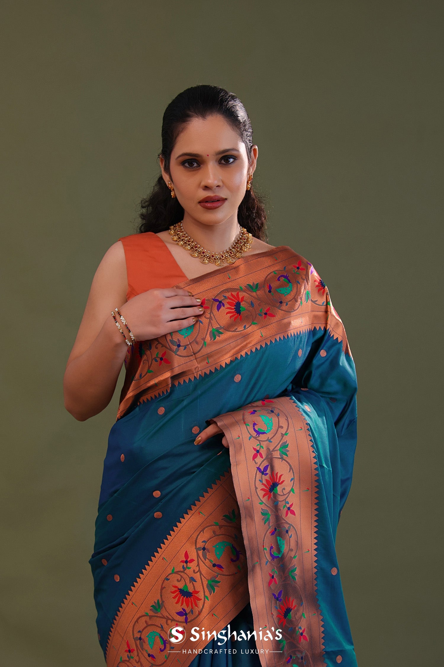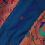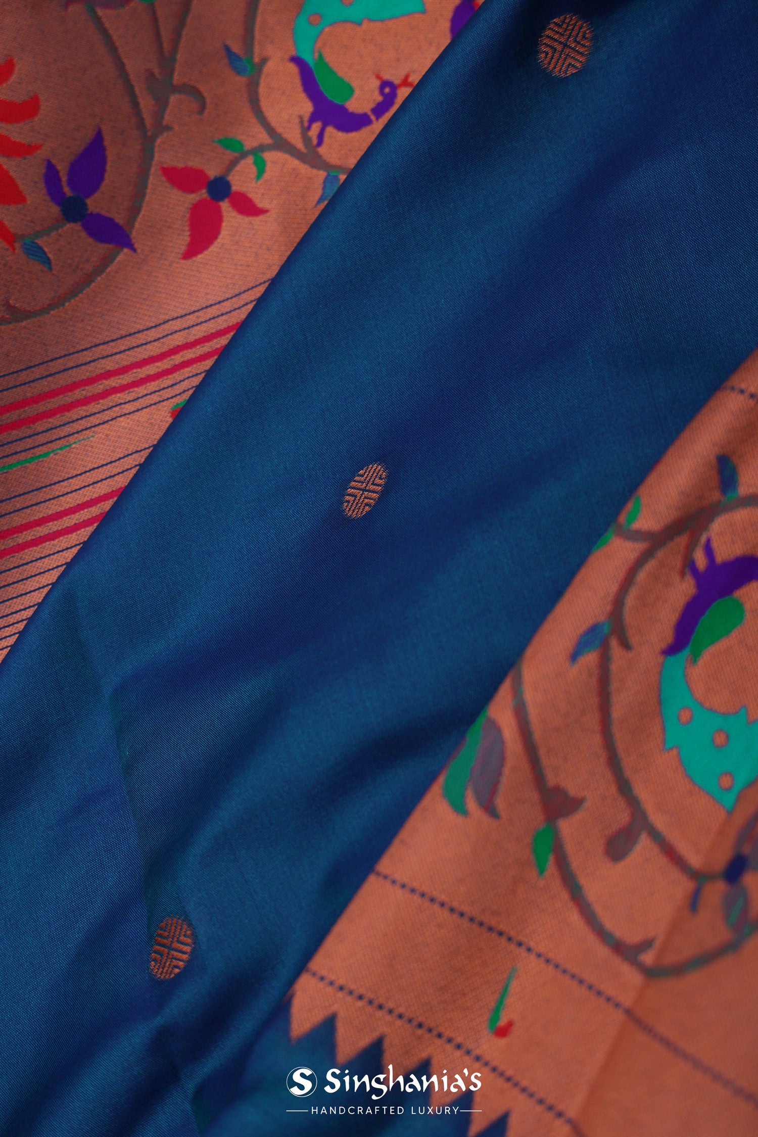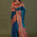 This Regal blue paithani saree features floral butti's scattered all over the body of saree complemented with paithani border and unstitched blouse