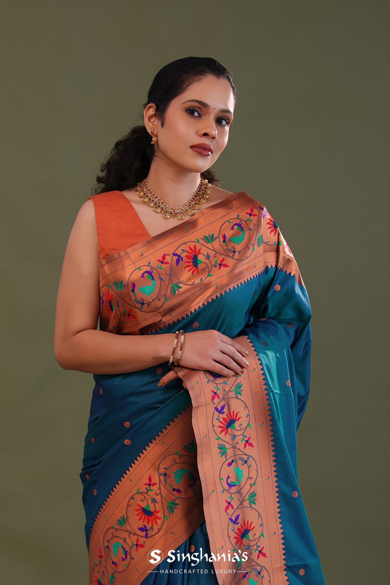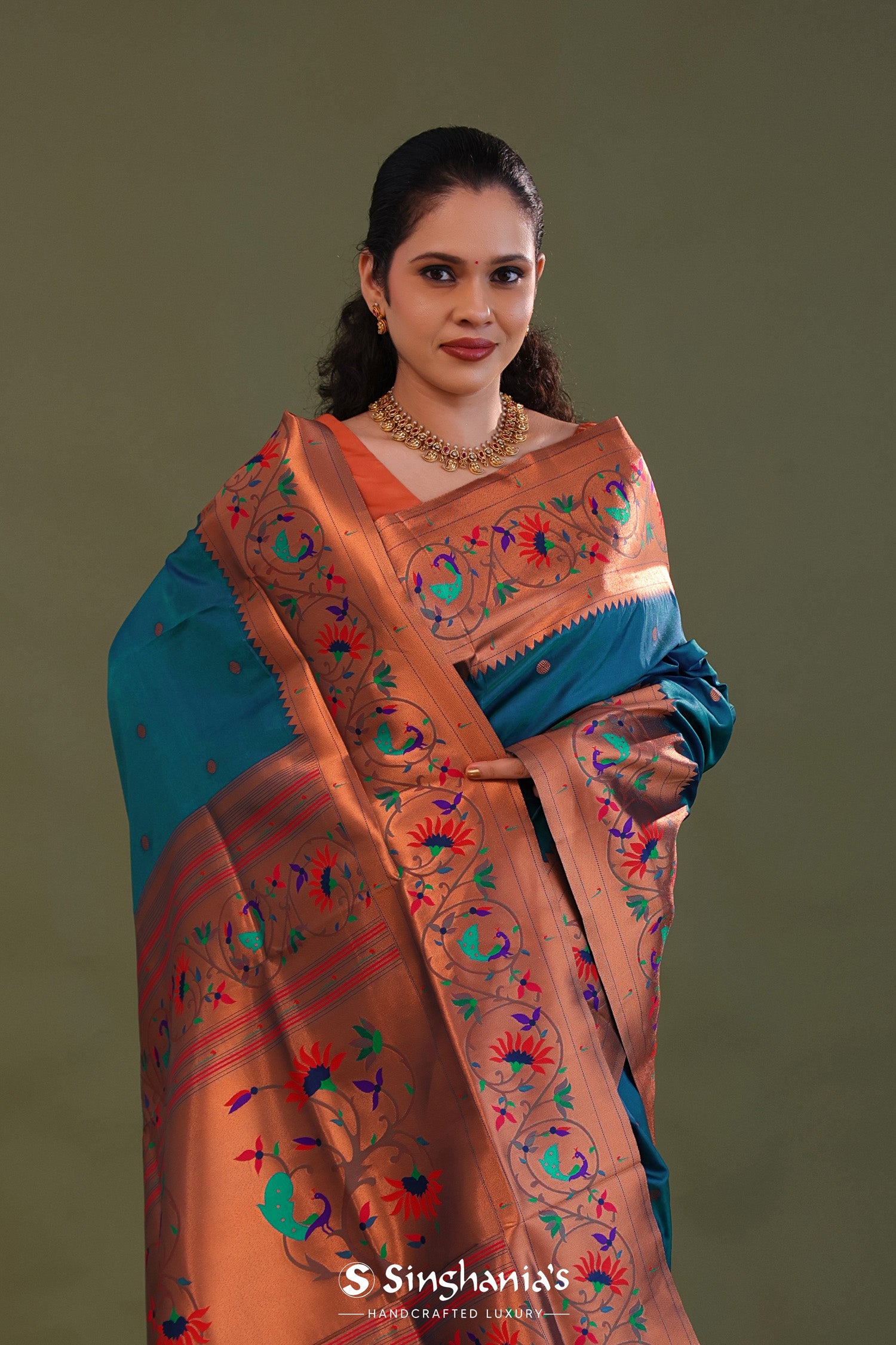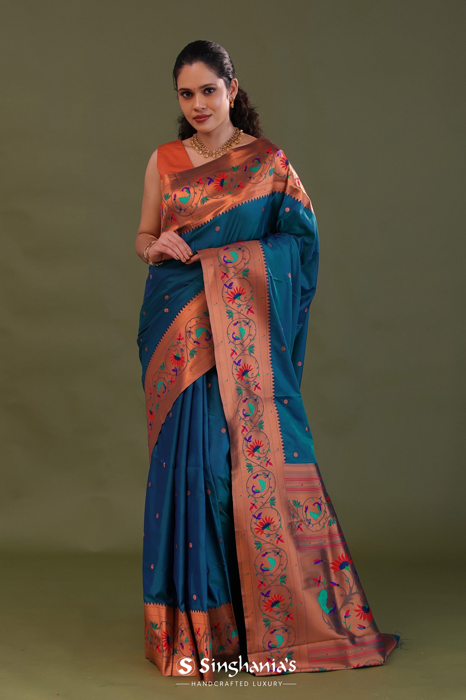 This Regal blue paithani saree features floral butti's scattered all over the body of saree complemented with paithani border and unstitched blouse