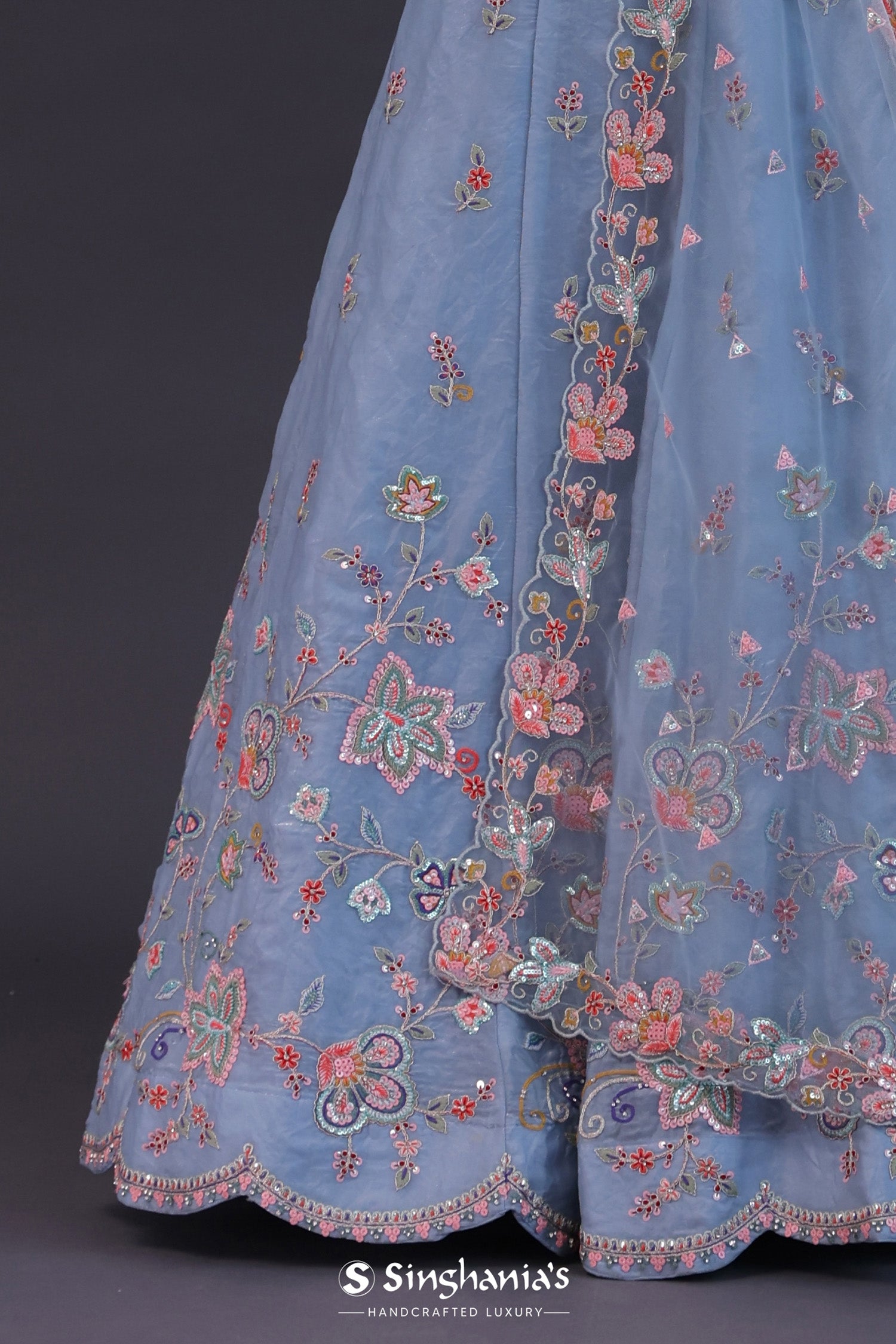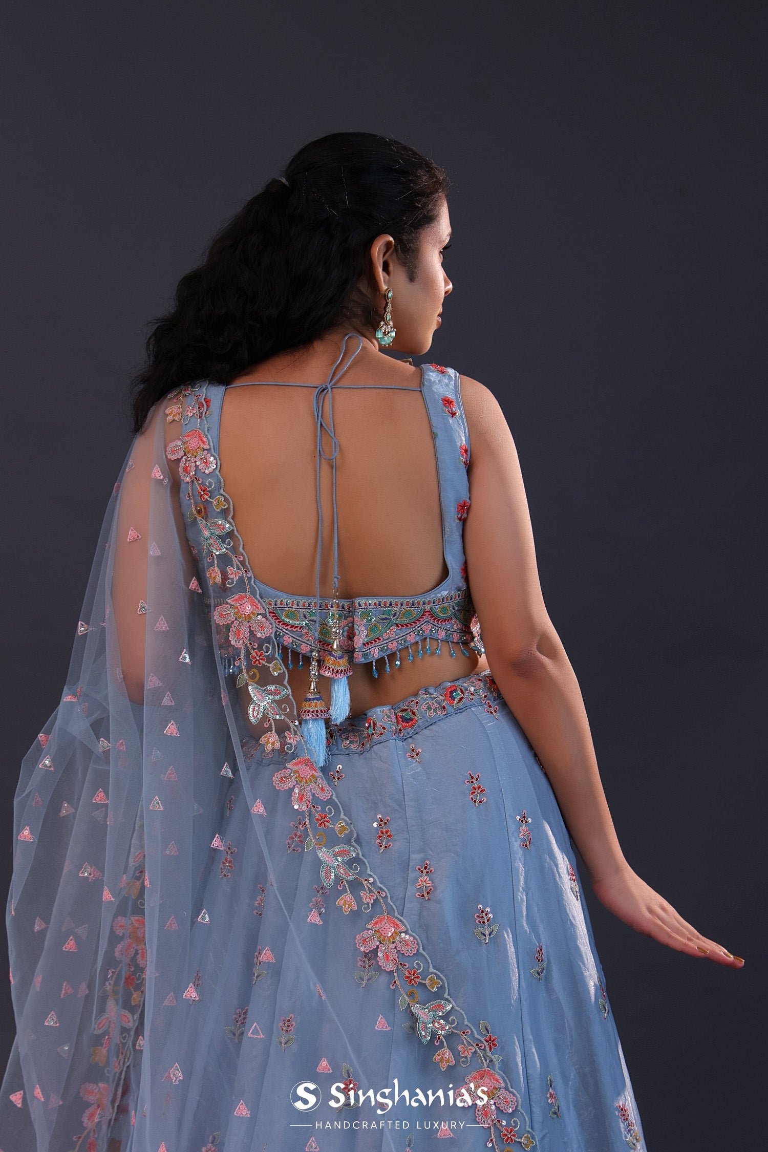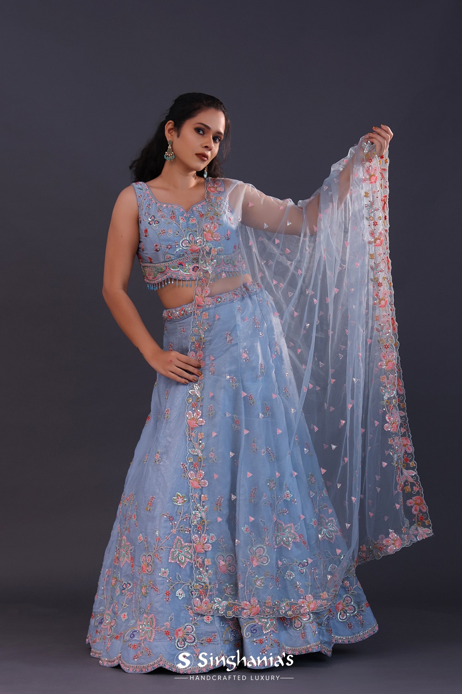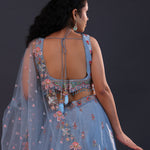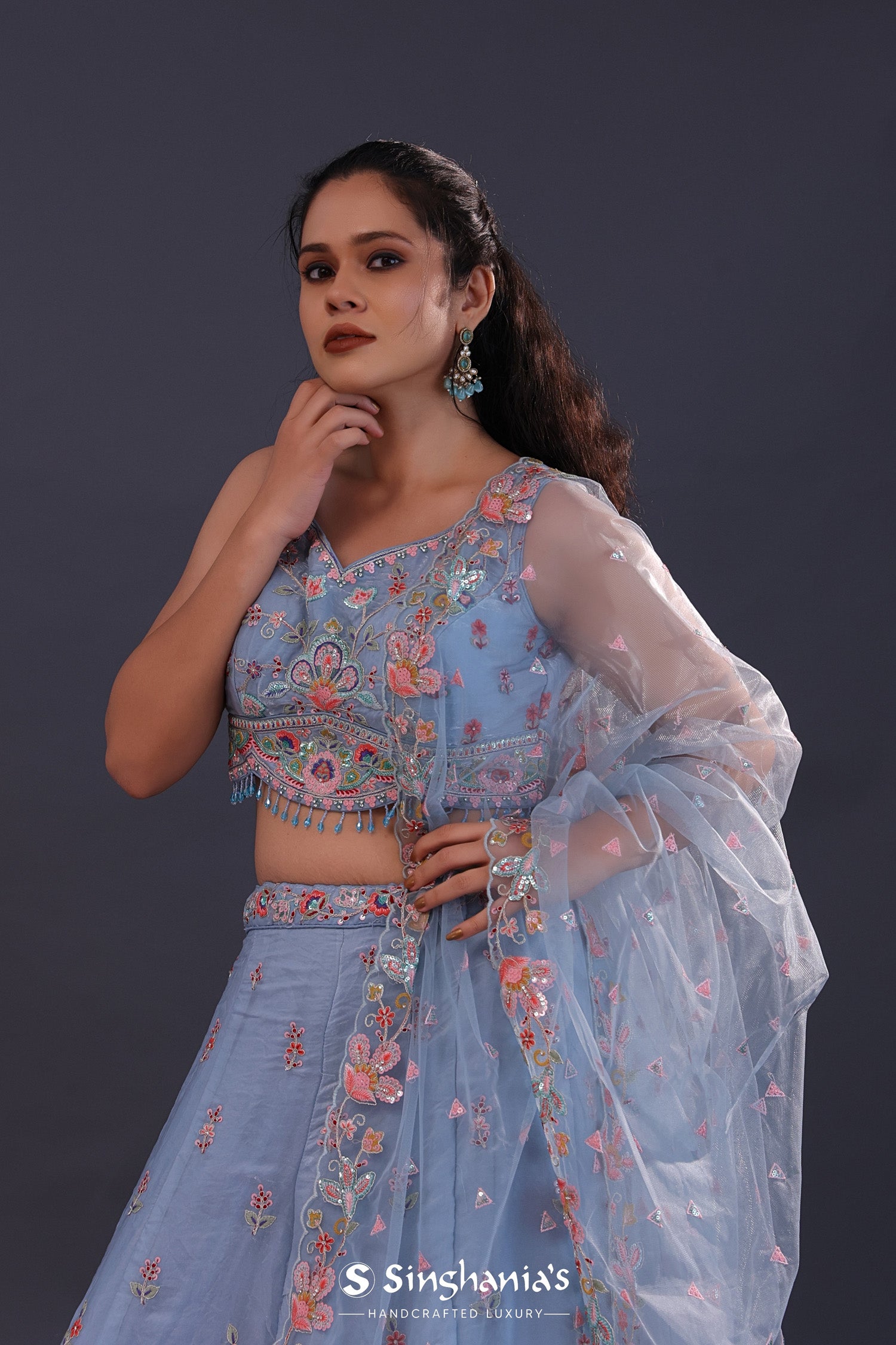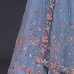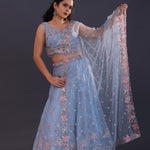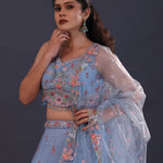 The sky blue georgette sequin embroidered lehenga set with netted dupatta for an elegant and charming look.