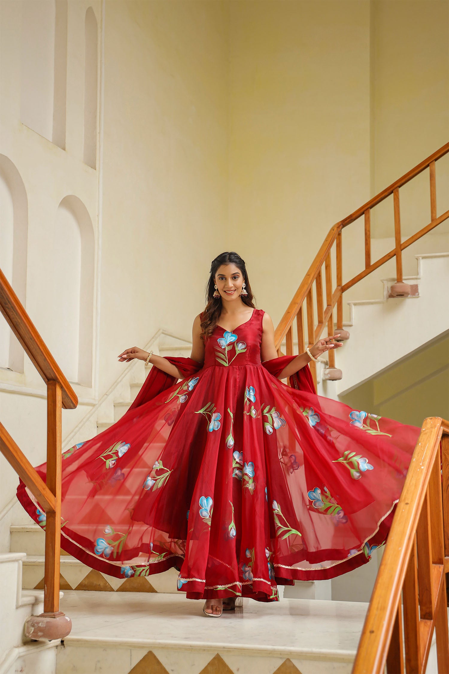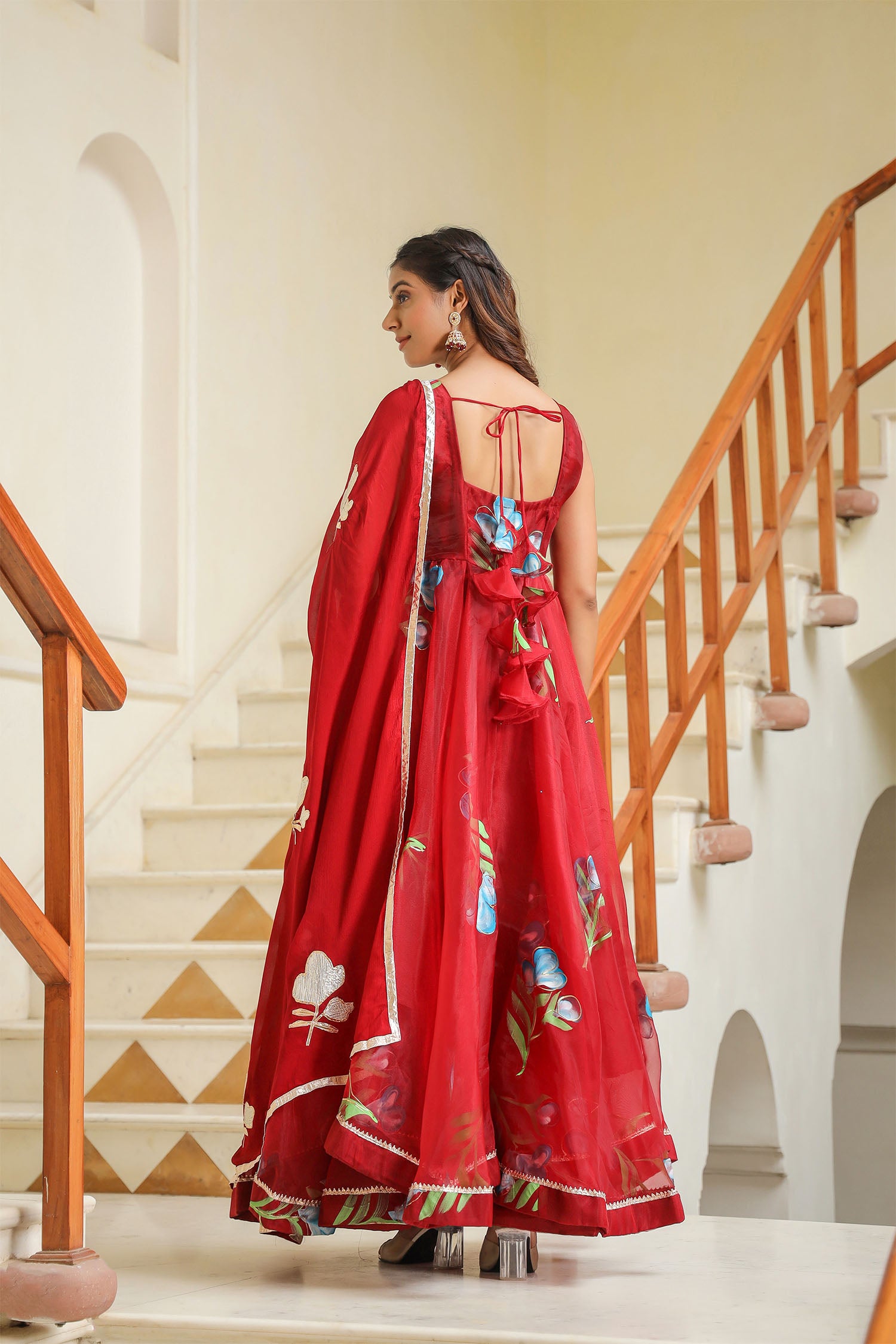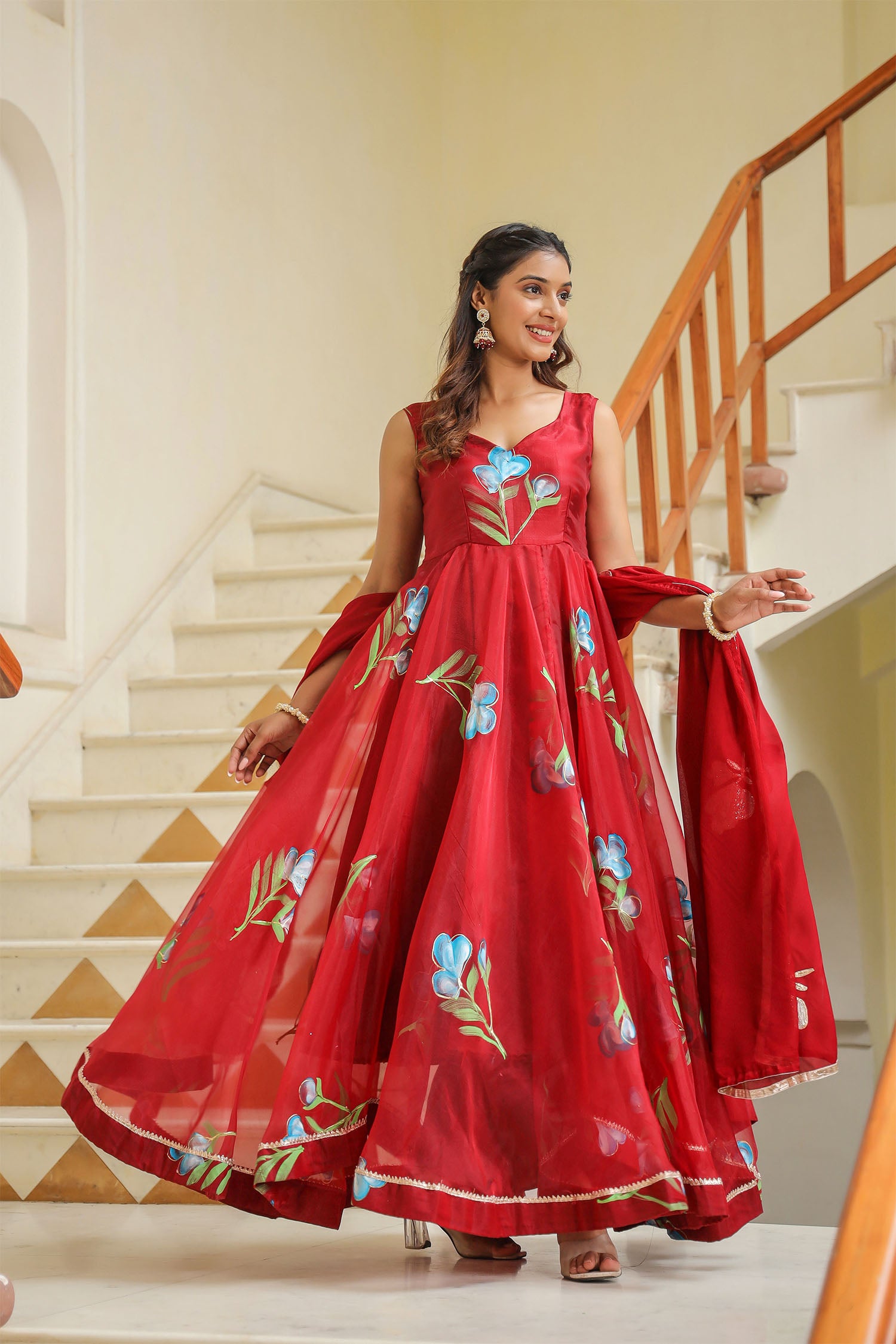 The valentia red organza floral printed anarkali set with matching pant and chinon dupatta for a beautiful look with elegant feel.