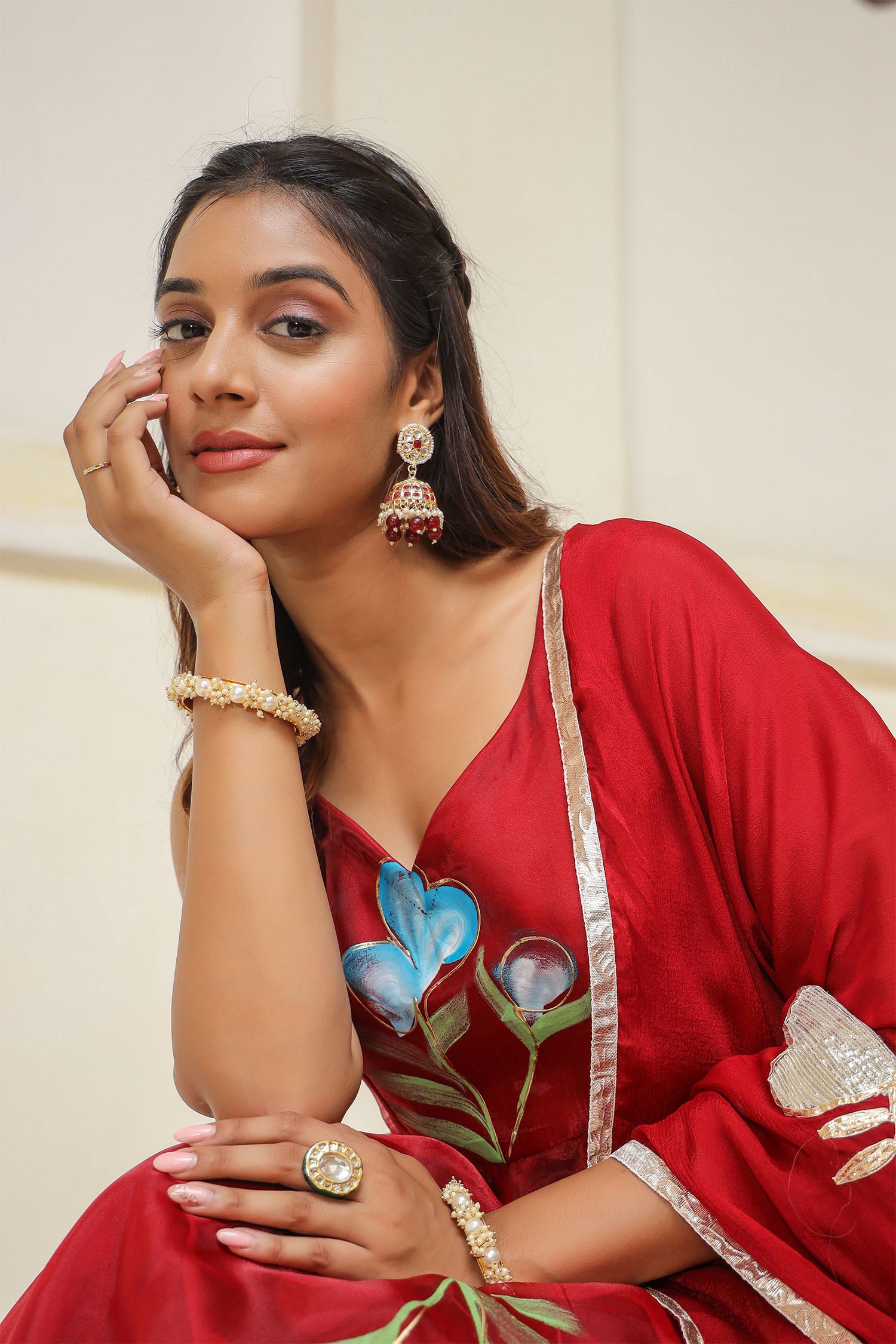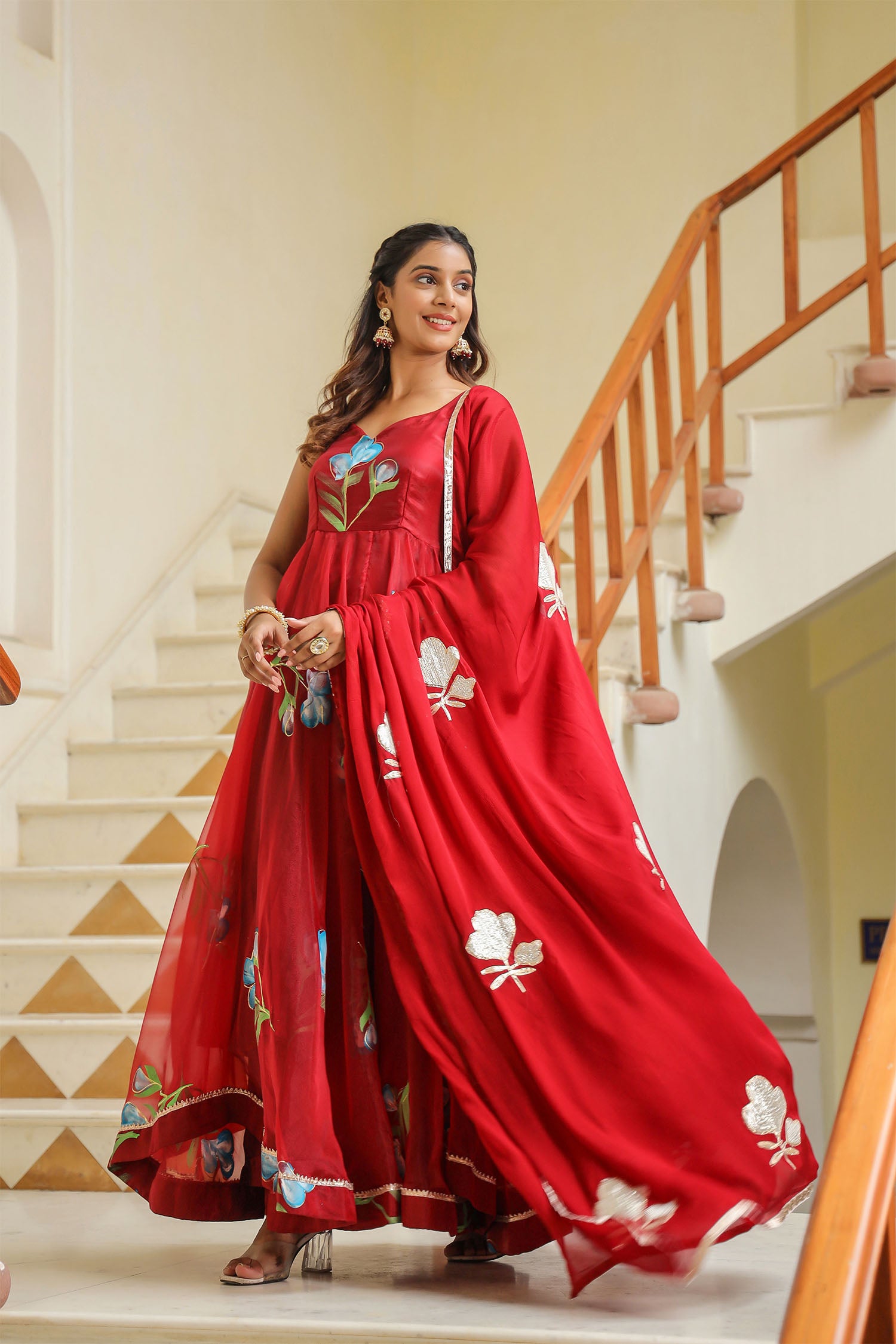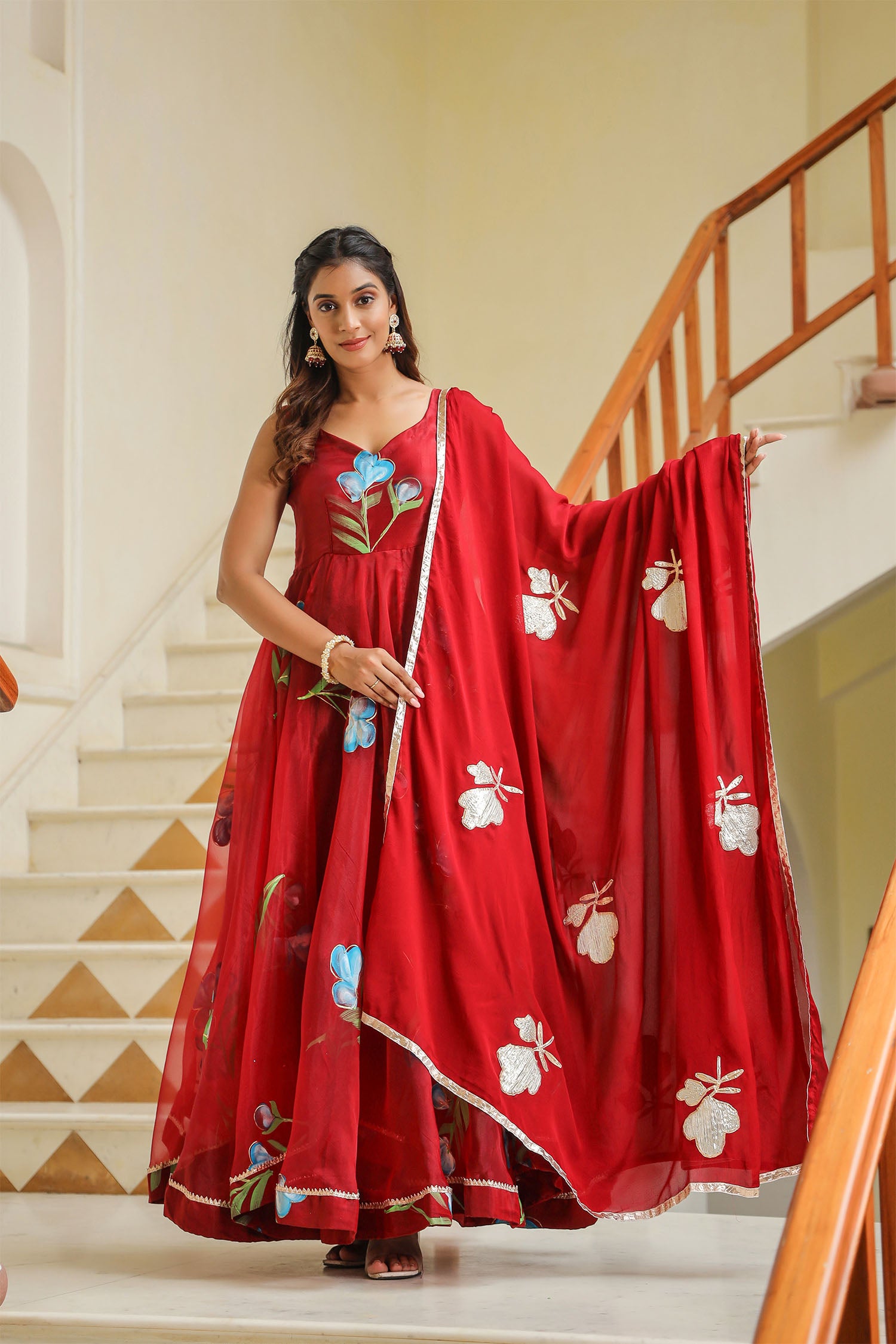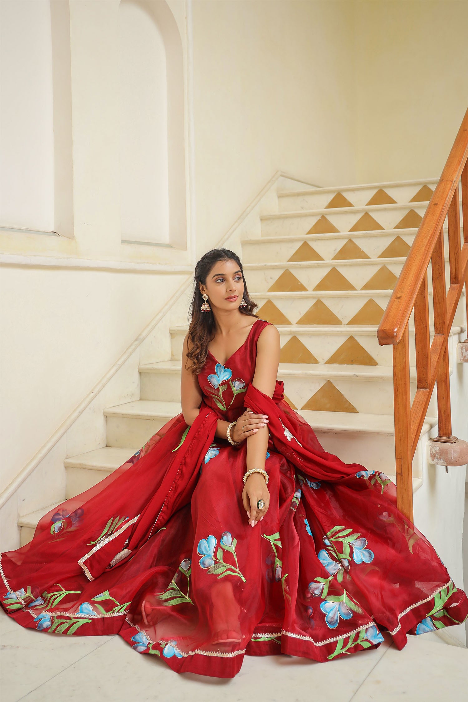 The valentia red organza floral printed anarkali set with matching pant and chinon dupatta for a beautiful look with elegant feel.