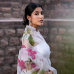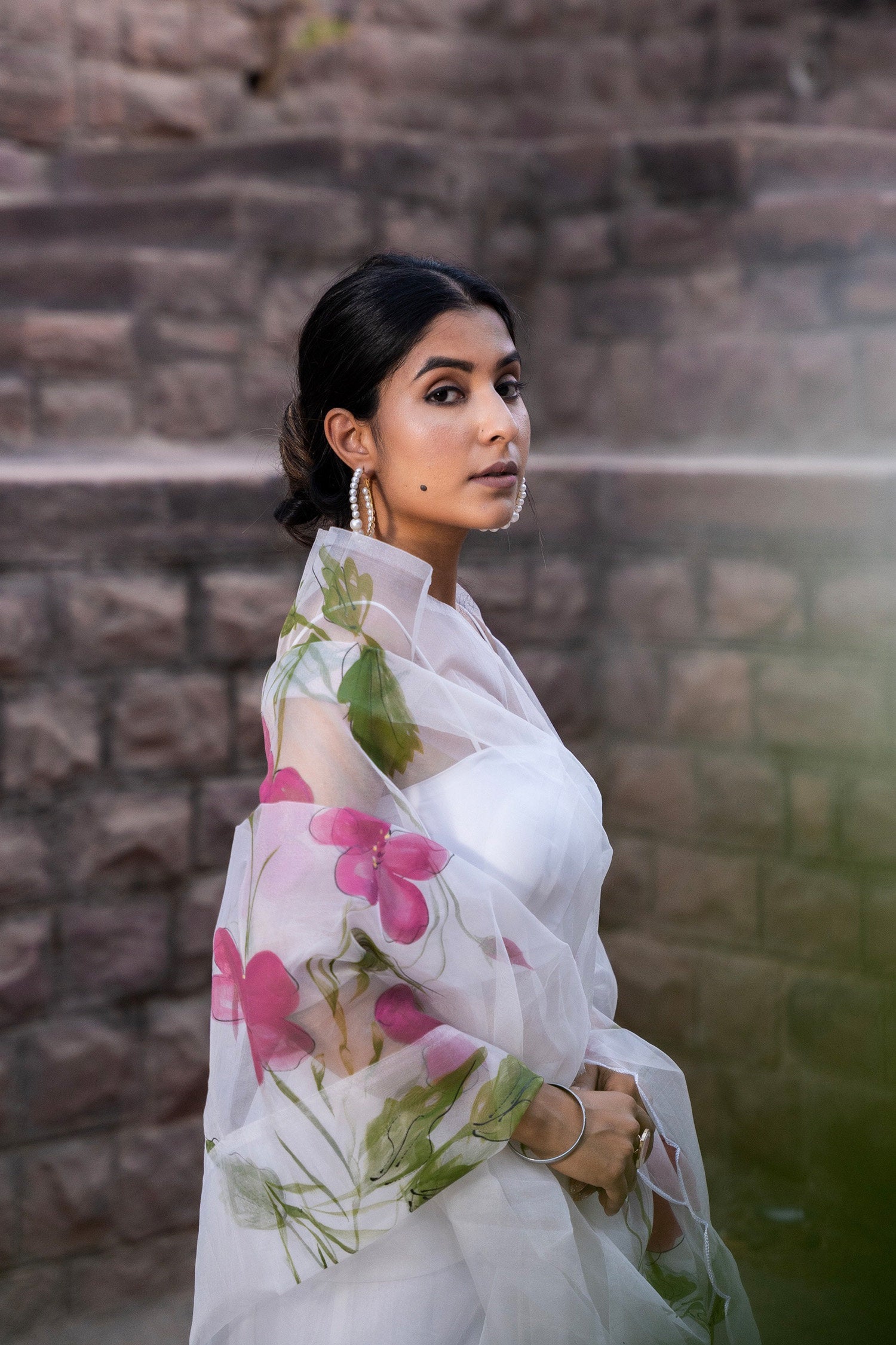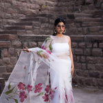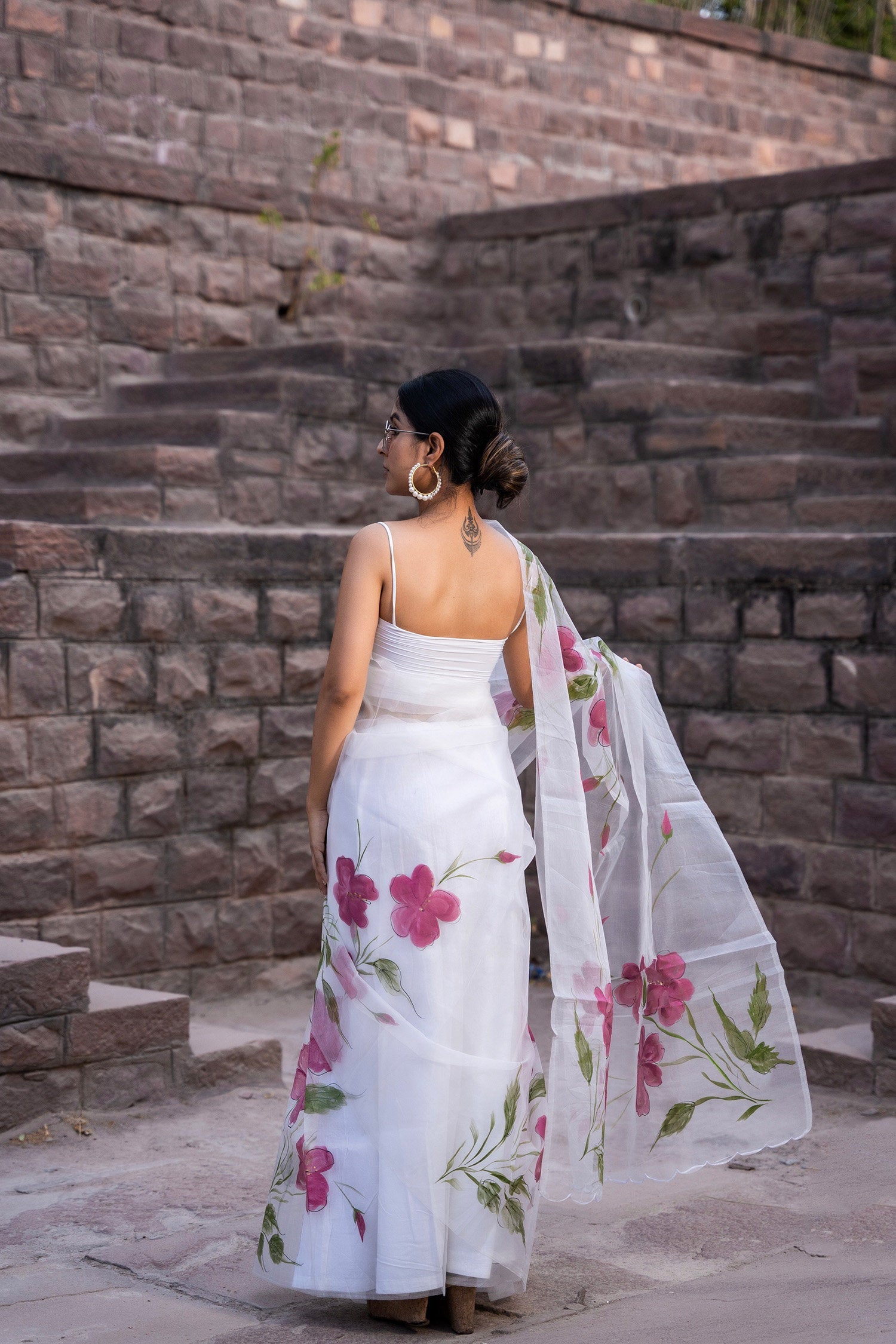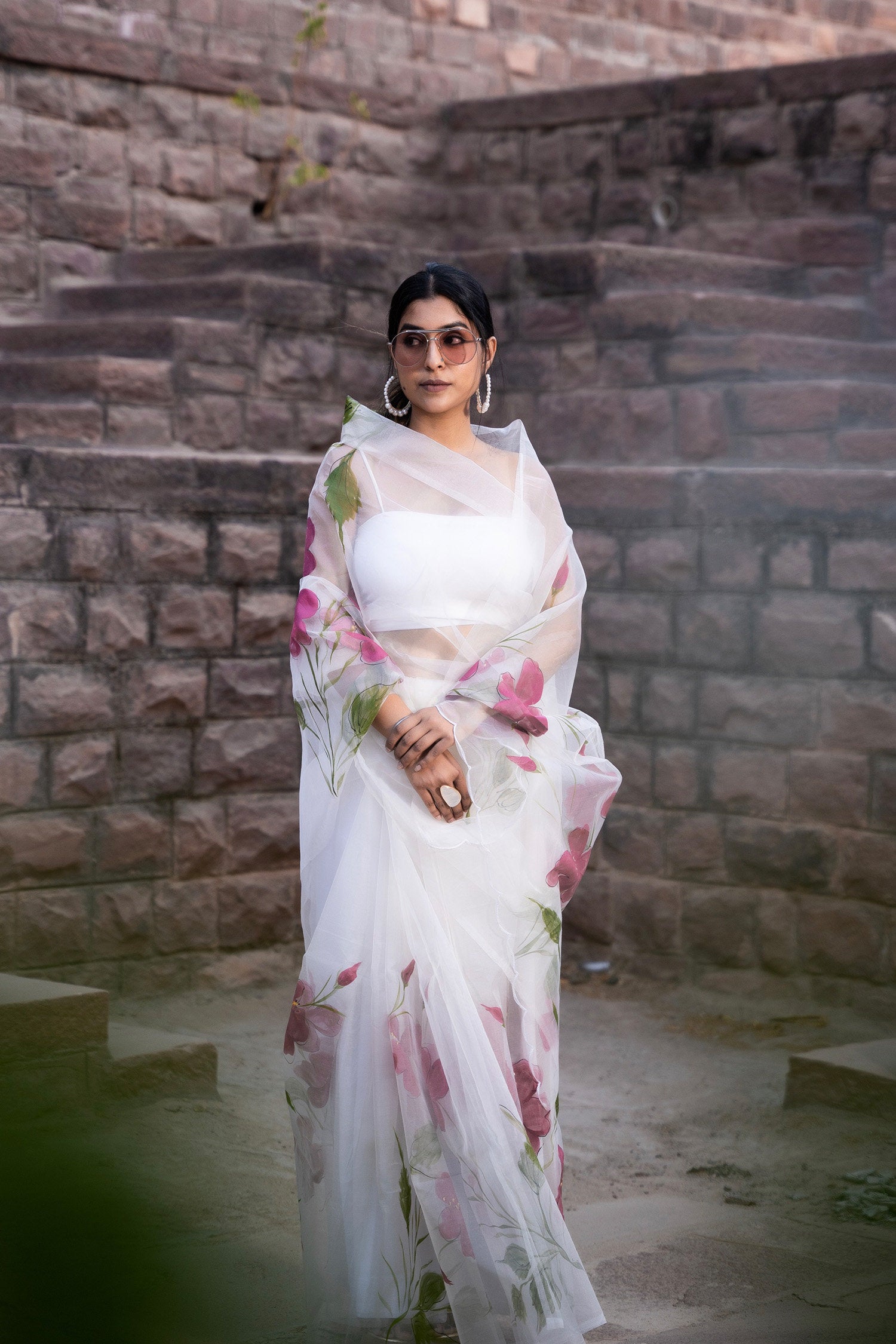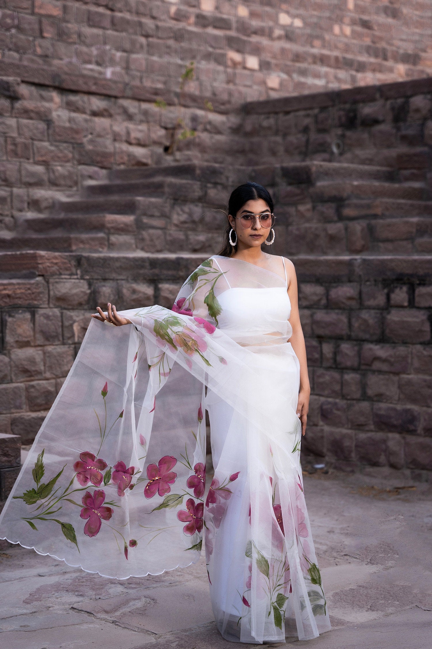 The simple white pink floral painted organza saree for a classy look and elegance for special occasions.