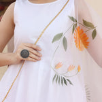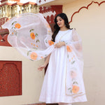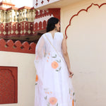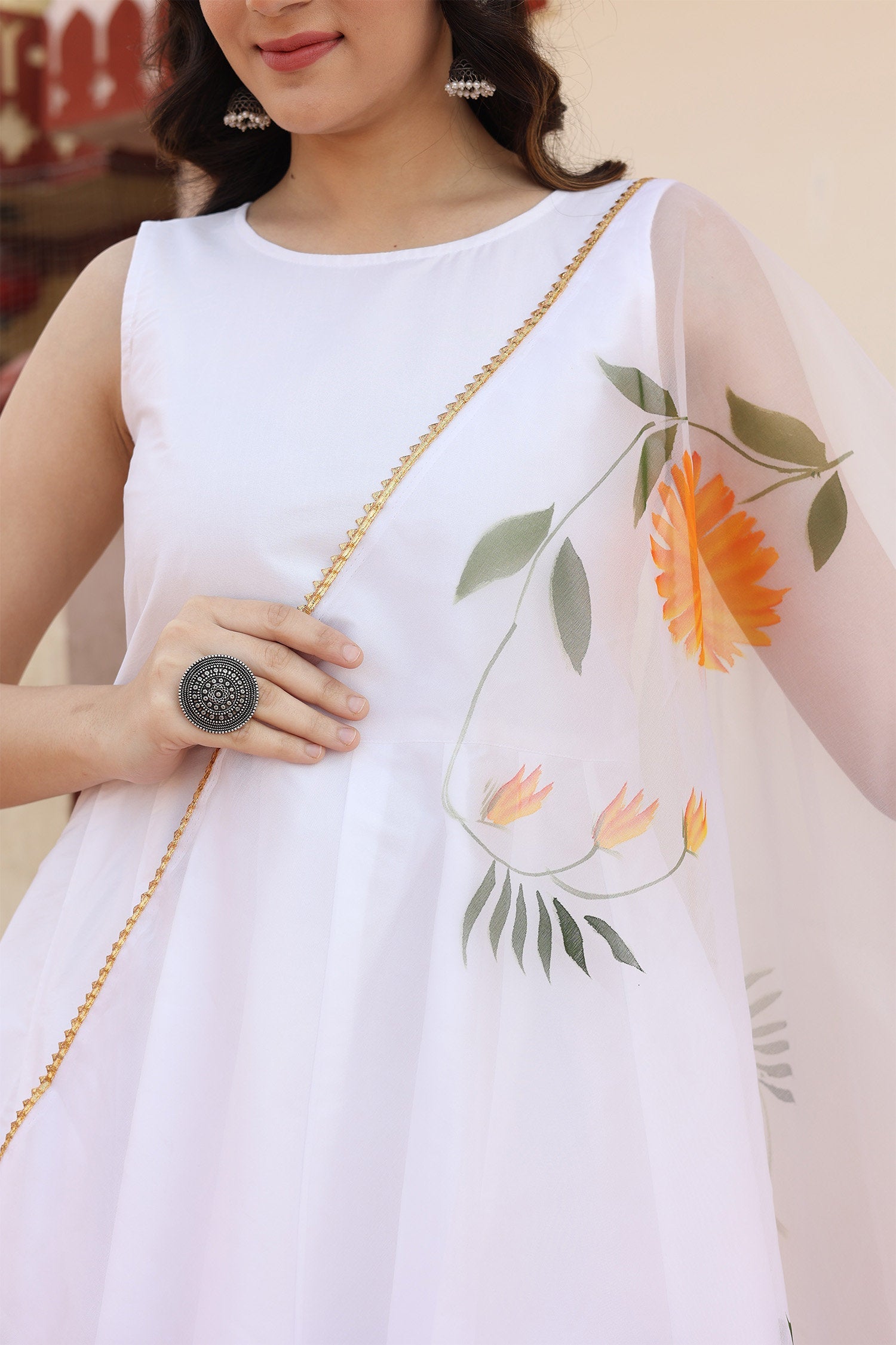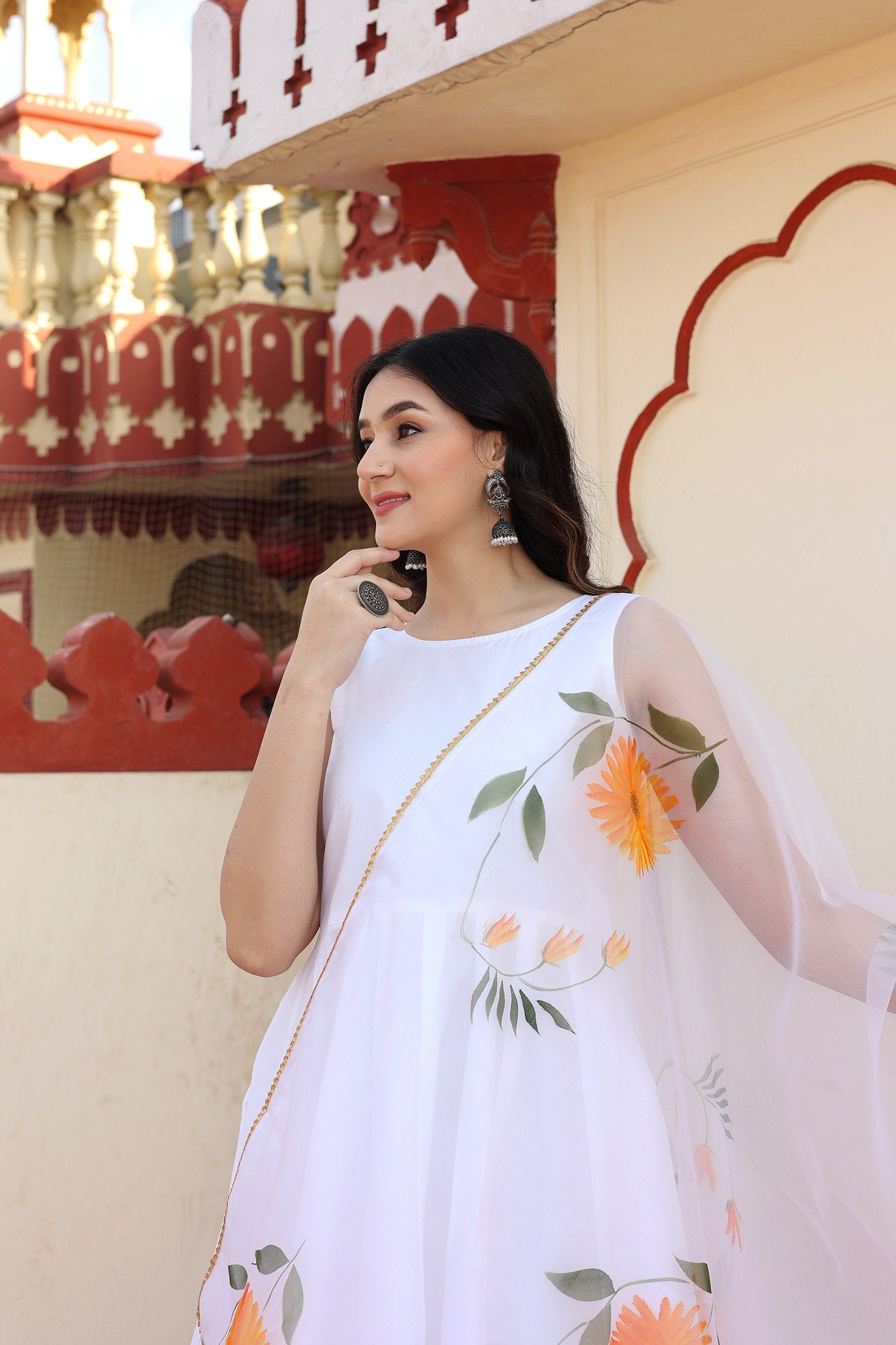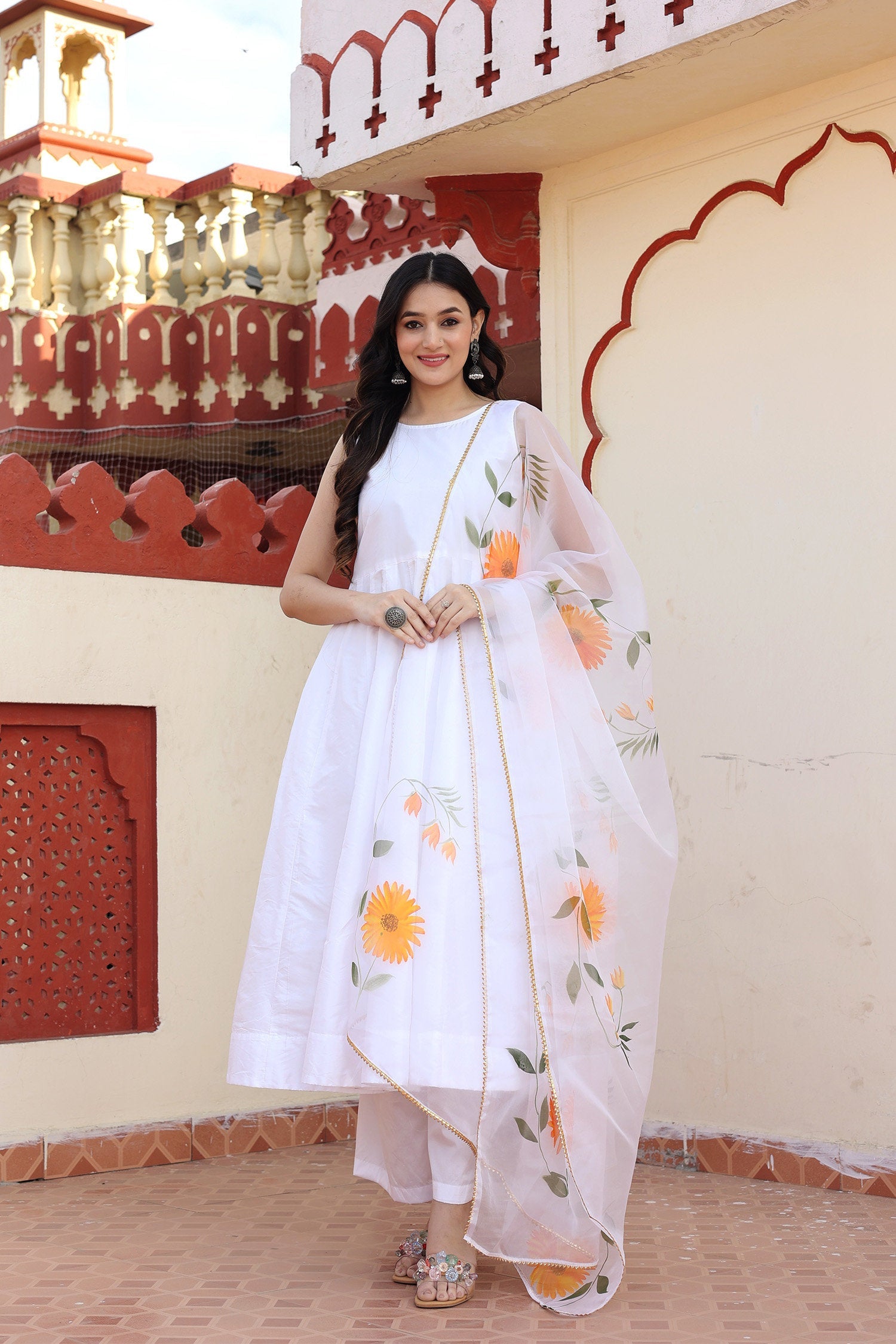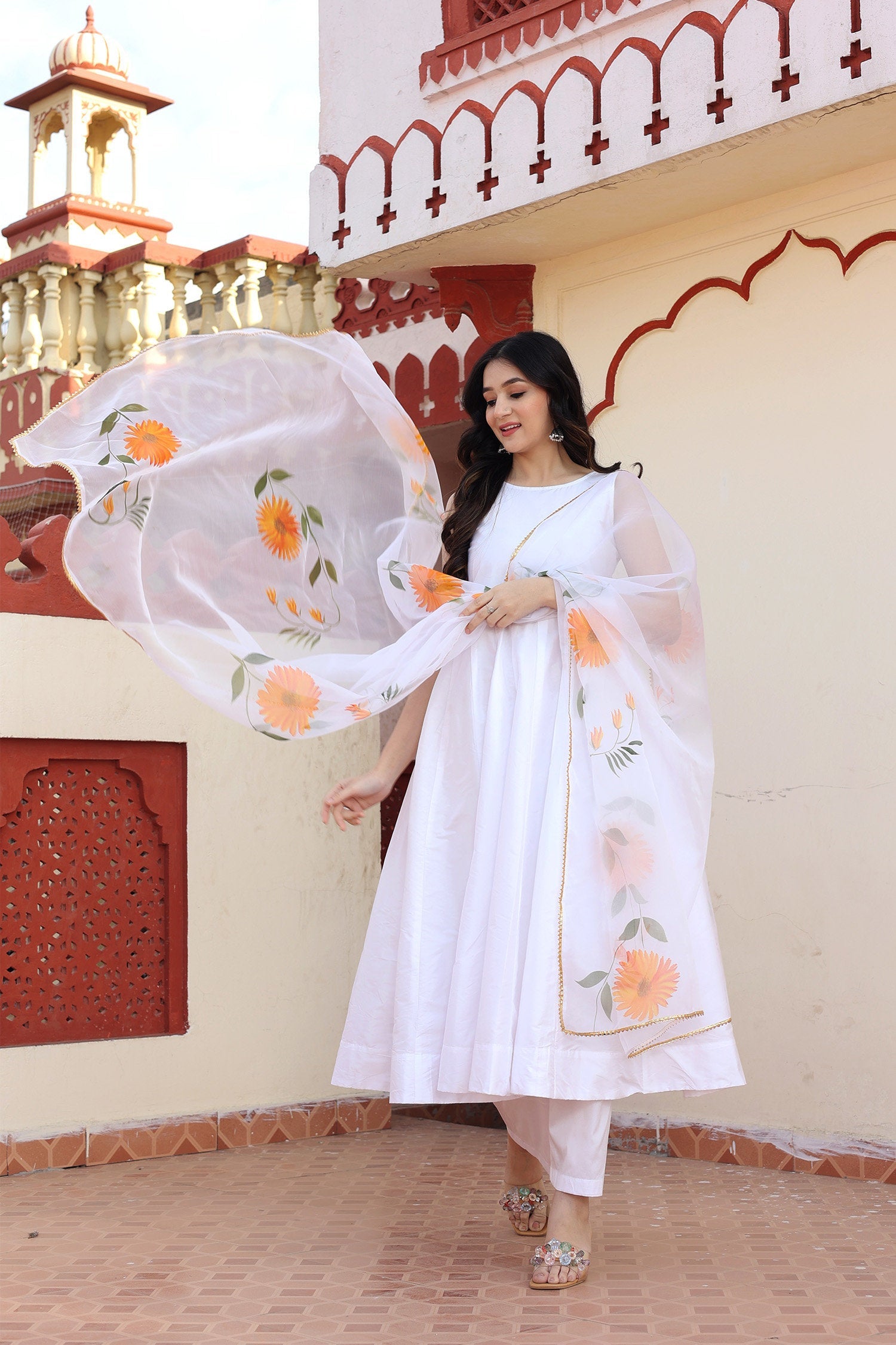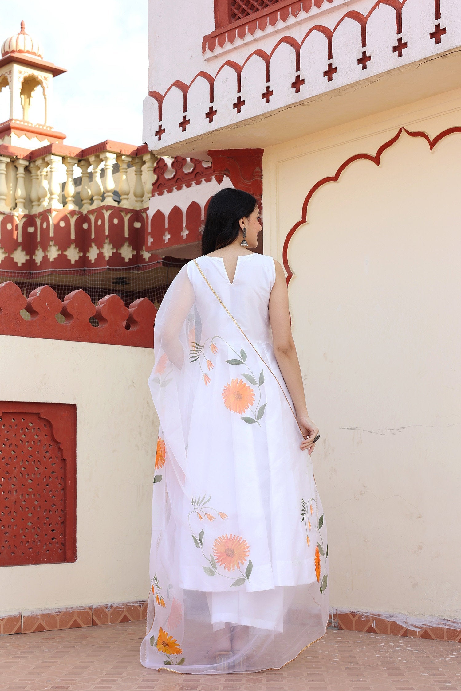 White Taffeta Silk Suit Set With Orange Floral Prints