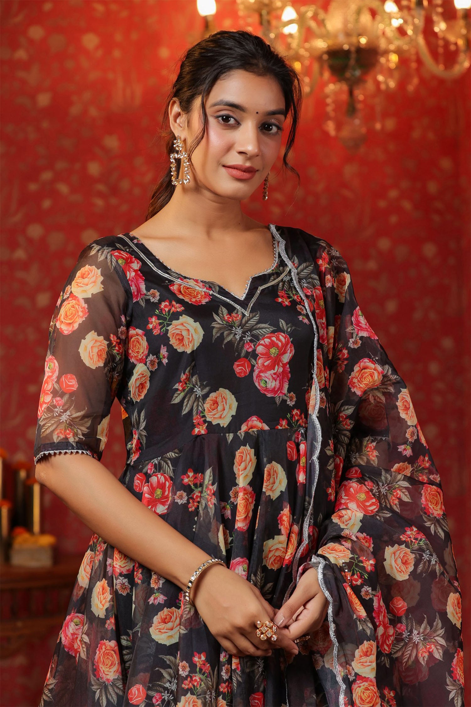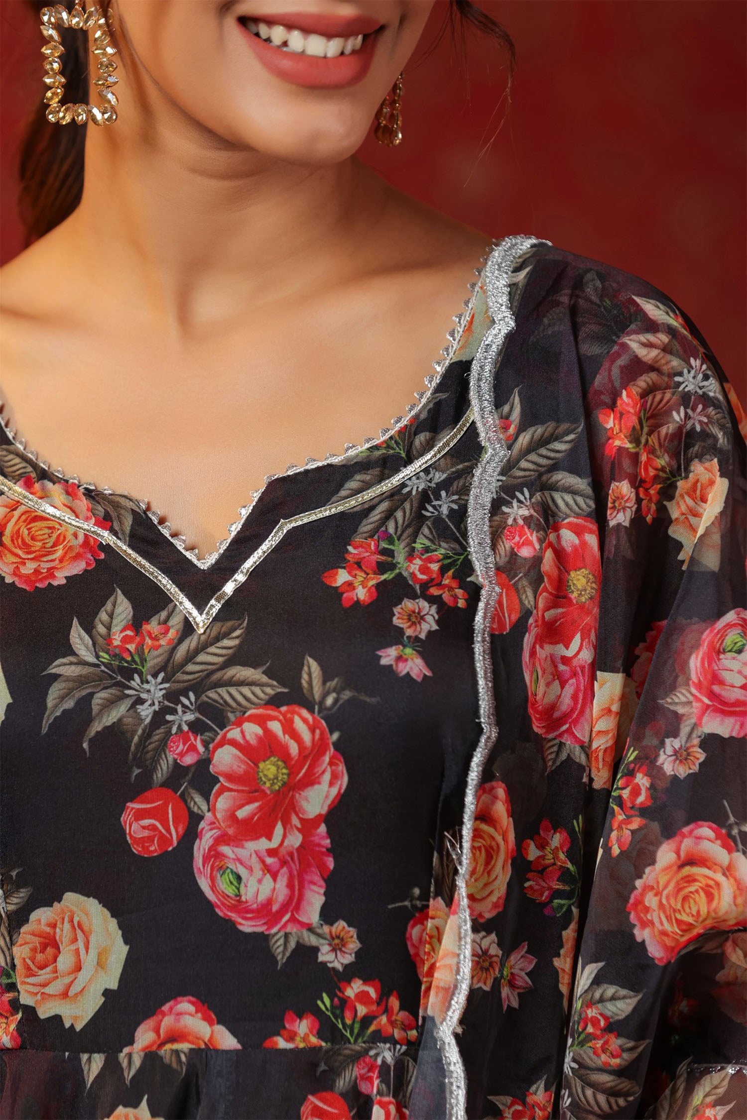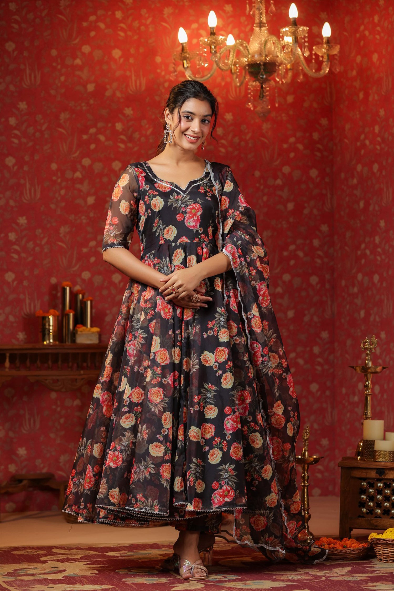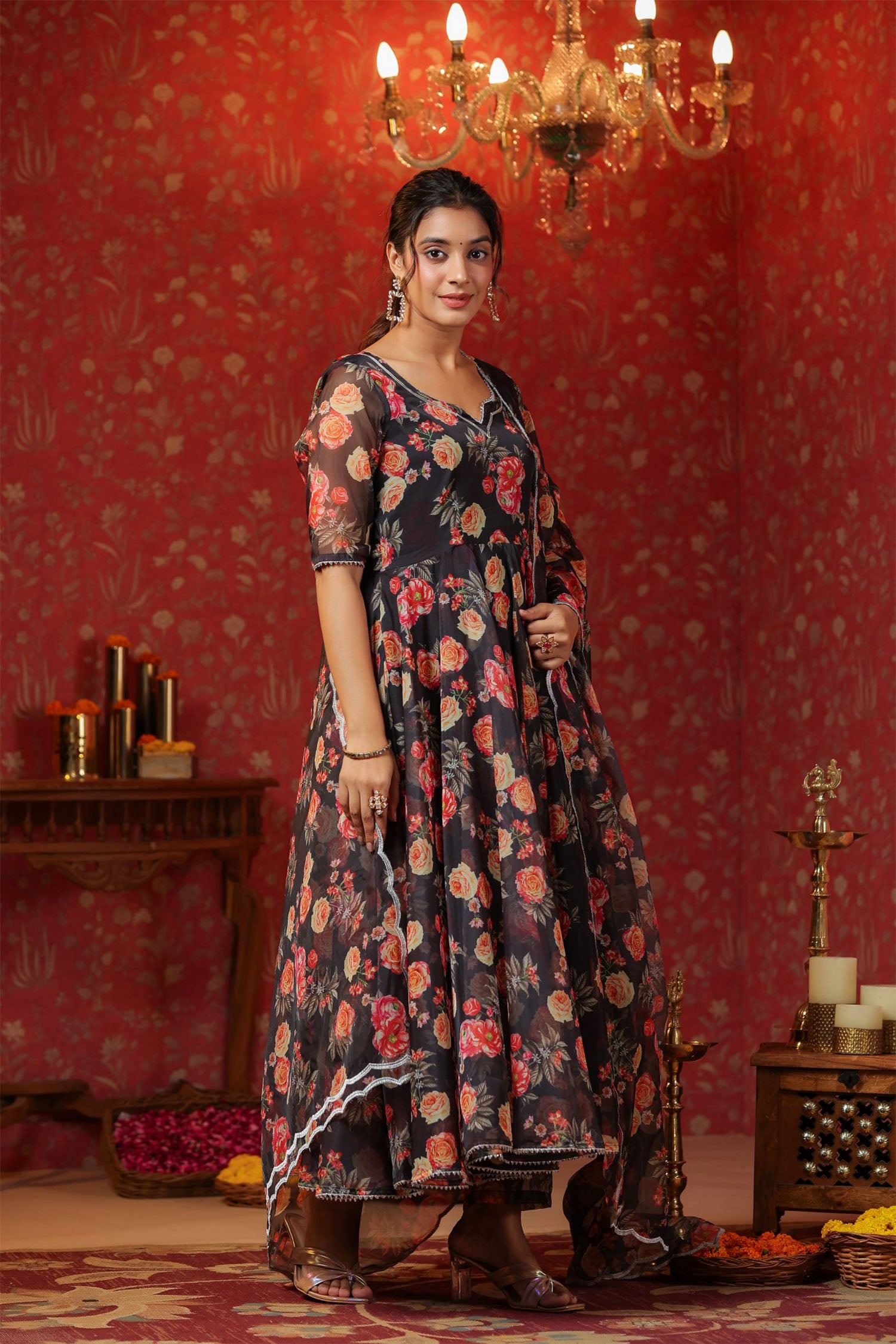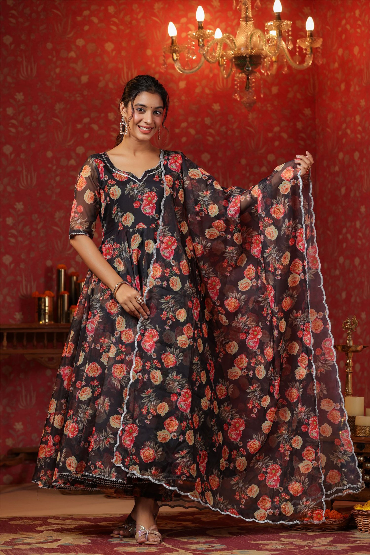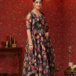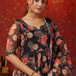 The woodsmoke black organza floral printed anarkali set with matching pant and dupatta for a stylish look with elegance.
