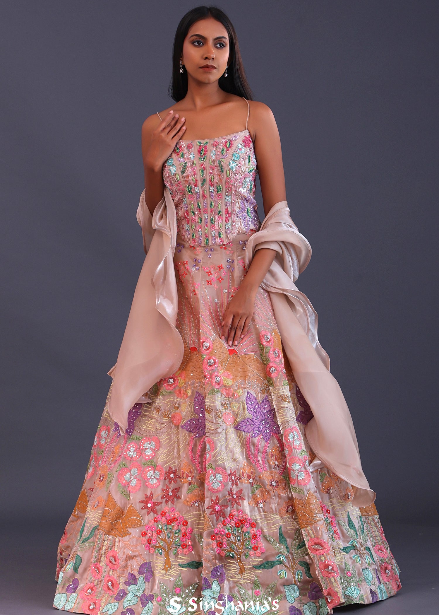 Pastel Pink Organza Floral Thread Work Lehenga Set