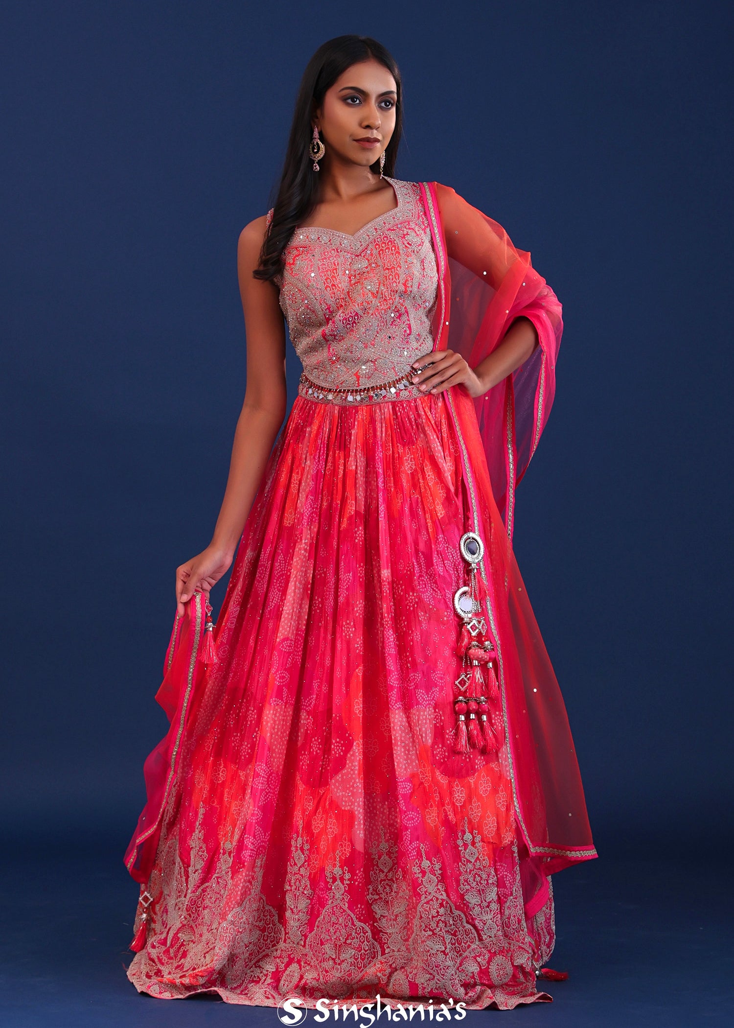 Pink And Orange Organza Bandhani Printed Lehenga Set